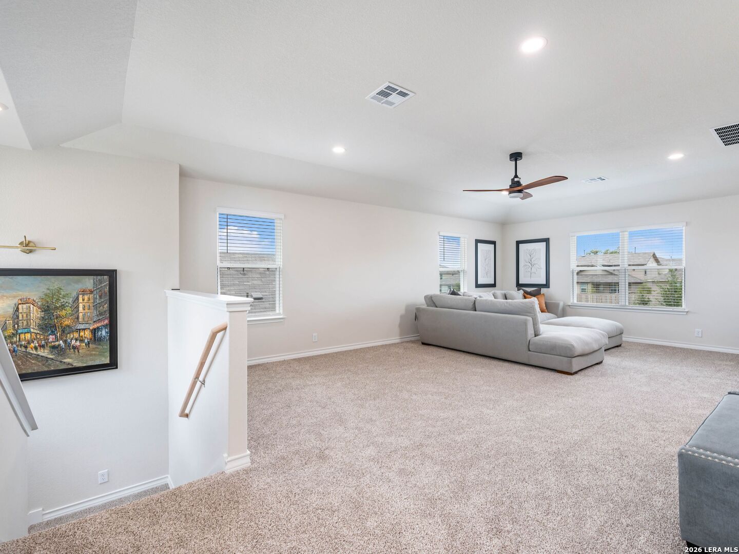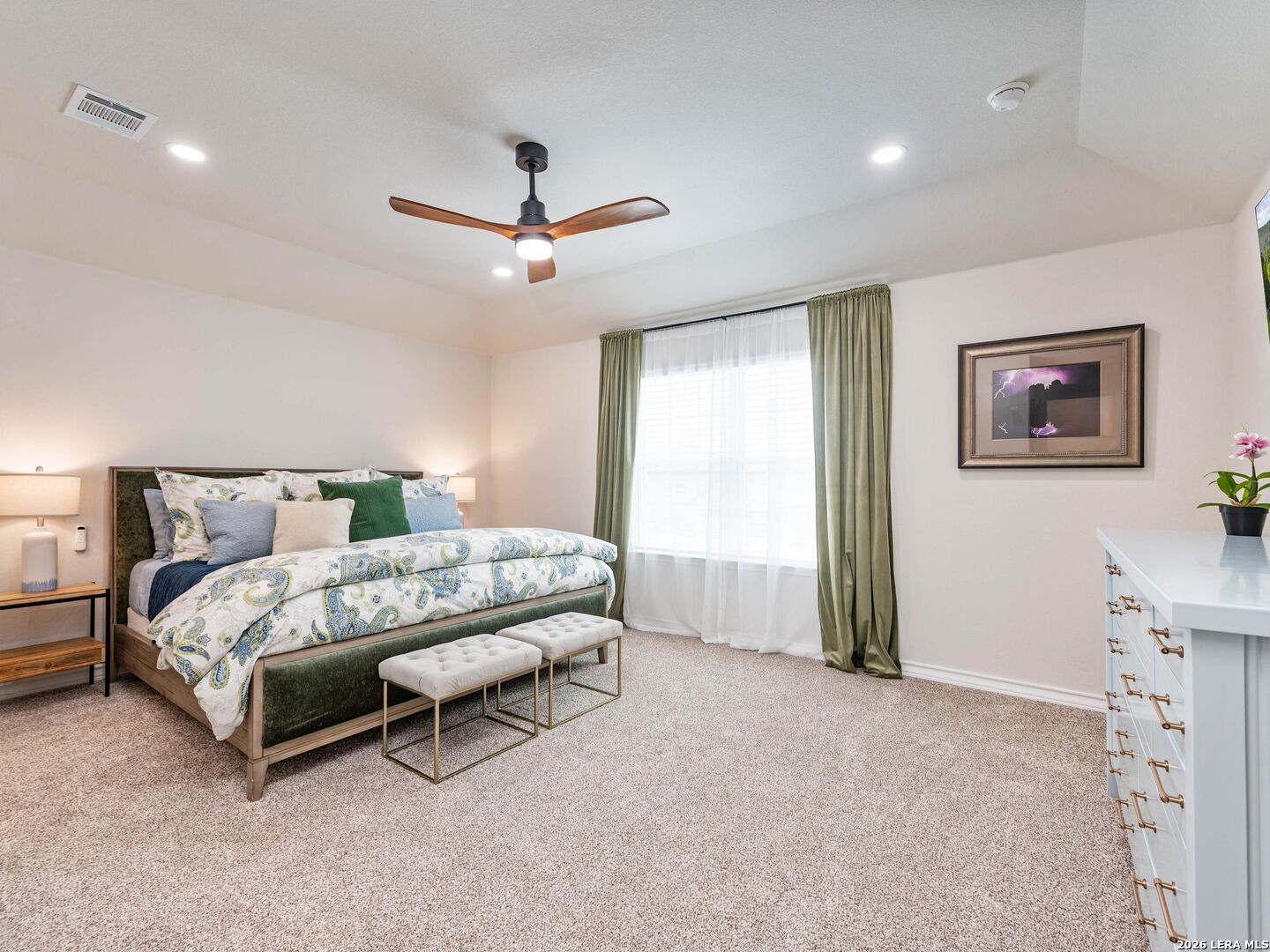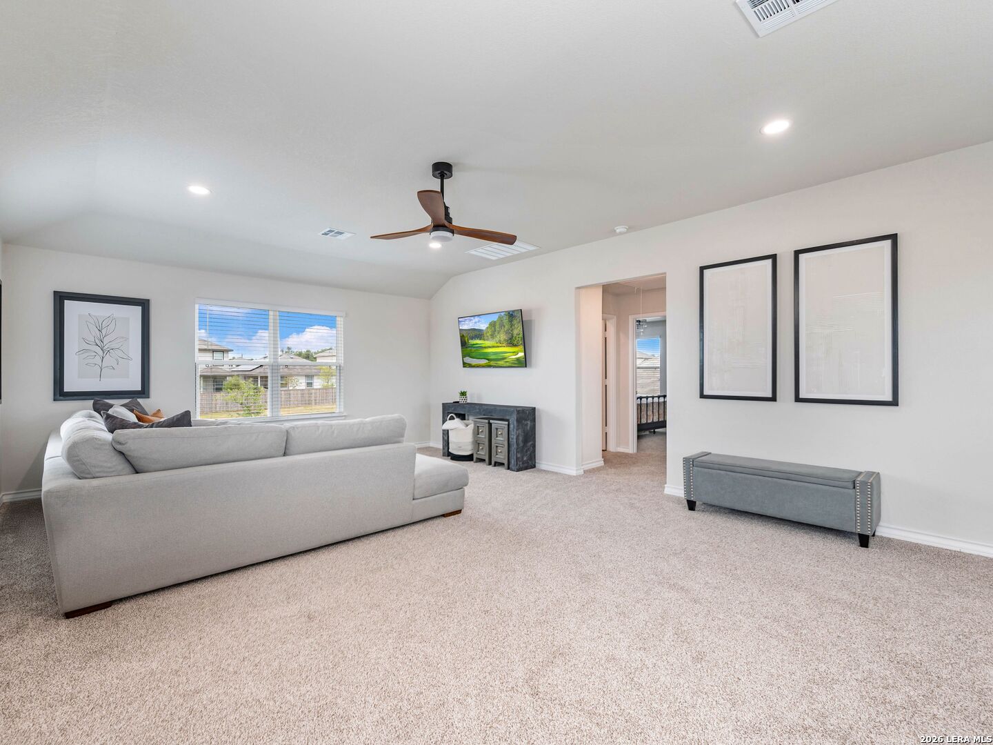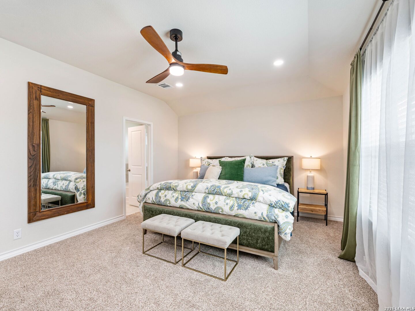 Available as a fully furnished 6-month lease, this two-story home offers a well-designed 3-bedroom, 2.5-bath layout, perfect for those seeking comfort, flexibility, and convenience. A covered front porch opens to a welcoming foyer and powder bath, leading into an open-concept living, dining, and kitchen space ideal for both everyday living and entertaining. The kitchen features granite countertops, a large center island, stainless steel appliances, subway tile backsplash, and a walk-in corner pantry. A window above the sink overlooks the backyard, and the dining area opens to a covered patio. Upstairs offers a bright loft, utility room, and all three bedrooms. The privately situated primary suite includes a semi-vaulted ceiling, ensuite bath with dual vanities, separate tub and shower, and a generous walk-in closet. Secondary bedrooms share a full bath and are positioned across the loft for added privacy. Additional features include 9-foot ceilings, luxury vinyl plank flooring in main living areas, ceramic tile in wet spaces, 2-inch faux wood blinds, a water softener loop, full yard irrigation and landscaping, and integrated smart home technology with remote access to lights, locks, and thermostat. Located near Loop 1604 and Highway 281, the home offers quick access to TPC Golf Course and JW Marriott Resort & Spa. Enjoy resort-style community amenities including a pool, splash pad, fitness center, playground, and a calendar of neighborhood events. Shopping, dining, and entertainment are all close by.