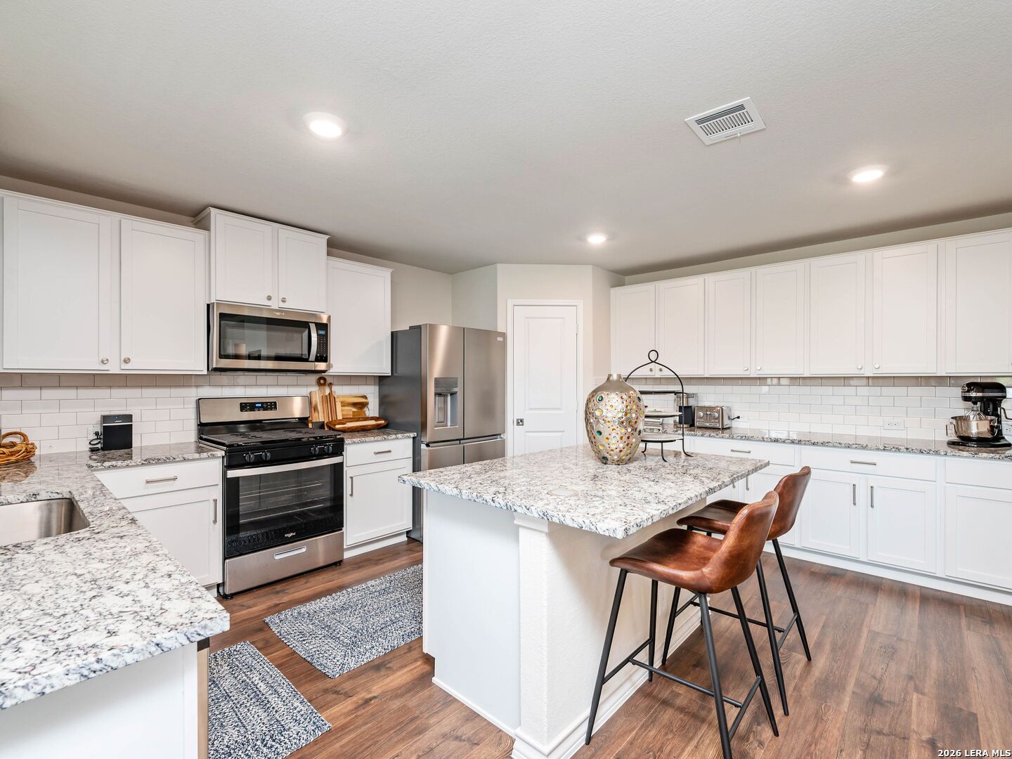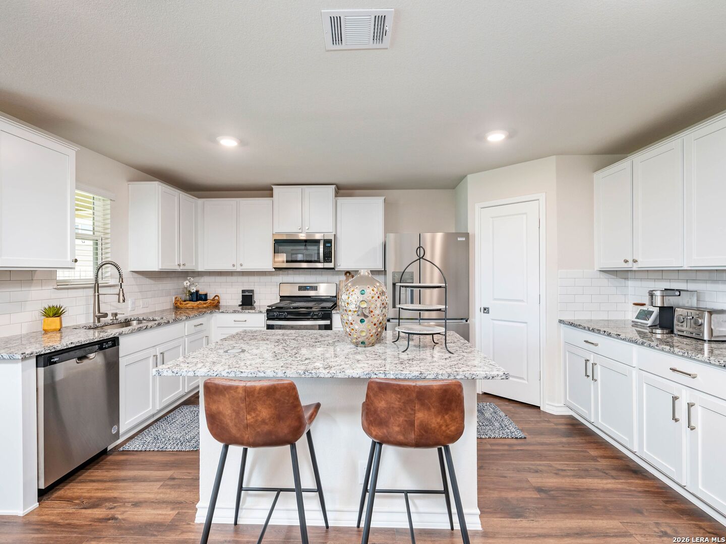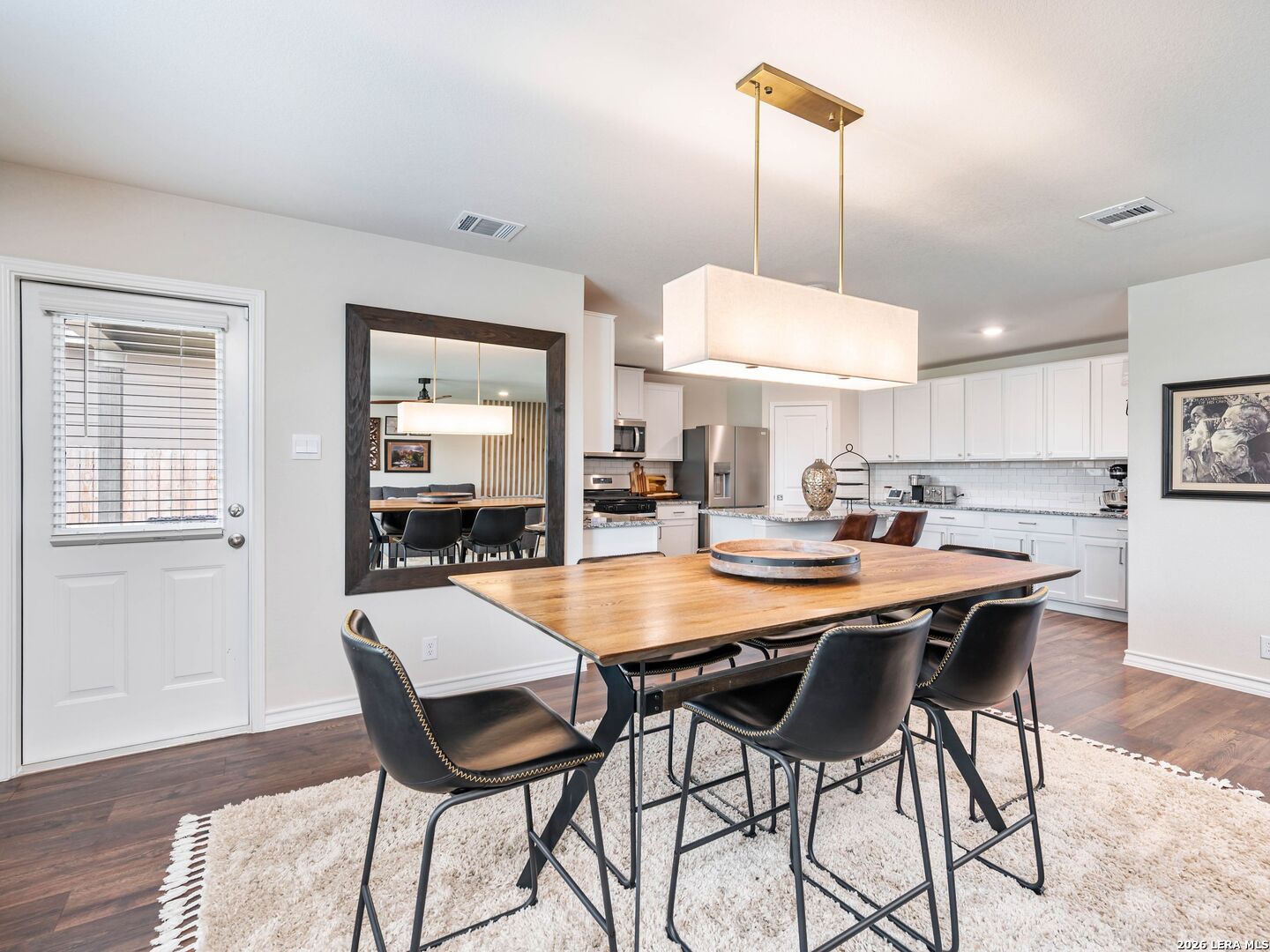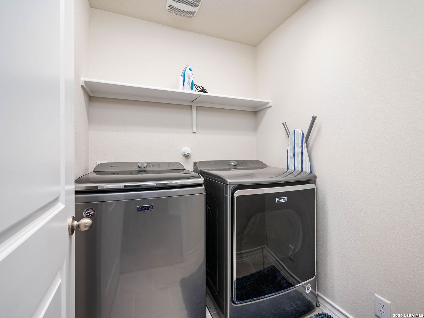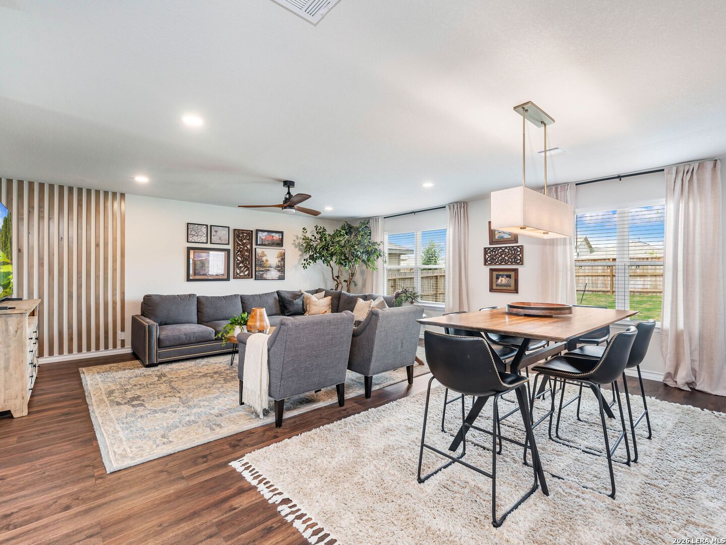 Available as a fully furnished 6-month lease, this two-story home offers a well-designed 3-bedroom, 2.5-bath layout, perfect for those seeking comfort, flexibility, and convenience. A covered front porch opens to a welcoming foyer and powder bath, leading into an open-concept living, dining, and kitchen space ideal for both everyday living and entertaining. The kitchen features granite countertops, a large center island, stainless steel appliances, subway tile backsplash, and a walk-in corner pantry. A window above the sink overlooks the backyard, and the dining area opens to a covered patio. Upstairs offers a bright loft, utility room, and all three bedrooms. The privately situated primary suite includes a semi-vaulted ceiling, ensuite bath with dual vanities, separate tub and shower, and a generous walk-in closet. Secondary bedrooms share a full bath and are positioned across the loft for added privacy. Additional features include 9-foot ceilings, luxury vinyl plank flooring in main living areas, ceramic tile in wet spaces, 2-inch faux wood blinds, a water softener loop, full yard irrigation and landscaping, and integrated smart home technology with remote access to lights, locks, and thermostat. Located near Loop 1604 and Highway 281, the home offers quick access to TPC Golf Course and JW Marriott Resort & Spa. Enjoy resort-style community amenities including a pool, splash pad, fitness center, playground, and a calendar of neighborhood events. Shopping, dining, and entertainment are all close by.
