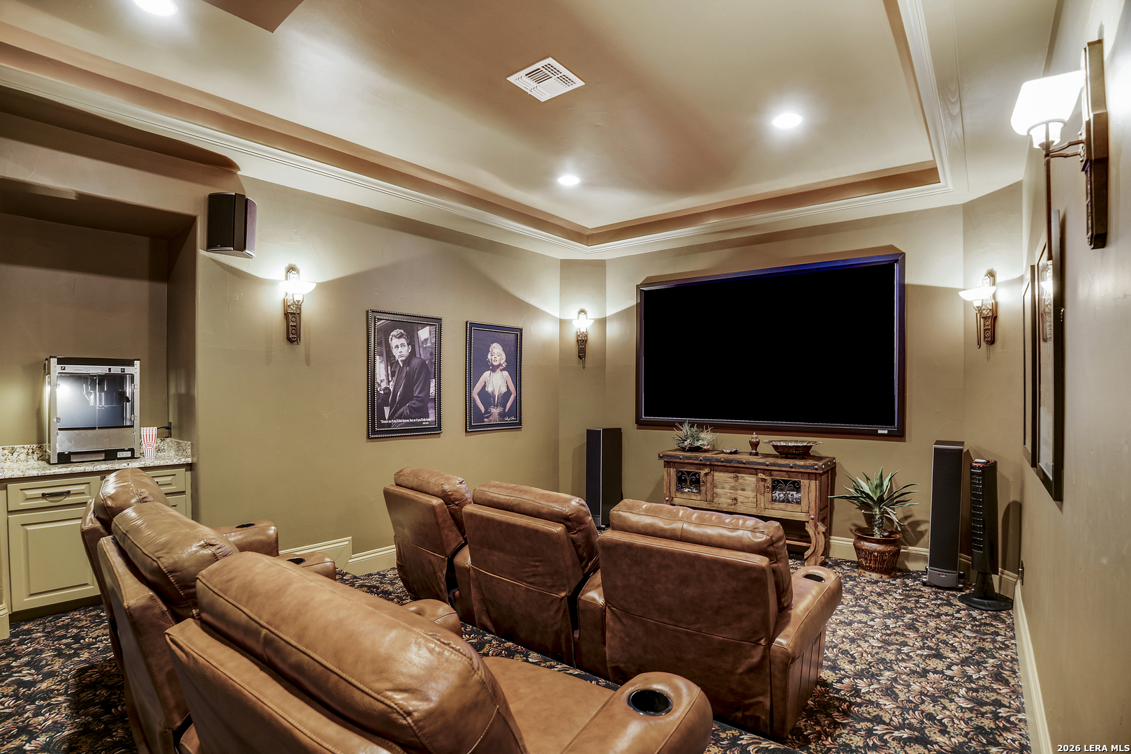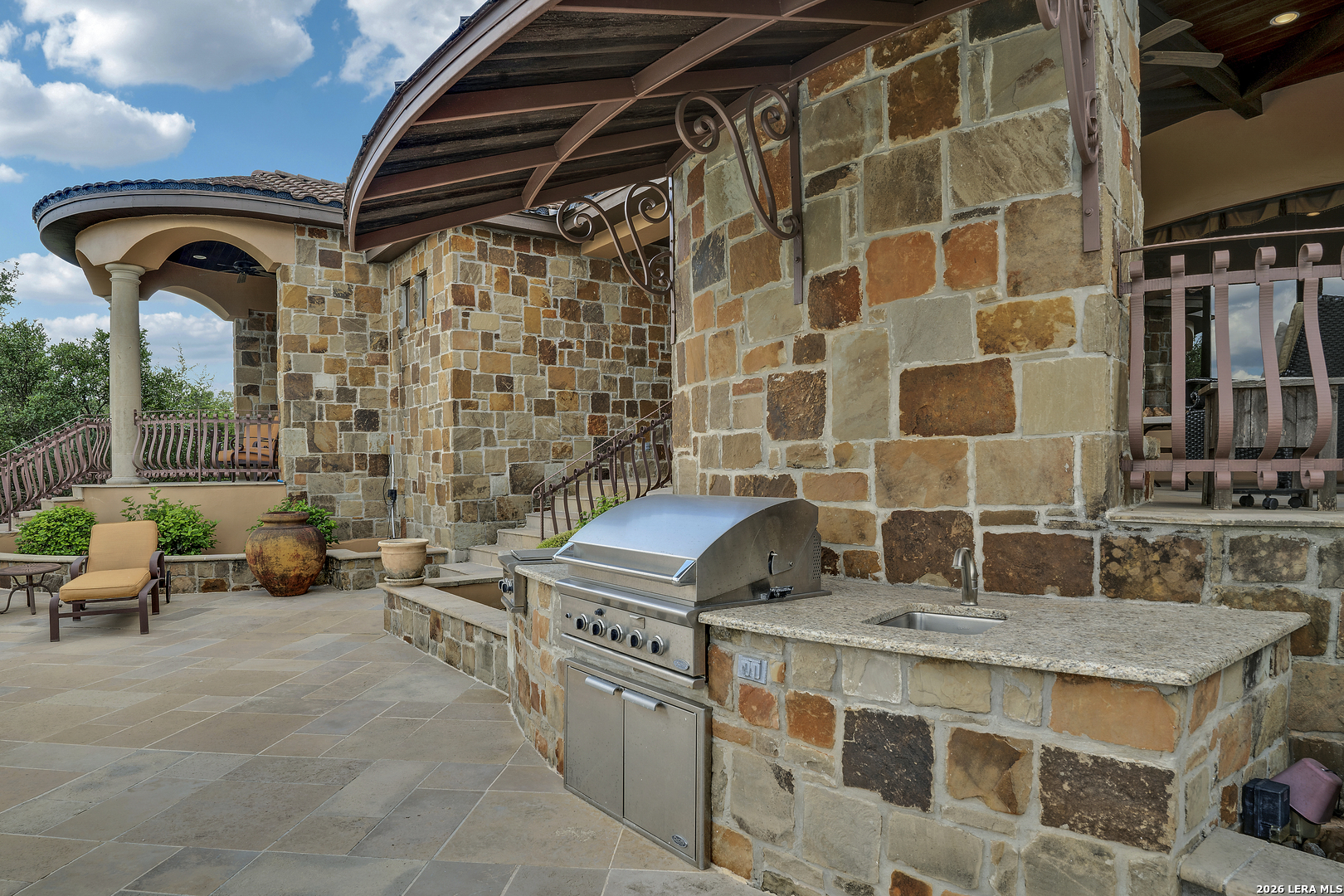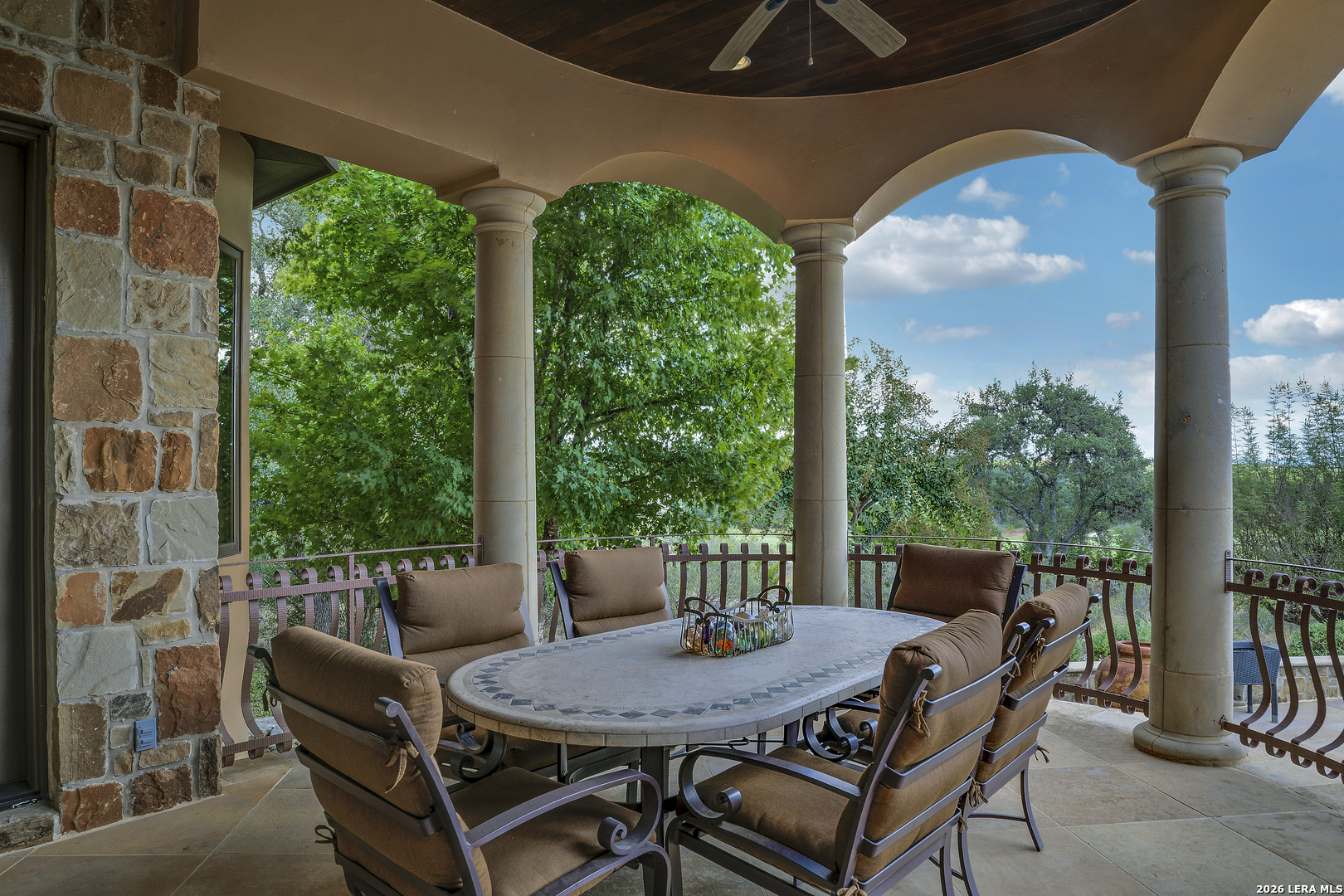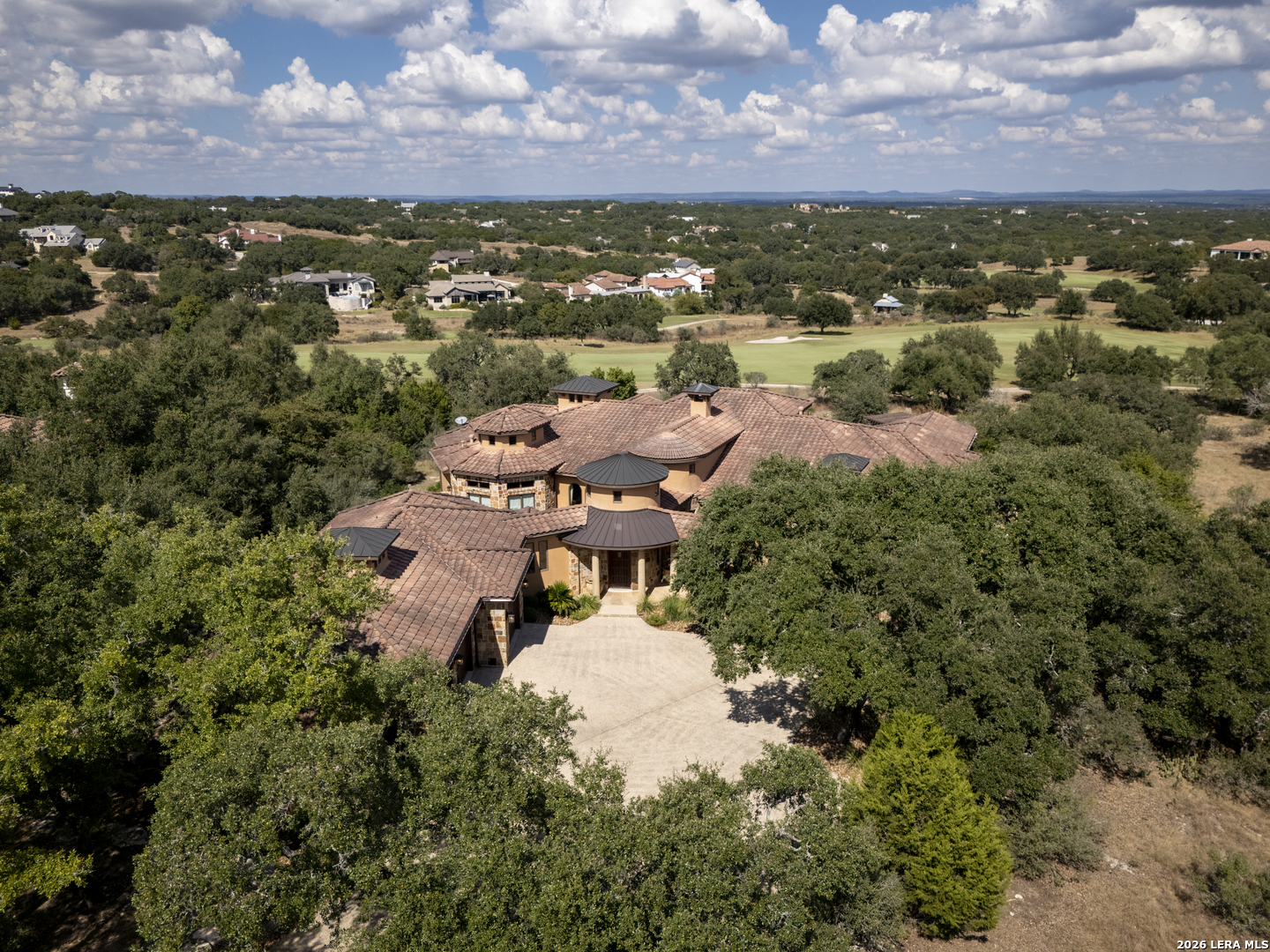 Nestled within the highly coveted Cordillera Ranch community, this distinguished estate embodies refined Hill Country elegance and unparalleled craftsmanship. Perfectly positioned on the 15th fairway of the Jack Nicklaus Signature golf course, this residence offers both sweeping views and complete privacy, set gracefully on a cul-de-sac. A winding driveway welcomes you home, ascending through lush landscaping to a secluded haven of serenity. Upon arrival, the entry opens to two beautifully appointed courtyards, both with outdoor firepits. The first to your right, a serene introduction to the home's architectural grace; the second, to your left, a retreat ideal for intimate gatherings. As you step inside, a softly illuminated hallway leads you past a custom wine cellar, complete with a temperature-controlled wine fridge, setting the tone for the residence's exceptional attention to detail. The interiors are adorned with magnificent wood beamed ceilings, elegant stone and rock archways, and a striking two-sided, floor-to-ceiling wood-burning fireplace that creates a dramatic focal point between the grand entry and the main living area. To the left, a formal dining room offers a sophisticated space for entertaining, seamlessly connecting to a sunken full-service bar crowned by a striking dome ceiling, the perfect prelude to the home's spectacular gourmet kitchen. Designed for both culinary artistry and everyday living, the kitchen features an expansive center island, Wolf appliances, three ovens, and an inviting breakfast area overlooking your private backyard oasis. The living and entertaining spaces flow effortlessly outdoors, where a spacious covered patio invites alfresco living at its finest. Enjoy a floor-to-ceiling gas fireplace, dining and sitting areas, and an additional covered pavilion ideal for gatherings. Beyond lies a resort-style pool with cascading water features, a separate hot tub, and a built-in outdoor grill, all overlooking the manicured greens of the Jack Nicklaus Signature golf course. A private den with a fireplace, and bar, and a dedicated media room provide elegant spaces for leisure and entertainment. The primary suite serves as a private sanctuary, complete with a gas fireplace, its own private patio, and a spa-inspired bathroom that exudes tranquility. Centered around a freestanding bathtub, the suite features dual vanities, a walk-in shower, multiple walk-in closets, and a personal fitness room with a built-in sauna.Two guest suites, each with ensuite bathrooms, offer comfort and privacy. One featuring a built-in desk and storage, and the other with direct outdoor access. A fourth bedroom, thoughtfully designed as a mother-in-law suite, includes a microwave, sink, mini fridge, and private bath, along with access to the second courtyard, where guests can enjoy the firepit, sitting area, and lush landscaping beneath the open Texas sky. Additional features include a 3 car garage, with a 4th as a golf cart garage. This exceptional estate harmonizes timeless architectural details with modern amenities, creating an atmosphere of warmth, sophistication, and effortless luxury. Set within one of Boerne's most prestigious neighborhoods, this residence offers an extraordinary lifestyle defined by elegance, privacy, and breathtaking golf course vistas.