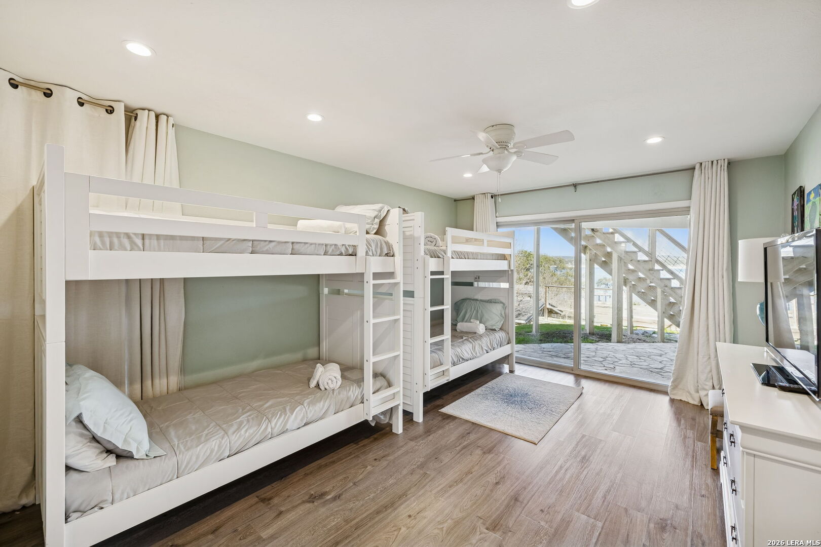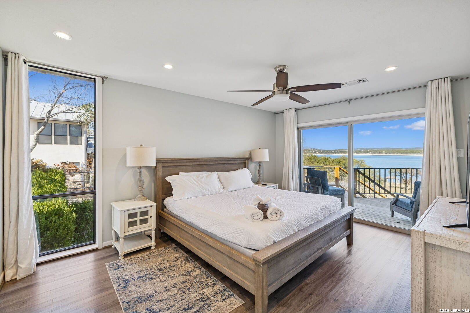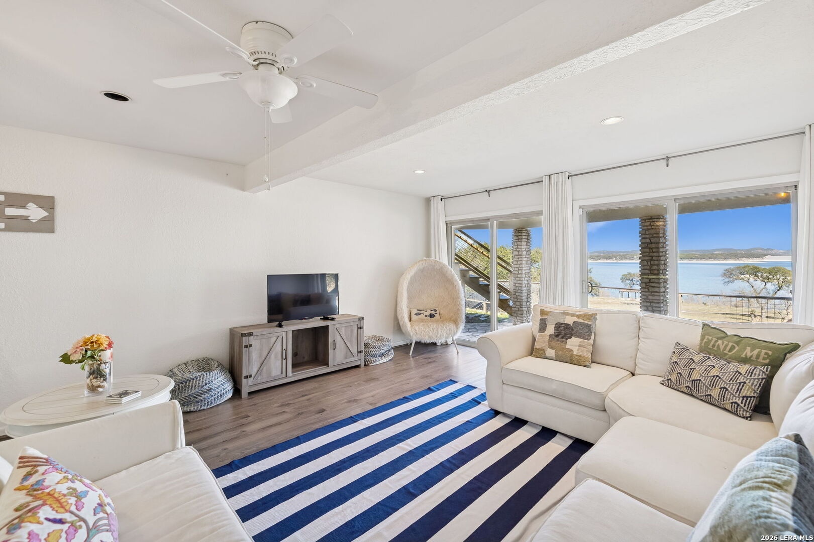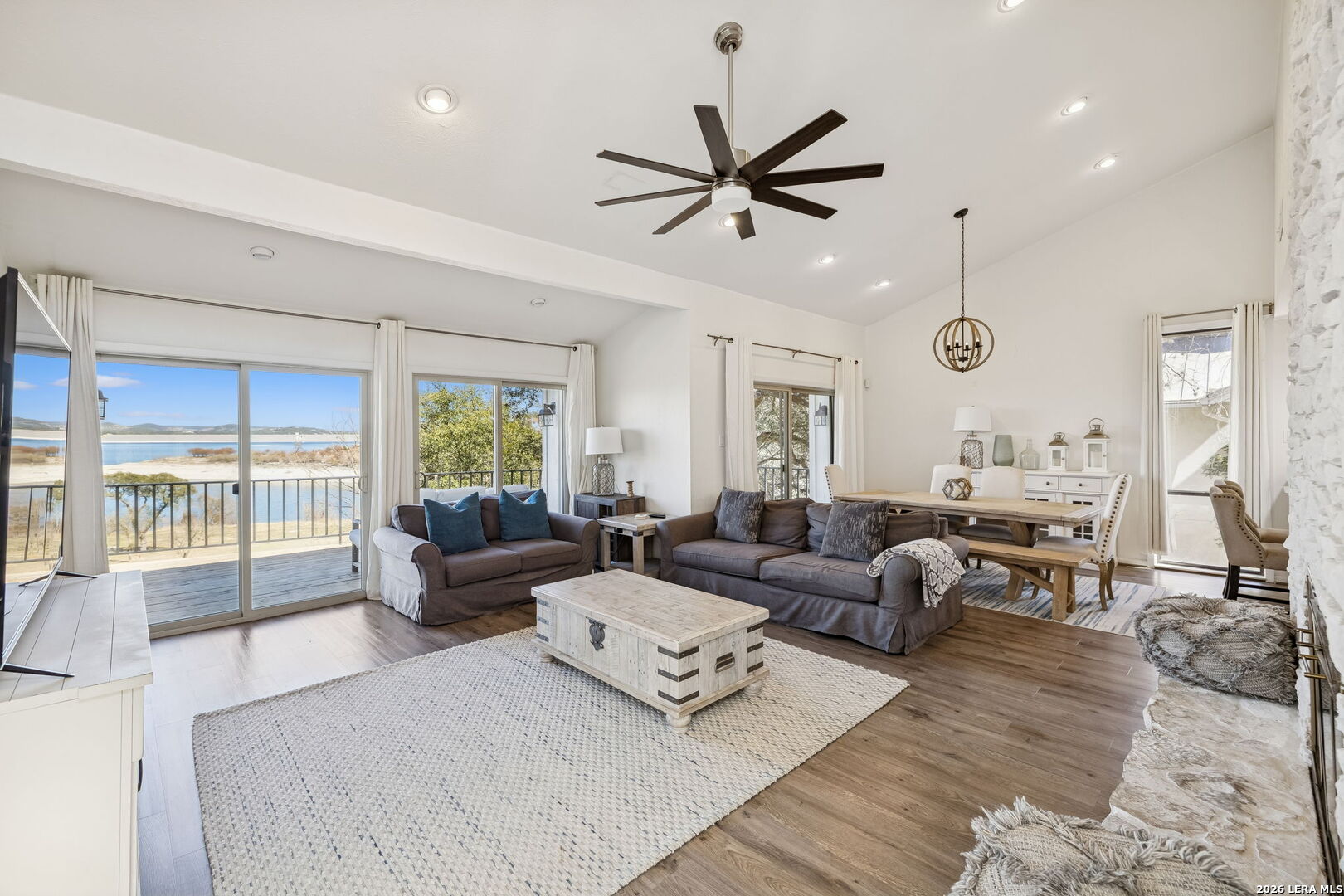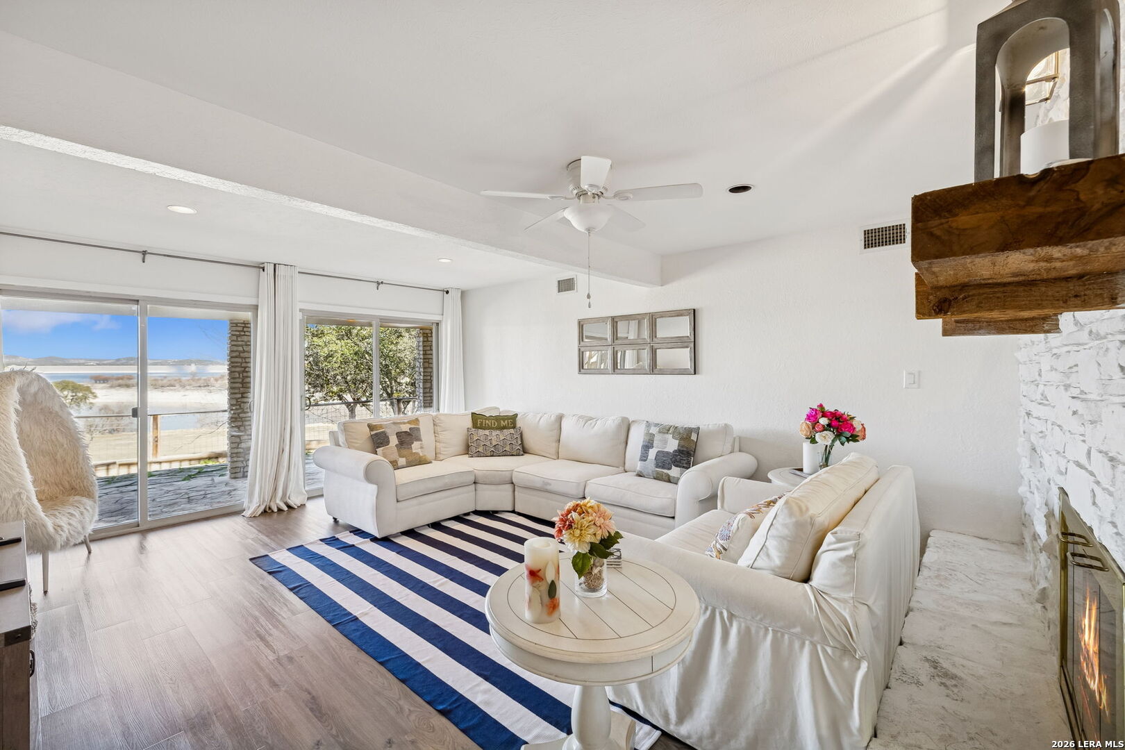 Premier Canyon Lake waterfront home with panoramic, unobstructed lake views and direct access to the shoreline. This fully renovated lake house offers expansive water views from nearly every room. Large sliding glass doors on both levels open to covered and open-air decks, creating seamless indoor-outdoor living and maximizing the lakefront setting. The upper deck provides a commanding vantage point with Canyon Lake as the back drop. Below, a covered stone patio and gravel path lead toward the water, offering rare direct access to the lake. A boat/RV cover and large storage shed provide space for all your lake gear. Inside, the home was extensively updated in 2018 with luxury vinyl plank flooring, tile, recessed lighting, and modern finishes throughout. Two separate living areas-each featuring a wood-burning stone fireplace-offer flexibility for entertaining or hosting guests. The kitchen is finished with quartz countertops, tile backsplash, updated electric range (2023), under-cabinet lighting, and generous cabinet storage. The main-level primary suite features lake views and private deck access, while two lower-level bedrooms each include sliding glass doors and full en-suite baths. With dual HVAC systems (replaced within five years), water softener, and concrete driveway, this Canyon Lake waterfront property combines location, views, and move-in-ready condition in one rare offering.