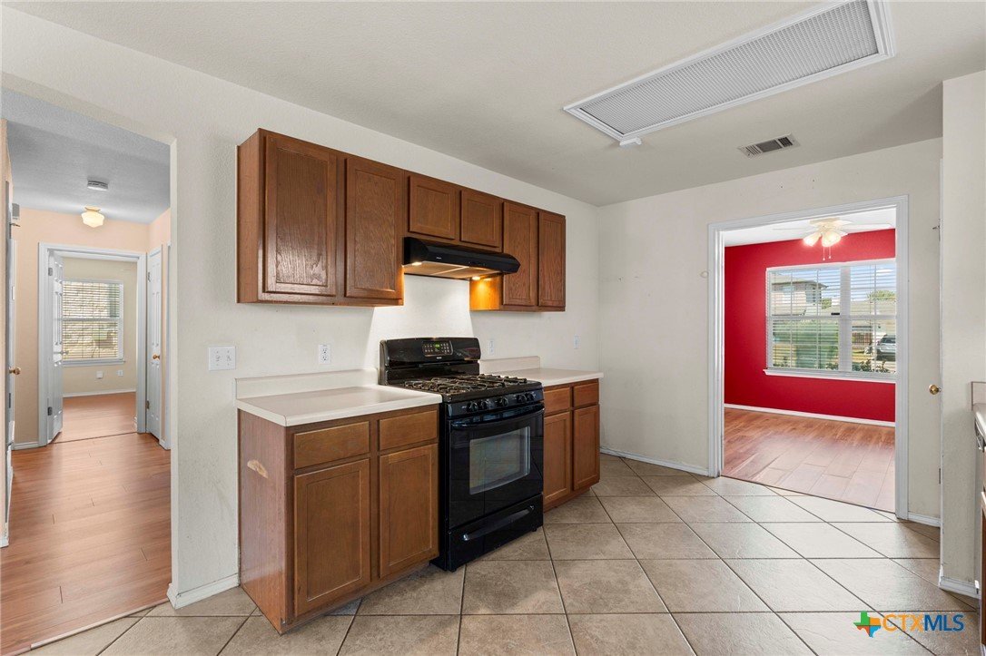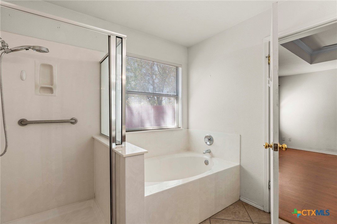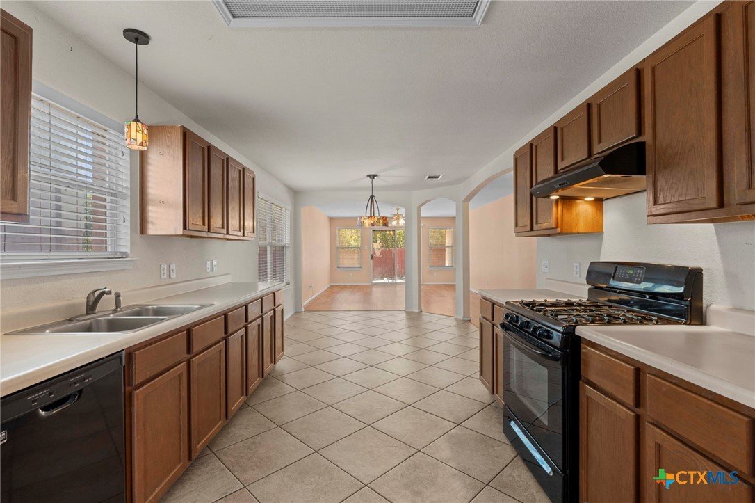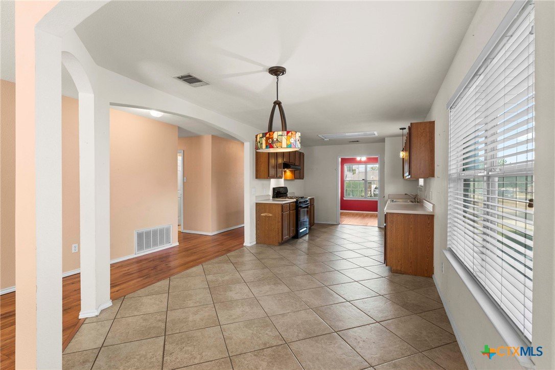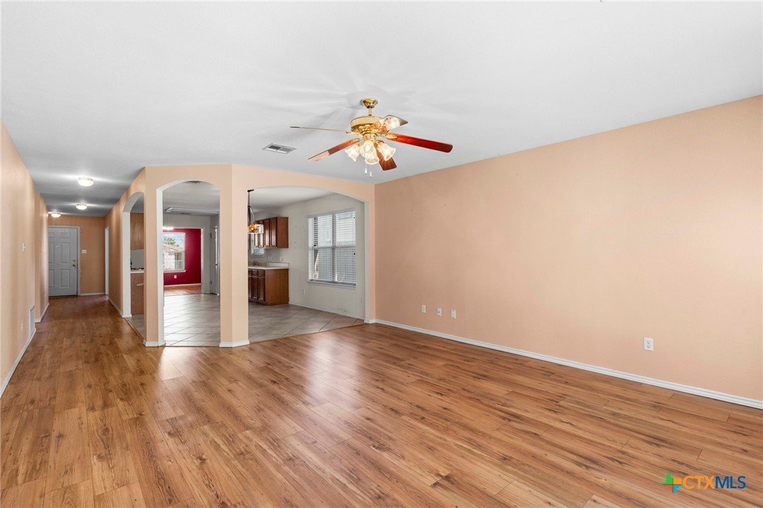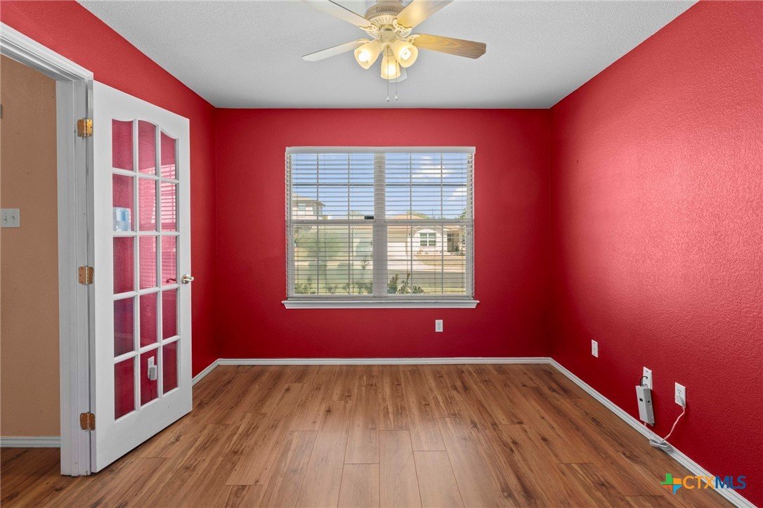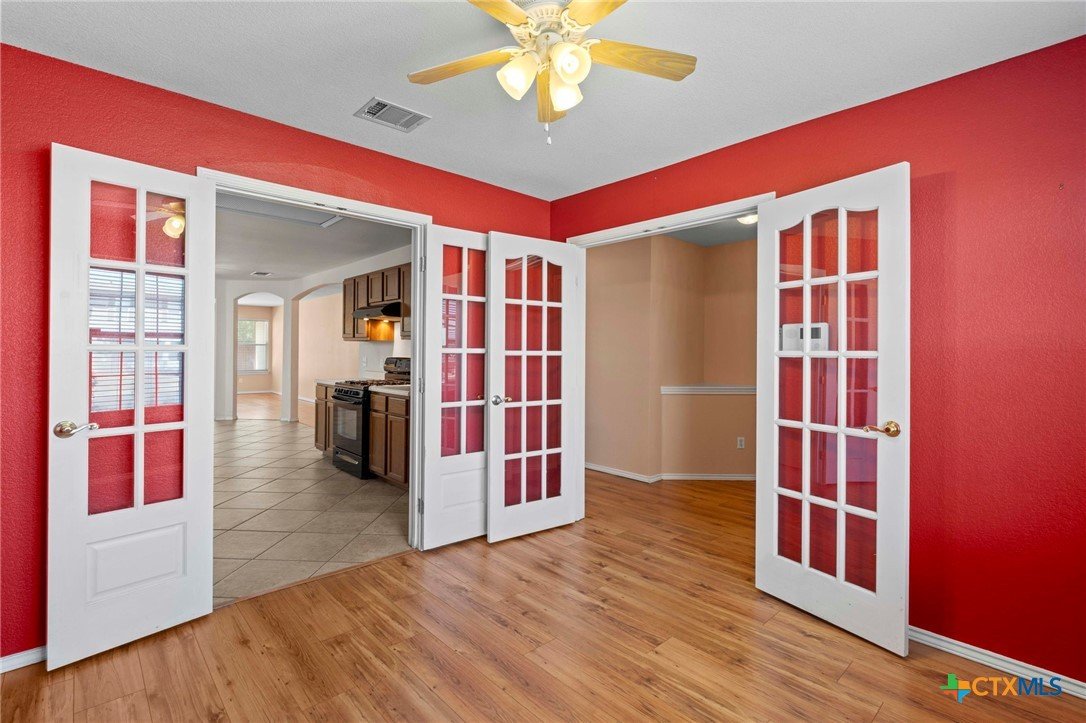 Welcome to this beautifully maintained single-story home featuring 4 bedrooms, 2 bathrooms, and a 2-car garage. The spacious master suite boasts a coffered ceiling, double vanity, separate shower, relaxing garden tub, and a large walk-in closet. The open floor plan is perfect for entertaining, with a kitchen that flows seamlessly into the dining and living areas. Enjoy the beauty of gleaming wood laminate and porcelain tile flooring throughout—NO carpet! Working from home? A private office with elegant French doors provides the perfect space. Step outside to a covered patio and deck, ideal for grilling and gatherings, while enjoying the peaceful greenspace backdrop. This home combines style, comfort, and functionality—don’t miss the opportunity to make it yours!