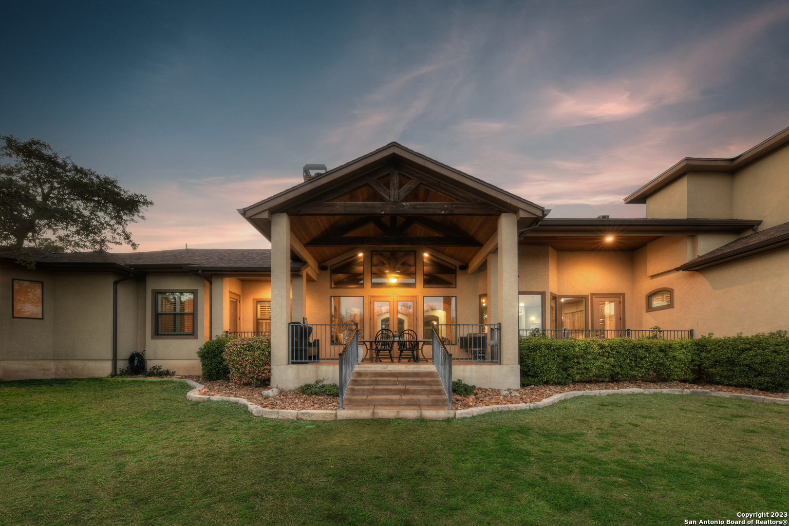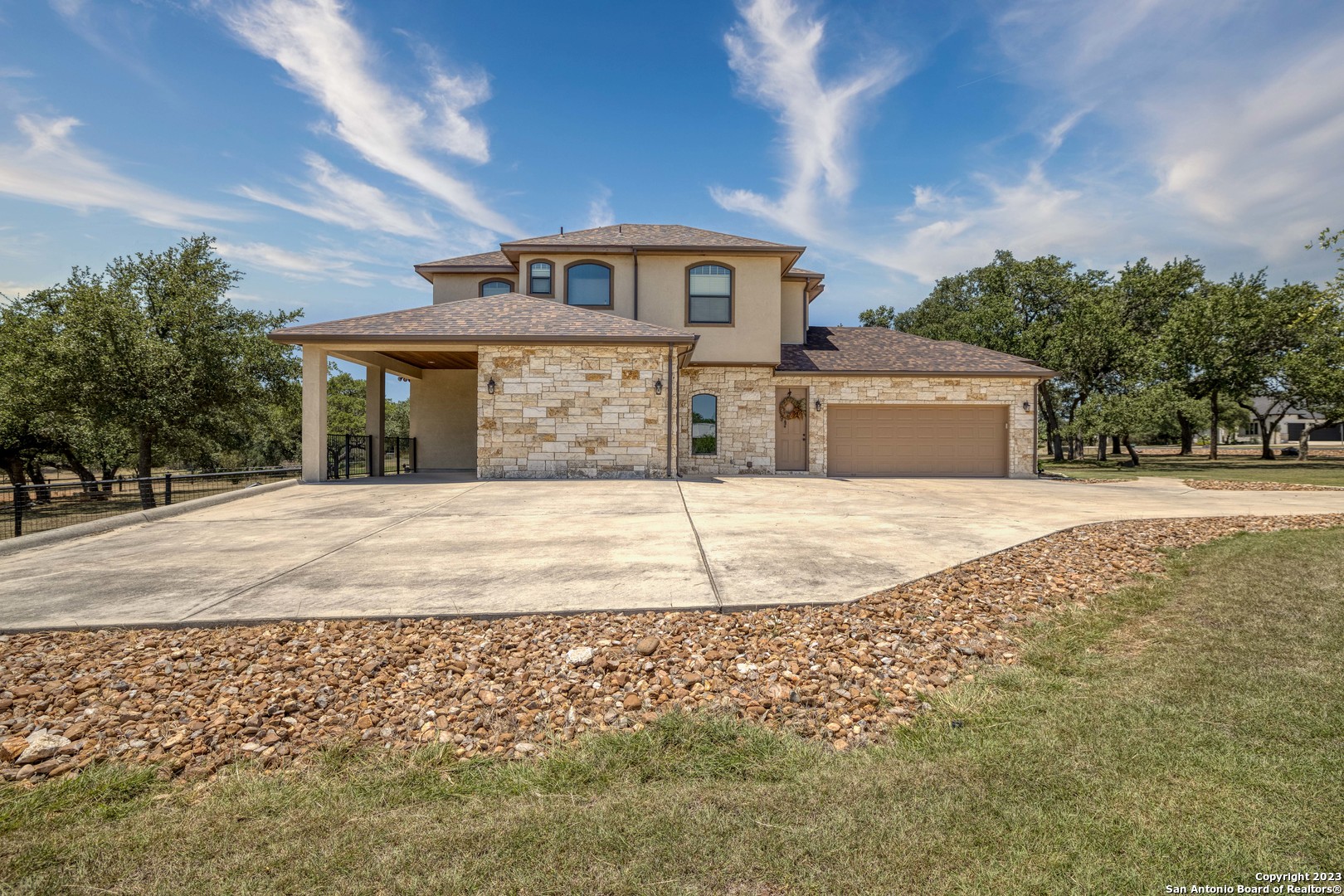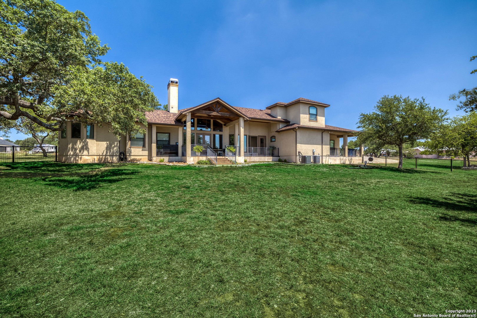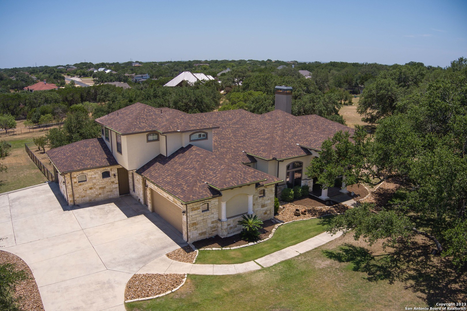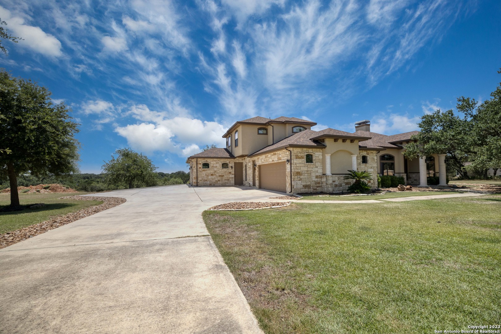 Stunning and luxurious home nestled on a sprawling 2.01-acre estate, where the rustic charm of Texas Hill Country harmoniously blends with the elegance of Mediterranean architecture. Situated in the heart of the picturesque Texas landscape, this residence is a true masterpiece that combines the best of both worlds. As you approach the property, you are greeted by a grand entrance framed by lush, landscaped gardens and towering mature trees. Step inside, and you will be captivated by the refined craftsmanship and meticulous attention to detail. The foyer welcomes you with a casting a radiant glow throughout the space.The gourmet kitchen is fantastic, featuring custom cabinetry, walk-in pantry, and a generous center island with a beautiful granite countertop. The living room is a haven of comfort and sophistication, featuring a gorgeous fireplace and high vaulted ceilings. Oversized windows provide panoramic views of the lush backyard oasis, flooding the space with an abundance of natural light. Adjacent to the living room, a well-appointed study offers a peaceful retreat for work or contemplation. The master suite is a true sanctuary, featuring a spacious bedroom with a sitting area and outside access overlooking the meticulously manicured grounds. The en-suite bathroom is a spa-like haven, complete with a soaking tub, a walk-in shower, and dual vanities. A generously sized walk-in closet offers ample space for your wardrobe and personal belongings. Surrounded by lush landscaping, this private retreat provides the perfect backdrop for relaxation and entertainment. Located within the Ricer Chase master-planned community full of great benefits, including a 57-acre RiverFront Park, sparkling neighborhood pool, walking/hiking/jogging trails, clubhouse, brand new workout facility, sports courts, a true surplus of amenities to meet every desire. The covered patio invites you to savor the breathtaking views of the rolling hills and majestic sunsets that Texas Hill Country is renowned for. With its impeccable design, breathtaking views, and unrivaled attention to detail, this Texas Hill Country masterpiece offers an extraordinary lifestyle that truly embodies the pinnacle of opulence!