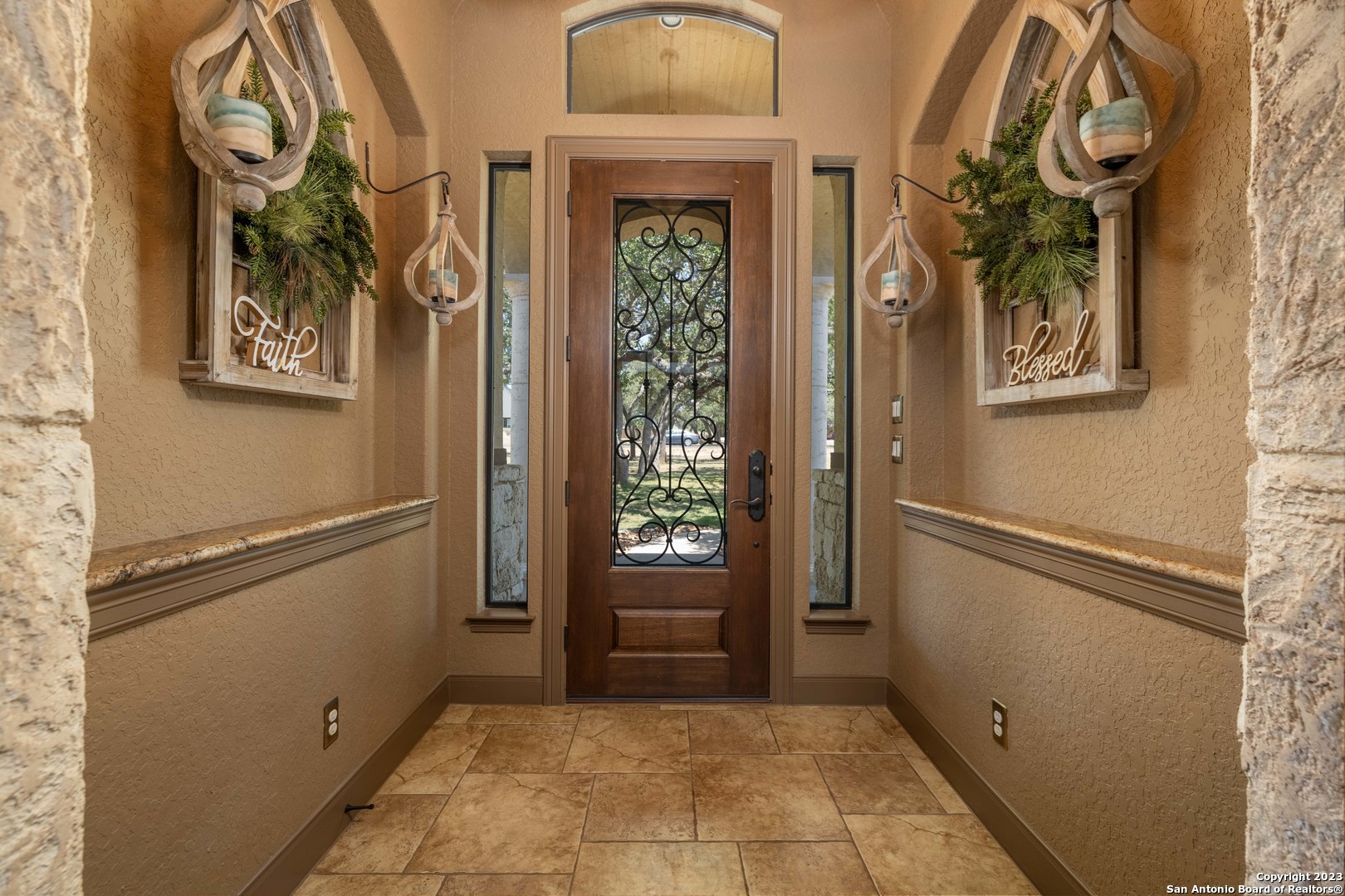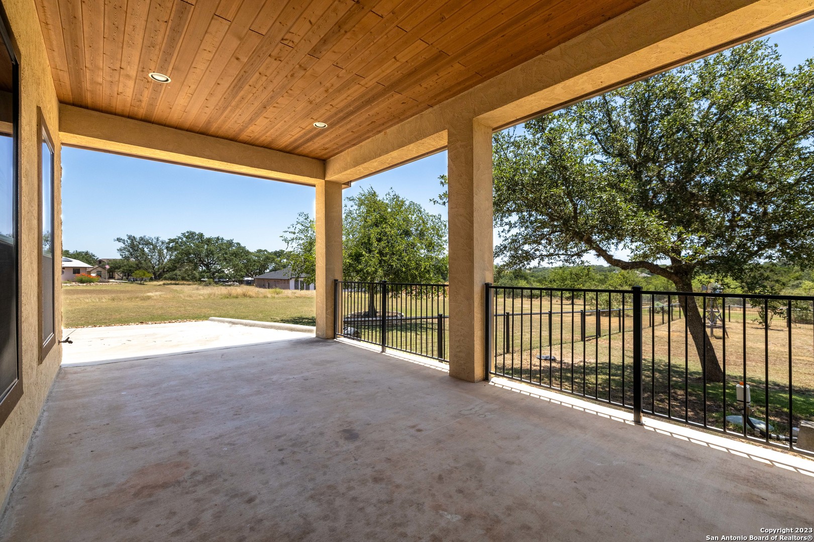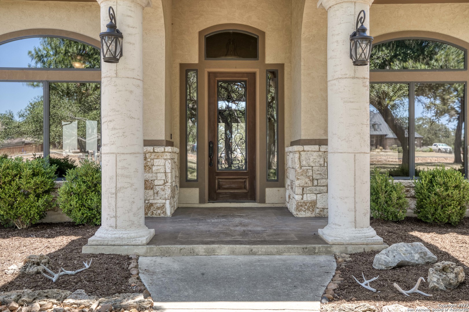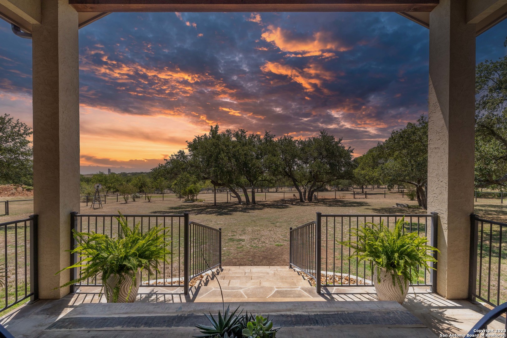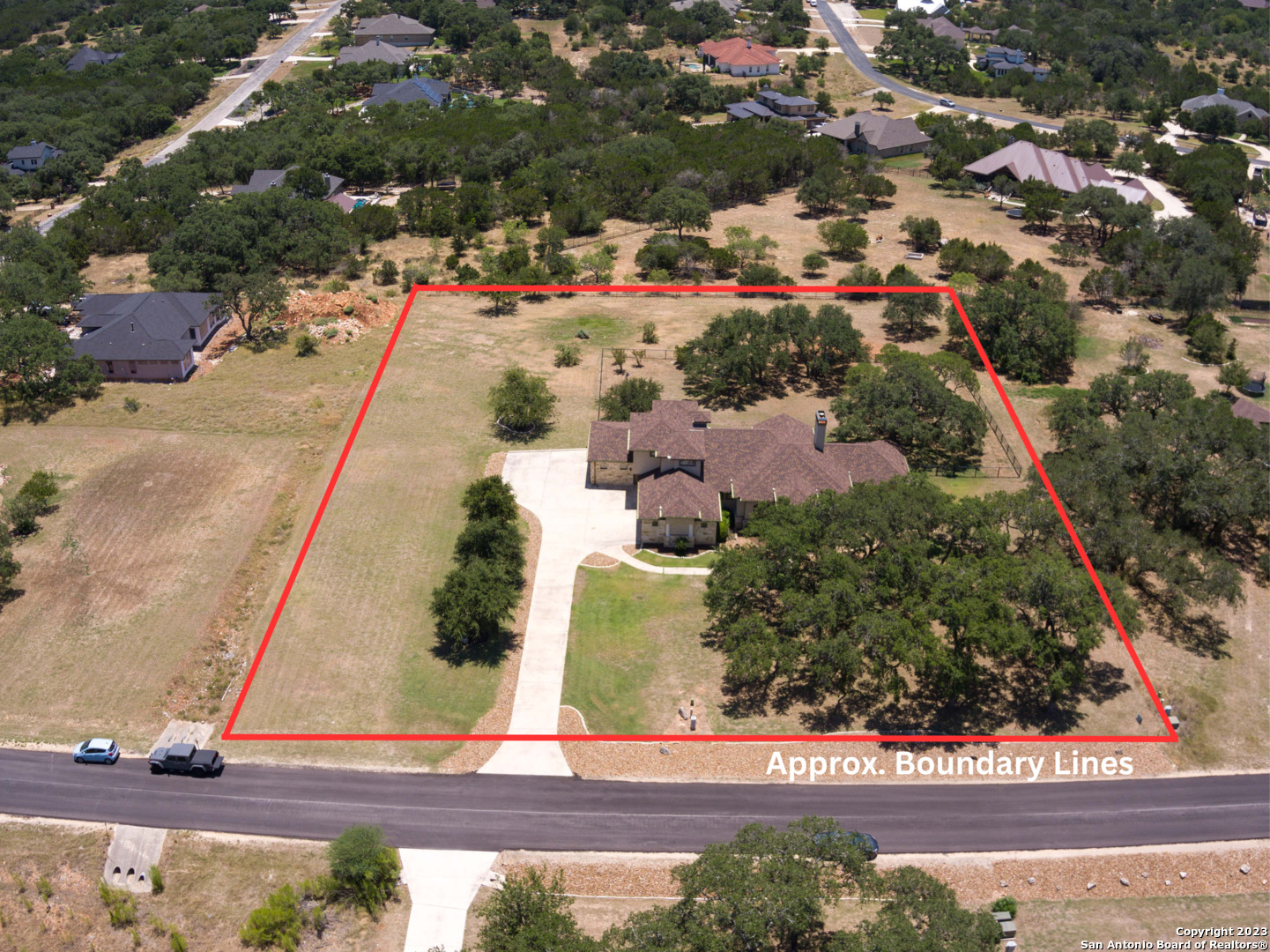 Stunning and luxurious home nestled on a sprawling 2.01-acre estate, where the rustic charm of Texas Hill Country harmoniously blends with the elegance of Mediterranean architecture. Situated in the heart of the picturesque Texas landscape, this residence is a true masterpiece that combines the best of both worlds. As you approach the property, you are greeted by a grand entrance framed by lush, landscaped gardens and towering mature trees. Step inside, and you will be captivated by the refined craftsmanship and meticulous attention to detail. The foyer welcomes you with a casting a radiant glow throughout the space.The gourmet kitchen is fantastic, featuring custom cabinetry, walk-in pantry, and a generous center island with a beautiful granite countertop. The living room is a haven of comfort and sophistication, featuring a gorgeous fireplace and high vaulted ceilings. Oversized windows provide panoramic views of the lush backyard oasis, flooding the space with an abundance of natural light. Adjacent to the living room, a well-appointed study offers a peaceful retreat for work or contemplation. The master suite is a true sanctuary, featuring a spacious bedroom with a sitting area and outside access overlooking the meticulously manicured grounds. The en-suite bathroom is a spa-like haven, complete with a soaking tub, a walk-in shower, and dual vanities. A generously sized walk-in closet offers ample space for your wardrobe and personal belongings. Surrounded by lush landscaping, this private retreat provides the perfect backdrop for relaxation and entertainment. Located within the Ricer Chase master-planned community full of great benefits, including a 57-acre RiverFront Park, sparkling neighborhood pool, walking/hiking/jogging trails, clubhouse, brand new workout facility, sports courts, a true surplus of amenities to meet every desire. The covered patio invites you to savor the breathtaking views of the rolling hills and majestic sunsets that Texas Hill Country is renowned for. With its impeccable design, breathtaking views, and unrivaled attention to detail, this Texas Hill Country masterpiece offers an extraordinary lifestyle that truly embodies the pinnacle of opulence!