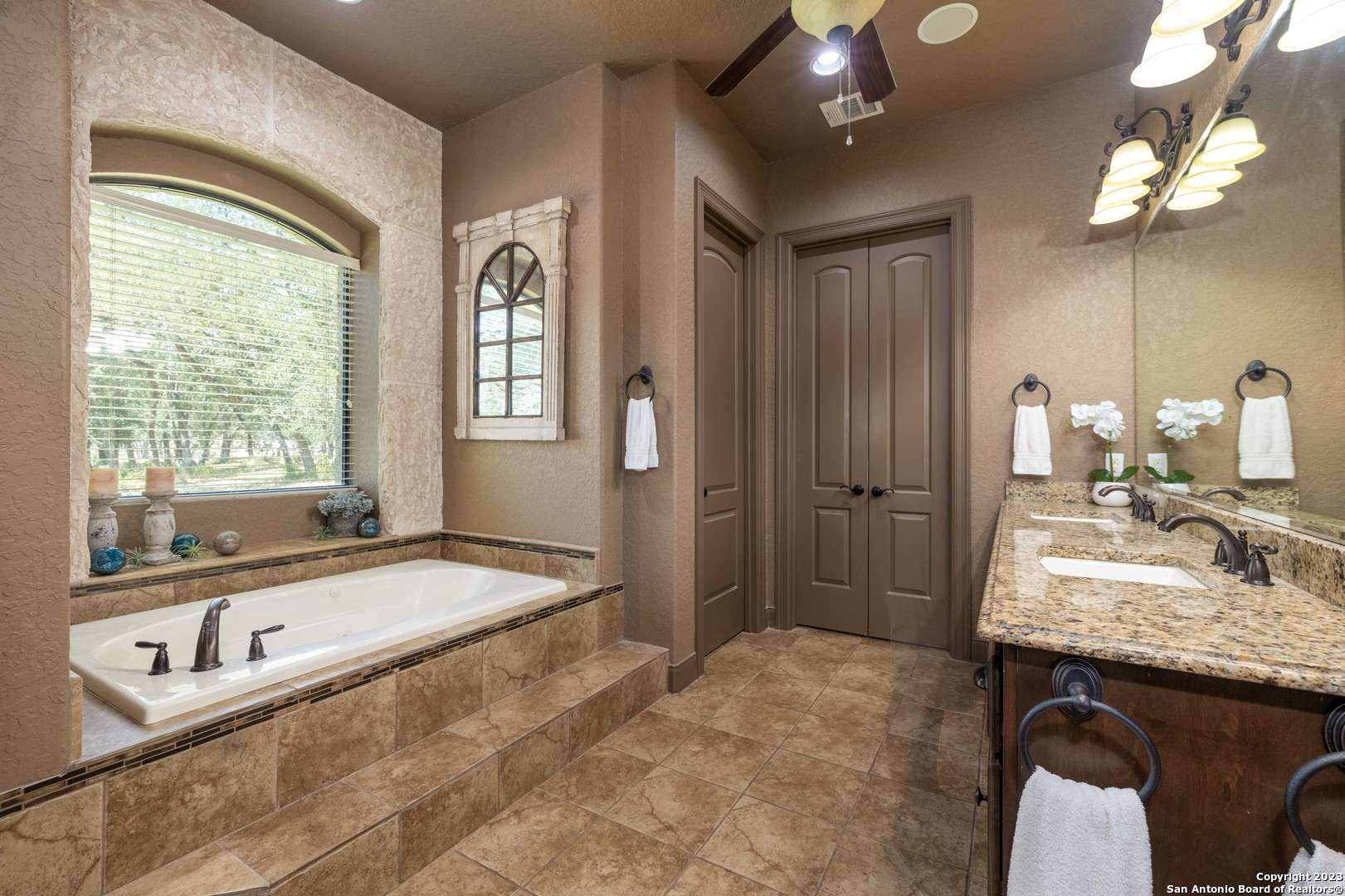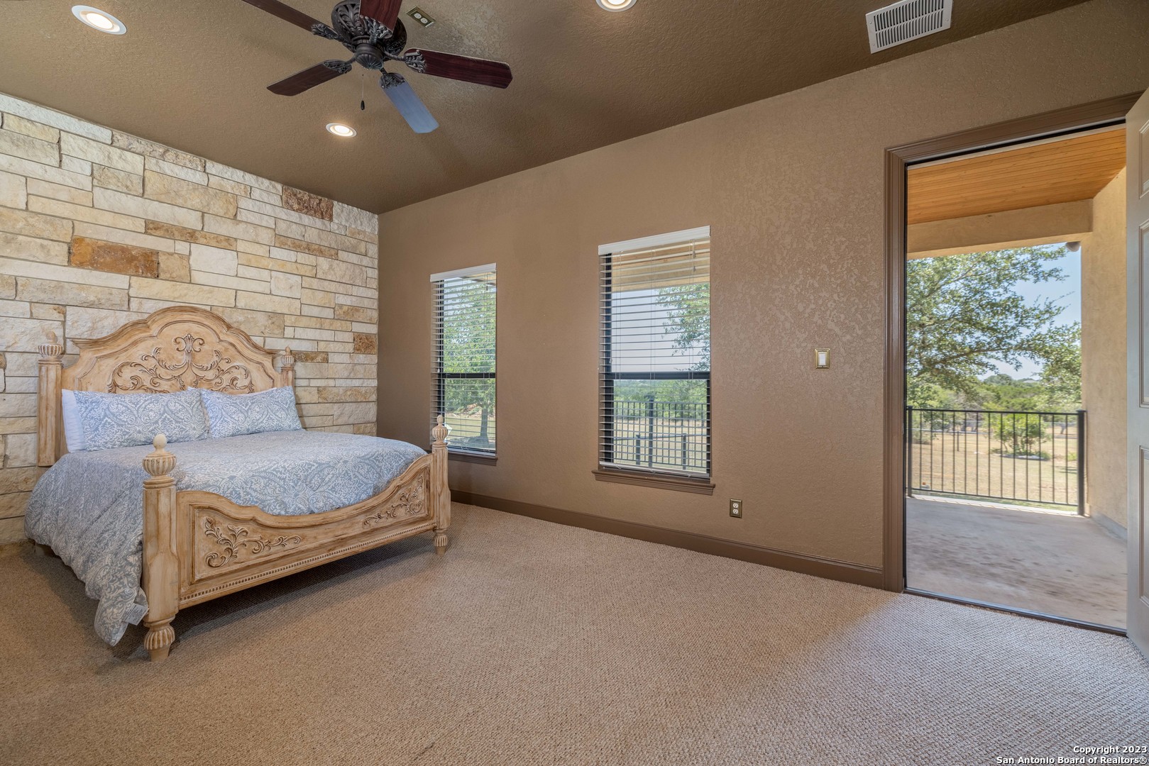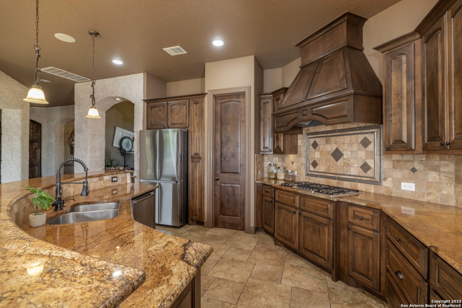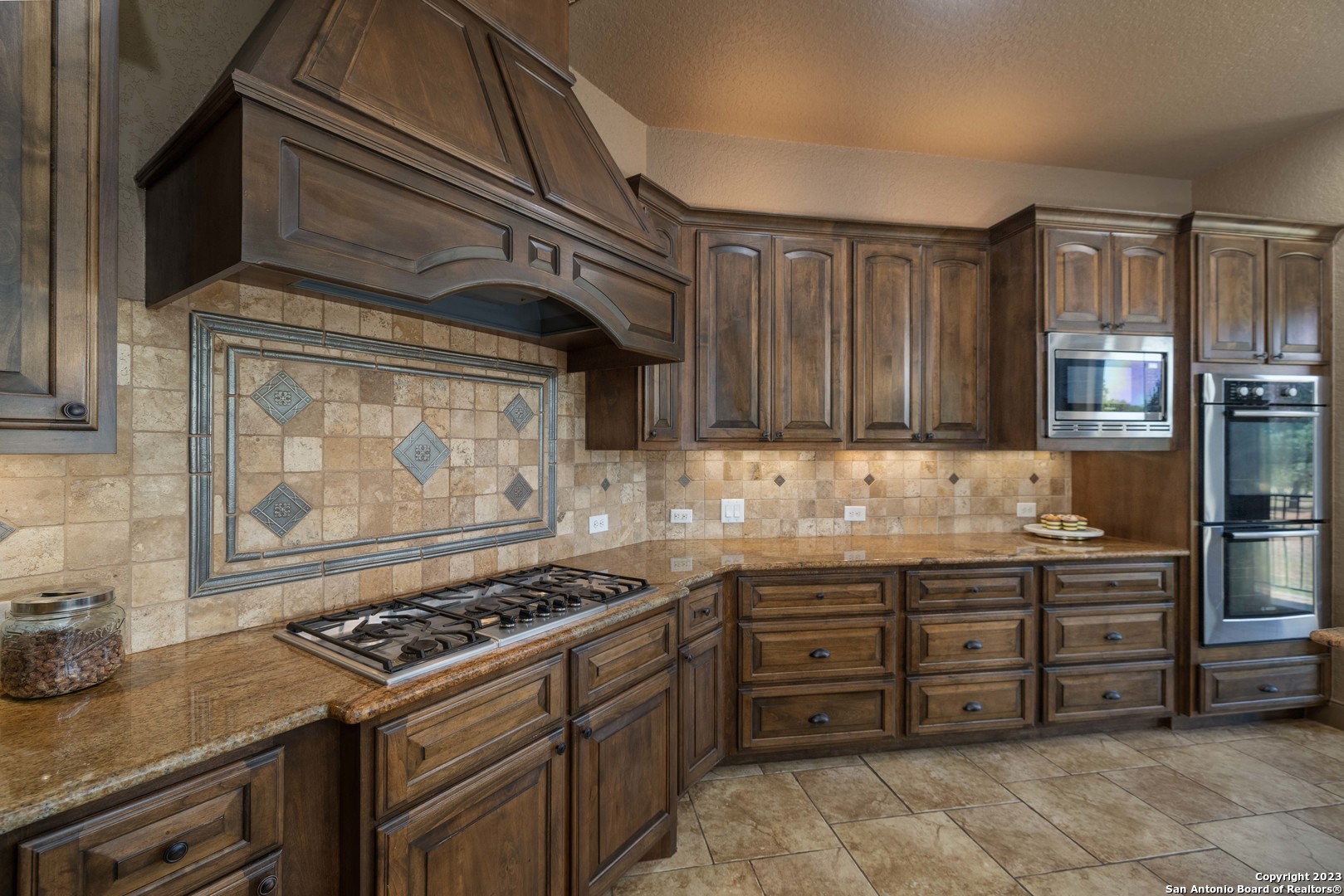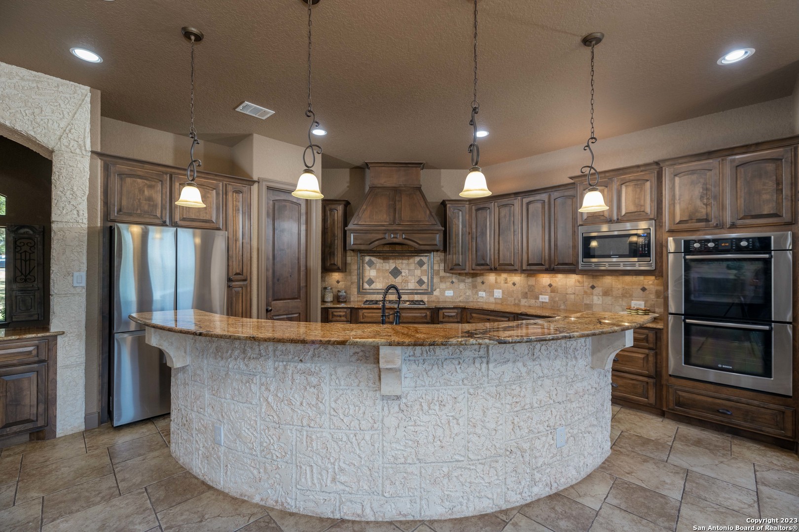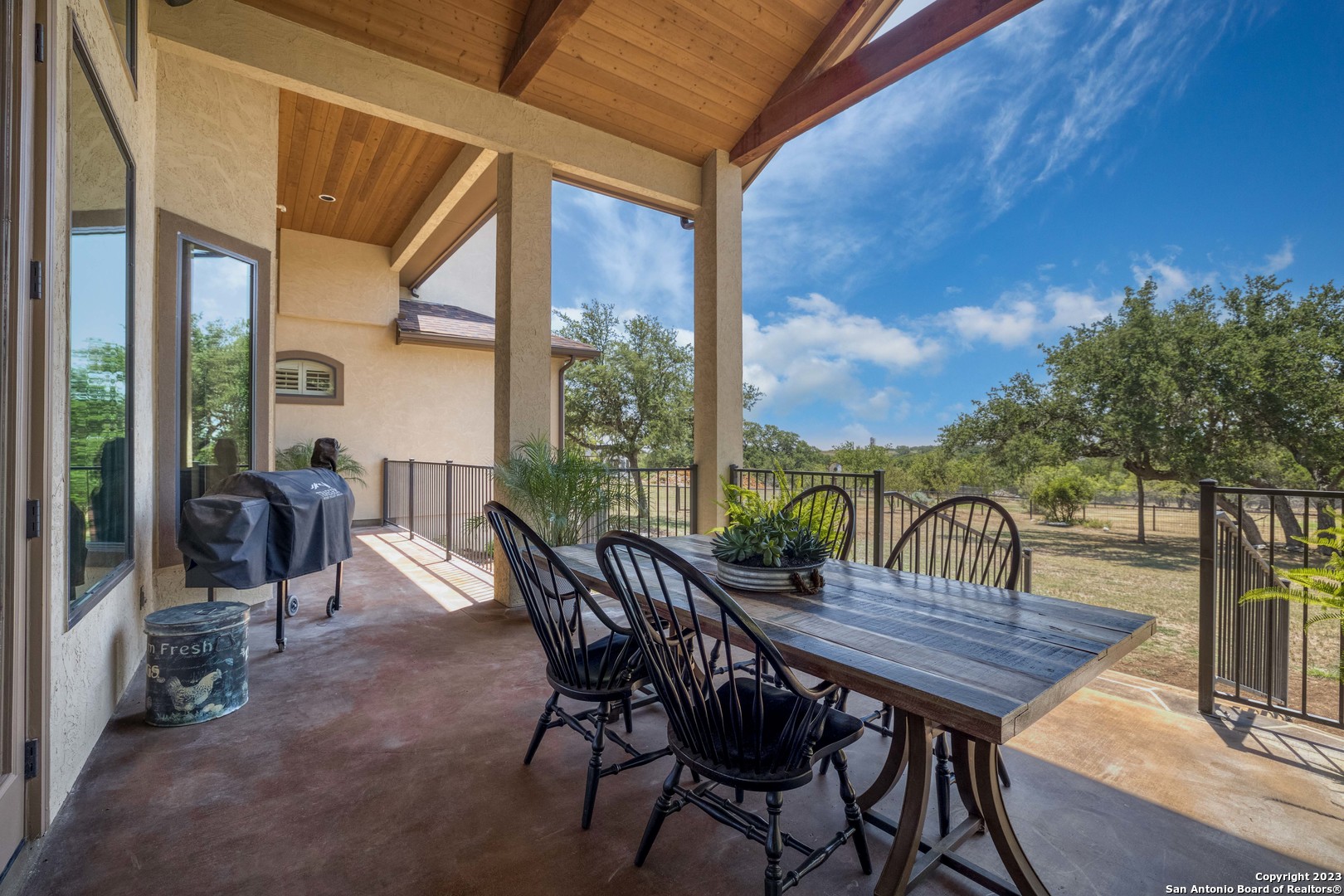 Stunning and luxurious home nestled on a sprawling 2.01-acre estate, where the rustic charm of Texas Hill Country harmoniously blends with the elegance of Mediterranean architecture. Situated in the heart of the picturesque Texas landscape, this residence is a true masterpiece that combines the best of both worlds. As you approach the property, you are greeted by a grand entrance framed by lush, landscaped gardens and towering mature trees. Step inside, and you will be captivated by the refined craftsmanship and meticulous attention to detail. The foyer welcomes you with a casting a radiant glow throughout the space.The gourmet kitchen is fantastic, featuring custom cabinetry, walk-in pantry, and a generous center island with a beautiful granite countertop. The living room is a haven of comfort and sophistication, featuring a gorgeous fireplace and high vaulted ceilings. Oversized windows provide panoramic views of the lush backyard oasis, flooding the space with an abundance of natural light. Adjacent to the living room, a well-appointed study offers a peaceful retreat for work or contemplation. The master suite is a true sanctuary, featuring a spacious bedroom with a sitting area and outside access overlooking the meticulously manicured grounds. The en-suite bathroom is a spa-like haven, complete with a soaking tub, a walk-in shower, and dual vanities. A generously sized walk-in closet offers ample space for your wardrobe and personal belongings. Surrounded by lush landscaping, this private retreat provides the perfect backdrop for relaxation and entertainment. Located within the Ricer Chase master-planned community full of great benefits, including a 57-acre RiverFront Park, sparkling neighborhood pool, walking/hiking/jogging trails, clubhouse, brand new workout facility, sports courts, a true surplus of amenities to meet every desire. The covered patio invites you to savor the breathtaking views of the rolling hills and majestic sunsets that Texas Hill Country is renowned for. With its impeccable design, breathtaking views, and unrivaled attention to detail, this Texas Hill Country masterpiece offers an extraordinary lifestyle that truly embodies the pinnacle of opulence!