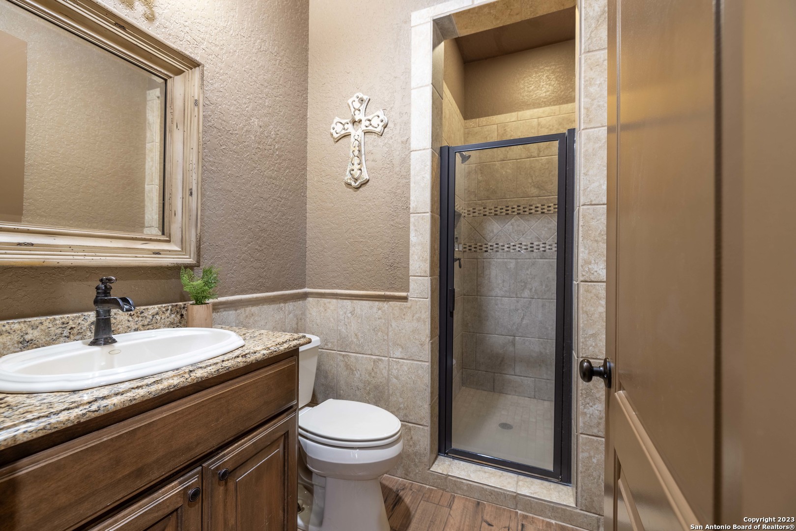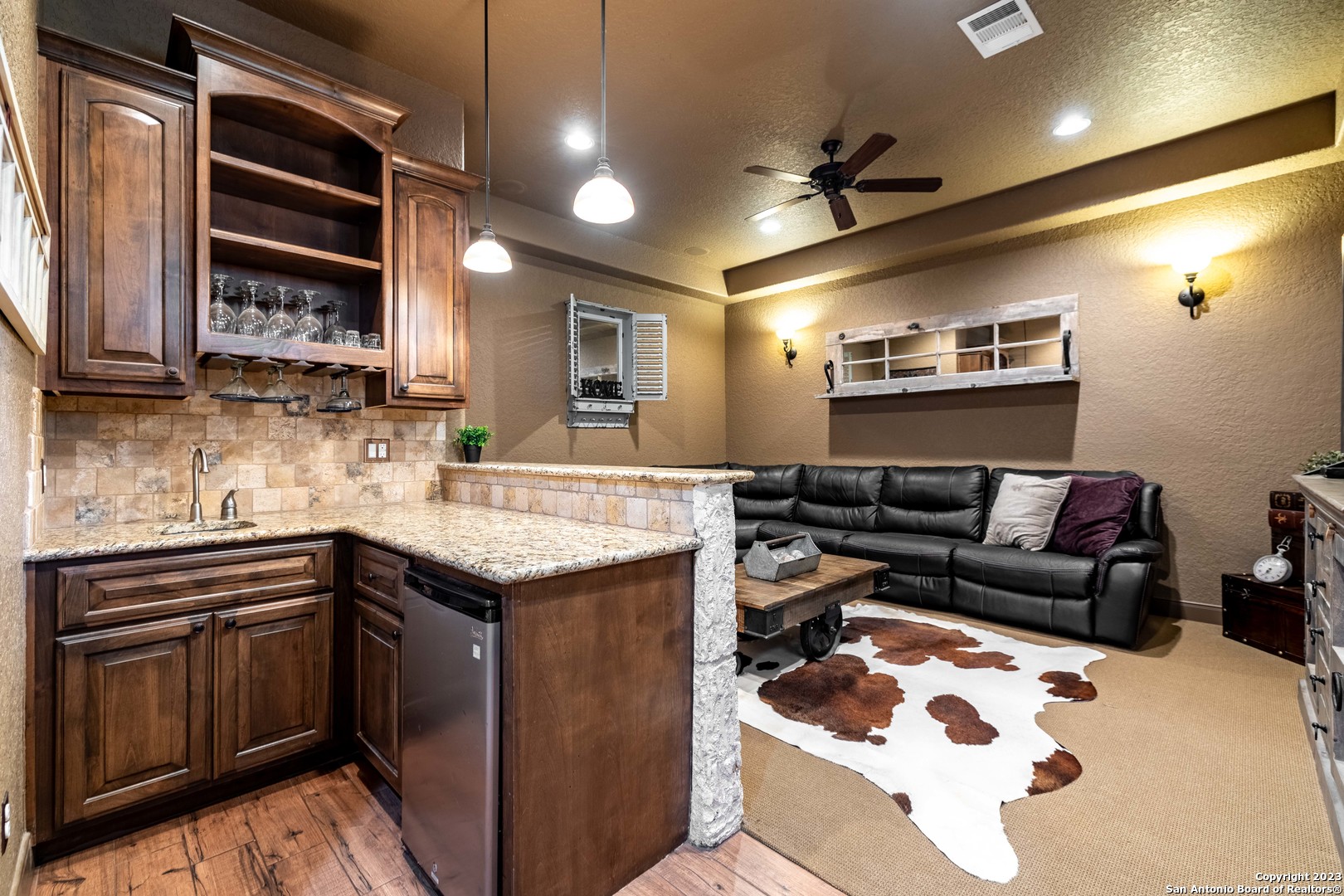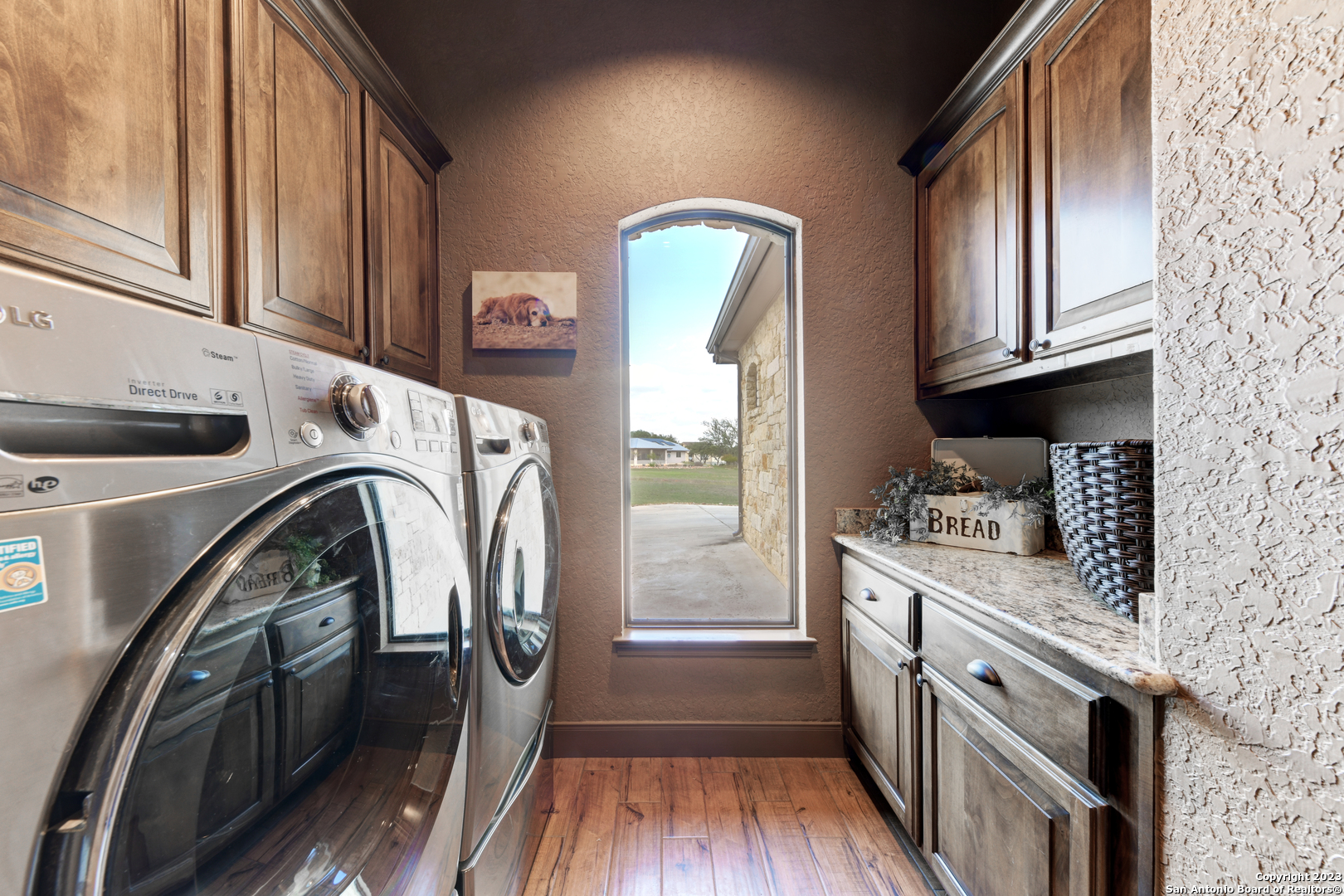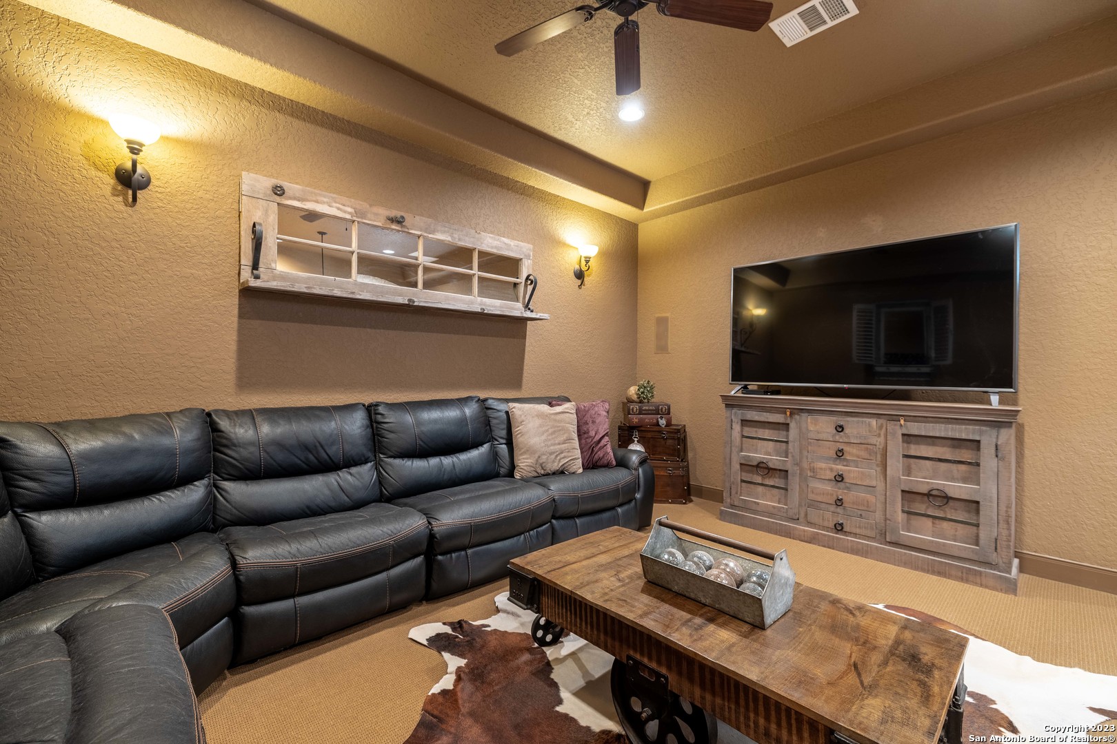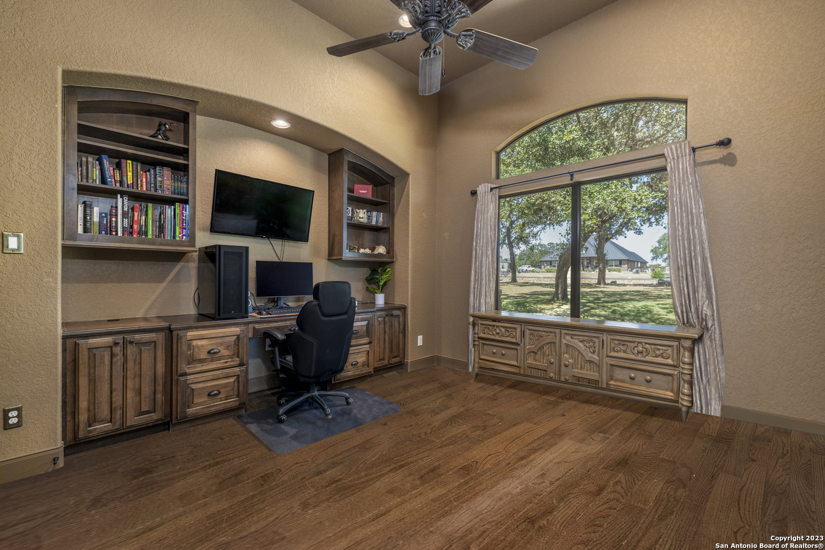 Stunning and luxurious home nestled on a sprawling 2.01-acre estate, where the rustic charm of Texas Hill Country harmoniously blends with the elegance of Mediterranean architecture. Situated in the heart of the picturesque Texas landscape, this residence is a true masterpiece that combines the best of both worlds. As you approach the property, you are greeted by a grand entrance framed by lush, landscaped gardens and towering mature trees. Step inside, and you will be captivated by the refined craftsmanship and meticulous attention to detail. The foyer welcomes you with a casting a radiant glow throughout the space.The gourmet kitchen is fantastic, featuring custom cabinetry, walk-in pantry, and a generous center island with a beautiful granite countertop. The living room is a haven of comfort and sophistication, featuring a gorgeous fireplace and high vaulted ceilings. Oversized windows provide panoramic views of the lush backyard oasis, flooding the space with an abundance of natural light. Adjacent to the living room, a well-appointed study offers a peaceful retreat for work or contemplation. The master suite is a true sanctuary, featuring a spacious bedroom with a sitting area and outside access overlooking the meticulously manicured grounds. The en-suite bathroom is a spa-like haven, complete with a soaking tub, a walk-in shower, and dual vanities. A generously sized walk-in closet offers ample space for your wardrobe and personal belongings. Surrounded by lush landscaping, this private retreat provides the perfect backdrop for relaxation and entertainment. Located within the Ricer Chase master-planned community full of great benefits, including a 57-acre RiverFront Park, sparkling neighborhood pool, walking/hiking/jogging trails, clubhouse, brand new workout facility, sports courts, a true surplus of amenities to meet every desire. The covered patio invites you to savor the breathtaking views of the rolling hills and majestic sunsets that Texas Hill Country is renowned for. With its impeccable design, breathtaking views, and unrivaled attention to detail, this Texas Hill Country masterpiece offers an extraordinary lifestyle that truly embodies the pinnacle of opulence!