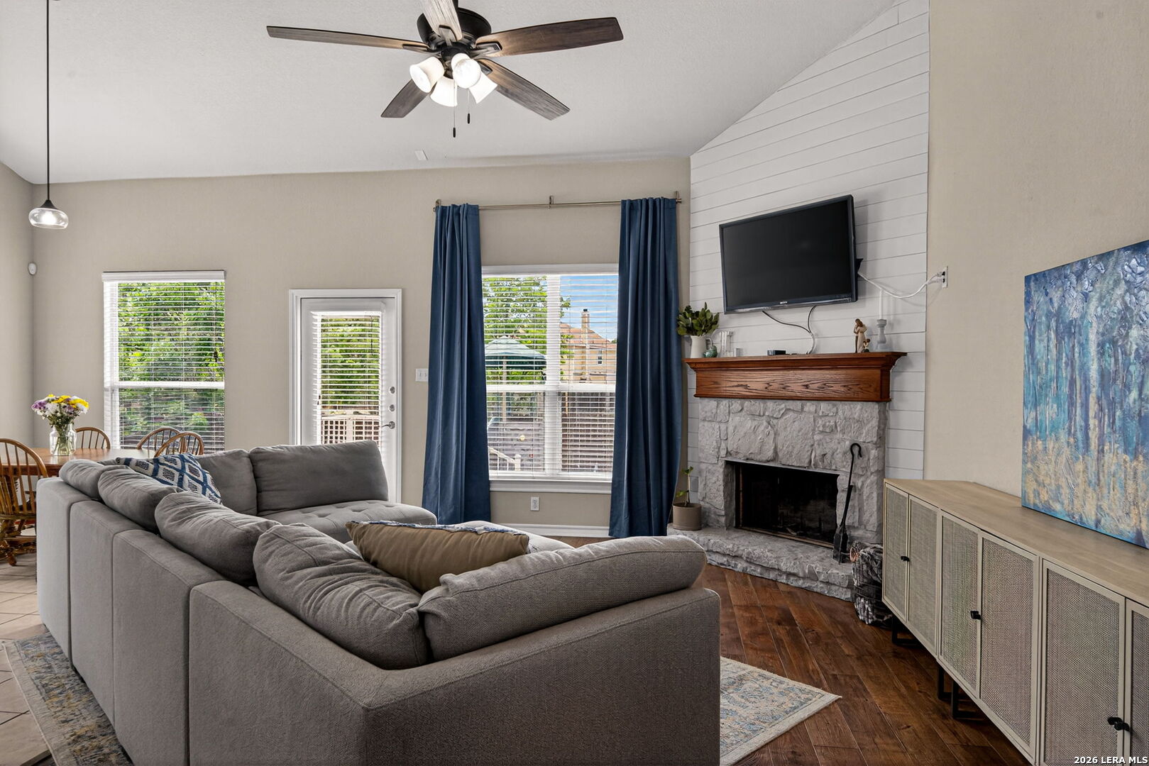 ** OPEN HOUSE SAT APRIL 10TH 1-3 PM** Beautifully positioned in Panther Creek @ 22839 Cardigan Chase, this well-maintained 4 Bedroom, 2.5 bath home offers a comfortable and functional layout designed for everyday living and entertaining. An open-concept living and dining area flows seamlessly into the spacious family room, featuring a stone fireplace and wood laminate flooring that create a warm and inviting atmosphere. The kitchen is thoughtfully designed with abundant cabinetry, solid countertops, ceramic tile floors, a breakfast bar overlooking the family room, and a separate breakfast nook for casual dining. The generously sized primary suite provides a relaxing retreat with a full bath that includes dual vanities, a soaking tub, a separate shower, and a walk-in closet. Upstairs, you'll find secondary bedrooms along with a versatile loft and study nook, offering flexible space for work, hobbies, or additional living needs. The fenced backyard backs to a greenbelt with peaceful park views, creating a private outdoor setting, and offers convenient access to nearby community amenities. Ideally located near Blanco Road and Loop 1604, this home provides easy access to shopping, dining, and everyday conveniences.