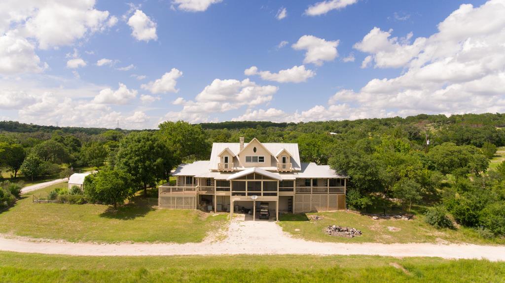 21 picturesque acres,live water, guest cottage! From front gate to back fence this property says Welcome Home, Relax, Unwind, Prop your feet up and enjoy the Hill Country view. The home is a custom constructed log home featuring pine flooring, granite counter tops, soaring ceilings, porches on all sides of the house, including a large screened in covered porch that is ideal for outdoor entertaining or could be great as a sleeping porch during mild weather. The fireplace in the great room creates the perfect home center piece. The master bedroom is situated on the main level of the house; a spacious room that opens onto a porch. The attached master bath has a large walk in shower and two basins. Two guest rooms upstairs share a single bath. Both guest bedrooms have spacious closets and plenty of windows to enjoy the outdoor views. There is a cozy den, perfect for a huge screen TV, think, hosting Sunday afternoon football. There is also great space for your pool table or gaming table, and another area for your workout equipment. Sq ft is approximate, includes both main and guest house sq ft, beds and baths. Seller is a licensed Realtor.