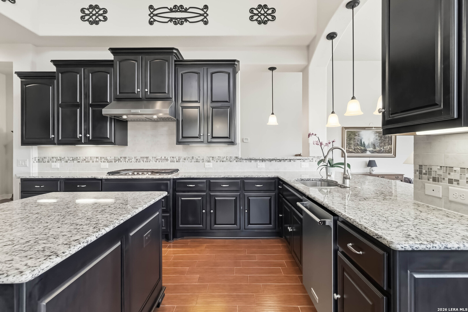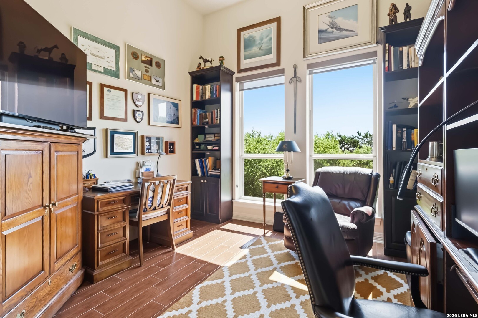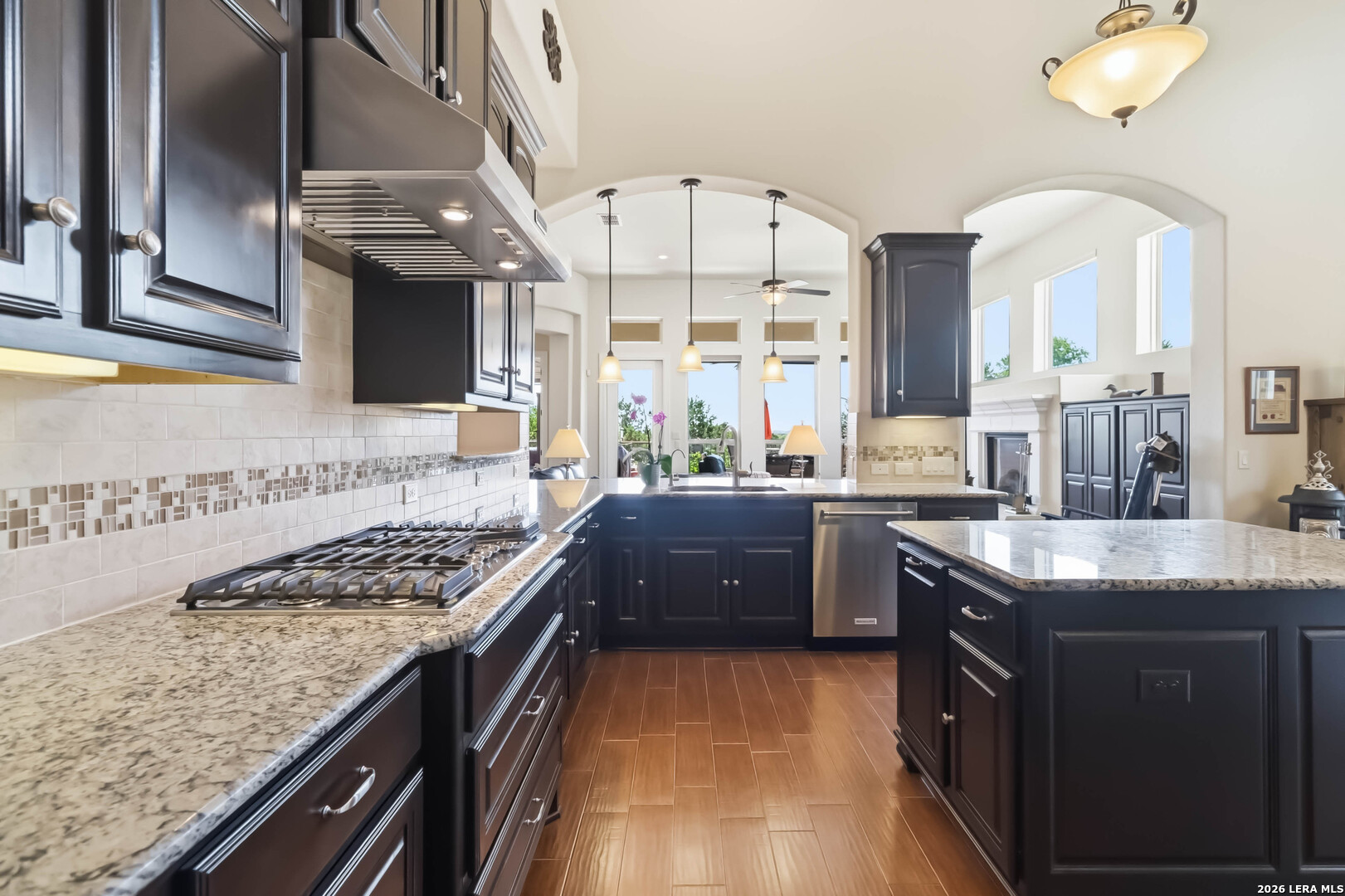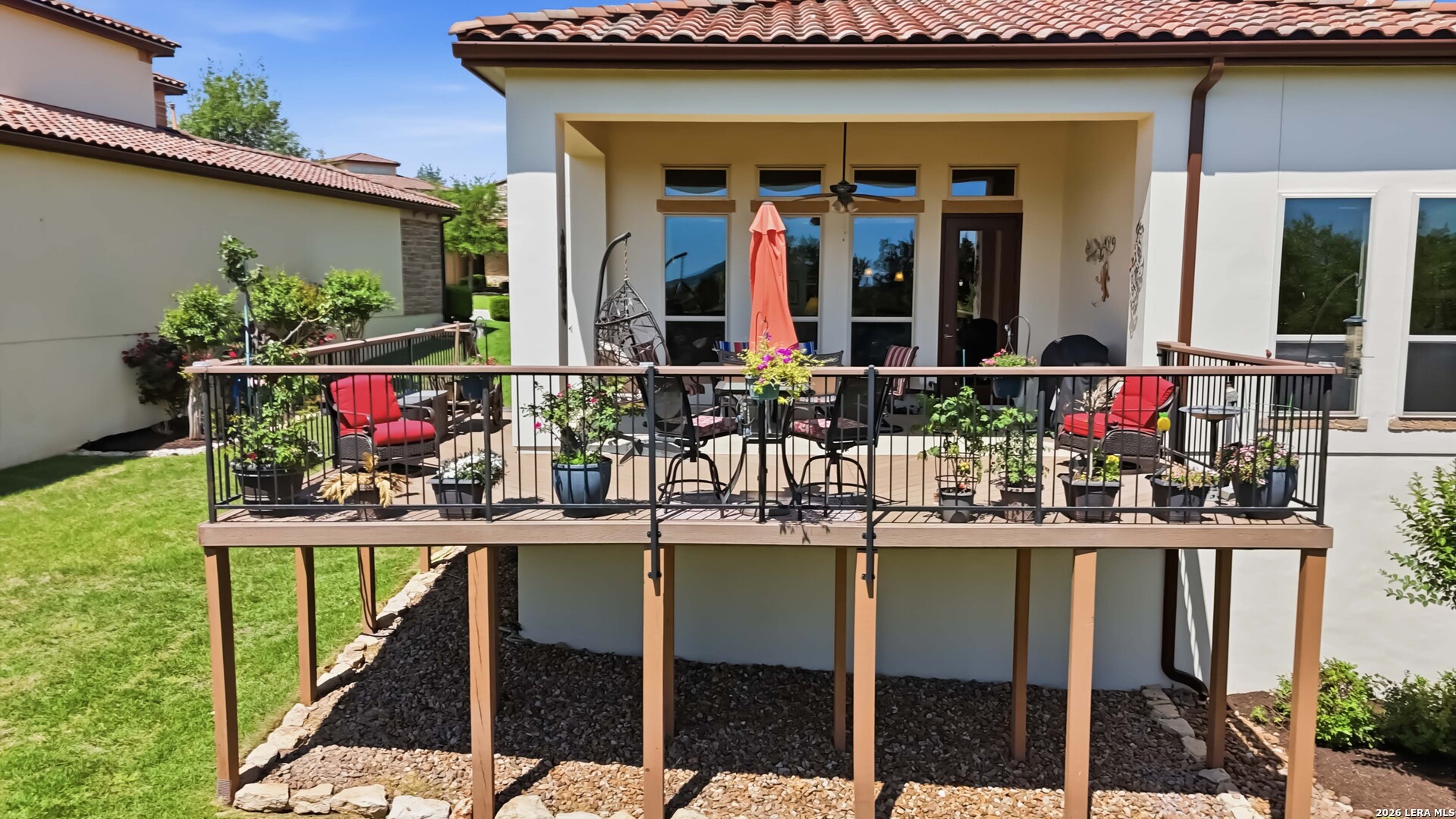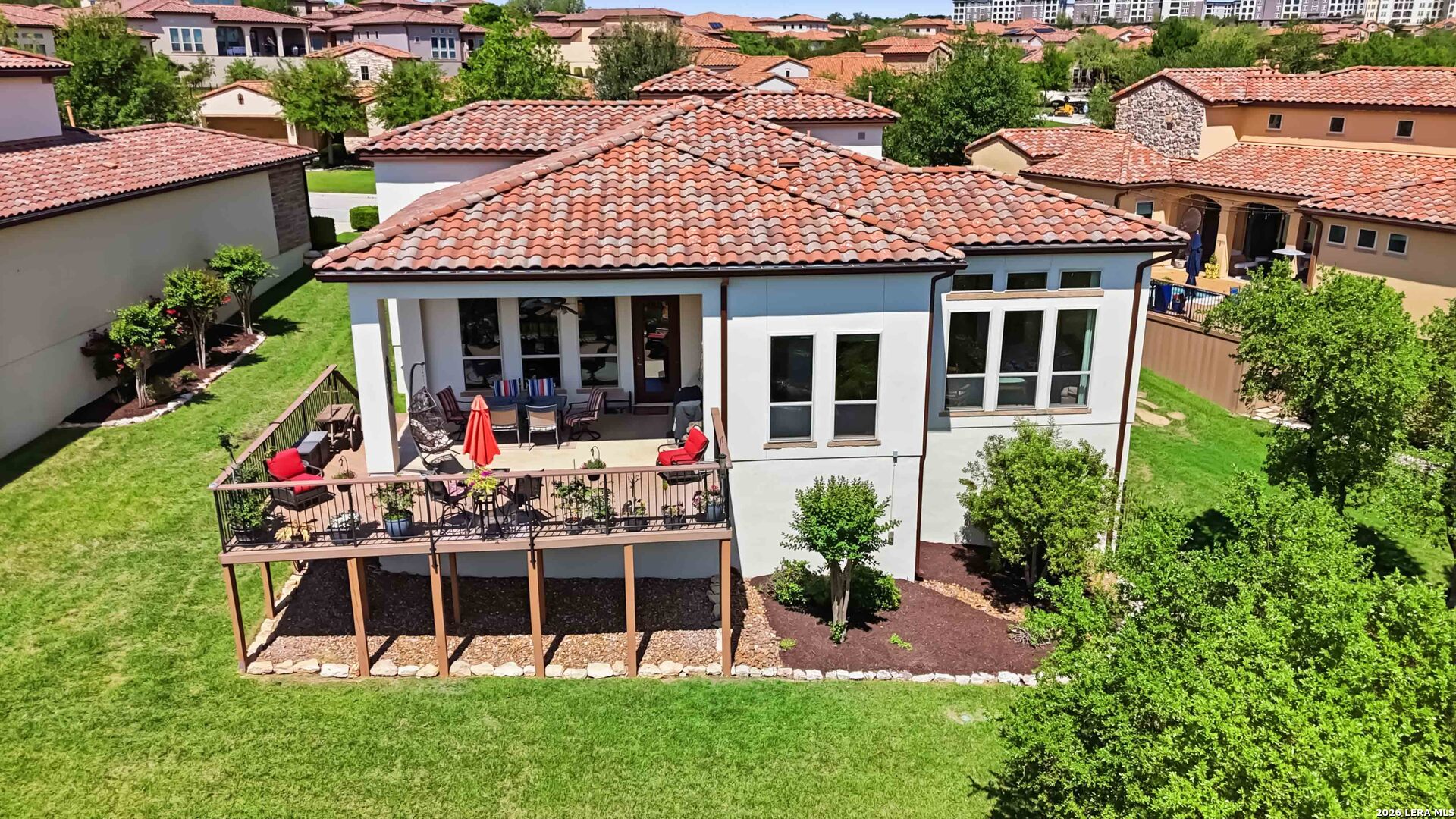 Luxury single-story home in Campanas at Cibolo Canyons featuring a greenbelt lot, hill country views, oversized composite deck, chef's kitchen with double ovens, 2-car oversized garage with epoxy floor, and a Generac whole-home generator, all within a gated community with lawn maintenance included. Welcome to 22910 Estacado, a beautifully upgraded Sitterle home that offers exceptional curb appeal with mature trees and a charming front courtyard that warmly invites you in. Inside, the home is filled with abundant natural light, highlighted by soaring ceilings and an open-concept layout designed for both comfortable living and elegant entertaining. The spacious living area showcases a gas fireplace framed by custom built-in cabinetry, while expansive windows create a bright and airy atmosphere and draw your attention to the peaceful greenbelt views beyond. The chef's kitchen has been thoughtfully expanded to provide additional space and functionality, featuring KitchenAid appliances, double ovens, a 5-burner gas cooktop, built-in wine cooler, custom cabinetry, under-cabinet lighting, and a large island perfect for gathering. The private primary suite offers a tranquil retreat with large windows overlooking the backyard, while the spa-like bathroom includes a walk-in shower, Jacuzzi soaking tub, and oversized custom cabinetry on separate vanities along with a generous walk-in closet. Designated office features custom cabinetry framing the window with views. One of the home's most impressive features is the outdoor living space, where an oversized composite deck overlooks lush green space, providing both privacy and scenic views-ideal for relaxing or entertaining. Additional upgrades include an expanded garage with epoxy flooring and added storage, a whole-house Generac generator, water softener system with kitchen filtration, custom window coverings including blackout curtains and electric shades, plantation shutters, upgraded lighting, a dedicated study with custom built-ins, professionally landscaped grounds with drought-tolerant plants, and a pre-wired security system. Located in a gated, low-maintenance community with HOA lawn care included, this home offers a true lock-and-leave lifestyle while being conveniently close to the JW Marriott, golf, dining, and top-rated NEISD schools. This is a rare opportunity to own a thoughtfully upgraded home that combines luxury, functionality, and stunning natural surroundings.