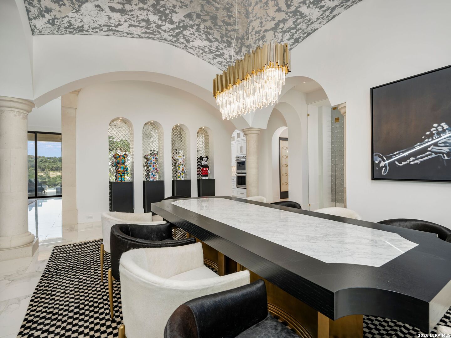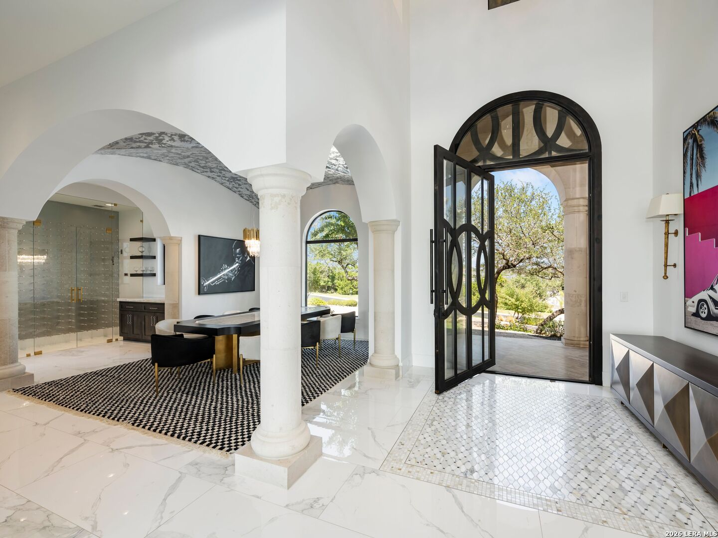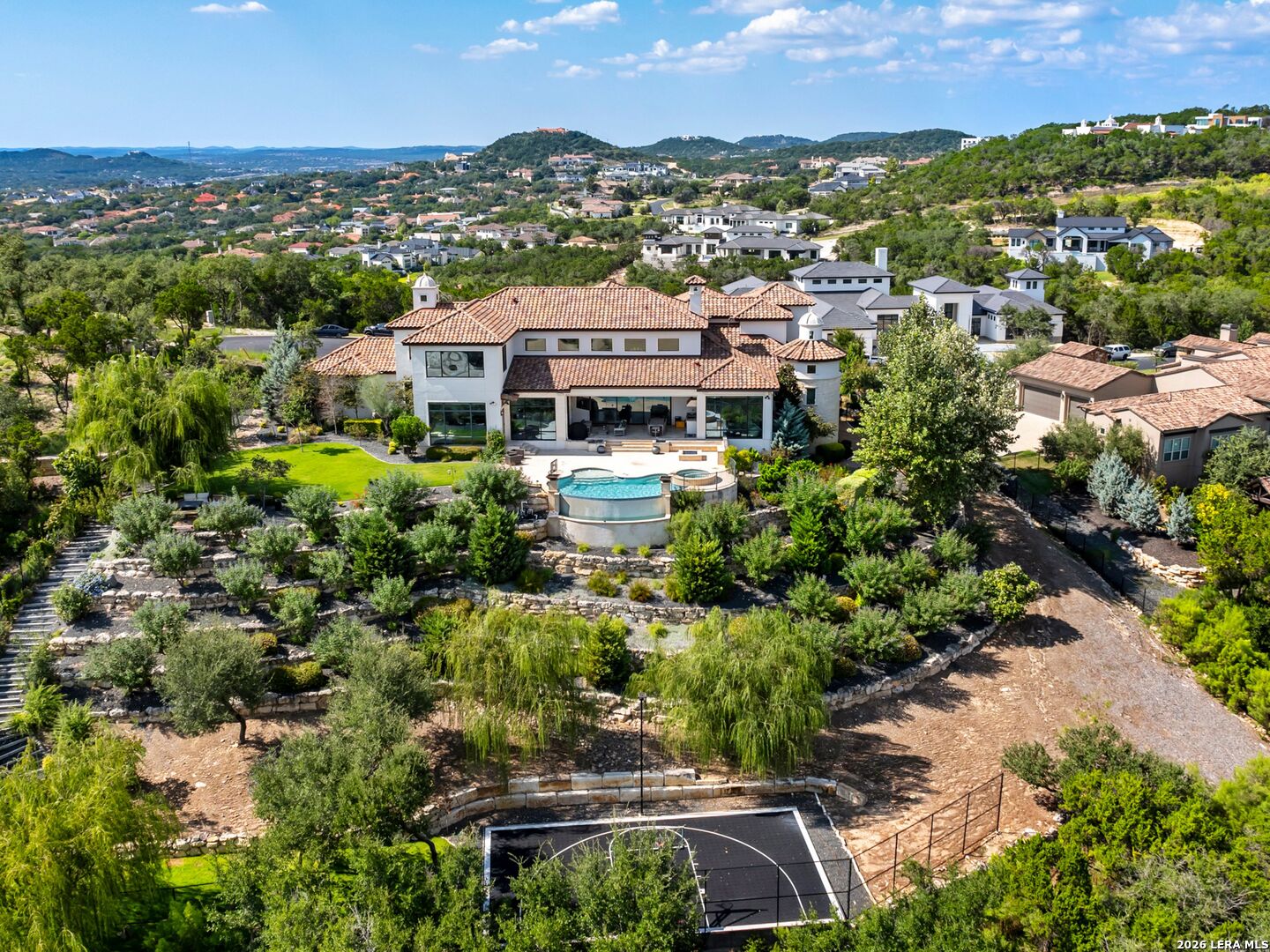 An extraordinary estate that blends refined craftsmanship with modern design, perfectly suited for both quiet living and large-scale entertaining. The residence is defined by soaring ceilings, contemporary fixtures, statuary finishes, and expansive walls of glass that flood the interiors with natural light. Smart home integration through Control4 automation provides seamless technology at your fingertips. Every space has been thoughtfully designed with exceptional detail and curated materials. The great room with its floating ceiling transitions into a chef's kitchen appointed with professional-grade Thermador appliances, custom Michael Edwards solid wood cabinetry, and dual oversized quartz islands. Expansive LaCantina doors create a seamless indoor-outdoor flow. The outdoor setting is nothing short of spectacular. Panoramic hilltop views frame a resort-inspired infinity-edge Keith Zars pool and spa, full outdoor kitchen, fire features, and a sports court. Whether hosting a grand celebration or enjoying quiet evenings at home, 23 Grand Terrace offers an incomparable lifestyle in one of San Antonio's most exclusive enclaves.