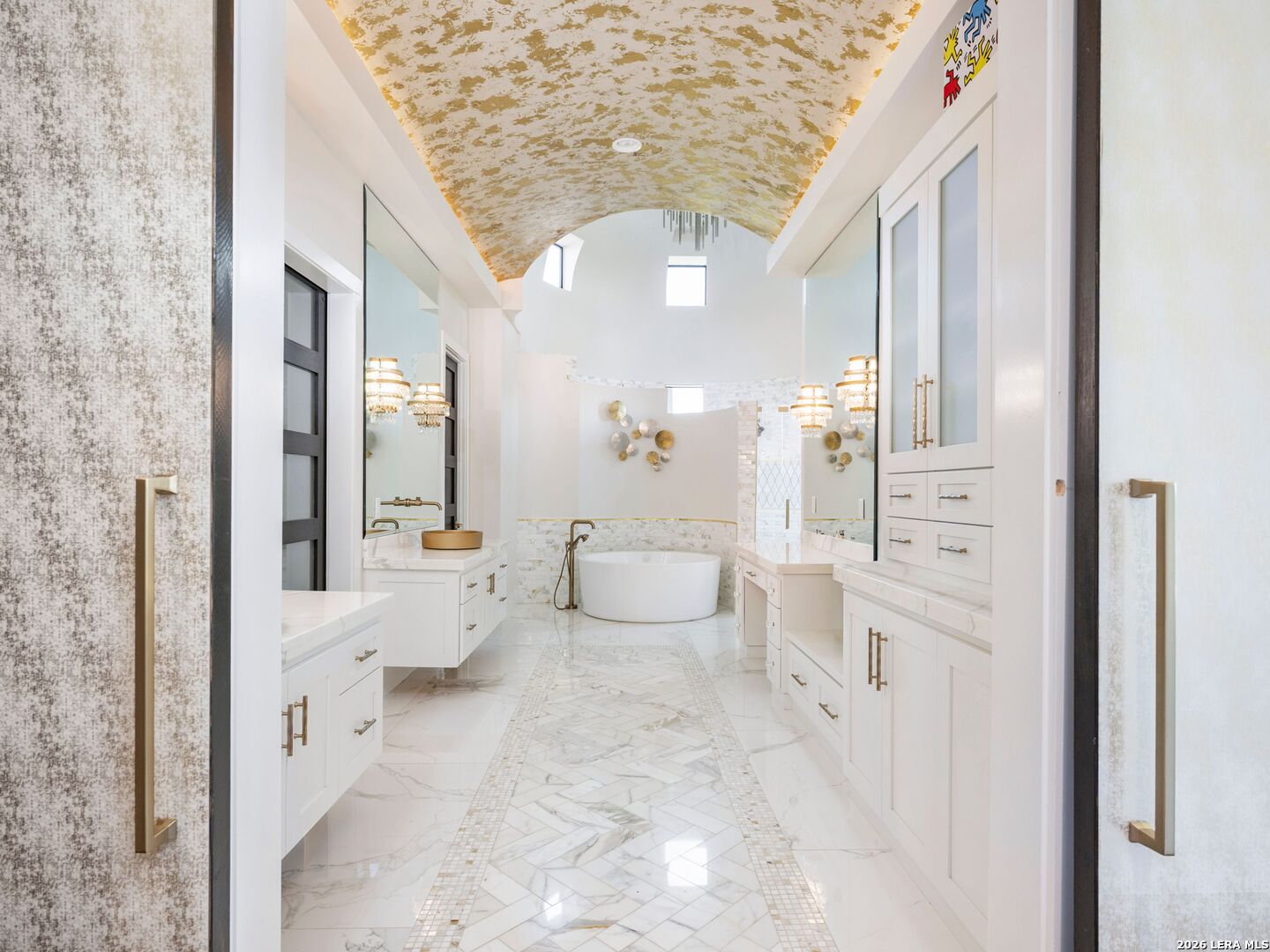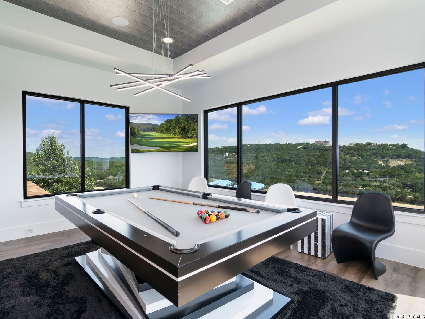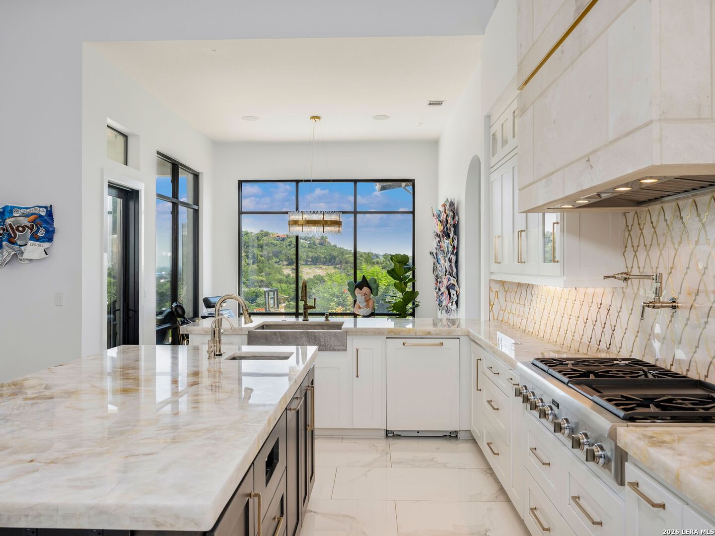 An extraordinary estate that blends refined craftsmanship with modern design, perfectly suited for both quiet living and large-scale entertaining. The residence is defined by soaring ceilings, contemporary fixtures, statuary finishes, and expansive walls of glass that flood the interiors with natural light. Smart home integration through Control4 automation provides seamless technology at your fingertips. Every space has been thoughtfully designed with exceptional detail and curated materials. The great room with its floating ceiling transitions into a chef's kitchen appointed with professional-grade Thermador appliances, custom Michael Edwards solid wood cabinetry, and dual oversized quartz islands. Expansive LaCantina doors create a seamless indoor-outdoor flow. The outdoor setting is nothing short of spectacular. Panoramic hilltop views frame a resort-inspired infinity-edge Keith Zars pool and spa, full outdoor kitchen, fire features, and a sports court. Whether hosting a grand celebration or enjoying quiet evenings at home, 23 Grand Terrace offers an incomparable lifestyle in one of San Antonio's most exclusive enclaves.