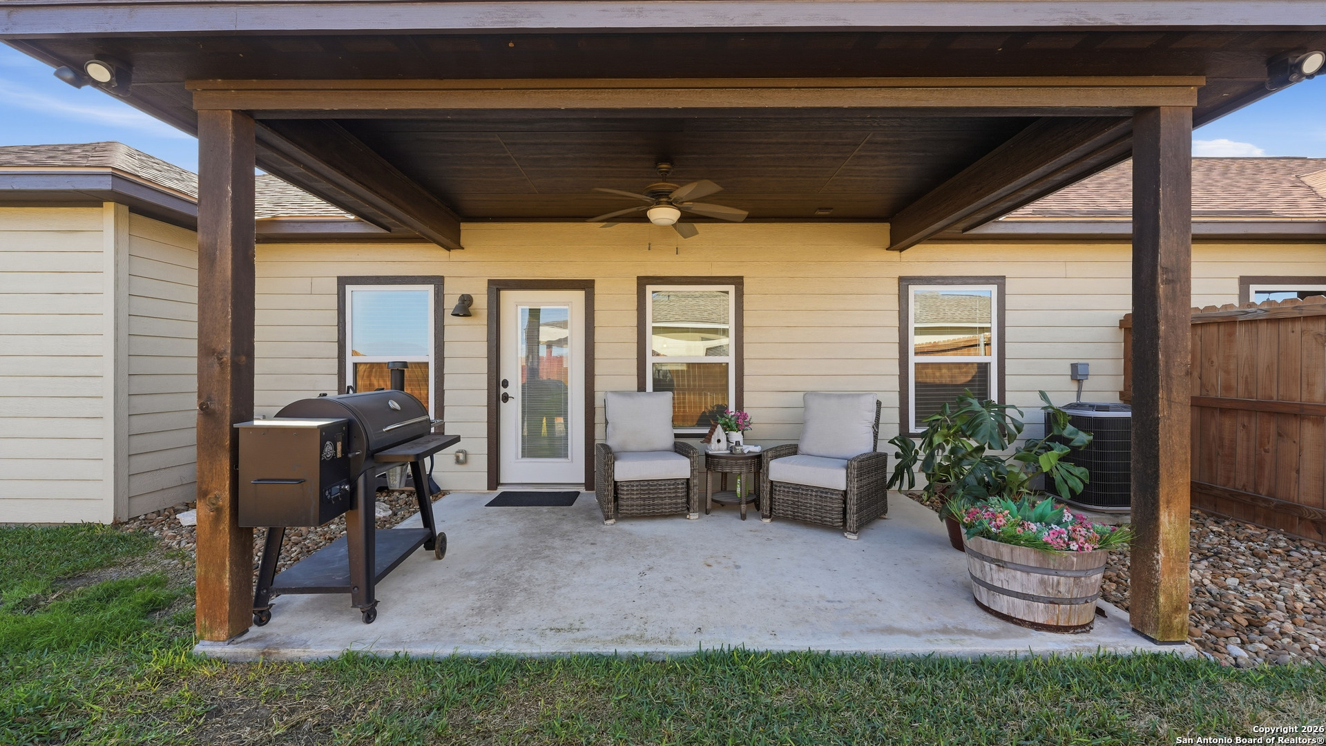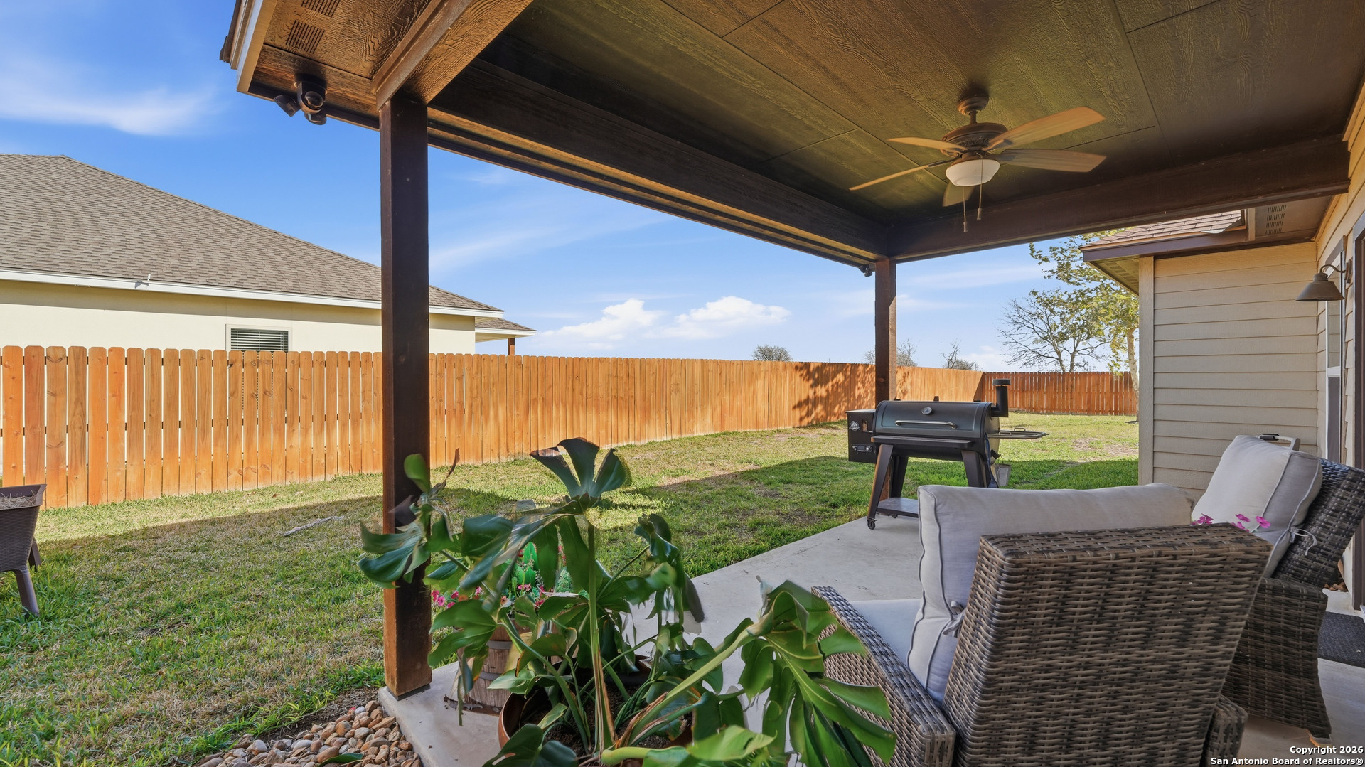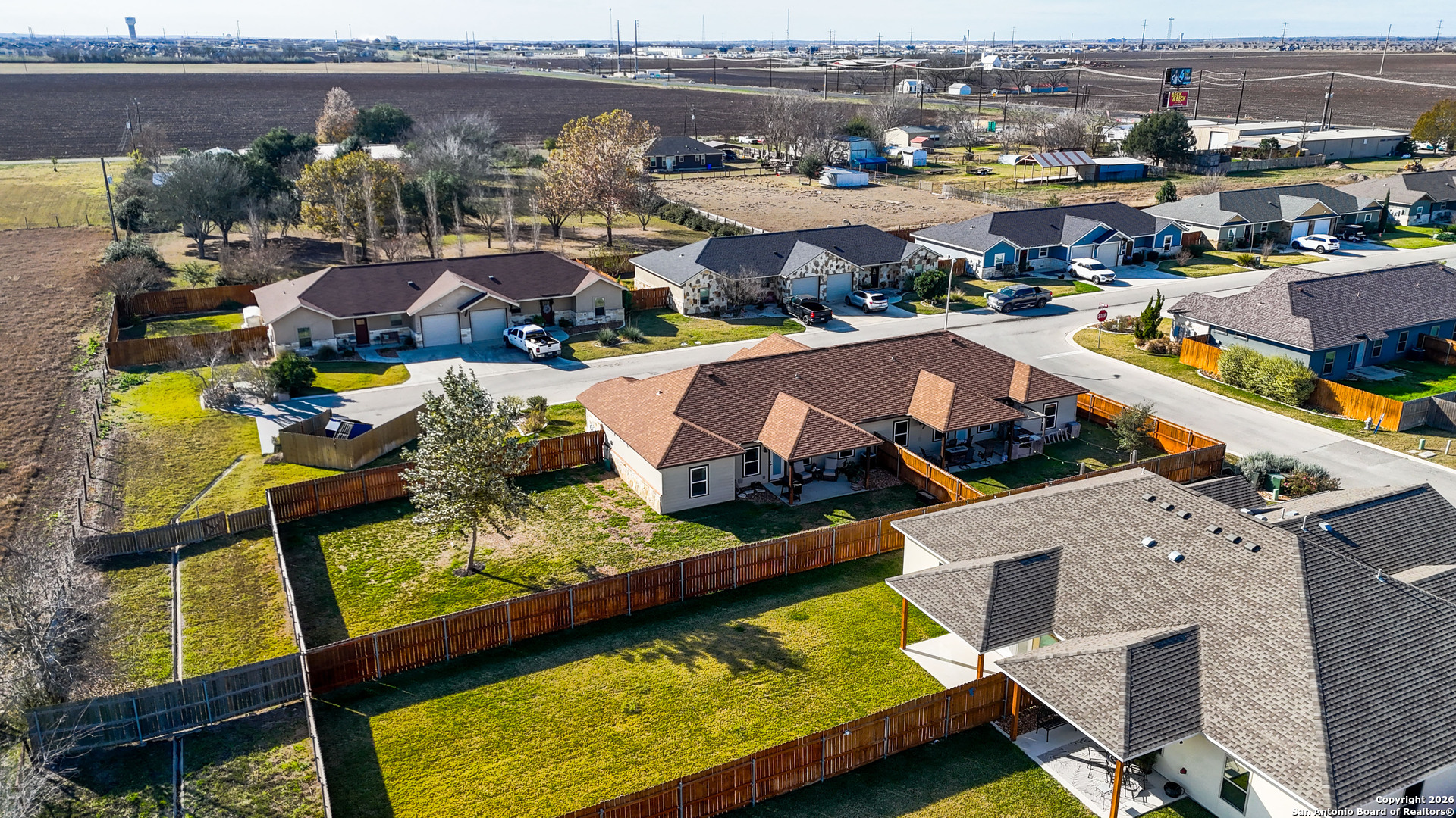 Welcome home to effortless living! This beautifully maintained 3 bedroom, 2 bath residence in the Navarro Crossing community offers the perfect blend of comfort, style, and convenience. Built in 2018, the home sits on a large end lot and features durable ceramic tile throughout, soft neutral tones, and an open layout designed for everyday living and entertaining. The kitchen showcases rich hardwood cabinetry and flows seamlessly into the living area. Retreat to the private primary suite featuring a charming farmhouse-style sliding door leading to the en-suite bath. Step outside to a surprisingly large backyard with a covered patio, ideal for morning coffee, weekend gatherings, or quiet evenings outdoors. Enjoy the ease of low-maintenance living with an HOA that covers exterior insurance, lawn care such as hedge trimming, grass cutting, planting new plants and trash service. Conveniently located near I-10, downtown Seguin, Texas Lutheran University, and within Navarro ISD, this move-in-ready home offers lifestyle, location, and value.