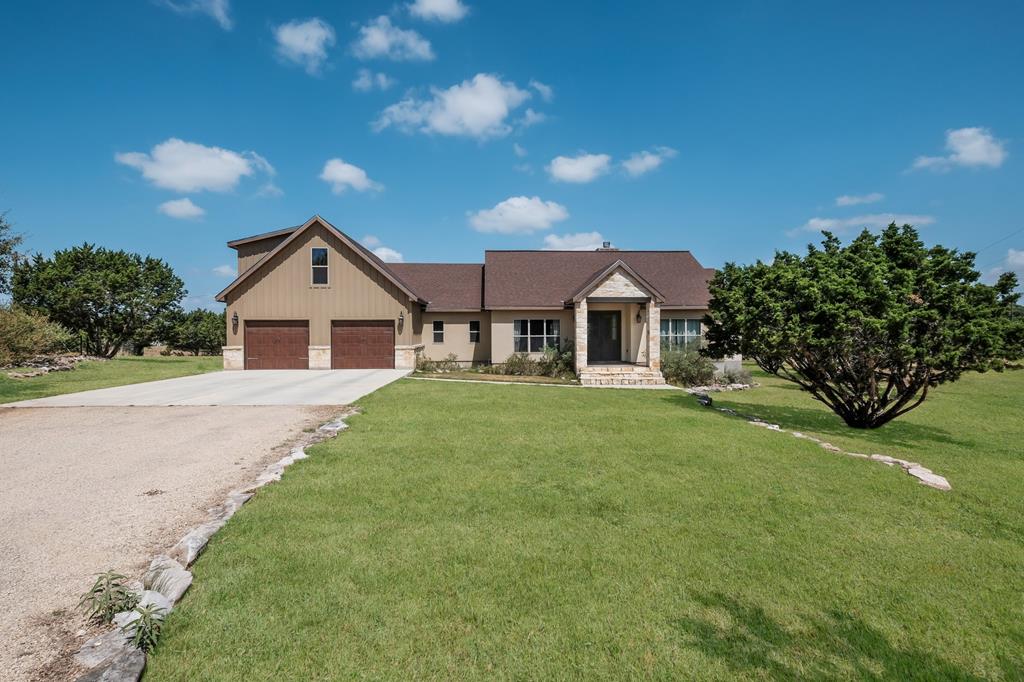 This exceptionally crafted Hill Country home is near-new construction just outside of the city limits. This beautiful home features high ceilings, a exceptional entry into the great room which is open to the kitchen and dining areas. Stone fireplace and large island are the true focal points of the room with rich stained concrete floors. Home features a split bedroom floorplan on main first level; master tucked away on one end of the home and two bedrooms and bath on the opposite end. The upstairs features another full bedroom and full bath. This could be utilized as a bedroom, or game/media room. Kitchen features an abundance of cabinetry, gas range, island with barstools, and a large walk in pantry. Master suite is spacious, private door to the back patio, bath with garden tub, walk in shower, and walk in closet. Home features unique handcrafted barn door style shutters on most windows throughout the home! Also has oversized garage with storage, and small built in desk/workspace area. Don't miss this beauty, this home is truly one to call home!