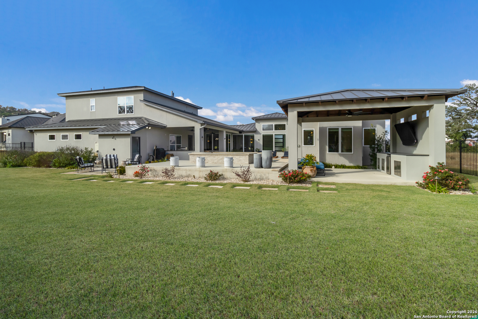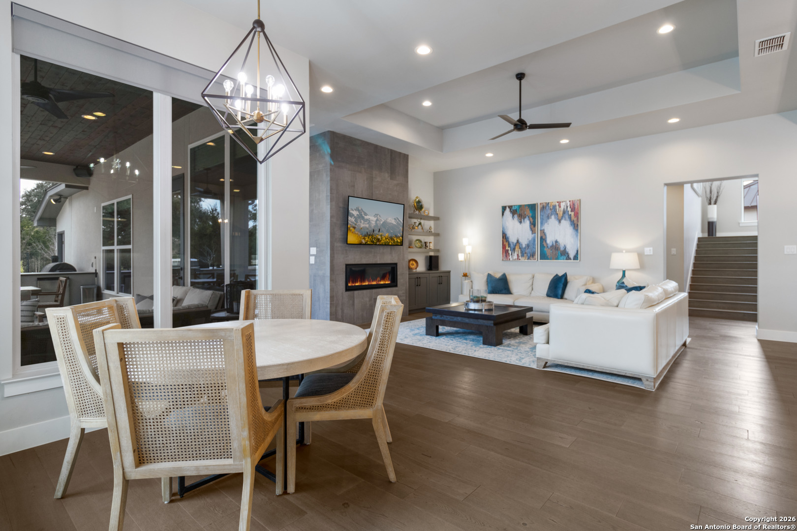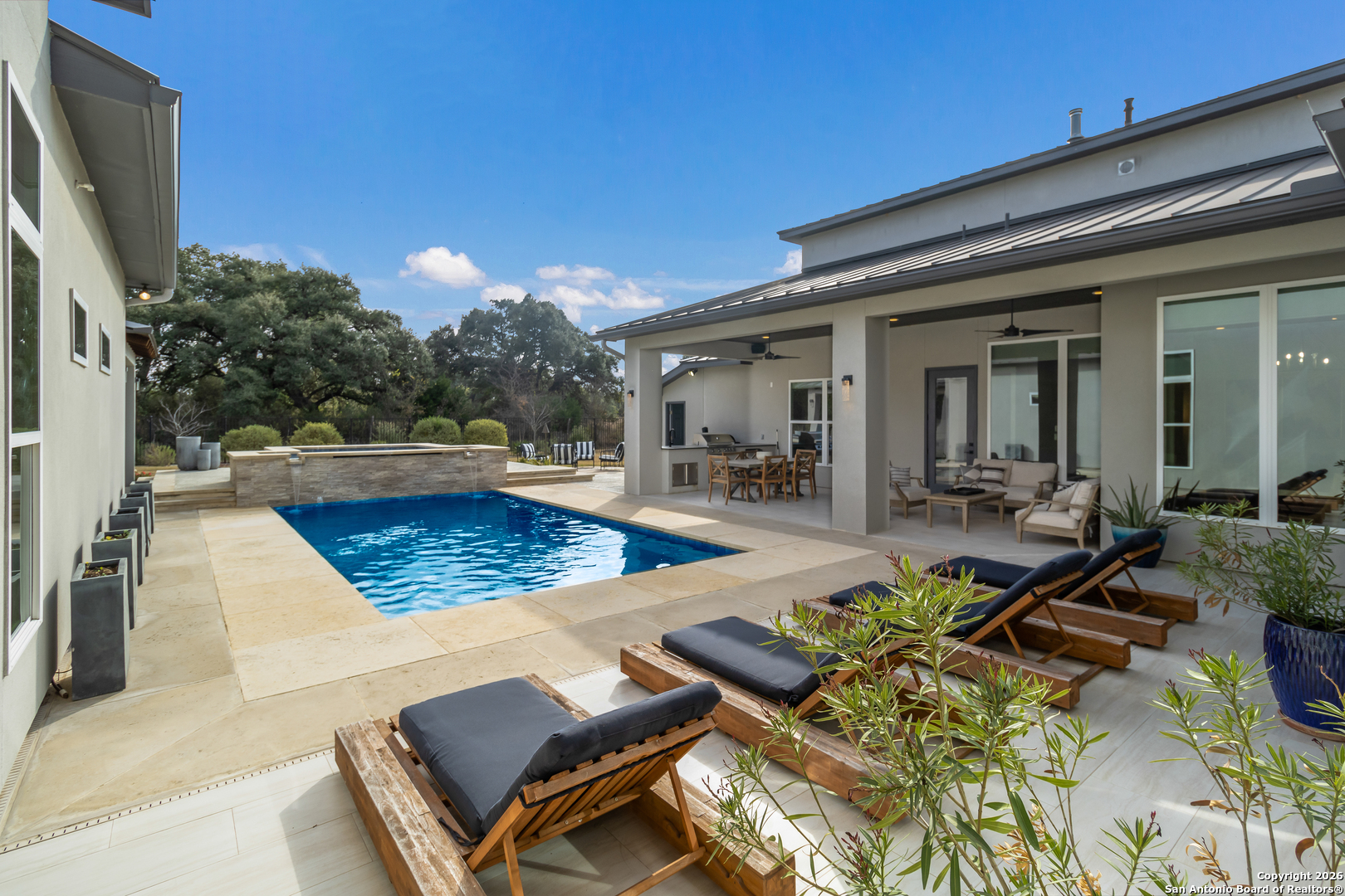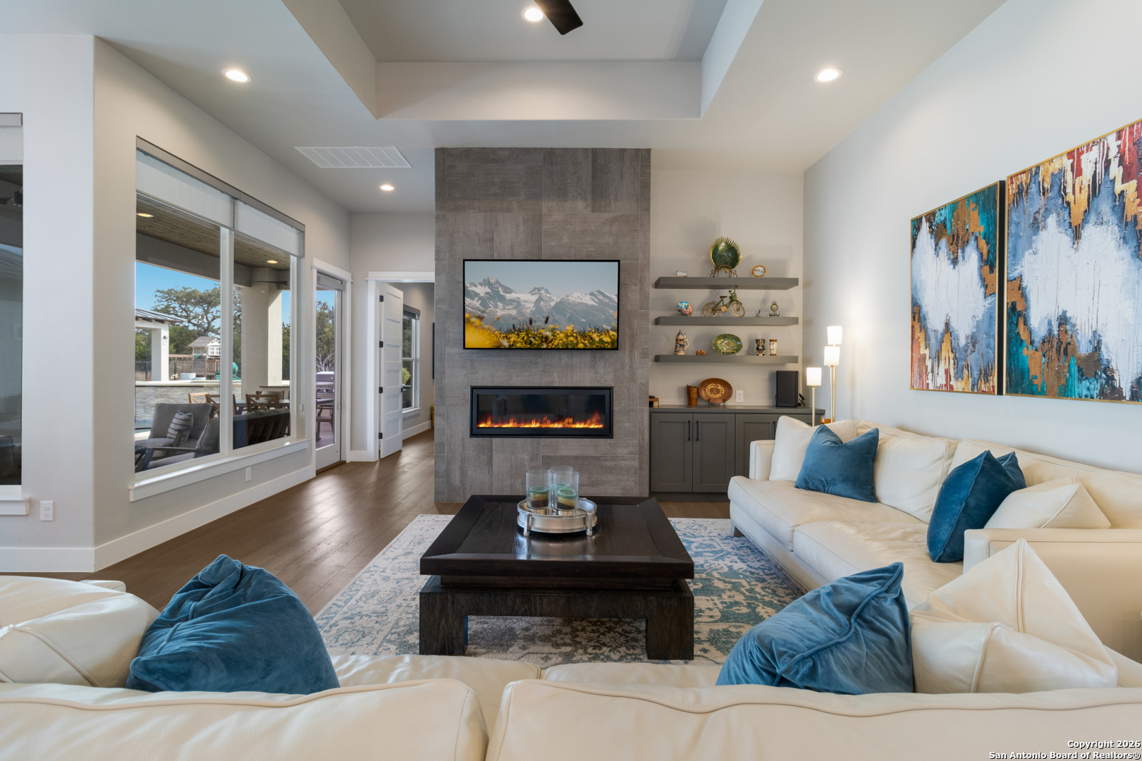 Tucked at the back of a gated neighborhood, this thoughtfully designed home offers a flat, easy entry and exit -an uncommon find in this Hill Country fringe location. A circular drive and stone-and-stucco exterior set the tone as you arrive, offering both presence and practicality. Inside, wood floors, tall ceilings, and a wall of windows immediately connect the interior to the backyard, filling the main living spaces with natural light. The layout flows comfortably, allowing rooms to feel connected without sacrificing privacy. At the heart of the home, the island kitchen anchors daily life and gatherings alike. Quartz counters, custom cabinetry, a gas cooktop, and a built-in side-by-side refrigerator make the space as functional as it is inviting. Two dining areas and a breakfast bar offer options for casual mornings or longer conversations over dinner. The adjoining living room, centered around an electric fireplace, creates a natural place to relax or host friends. Nearby, a flex room currently used as a media space adds another layer of versatility. Downstairs, the primary suite is quietly set apart from the rest of the home, creating a true place to unwind at the end of the day. Two walk-in closets, separate vanities, a tiled shower, and a soaking tub beneath a picture window all look out toward the pool and backyard. Just across from the primary suite, an additional room with a walk-in closet and beamed ceiling can easily serve as a bedroom, study, or creative space-flexible enough to grow with your needs. The home offers room for everyone, with an additional downstairs guest suite with full bath and a living area upstairs shared by two bedrooms and two full bathrooms-ideal for separation without feeling disconnected. Outdoors, the backyard becomes an extension of the home, designed for both entertaining and quiet evenings. A pool with waterfalls, elevated hot tub, multiple seating areas, an outdoor kitchen, and a gazebo with a TV and dry bar create a space that adapts to everything from lively gatherings to low-key nights under the stars. Everyday functionality is thoughtfully built in with an oversized three-car garage, a full utility room with sink and storage, foam insulation, and a full sprinkler system. Furnishings are negotiable, offering an easy transition for the next owner. With plenty of space, and a layout that balances openness, privacy, and flexibility, this home is designed to support the way life actually unfolds.