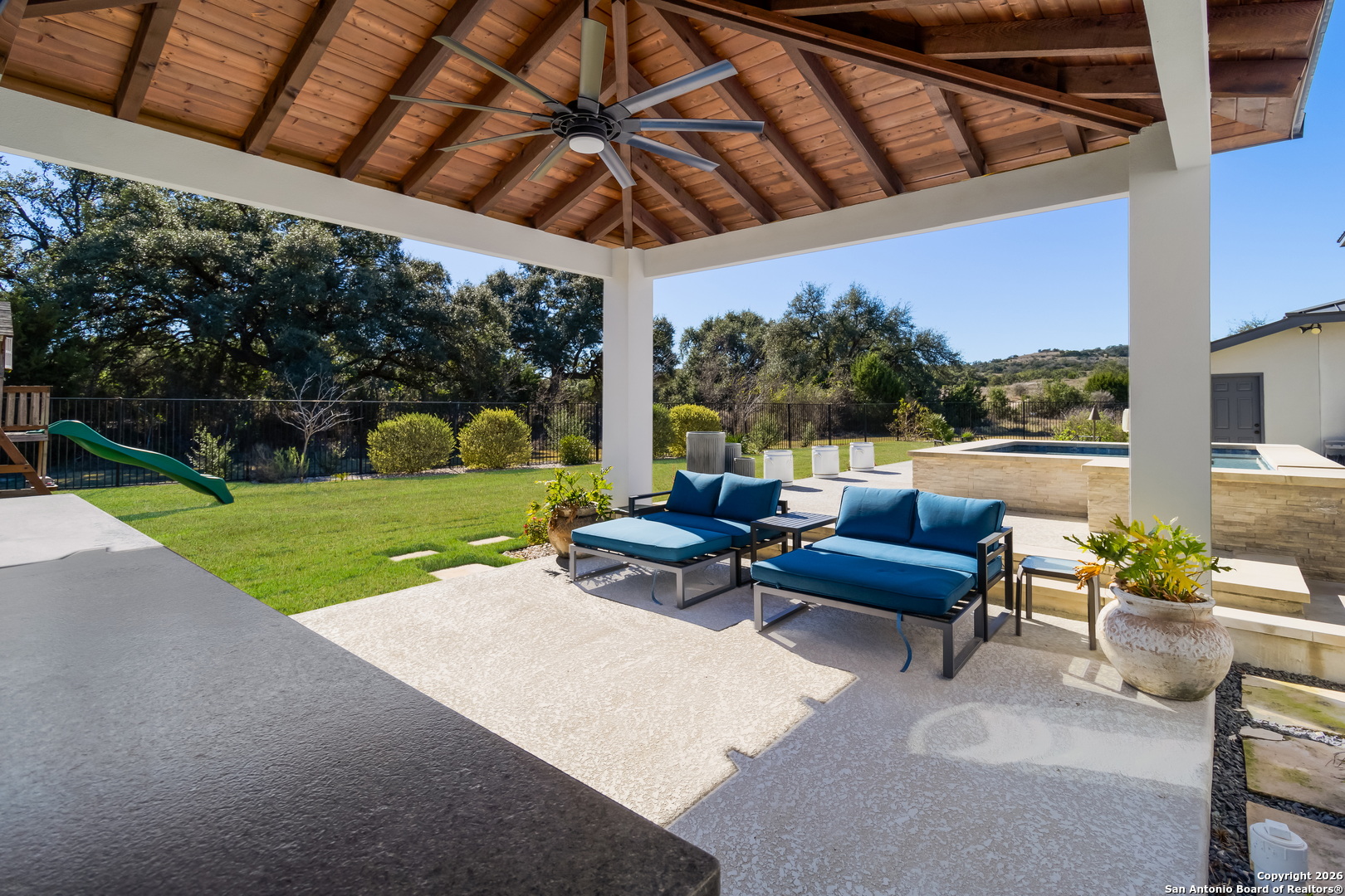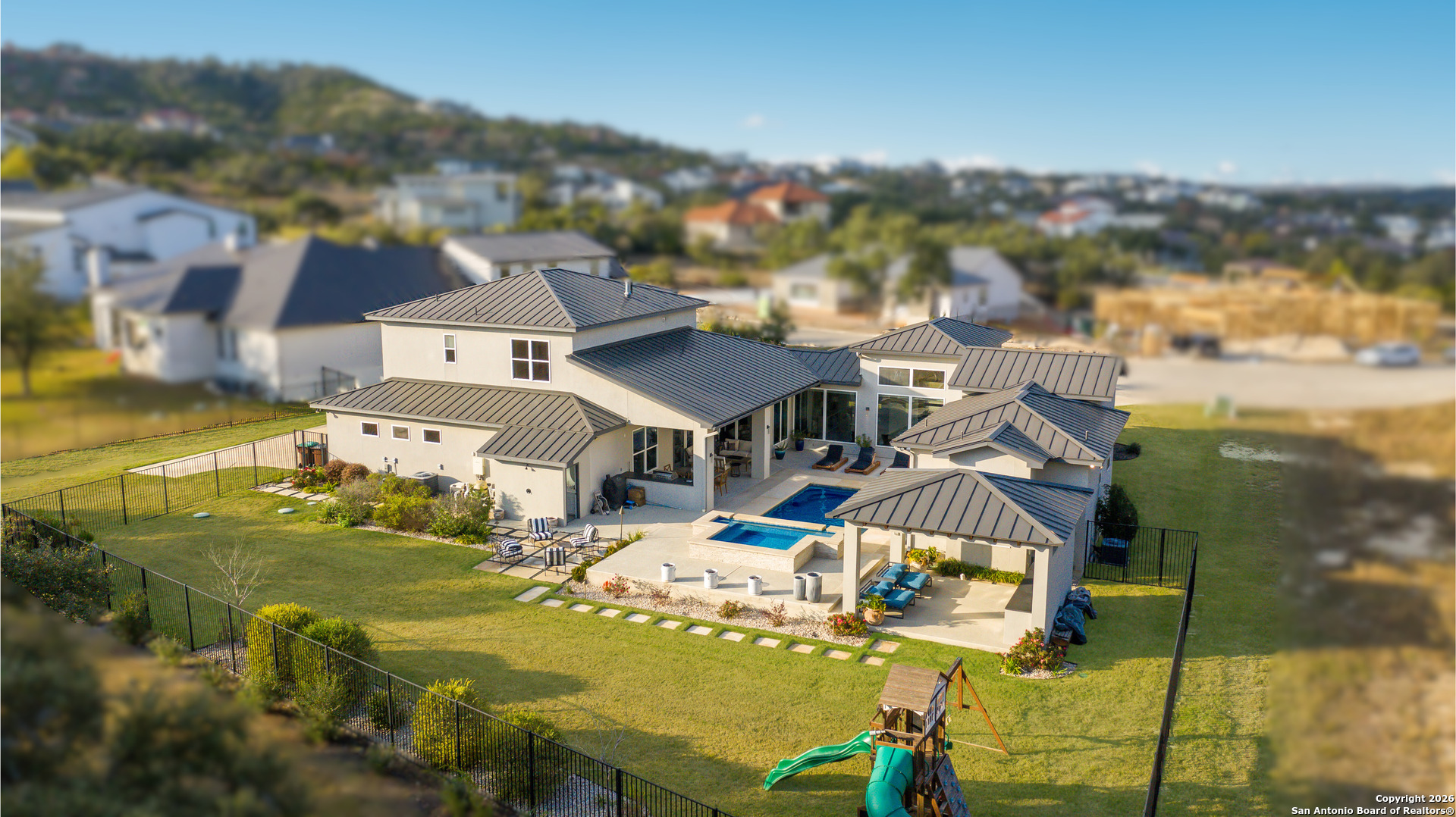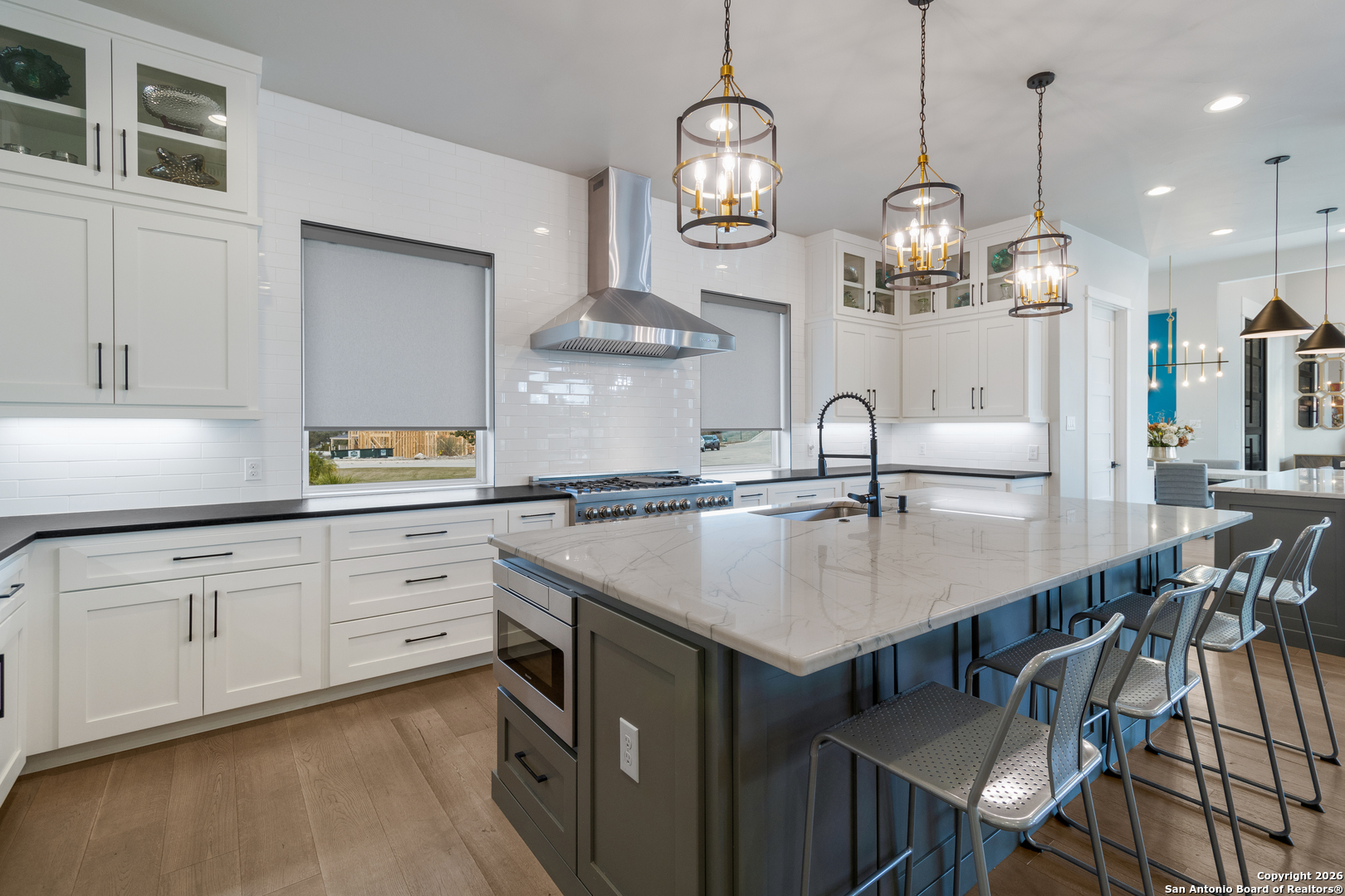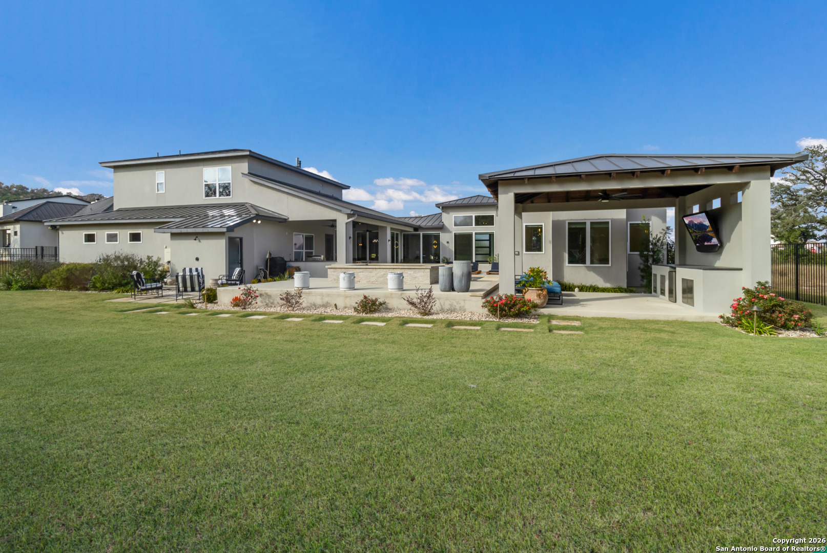 Tucked at the back of a gated neighborhood, this thoughtfully designed home offers a flat, easy entry and exit -an uncommon find in this Hill Country fringe location. A circular drive and stone-and-stucco exterior set the tone as you arrive, offering both presence and practicality. Inside, wood floors, tall ceilings, and a wall of windows immediately connect the interior to the backyard, filling the main living spaces with natural light. The layout flows comfortably, allowing rooms to feel connected without sacrificing privacy. At the heart of the home, the island kitchen anchors daily life and gatherings alike. Quartz counters, custom cabinetry, a gas cooktop, and a built-in side-by-side refrigerator make the space as functional as it is inviting. Two dining areas and a breakfast bar offer options for casual mornings or longer conversations over dinner. The adjoining living room, centered around an electric fireplace, creates a natural place to relax or host friends. Nearby, a flex room currently used as a media space adds another layer of versatility. Downstairs, the primary suite is quietly set apart from the rest of the home, creating a true place to unwind at the end of the day. Two walk-in closets, separate vanities, a tiled shower, and a soaking tub beneath a picture window all look out toward the pool and backyard. Just across from the primary suite, an additional room with a walk-in closet and beamed ceiling can easily serve as a bedroom, study, or creative space-flexible enough to grow with your needs. The home offers room for everyone, with an additional downstairs guest suite with full bath and a living area upstairs shared by two bedrooms and two full bathrooms-ideal for separation without feeling disconnected. Outdoors, the backyard becomes an extension of the home, designed for both entertaining and quiet evenings. A pool with waterfalls, elevated hot tub, multiple seating areas, an outdoor kitchen, and a gazebo with a TV and dry bar create a space that adapts to everything from lively gatherings to low-key nights under the stars. Everyday functionality is thoughtfully built in with an oversized three-car garage, a full utility room with sink and storage, foam insulation, and a full sprinkler system. Furnishings are negotiable, offering an easy transition for the next owner. With plenty of space, and a layout that balances openness, privacy, and flexibility, this home is designed to support the way life actually unfolds.