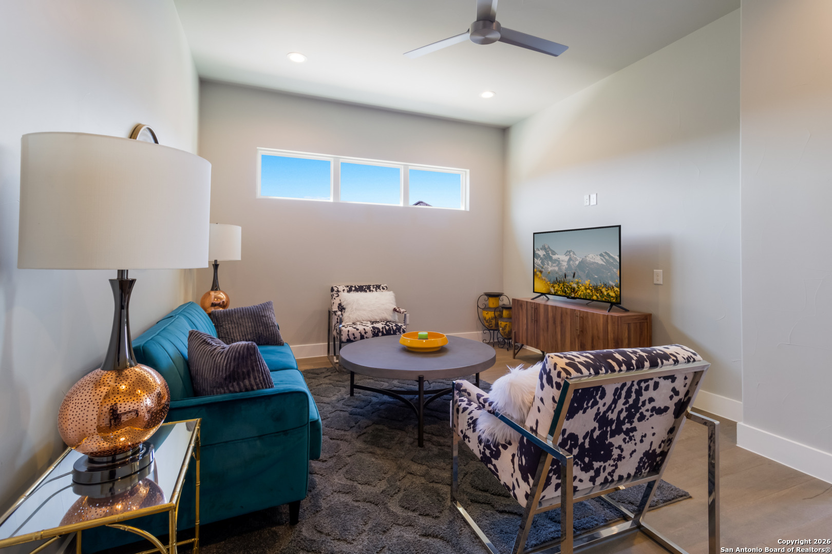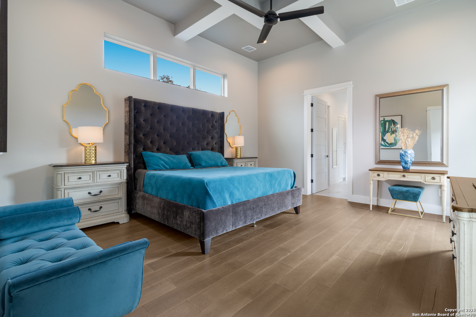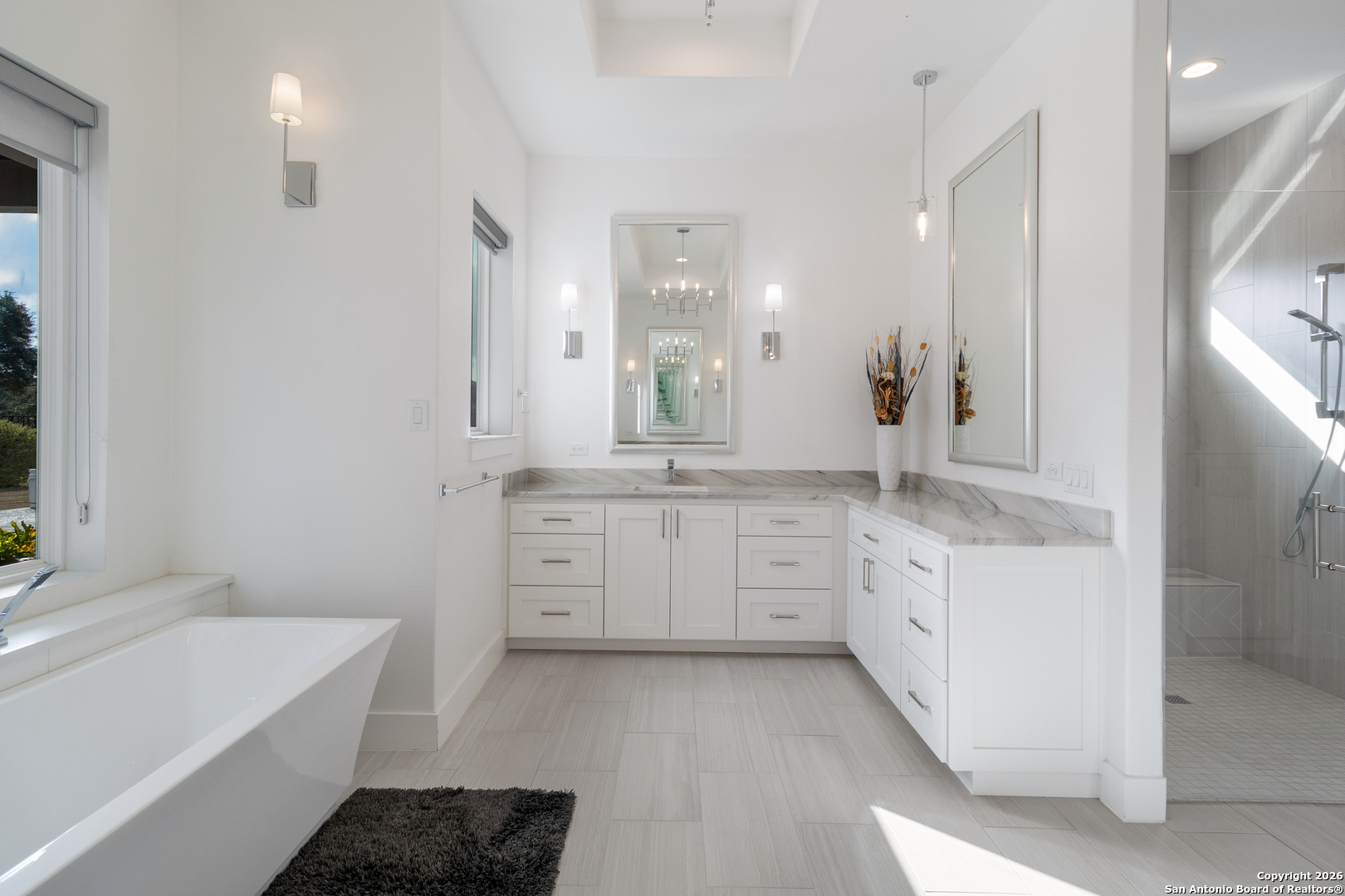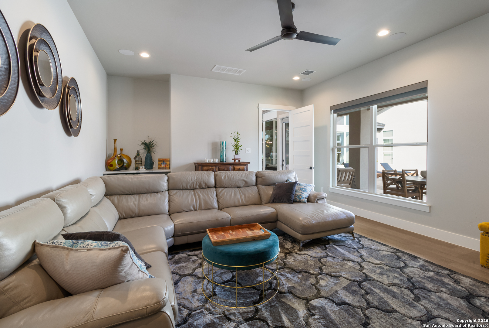 Tucked at the back of a gated neighborhood, this thoughtfully designed home offers a flat, easy entry and exit -an uncommon find in this Hill Country fringe location. A circular drive and stone-and-stucco exterior set the tone as you arrive, offering both presence and practicality. Inside, wood floors, tall ceilings, and a wall of windows immediately connect the interior to the backyard, filling the main living spaces with natural light. The layout flows comfortably, allowing rooms to feel connected without sacrificing privacy. At the heart of the home, the island kitchen anchors daily life and gatherings alike. Quartz counters, custom cabinetry, a gas cooktop, and a built-in side-by-side refrigerator make the space as functional as it is inviting. Two dining areas and a breakfast bar offer options for casual mornings or longer conversations over dinner. The adjoining living room, centered around an electric fireplace, creates a natural place to relax or host friends. Nearby, a flex room currently used as a media space adds another layer of versatility. Downstairs, the primary suite is quietly set apart from the rest of the home, creating a true place to unwind at the end of the day. Two walk-in closets, separate vanities, a tiled shower, and a soaking tub beneath a picture window all look out toward the pool and backyard. Just across from the primary suite, an additional room with a walk-in closet and beamed ceiling can easily serve as a bedroom, study, or creative space-flexible enough to grow with your needs. The home offers room for everyone, with an additional downstairs guest suite with full bath and a living area upstairs shared by two bedrooms and two full bathrooms-ideal for separation without feeling disconnected. Outdoors, the backyard becomes an extension of the home, designed for both entertaining and quiet evenings. A pool with waterfalls, elevated hot tub, multiple seating areas, an outdoor kitchen, and a gazebo with a TV and dry bar create a space that adapts to everything from lively gatherings to low-key nights under the stars. Everyday functionality is thoughtfully built in with an oversized three-car garage, a full utility room with sink and storage, foam insulation, and a full sprinkler system. Furnishings are negotiable, offering an easy transition for the next owner. With plenty of space, and a layout that balances openness, privacy, and flexibility, this home is designed to support the way life actually unfolds.
