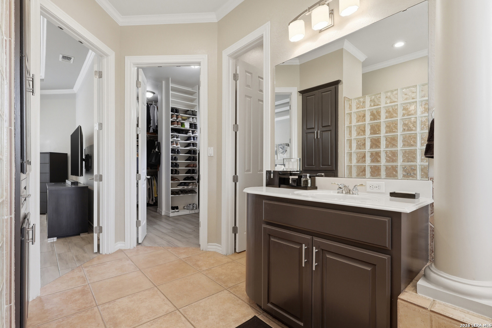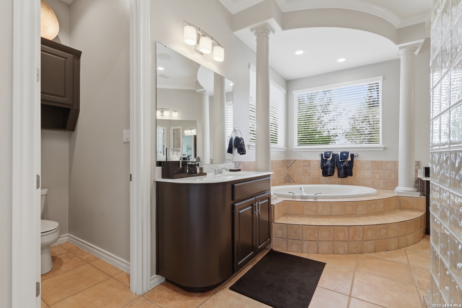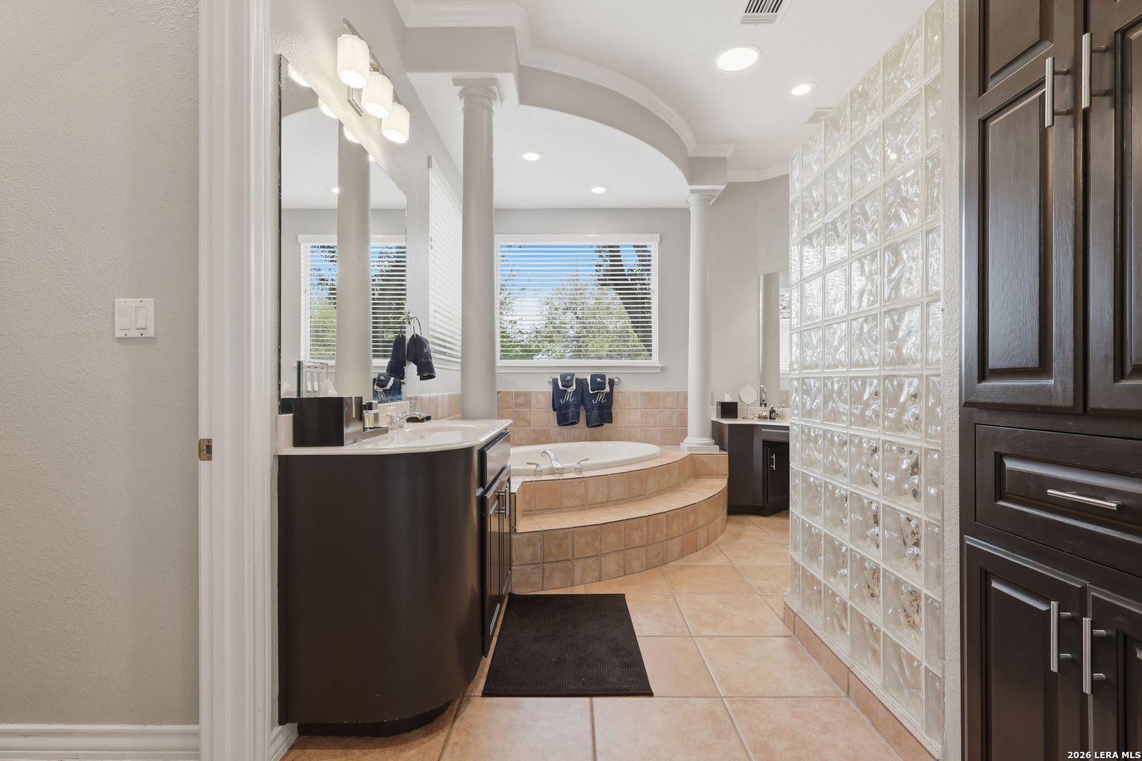Stunning custom Mediterranean-style home built by Mike Holloway located in the gated community of The Highlands at Sonterra. Impeccably maintained and thoughtfully designed, this residence offers five generously sized bedrooms-two conveniently located on the main level-along with 4.5 bathrooms and a dedicated private office. The spacious open floor plan is filled with natural light and designed for both everyday living and entertaining. The gourmet kitchen features a large island, abundant counter space, and seamless flow into the main living areas. Upstairs, you'll find a generous flex space ideal for a game room, media room, or additional lounge area, along with three additional bedrooms and two bathrooms, including a Jack-and-Jill layout. Situated on an expansive 0.35-acre lot, the outdoor space is perfect for relaxation and recreation, featuring a spool (spa/pool combination), patio area, and a basketball court on the upper portion of the yard. Located less than two minutes from the Sonterra Club entrance, this home offers an exceptional lifestyle with easy access to golf, tennis, pickleball, swimming, dining, and social events. Golf enthusiasts will also appreciate being within five miles of three additional golf courses. Ideally positioned near Loop 1604, Highway 281, and IH-10, with convenient access to shopping, restaurants, and major medical centers.