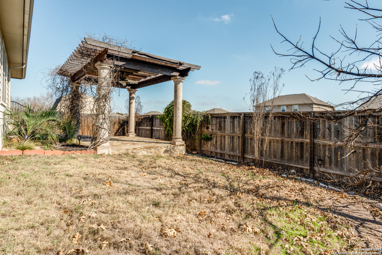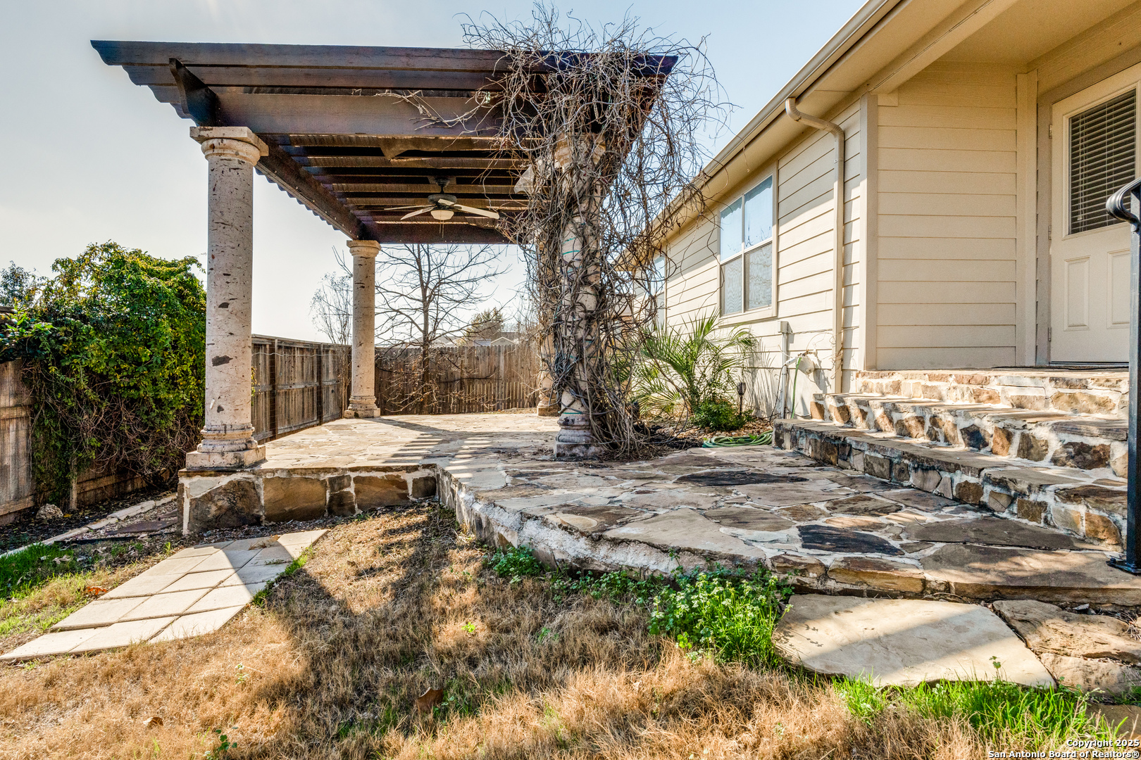MOTIVATED SELLERS!! This home is priced below market value and will sell fast. Do not miss the opportunity to tour this spacious one-story home featuring 4 bedrooms, 2 bathrooms, and 2,079 sqft of comfortable living space. The open-concept layout boasts a roomy floor plan, 9-foot ceilings, granite countertops, neutral paint tones, and versatile areas that allow you to customize the space to fit your needs. The owner's suite offers a private retreat with a vanity sink, luxurious garden tub, separate shower, and a large closet. Step outside to the backyard where you will find custom stone flooring leading to the pergola. This outdoor space includes a misting system, ceiling fan and wiring for entertainment, making it perfect for relaxing or hosting guests. This home also features foam insulation, ceiling fans in each room, 2" blinds throughout, a Whole House Water Filter System, and a zoned sprinkler system covering both the front and back yard. Located just blocks from Voss Farms Elementary and the community pool, this home is also conveniently close to I-35, HEB, Walmart, Lowes, shopping centers, and dining options. It is an ideal spot for commuters. Come explore this charming home in the desirable Voss Farms community in New Braunfels, TX. Enjoy access to two pools, a club house, splash pad for children and walking paths.