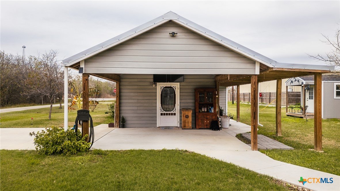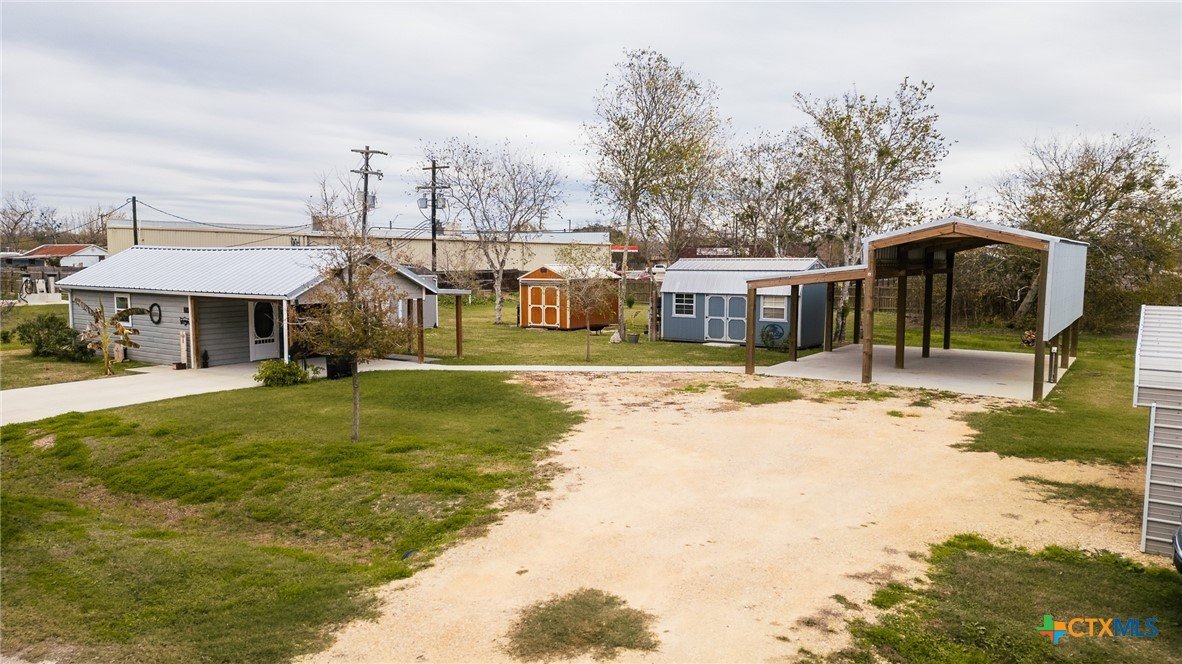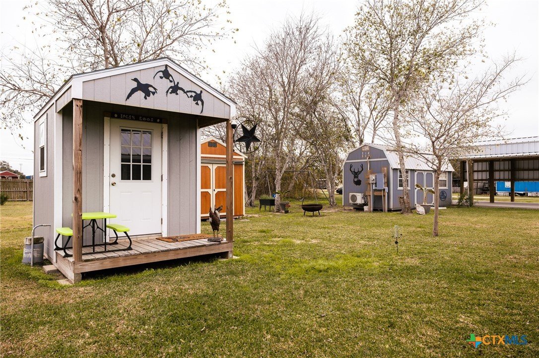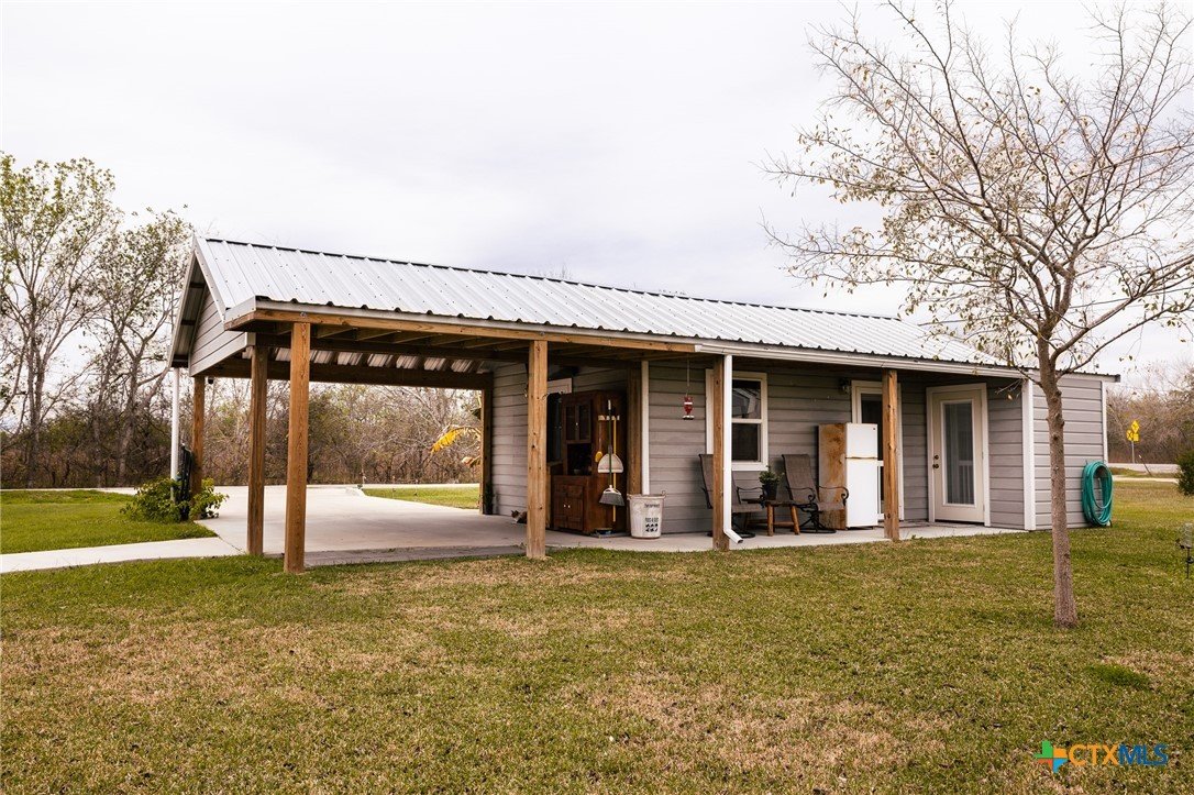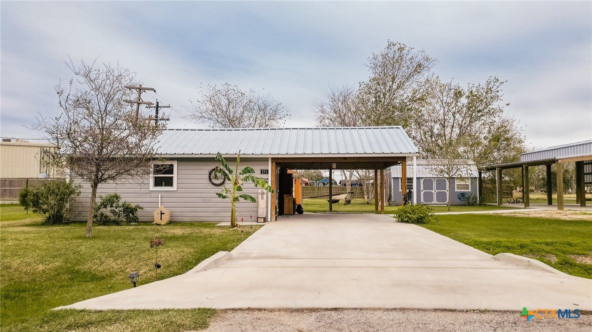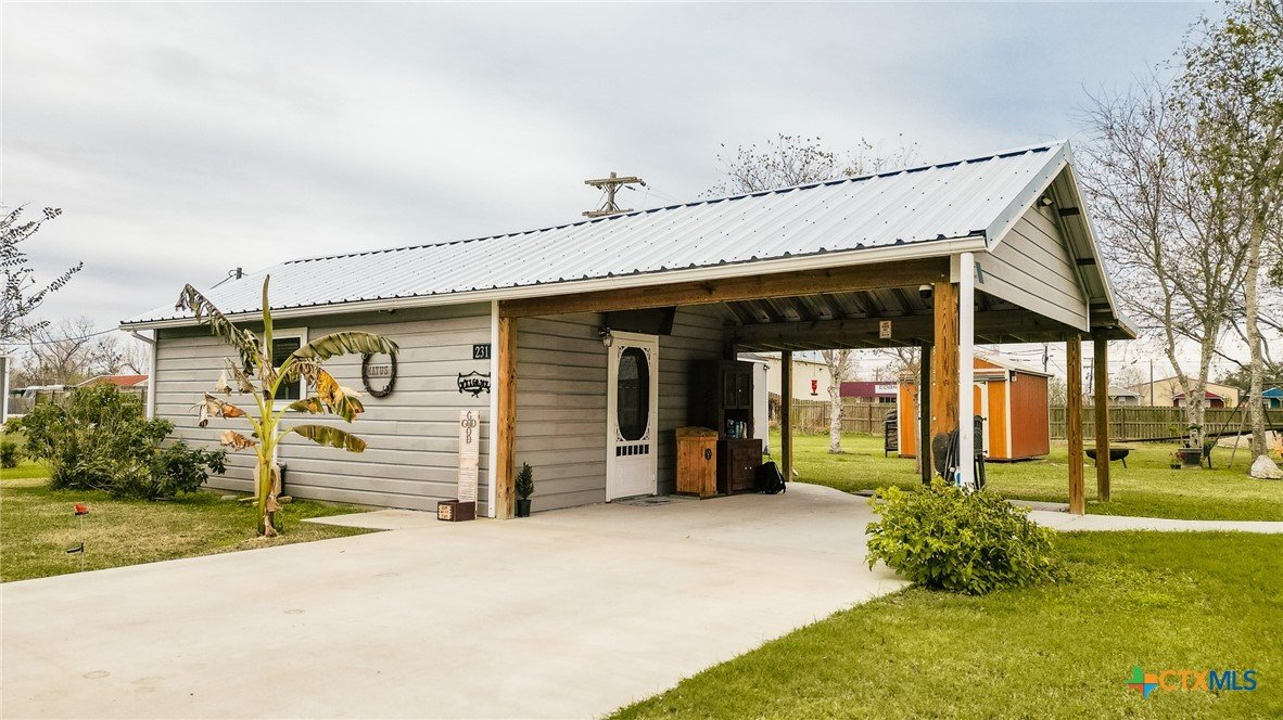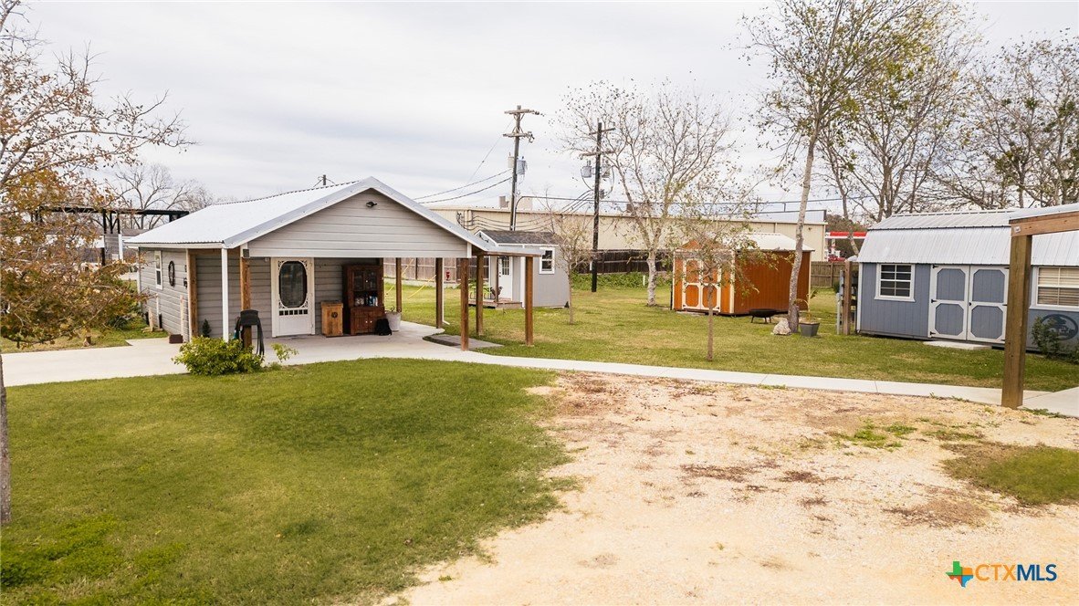This charming renovated tiny studio home offers the perfect blend of comfort and versatility, nestled on a spacious corner lot just under half an acre. Step inside to discover a modern kitchen with a gleaming granite countertop, custom cabinets, and tile floor throughout. Having a peace of mind with a durable metal roof is a plus! Enjoy outdoor relaxing under the expansive 16x16 covered porch. A paved sidewalk leads to a 35x25 double carport and RV storage, complete with a concrete slab, electrical and plumbing hookups! This property is packed with extras, including a 10x20 climate-controlled storage building, a 10x16 workshop with electricity, an additional carport for storage, and an adorable 8x12 playhouse that could easily transform into a cozy she-shed or man cave. With three convenient entrances, ample space for outdoor entertaining, and its location in the highly sought-after Industrial ISD school district, this unique property is a rare gem ready for you to call home!