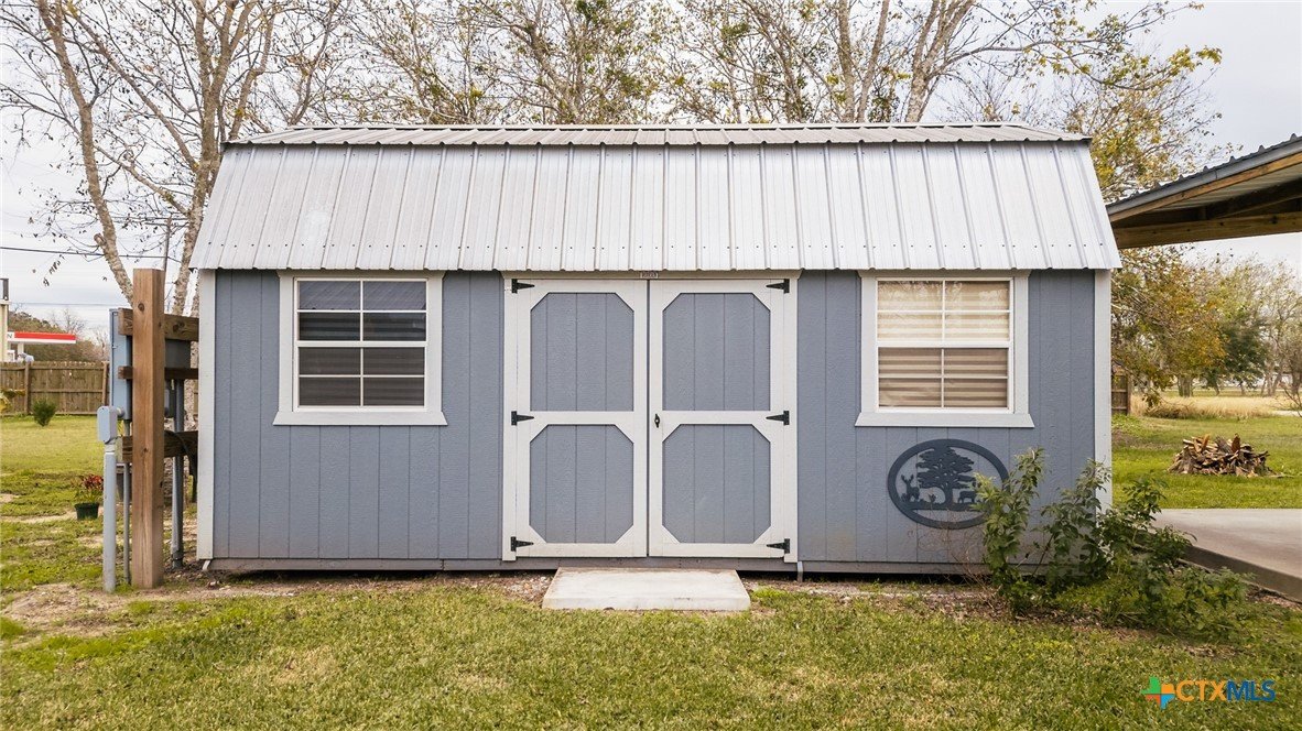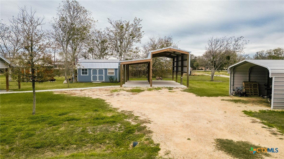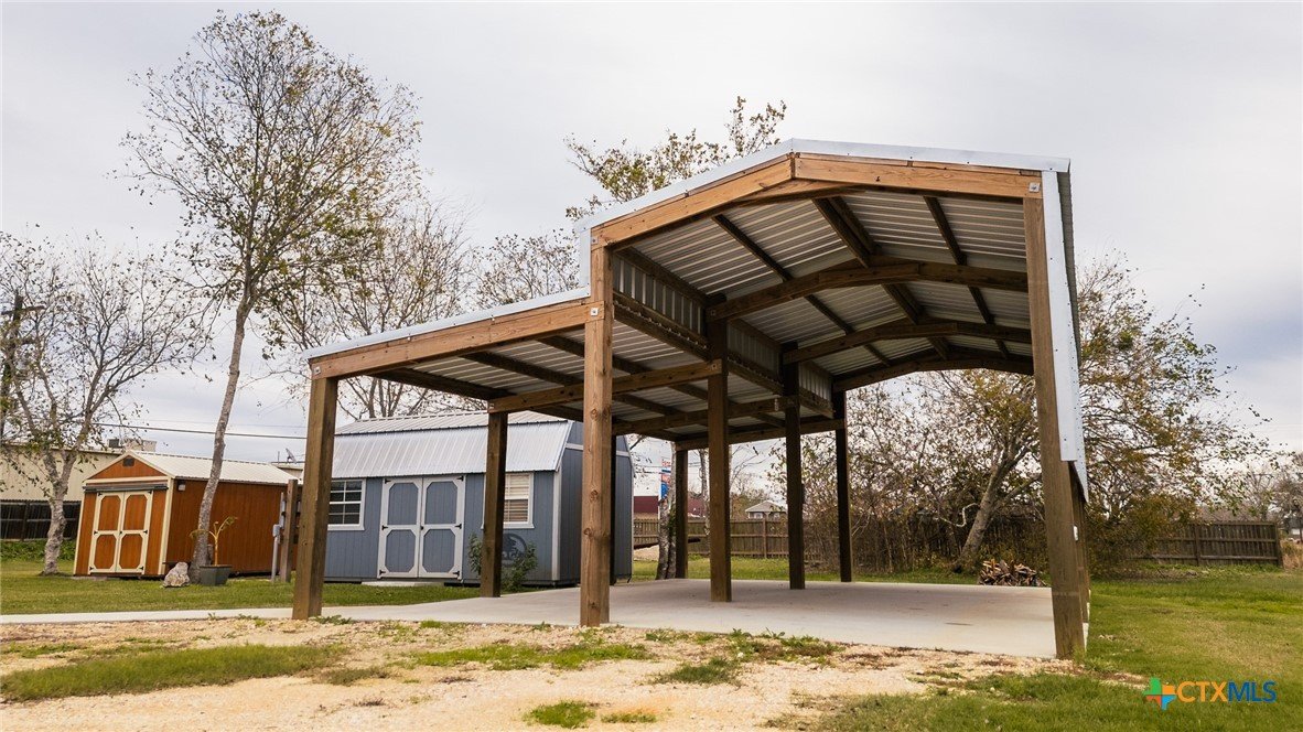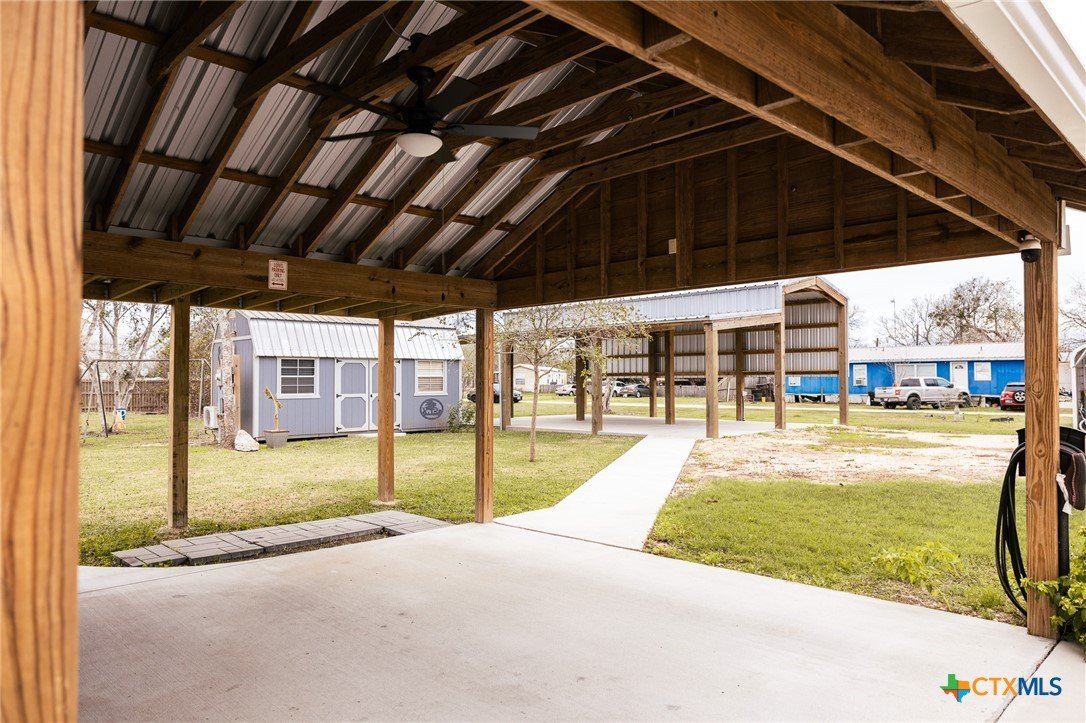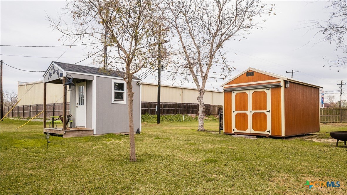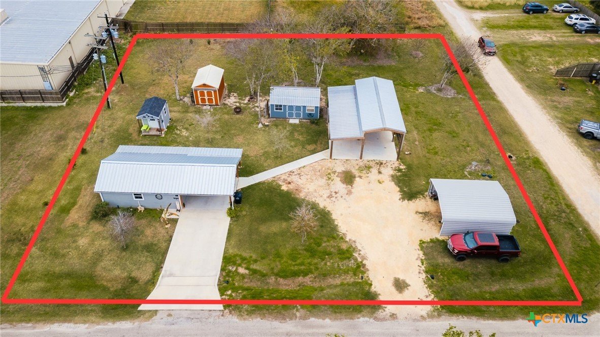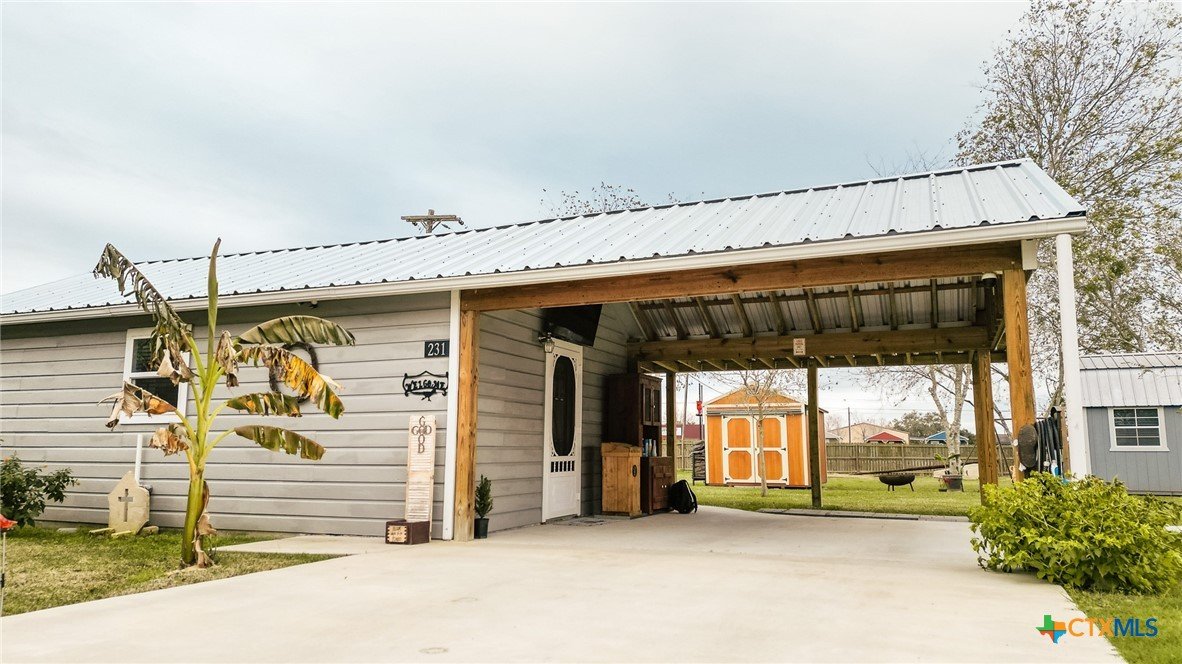 This charming renovated tiny studio home offers the perfect blend of comfort and versatility, nestled on a spacious corner lot just under half an acre. Step inside to discover a modern kitchen with a gleaming granite countertop, custom cabinets, and tile floor throughout. Having a peace of mind with a durable metal roof is a plus! Enjoy outdoor relaxing under the expansive 16x16 covered porch. A paved sidewalk leads to a 35x25 double carport and RV storage, complete with a concrete slab, electrical and plumbing hookups! This property is packed with extras, including a 10x20 climate-controlled storage building, a 10x16 workshop with electricity, an additional carport for storage, and an adorable 8x12 playhouse that could easily transform into a cozy she-shed or man cave. With three convenient entrances, ample space for outdoor entertaining, and its location in the highly sought-after Industrial ISD school district, this unique property is a rare gem ready for you to call home!