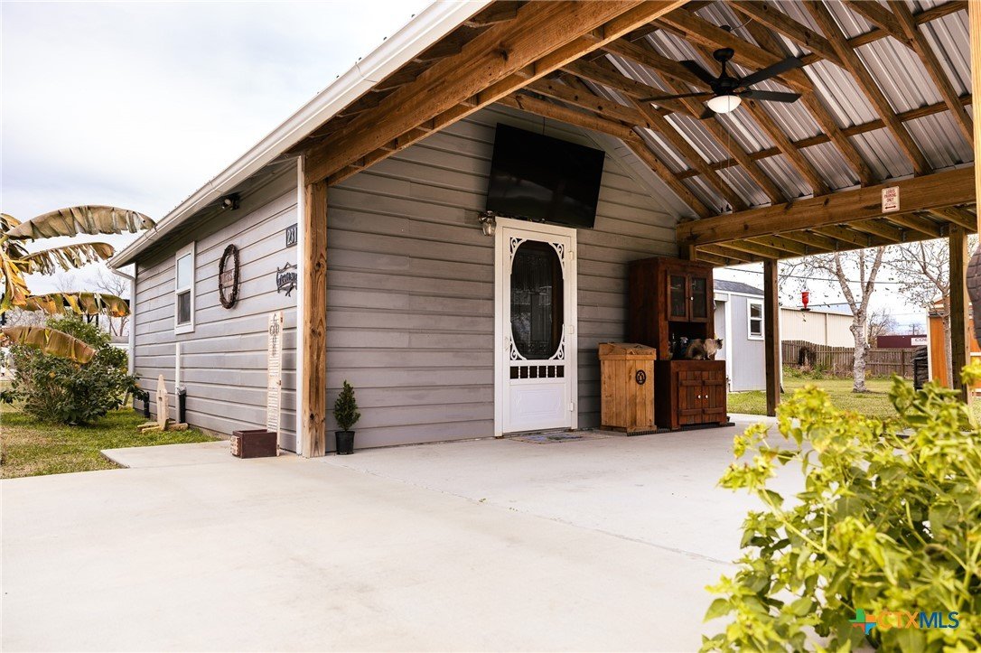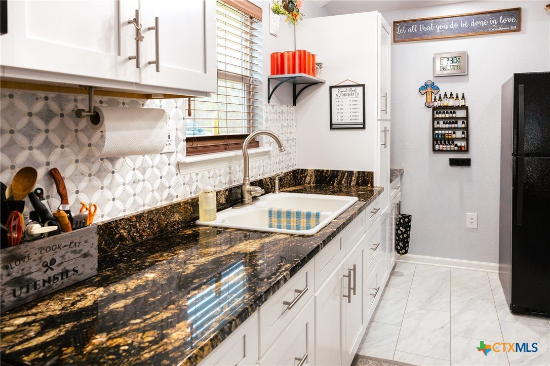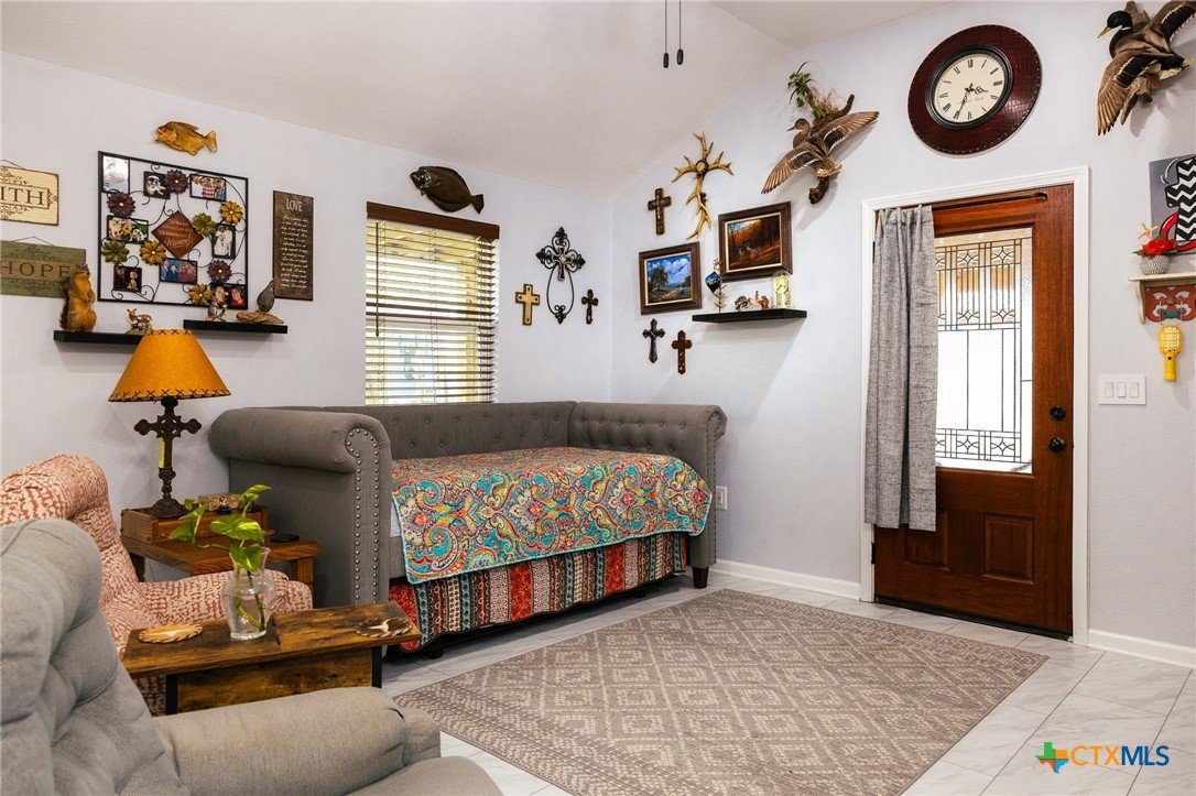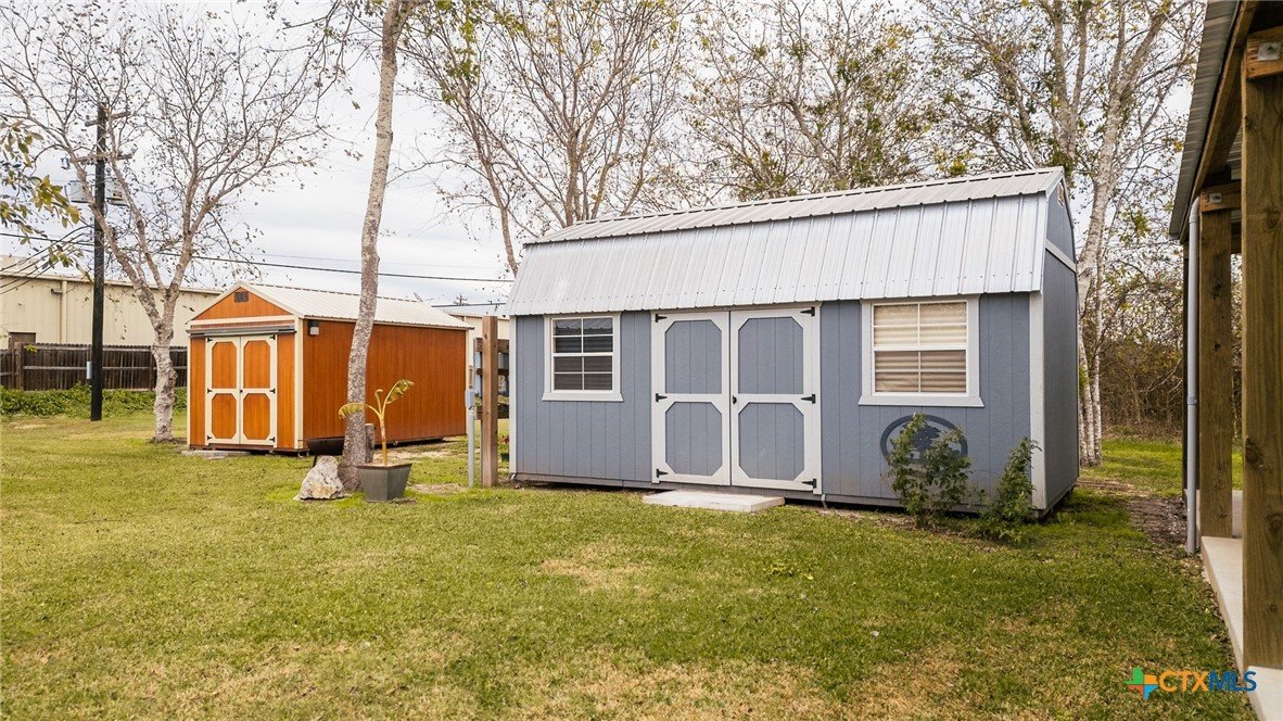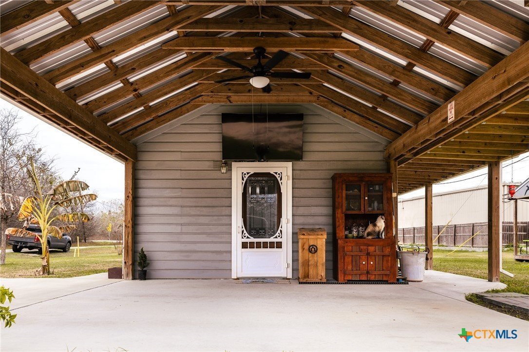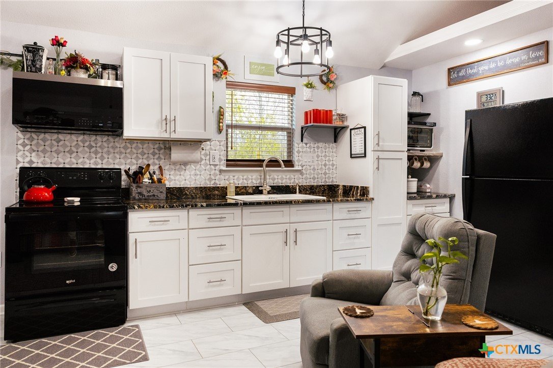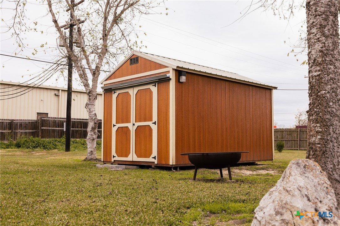 This charming renovated tiny studio home offers the perfect blend of comfort and versatility, nestled on a spacious corner lot just under half an acre. Step inside to discover a modern kitchen with a gleaming granite countertop, custom cabinets, and tile floor throughout. Having a peace of mind with a durable metal roof is a plus! Enjoy outdoor relaxing under the expansive 16x16 covered porch. A paved sidewalk leads to a 35x25 double carport and RV storage, complete with a concrete slab, electrical and plumbing hookups! This property is packed with extras, including a 10x20 climate-controlled storage building, a 10x16 workshop with electricity, an additional carport for storage, and an adorable 8x12 playhouse that could easily transform into a cozy she-shed or man cave. With three convenient entrances, ample space for outdoor entertaining, and its location in the highly sought-after Industrial ISD school district, this unique property is a rare gem ready for you to call home!