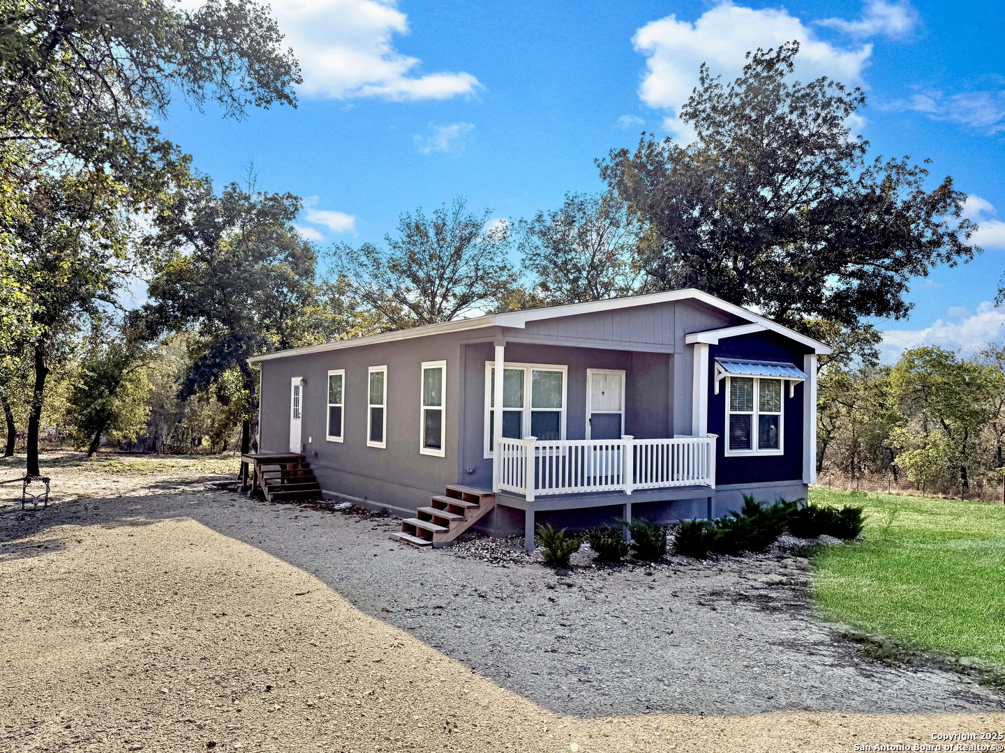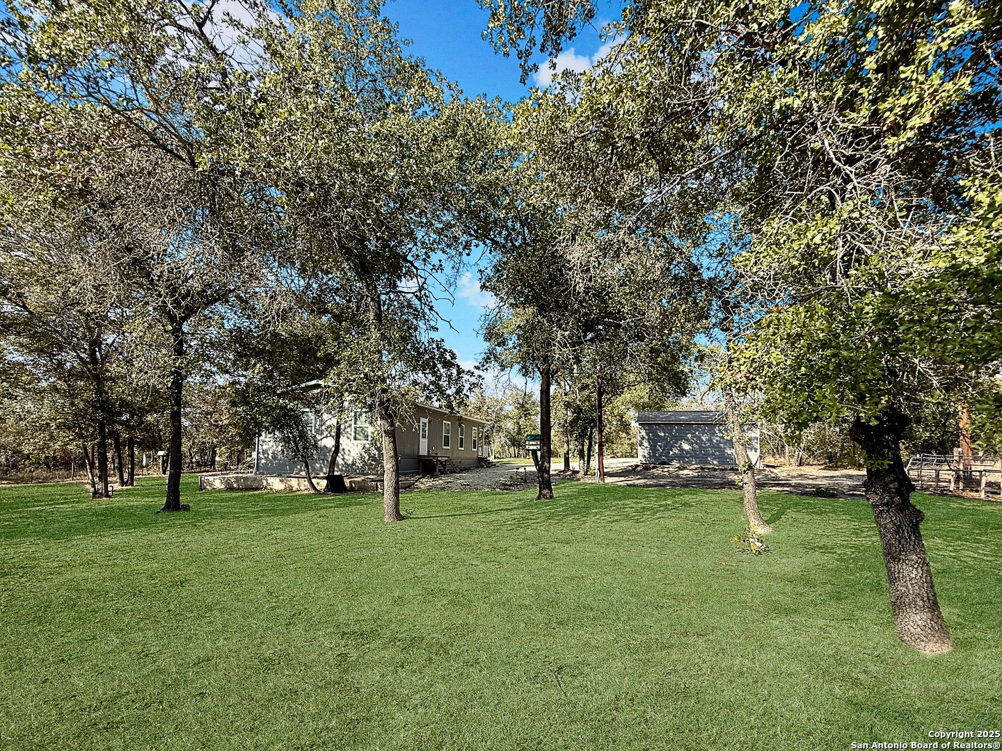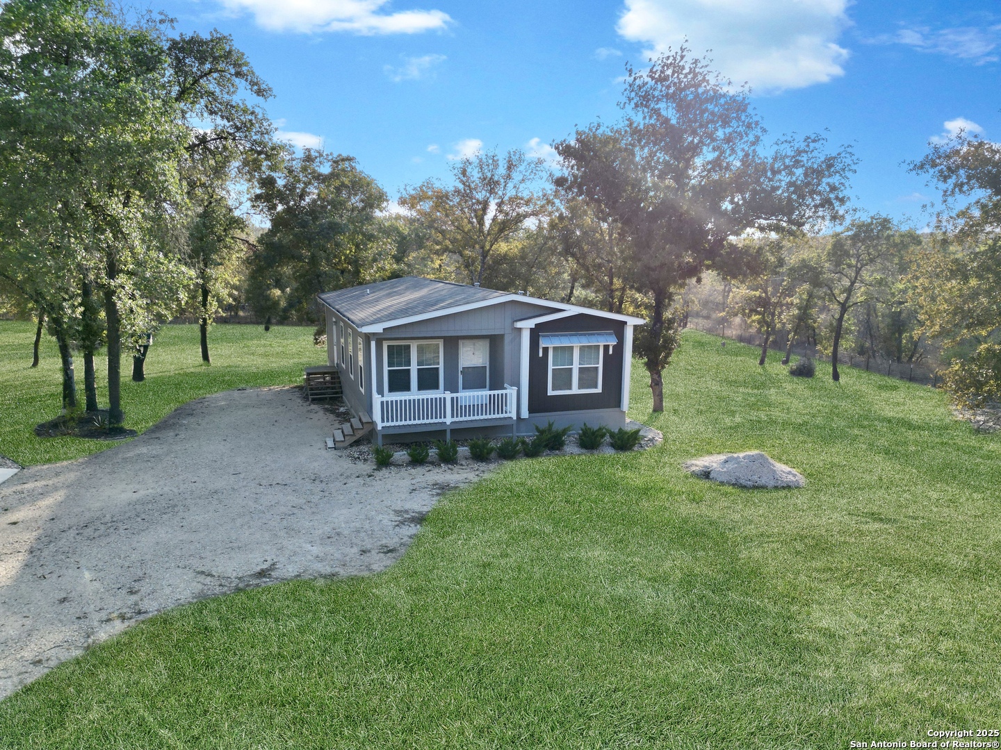 Modern living meets country charm in the desirable Hickory Hollow subdivision just off South 281 and outside of Loop 1604. Built in 2023 and sitting on 1.695 acres, this like-new Manufactured Home offers 3 bedrooms, 2 baths, and an open design filled with natural light. Enjoy quartz countertops, a spacious island, and stainless steel appliances including the refrigerator, range, microwave, and dishwasher. Every room features ceiling fans and two-inch faux blinds, creating both comfort and style. Outside, mature trees, beautiful landscaping, and a powered remote gate enhance the fully fenced property. The oversized detached two-car garage with a metal roof and electricity is perfect for vehicles, tools, or projects. Located at the end of a cul-de-sac with quick access to major highways, shopping, restaurants, parks, and military bases such as Lackland AFB and Brooks City Base. This is your chance to own beautiful Texas land with a home so act fast before it's gone!