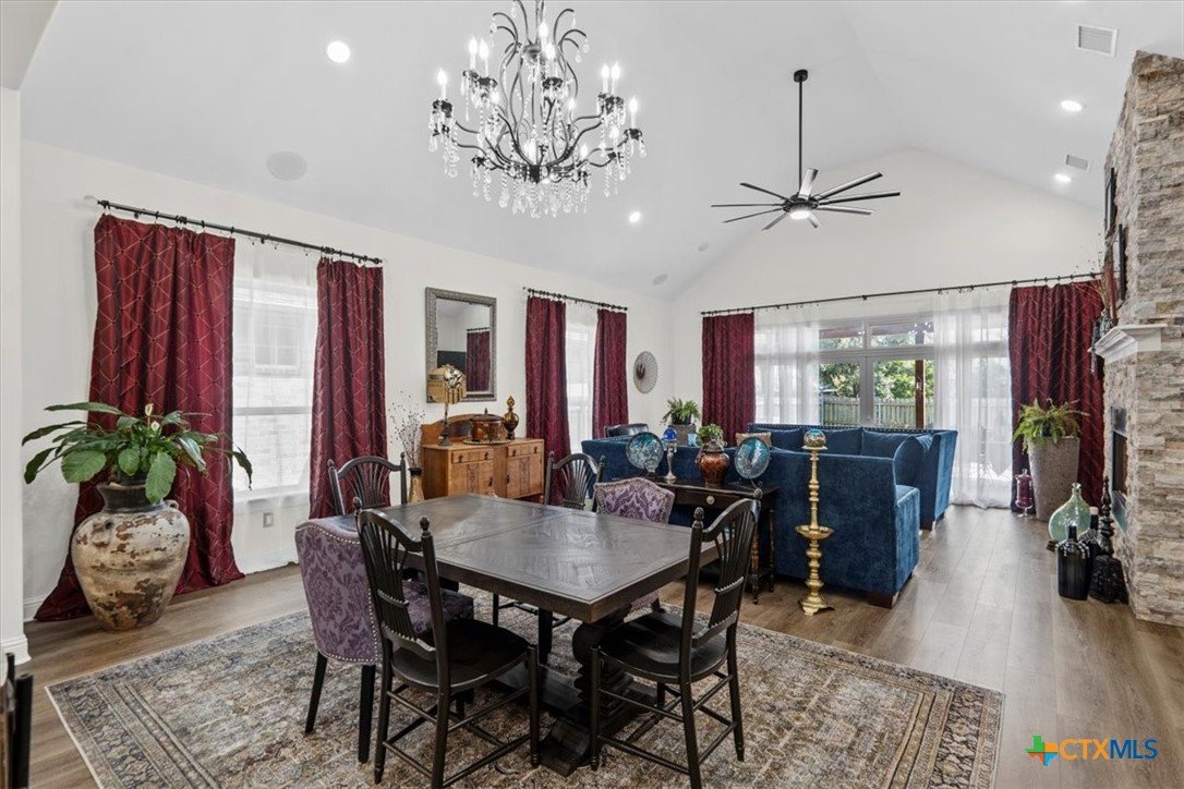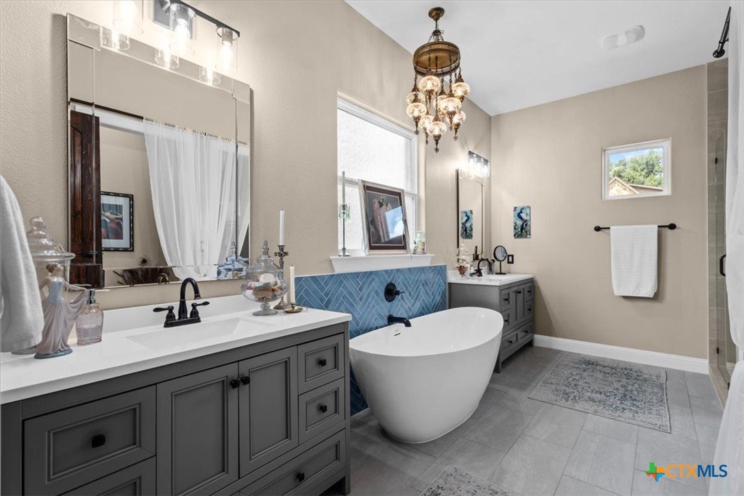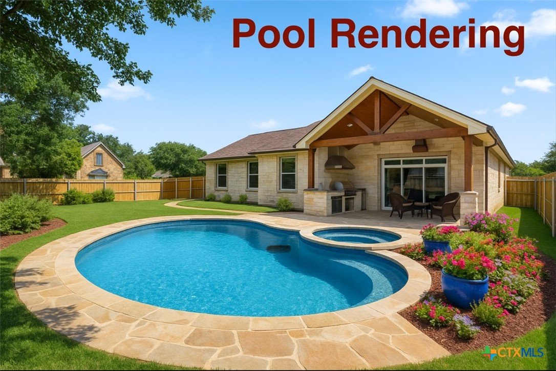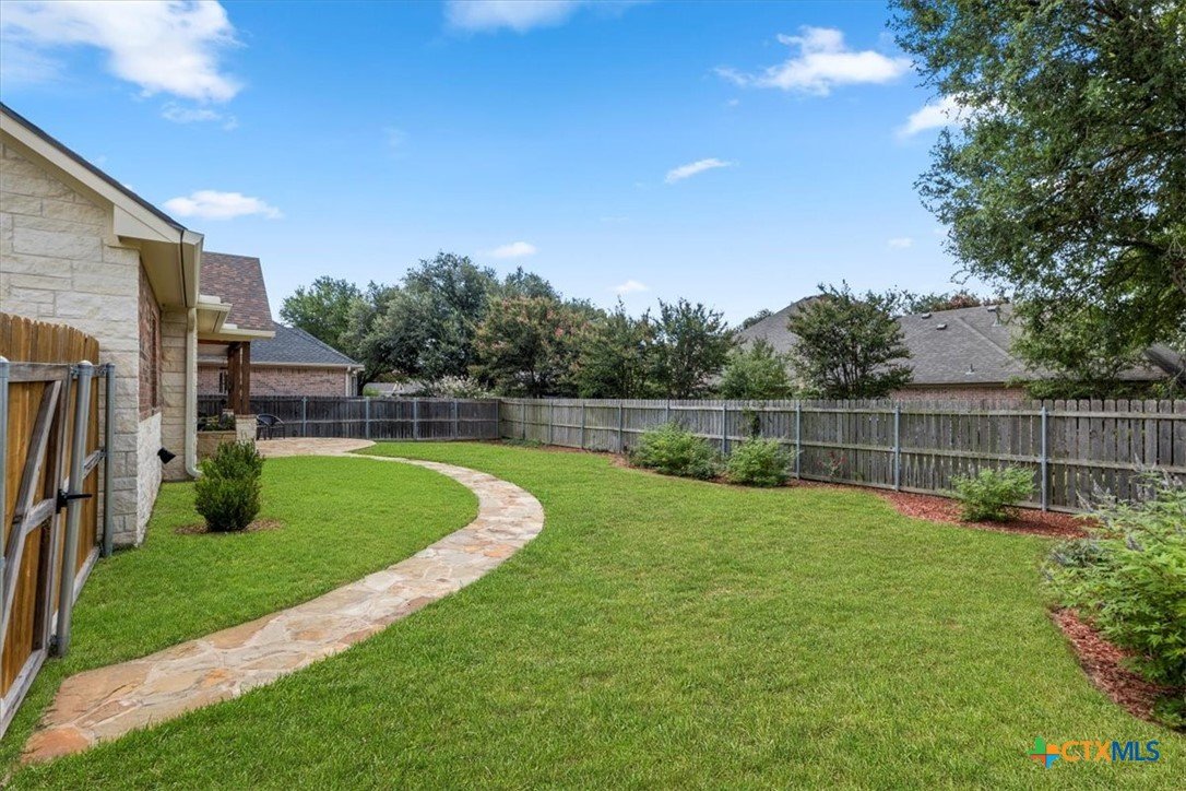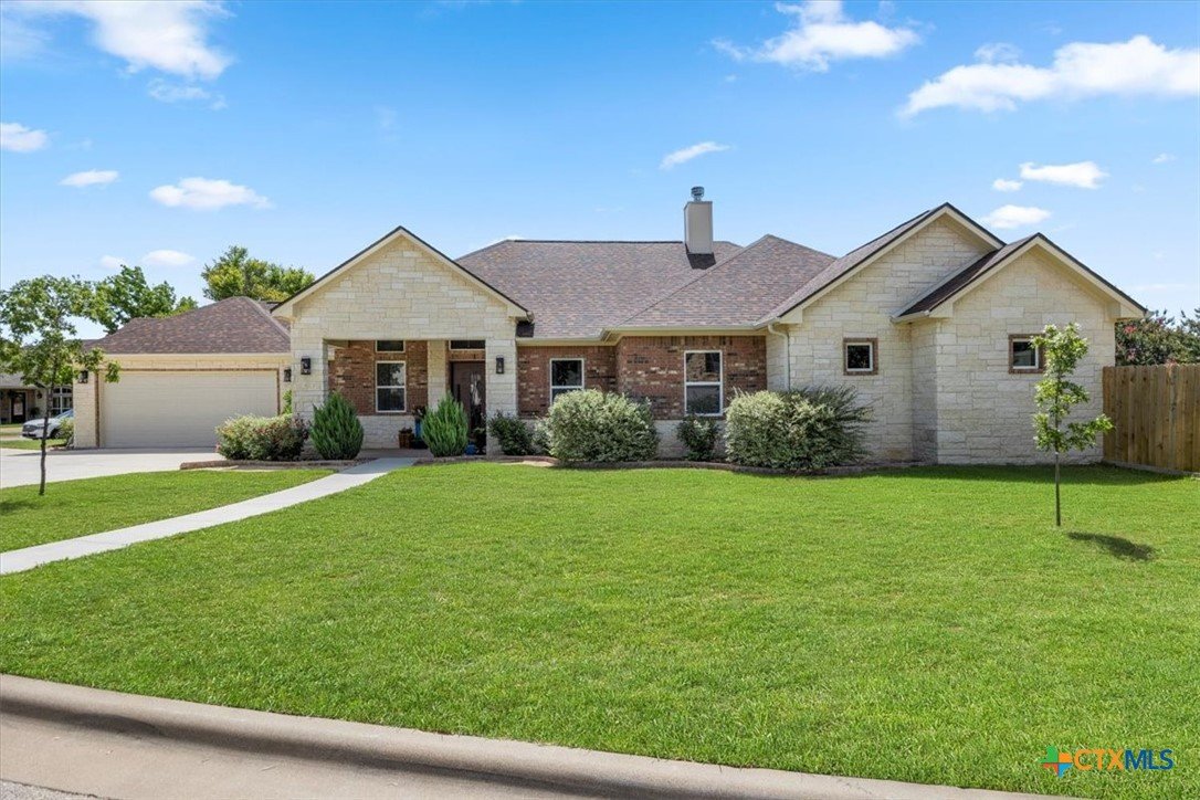 Welcome to this exceptional custom home, thoughtfully designed with luxurious interior upgrades and distinctive details throughout, nestled in the prestigious Deerfield community. This charming residence is situated on a corner lot with a unique half-moon driveway, offering both curb appeal and convenient access. Surrounded by mature trees, this property provides a peaceful and private setting, perfect for enjoying Texas sunsets and outdoor gatherings. This newer build combines modern comfort with thoughtful design. Enjoy close proximity to shopping centers, restaurants, and everyday conveniences to meet all your lifestyle needs. Healthcare is easily accessible too, with Scott & White and VA Hospitals just a short drive away. Whether you're seeking a serene neighborhood or a conveniently located home. The residence boasts unique custom lighting fixtures, including stunning Salado Glassworks pendant lights that gracefully illuminate the overhanging kitchen island, creating a warm and inviting ambiance. The home features oversized custom doors and built-in cabinetry, enhancing both style and functionality. Recently upgraded with an impact-resistant roof, providing added security and peace of mind. The open floor plan with soaring vaulted ceilings makes the living spaces feel spacious and airy—perfect for entertaining and everyday comfort. A designer steel front door adds a touch of modern elegance as you arrive. The exterior is beautifully landscaped with a full sprinkler system, custom stone and rock walkways, patios, and porches that invite outdoor gatherings and relaxation. Inside, indulge in a luxurious soaking garden tub nestled beneath a custom chandelier—a perfect retreat after a long day. The oversized master closet is thoughtfully designed with custom built-ins, offering ample storage and organization options.This home seamlessly combines style, durability, and functionality—creating the ideal sanctuary for comfortable living and memorable entertaining.