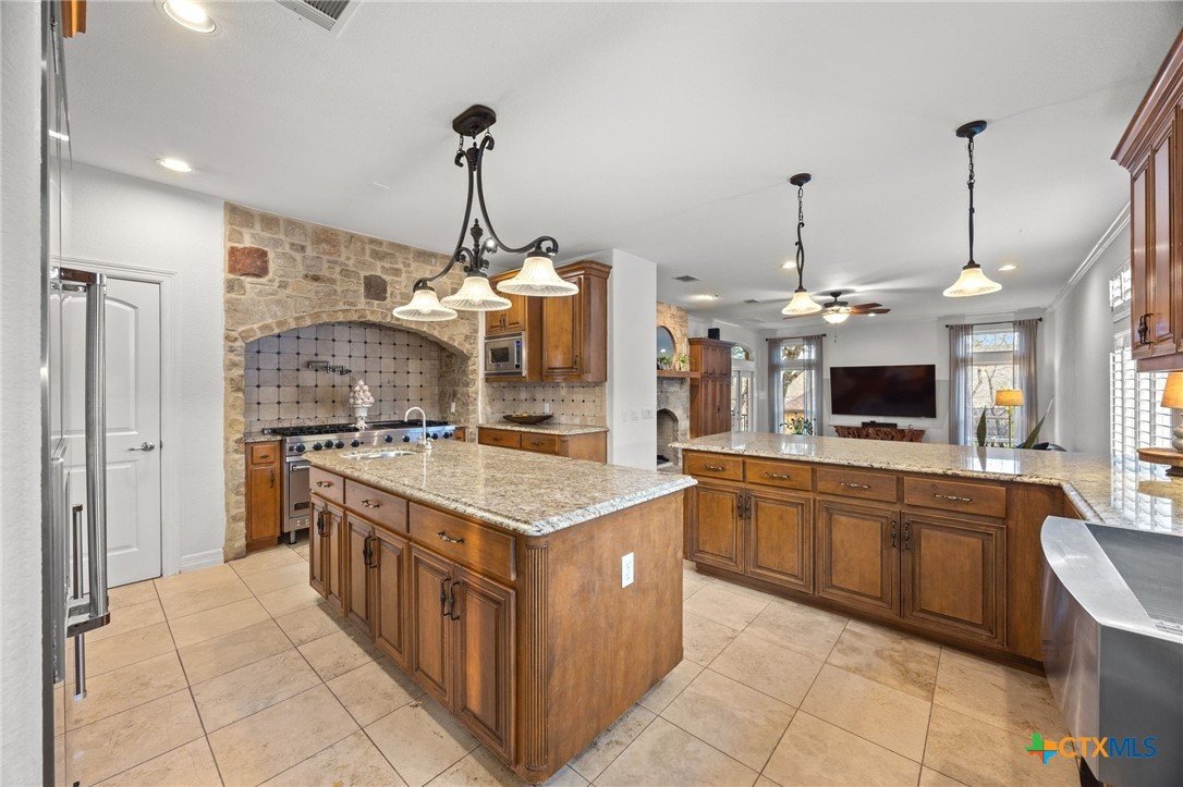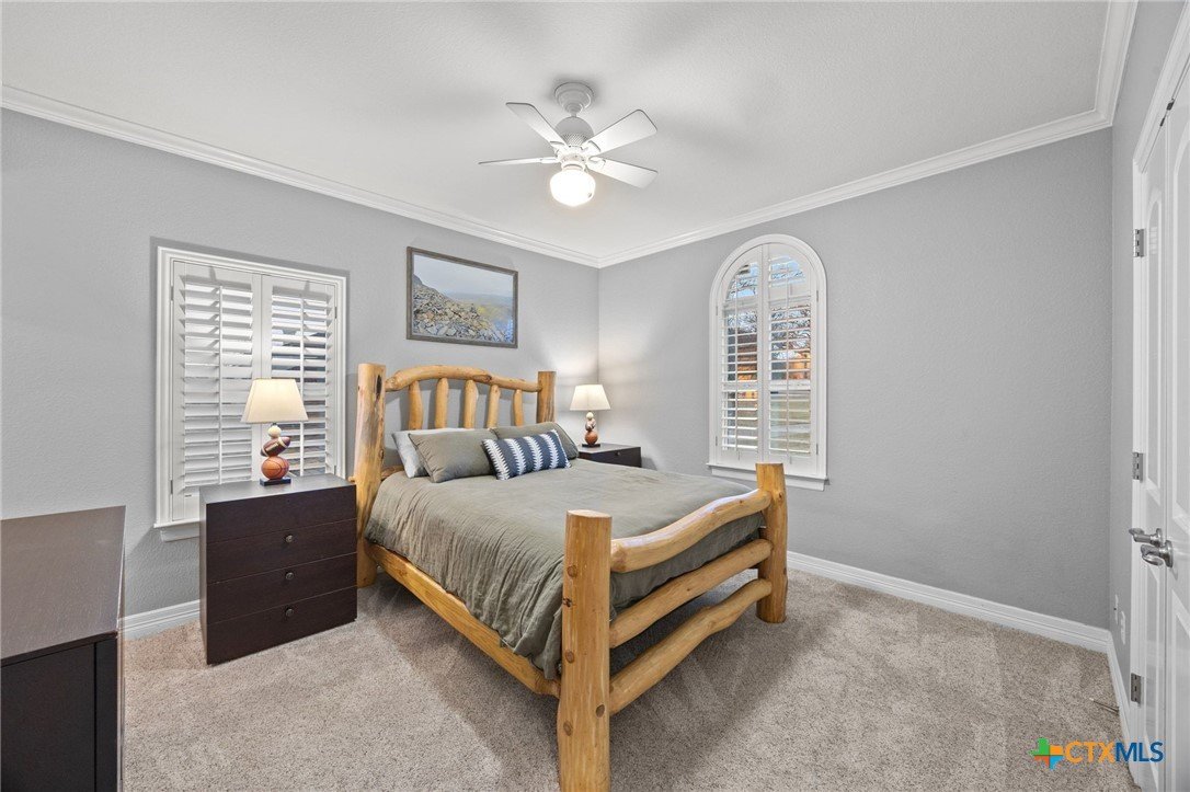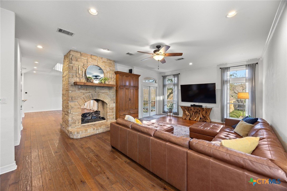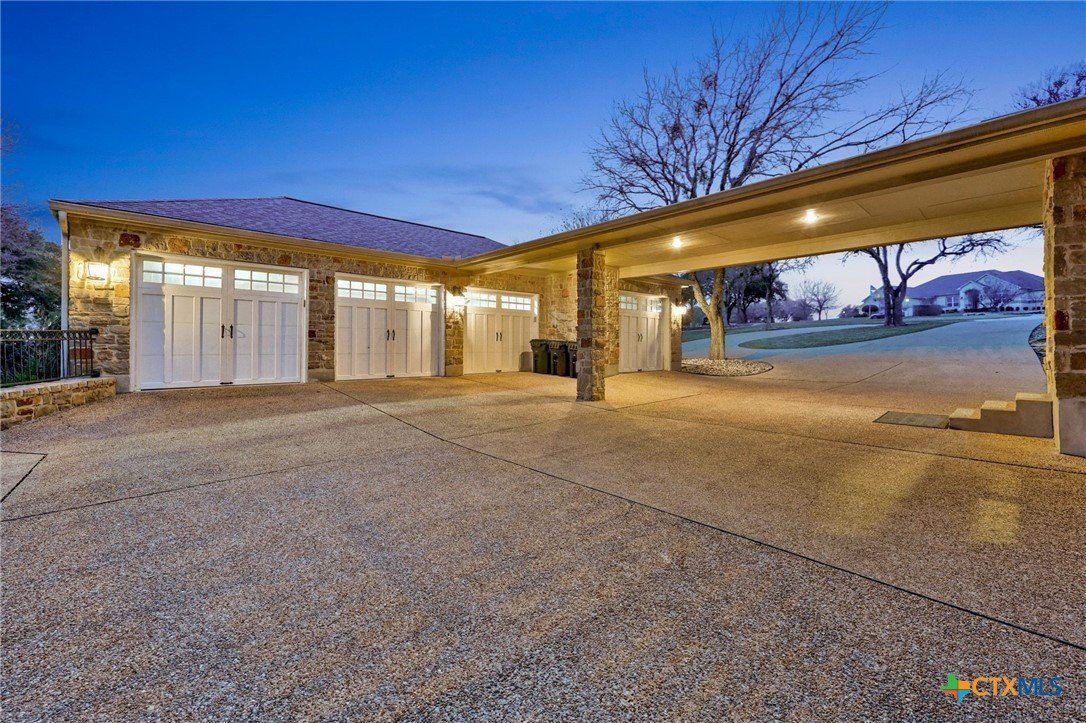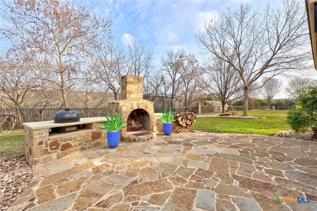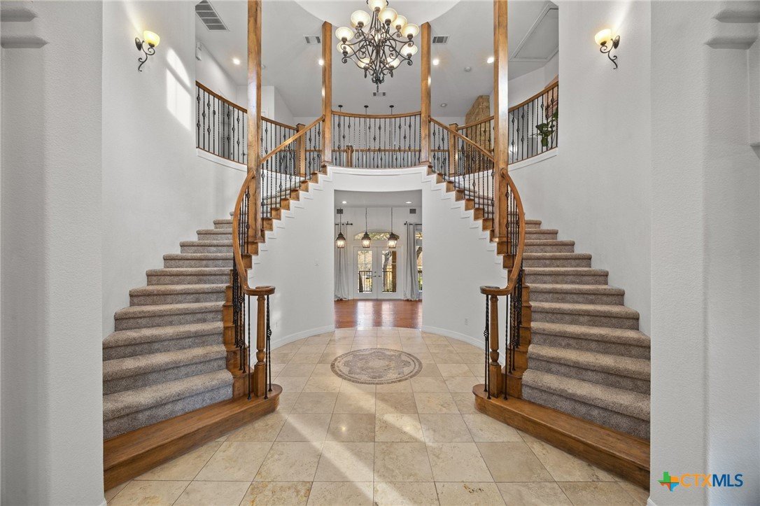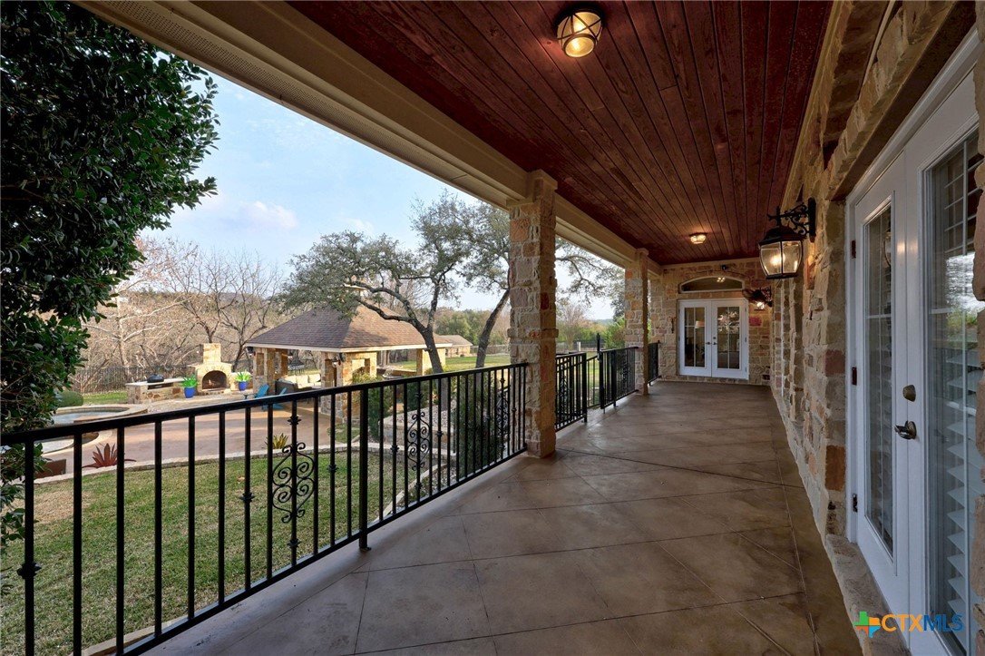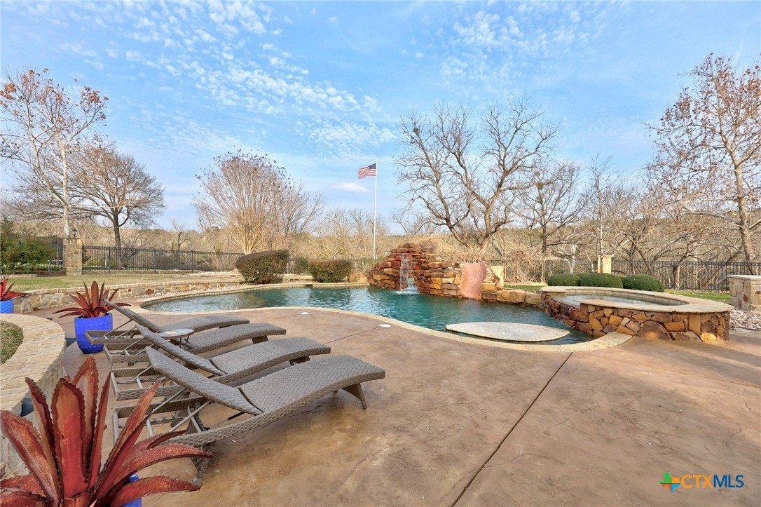Just minutes from Lake Georgetown, this magnificent estate offers privacy, space, a resort-style backyard, & breathtaking natural views on one of Georgetown’s most desirable greenbelt lots. Set on 1.4 acres backing to a serene creek that leads to Lake Georgetown, the property welcomes you with a long driveway that leads to a porte-cochere & a 4-car detached garage with a brand-new HVAC system. An oversized front porch sets the tone, & upon entry, you’re greeted by soaring ceilings & a dramatic grand double staircase. The formal living room features a wet bar, built-in cabinetry, & a stunning floor-to-ceiling double-sided fireplace shared with the family room—perfect for both refined entertaining & everyday living. The kitchen impresses with expansive granite countertops, abundant stained wood cabinetry, stainless steel appliances, & a pantry, flowing seamlessly into the formal dining room with access to the front porch. A dedicated office with a fireplace, & porch access provides a private workspace. The primary suite offers direct patio access & a spa-like ensuite bath with dual vanities, a jetted soaking tub, a frameless glass shower with seating, & a generous walk-in closet with built-ins. Upstairs, four spacious bedrooms offer unmatched flexibility, all connected by Jack-&-Jill bathrooms. Step outside to a backyard oasis where unforgettable moments unfold—picture afternoons spent lounging beneath the large covered patio, guests enjoying the pool complete with a hot tub, waterfall feature, & slide, and fun evenings as meals are prepared in the outdoor kitchen in the cabana. Gather around the outdoor fireplace & soak in the serene, true resort-style atmosphere thoughtfully designed for both entertaining & everyday relaxation. Beyond the yard, a large shed with a porch overlooks the stunning Corps of Engineer property & the creek, creating a quiet retreat. All of this comes with no HOA & a prime location close to shopping, dining, recreation, & desirable schools.