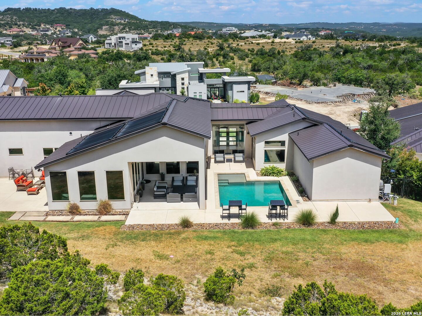 Set within the Canyons at Scenic Loop, this meticulously built single story residence offers a refined expression of contemporary Hill Country design. Clean architectural lines, strong proportions, and carefully selected materials define the home, while expansive windows introduce abundant natural light throughout the living spaces. The open floor plan is anchored by soaring ceilings and a striking see through fireplace connecting the main living and dining areas. Sightlines extend across the home, creating a sense of openness without sacrificing separation between living spaces. The layout is intentional, functional, and well balanced for both everyday living and entertaining. The kitchen serves as a central gathering space, featuring custom solid wood cabinetry, an oversized island, KitchenAid stainless appliance package, double ovens, a built in wine refrigerator, and a stainless vent hood. The space integrates seamlessly with the surrounding living areas, offering strong flow and usability. The primary suite is privately positioned with direct access to the outdoor living space. The spa style bath includes a garden soaking tub, a double sided walk in shower, and a generous walk in closet outfitted with extensive custom cabinetry and built ins. Secondary bedrooms are well proportioned and thoughtfully arranged, offering flexibility for guests, family, or office use. Outdoor living centers around an oversized covered patio overlooking a Keith Zars pool, creating a natural extension of the interior living areas.