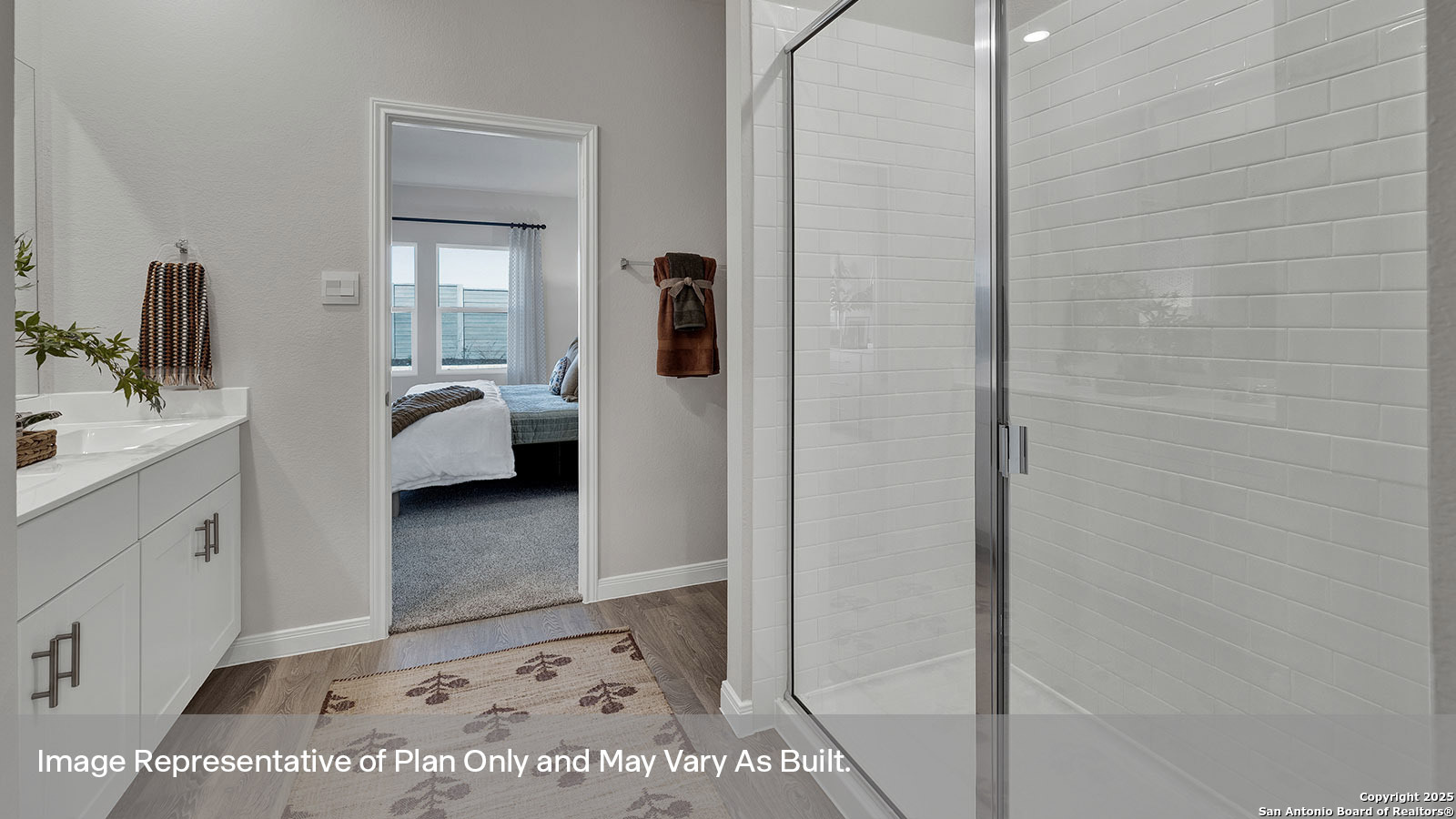 MOVE IN READY! EASY ACCESS TO I-35. Explore the Hanna, one of our two story floorplans available at Whisper South in San Marcos, Texas. This beautiful 2,034 square foot home has 4 bedrooms, 2.5 bathrooms, a gameroom and a 2 car garage. Our homes in Whisper South feature three-sided masonry exteriors. On the first floor of this new home, you'll find the main living space and primary bedroom ensuite. The kitchen, dining, and family room are an open concept layout, perfect for everyday living and entertaining. The kitchen features an island with undermount sink, quartz countertops, a pantry closet, 36" upper cabinets, and stainless-steel appliances, including a gas range. Enjoy the natural light from the side and rear windows. The oversized utility room is off the kitchen and connects to the garage, making it the ideal mud room. The primary bedroom ensuite is tucked away off the family room. Enjoy a peaceful start to your day in this space with the luxurious walk-in shower, double vanity with marble counter tops, private toilet area with a door, and a large walk-in closet. Climb the staircase to the second floor and enter the gameroom. This multi-use space can easily be transformed into an office or play area for the kids. Three additional bedrooms and one full bathroom complete the second story space. The upstairs bedrooms include closets with wood shelving and the upstairs bathroom includes a shower/tub combination and extra shelving for storage or decor. The Hanna includes vinyl flooring throughout the common areas of the home, and carpet in the bedrooms. All our new homes feature a covered back patio, full sod, irrigation system in the front and back yard, and a 6' privacy fence around the back yard. This home includes our America's Smart Home base package, which includes the Front Doorbell, Front Door Deadbolt Lock, Home Hub, Thermostat, and Deako Smart Switches.