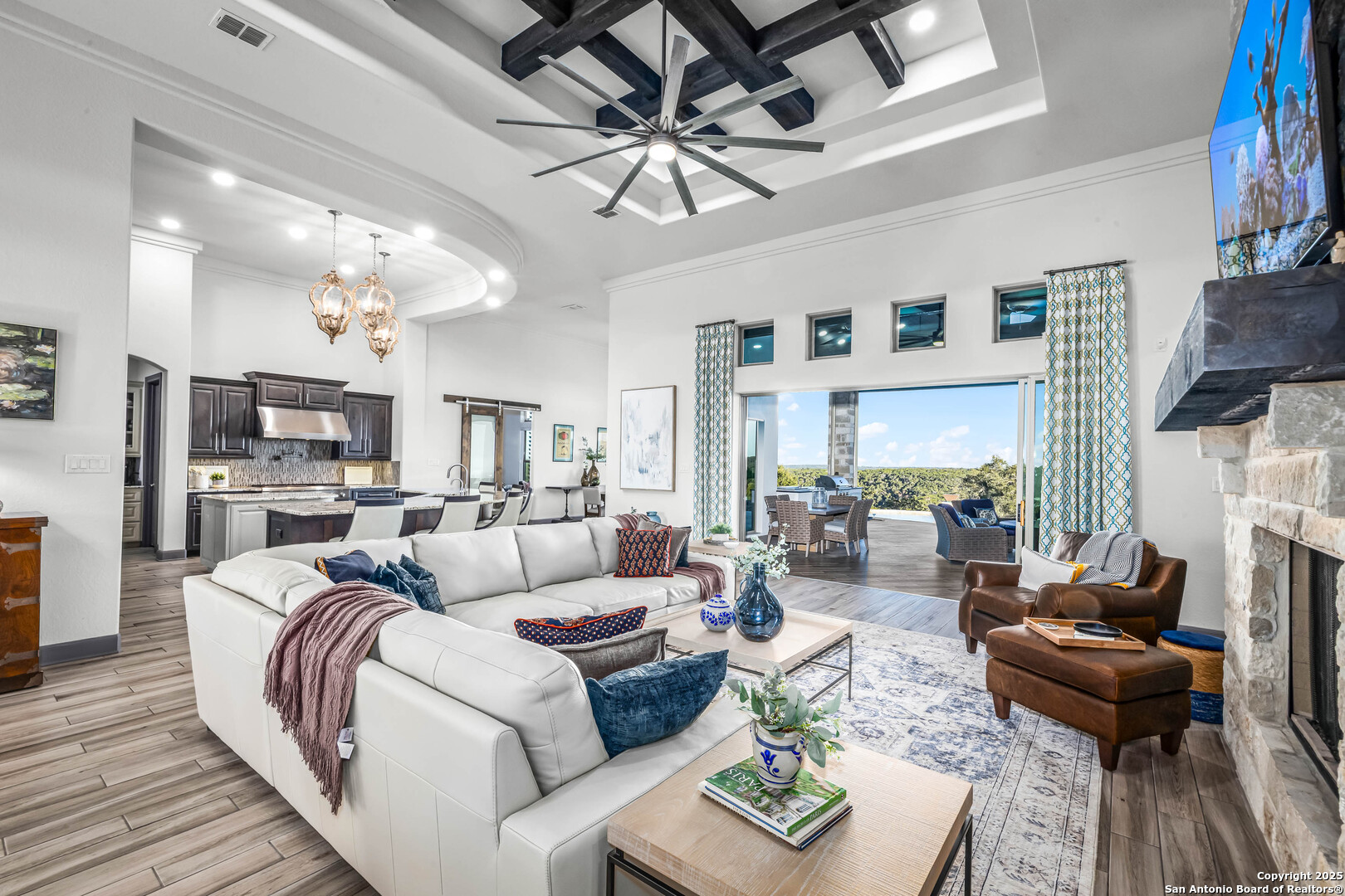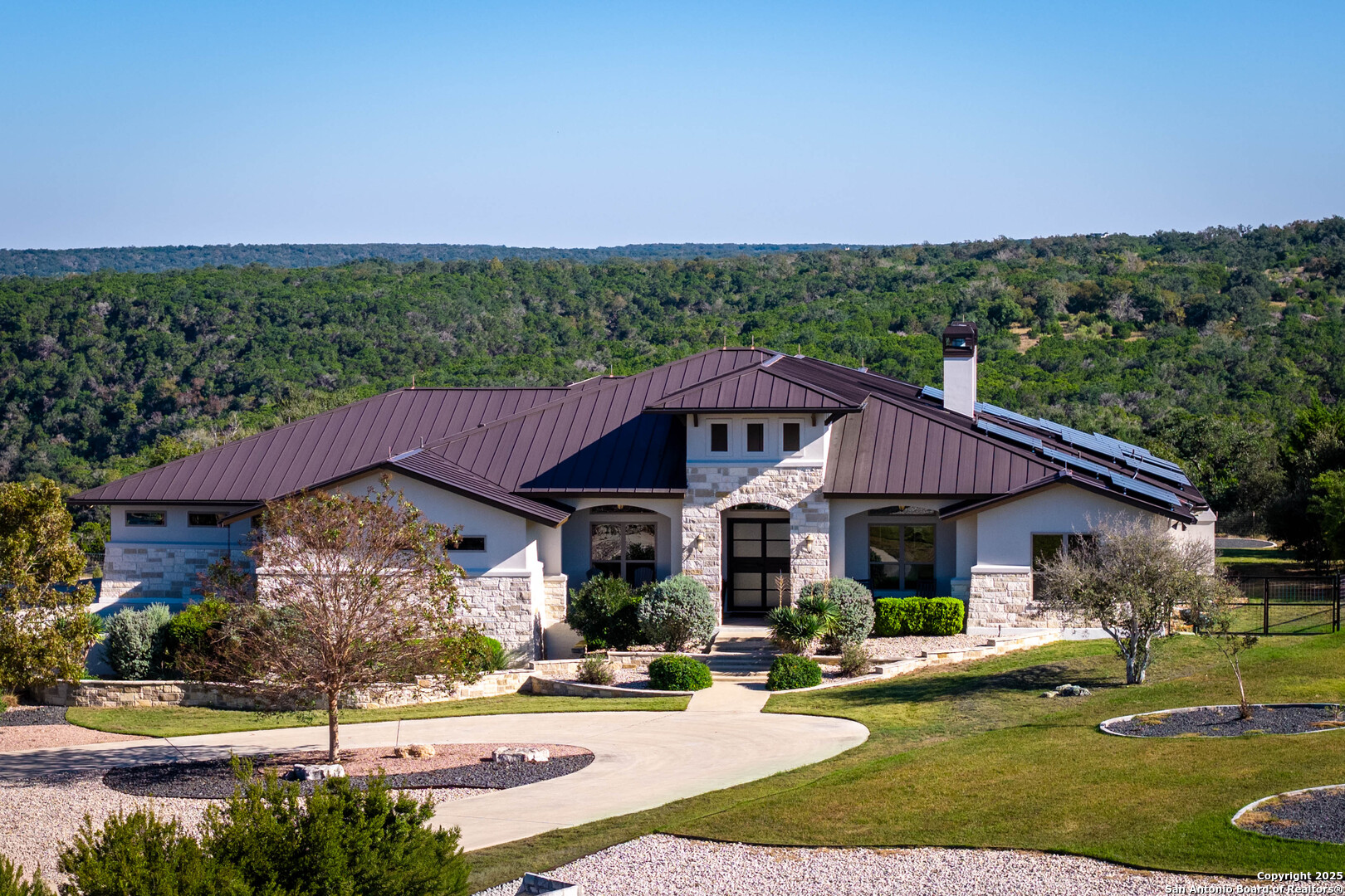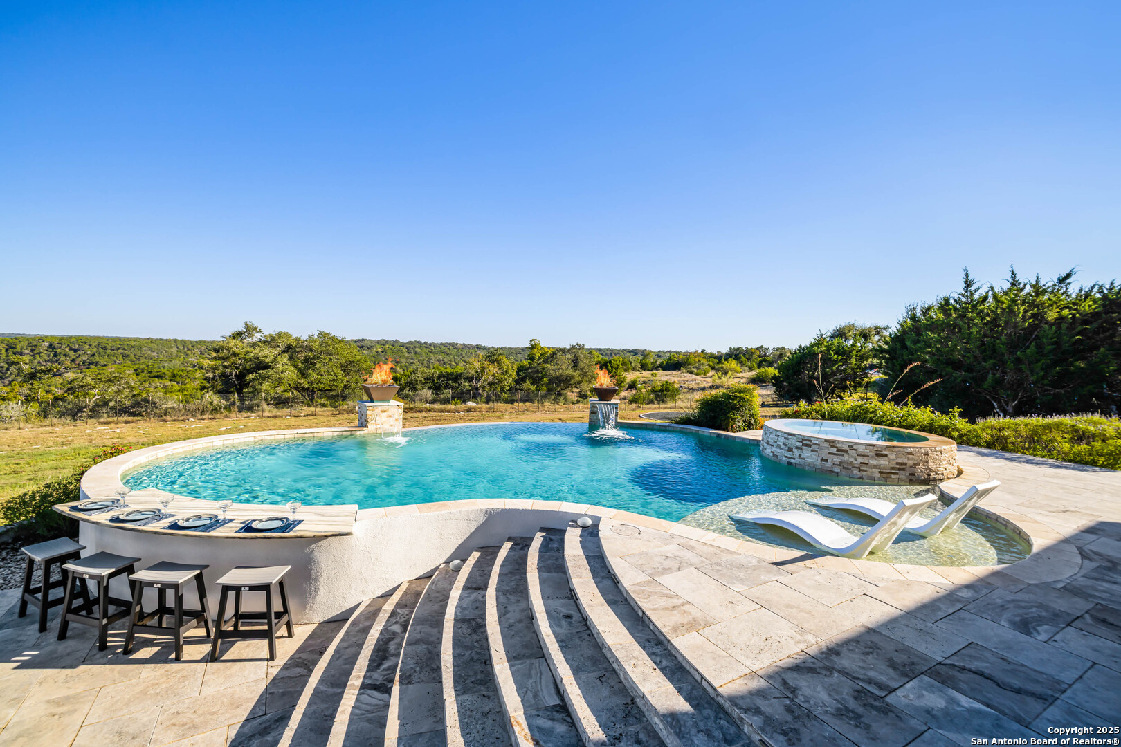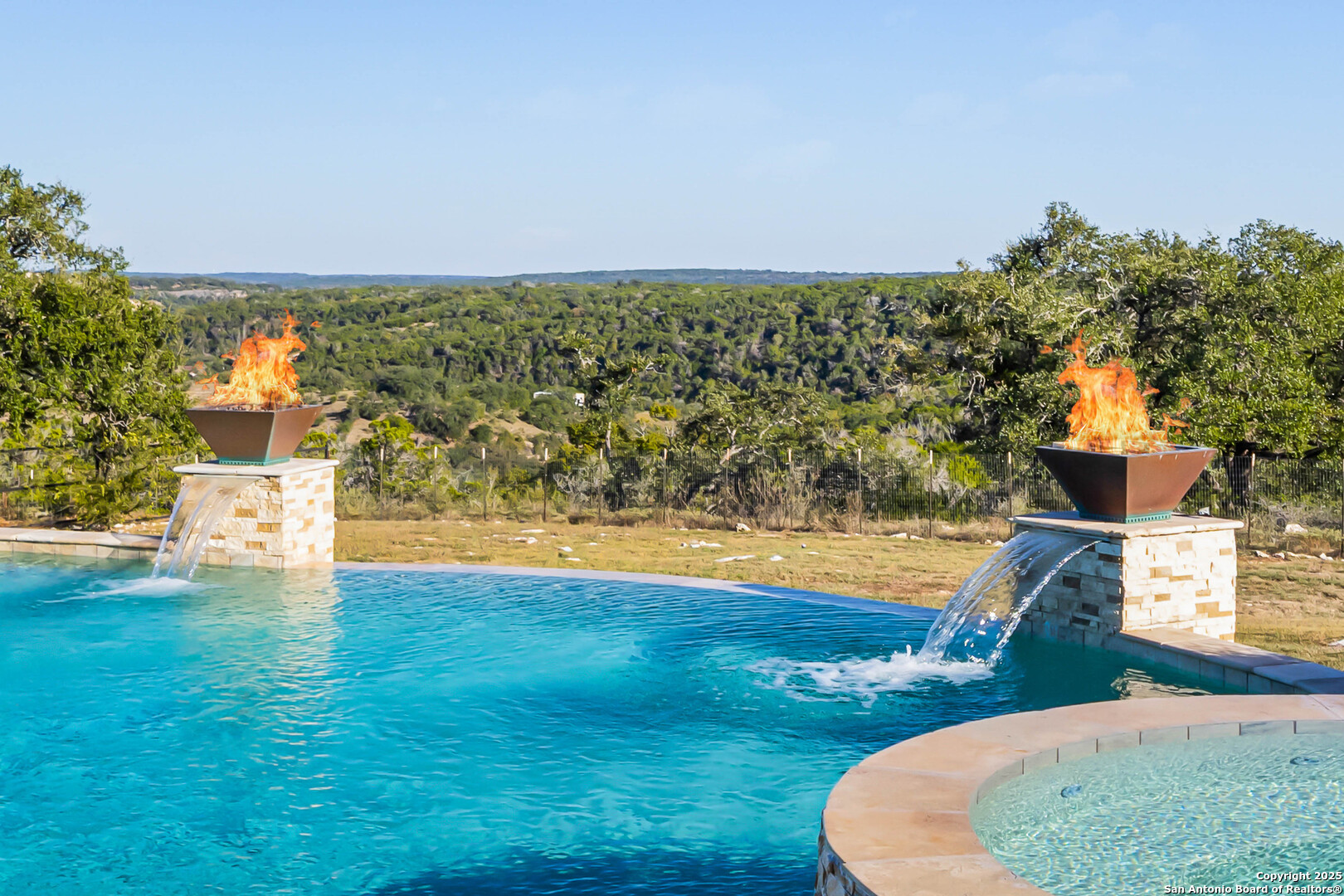 Built by Vintage Estates Luxury Home Builder, this exquisite Hill Country estate redefines refined living in the prestigious Canyon Ranch gated section of Vintage Oaks. Situated on over an acre at the end of a secluded cul-de-sac, the property captures breathtaking panoramic views overlooking the 4,000+ acre Stahlman Ranch. From the circular driveway to the soaring custom 8-foot iron entry doors, every detail of this 4,255-square-foot masterpiece reflects exceptional craftsmanship and timeless design. Inside, elegance meets livability with whole-house tile flooring, custom alder cabinetry, and designer finishes throughout. The heart of the home is an entertainer's dream kitchen, featuring enormous double granite islands, high-end Thermador and Bosch appliances, double ovens, and a professional-grade vent hood. A reverse osmosis system and quartz bathroom counters underscore the home's thoughtful attention to luxury and convenience. The eat-in kitchen seamlessly connects to a separate formal dining room, while the bonus room, media room, and wood-paneled office offer flexible spaces for work, play, and relaxation. A built-in bar with leathered granite countertop adds a touch of sophistication, perfect for hosting gatherings in style. The primary suite is a serene retreat, boasting electric blinds, spa-like finishes, and private access to an outdoor shower-a rare feature that enhances the connection between indoor comfort and outdoor tranquility. Step outside through one of the two enormous collapsible screen doors, and you'll find an outdoor living oasis designed for both everyday enjoyment and unforgettable entertaining. The infinity-edge heated pool with in-pool spa, floor cleaning system, and swim-up bar invites you to relax against the backdrop of stunning Hill Country sunsets. Surrounding it, a travertine pool deck, tiled porch and patio, and a leathered granite outdoor kitchen create a resort-style environment ideal for gatherings large or small. The outdoor fire pit offers a cozy space for starlit evenings, while the fully fenced backyard ensures privacy and peace. Every structural and technological upgrade has been carefully considered for performance, durability, and efficiency. The polyaspartic garage floor, new insulated garage doors, and standing seam metal roof (Cat 4 rated) combine longevity with style. Lightning rods, whole-house gutters, and two tankless gas hot water heaters add practical resilience. The 4 Eero Wi-Fi routers ensure complete coverage across the home, while the two gas fireplaces-one indoors and one outdoors-enhance both comfort and ambiance. A testament to modern sustainability, this home features two Tesla Powerwall 3 systems paired with 40 solar panels, each panel producing 420 watts for a total 16.8 kW system. Together, they provide 27 kW of backup power, offering energy independence and peace of mind. Combined with energy-efficient systems throughout, this estate exemplifies forward-thinking design that's as environmentally conscious as it is luxurious. Every element-from the architectural detailing to the Hill Country vistas-has been thoughtfully curated to deliver an unmatched living experience. Sophisticated yet inviting, this residence embodies the perfect balance of innovation, comfort, and natural beauty. It's not just a home-it's a statement of enduring craftsmanship and effortless Hill Country elegance.