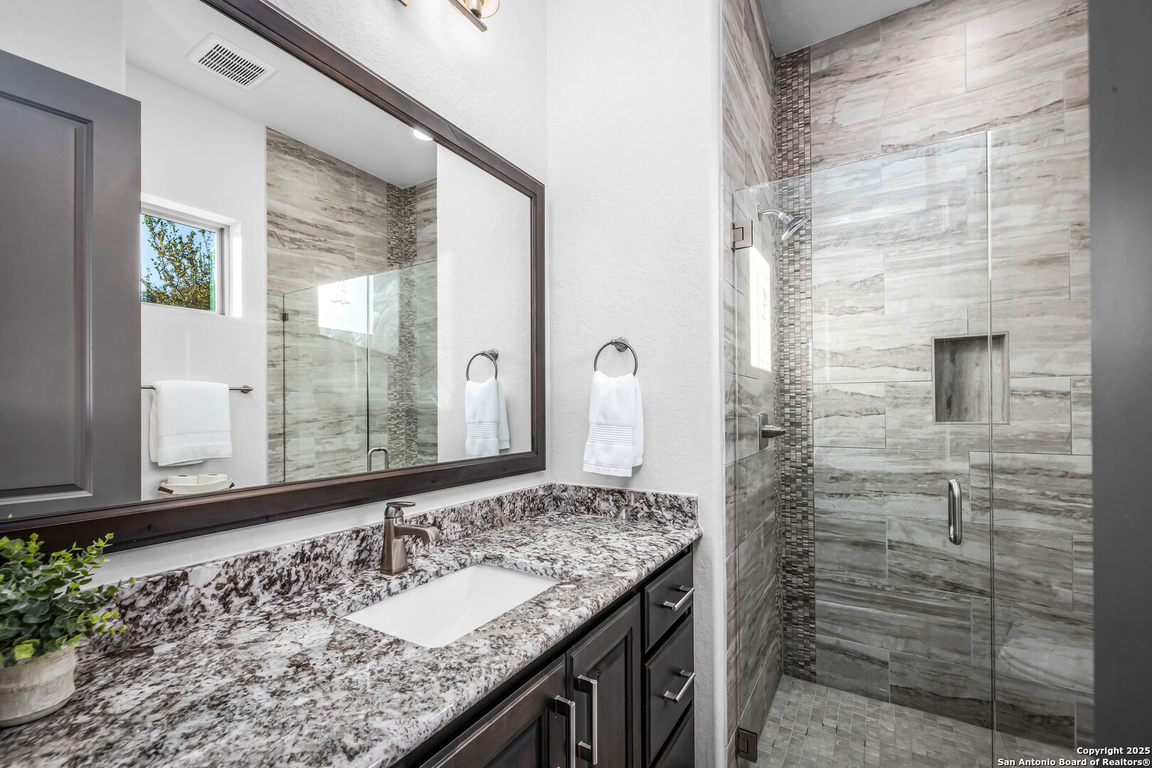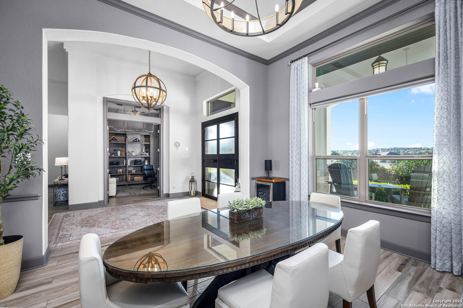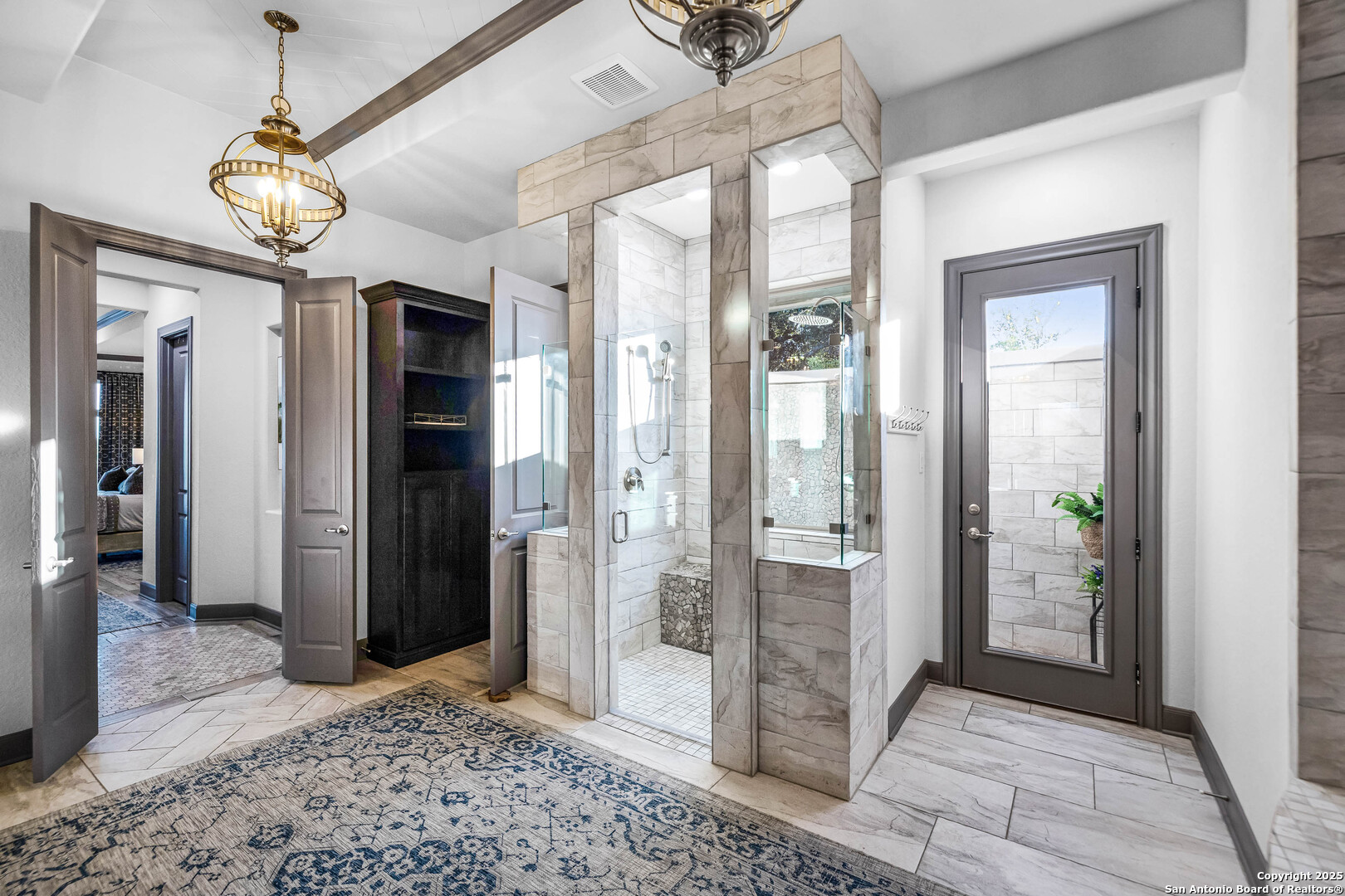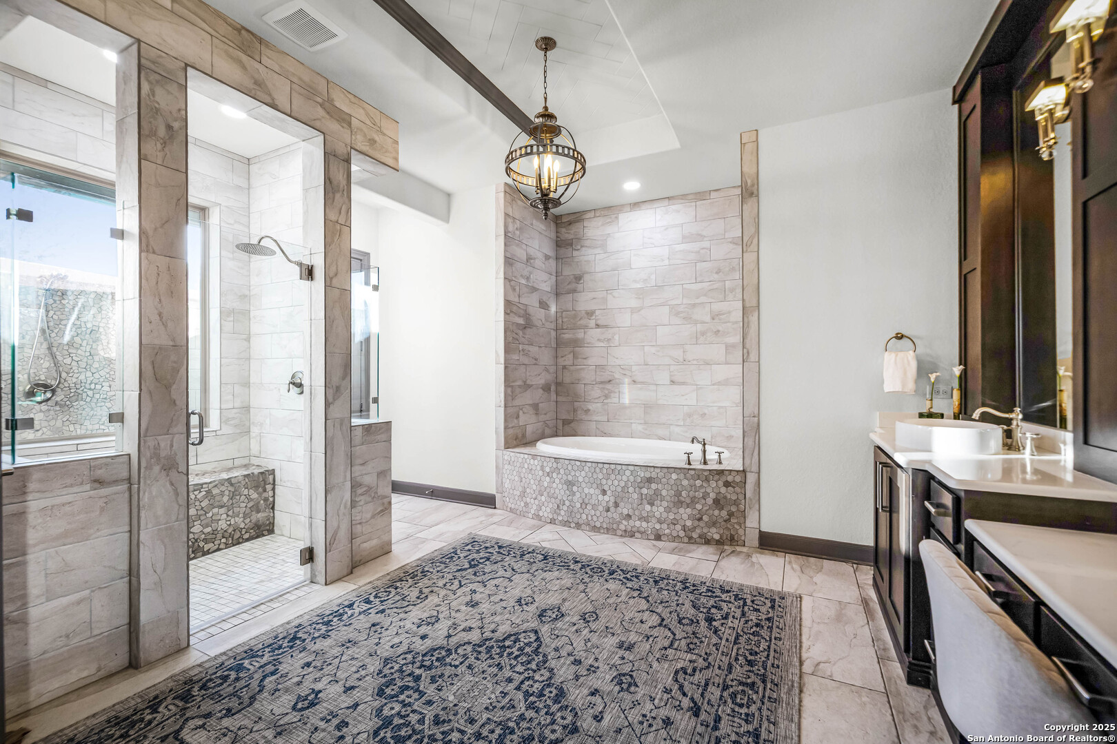 Built by Vintage Estates Luxury Home Builder, this exquisite Hill Country estate redefines refined living in the prestigious Canyon Ranch gated section of Vintage Oaks. Situated on over an acre at the end of a secluded cul-de-sac, the property captures breathtaking panoramic views overlooking the 4,000+ acre Stahlman Ranch. From the circular driveway to the soaring custom 8-foot iron entry doors, every detail of this 4,255-square-foot masterpiece reflects exceptional craftsmanship and timeless design. Inside, elegance meets livability with whole-house tile flooring, custom alder cabinetry, and designer finishes throughout. The heart of the home is an entertainer's dream kitchen, featuring enormous double granite islands, high-end Thermador and Bosch appliances, double ovens, and a professional-grade vent hood. A reverse osmosis system and quartz bathroom counters underscore the home's thoughtful attention to luxury and convenience. The eat-in kitchen seamlessly connects to a separate formal dining room, while the bonus room, media room, and wood-paneled office offer flexible spaces for work, play, and relaxation. A built-in bar with leathered granite countertop adds a touch of sophistication, perfect for hosting gatherings in style. The primary suite is a serene retreat, boasting electric blinds, spa-like finishes, and private access to an outdoor shower-a rare feature that enhances the connection between indoor comfort and outdoor tranquility. Step outside through one of the two enormous collapsible screen doors, and you'll find an outdoor living oasis designed for both everyday enjoyment and unforgettable entertaining. The infinity-edge heated pool with in-pool spa, floor cleaning system, and swim-up bar invites you to relax against the backdrop of stunning Hill Country sunsets. Surrounding it, a travertine pool deck, tiled porch and patio, and a leathered granite outdoor kitchen create a resort-style environment ideal for gatherings large or small. The outdoor fire pit offers a cozy space for starlit evenings, while the fully fenced backyard ensures privacy and peace. Every structural and technological upgrade has been carefully considered for performance, durability, and efficiency. The polyaspartic garage floor, new insulated garage doors, and standing seam metal roof (Cat 4 rated) combine longevity with style. Lightning rods, whole-house gutters, and two tankless gas hot water heaters add practical resilience. The 4 Eero Wi-Fi routers ensure complete coverage across the home, while the two gas fireplaces-one indoors and one outdoors-enhance both comfort and ambiance. A testament to modern sustainability, this home features two Tesla Powerwall 3 systems paired with 40 solar panels, each panel producing 420 watts for a total 16.8 kW system. Together, they provide 27 kW of backup power, offering energy independence and peace of mind. Combined with energy-efficient systems throughout, this estate exemplifies forward-thinking design that's as environmentally conscious as it is luxurious. Every element-from the architectural detailing to the Hill Country vistas-has been thoughtfully curated to deliver an unmatched living experience. Sophisticated yet inviting, this residence embodies the perfect balance of innovation, comfort, and natural beauty. It's not just a home-it's a statement of enduring craftsmanship and effortless Hill Country elegance.