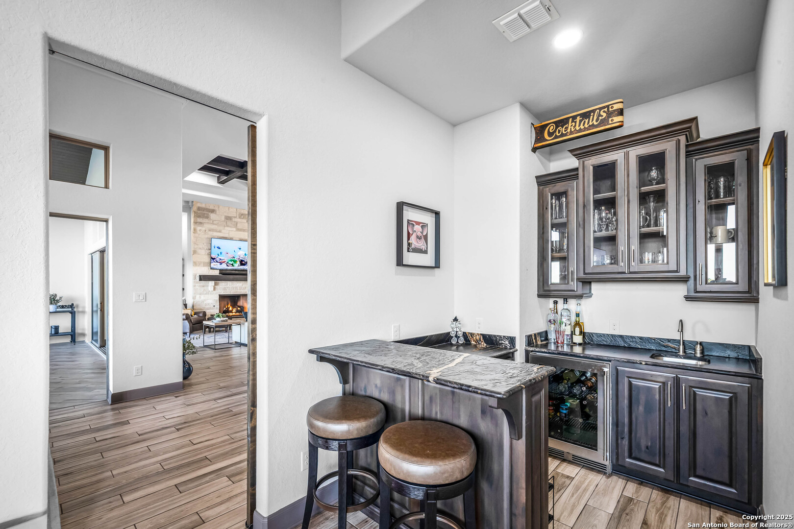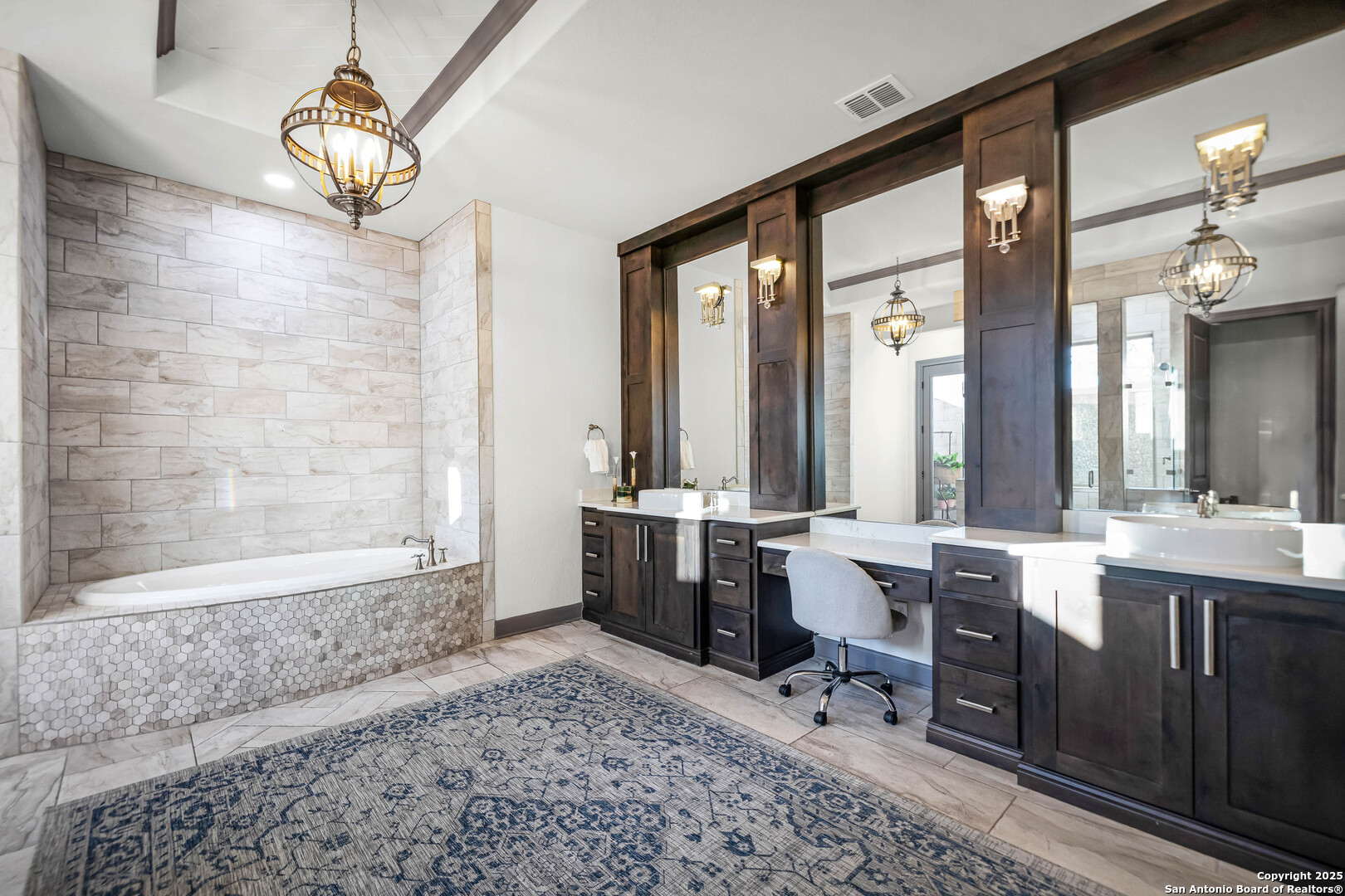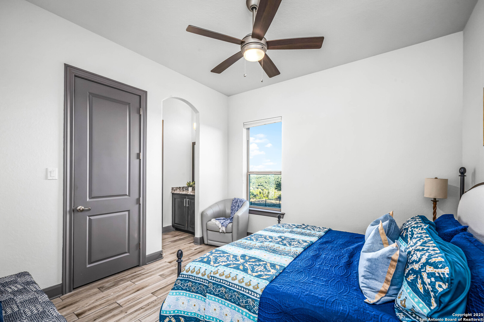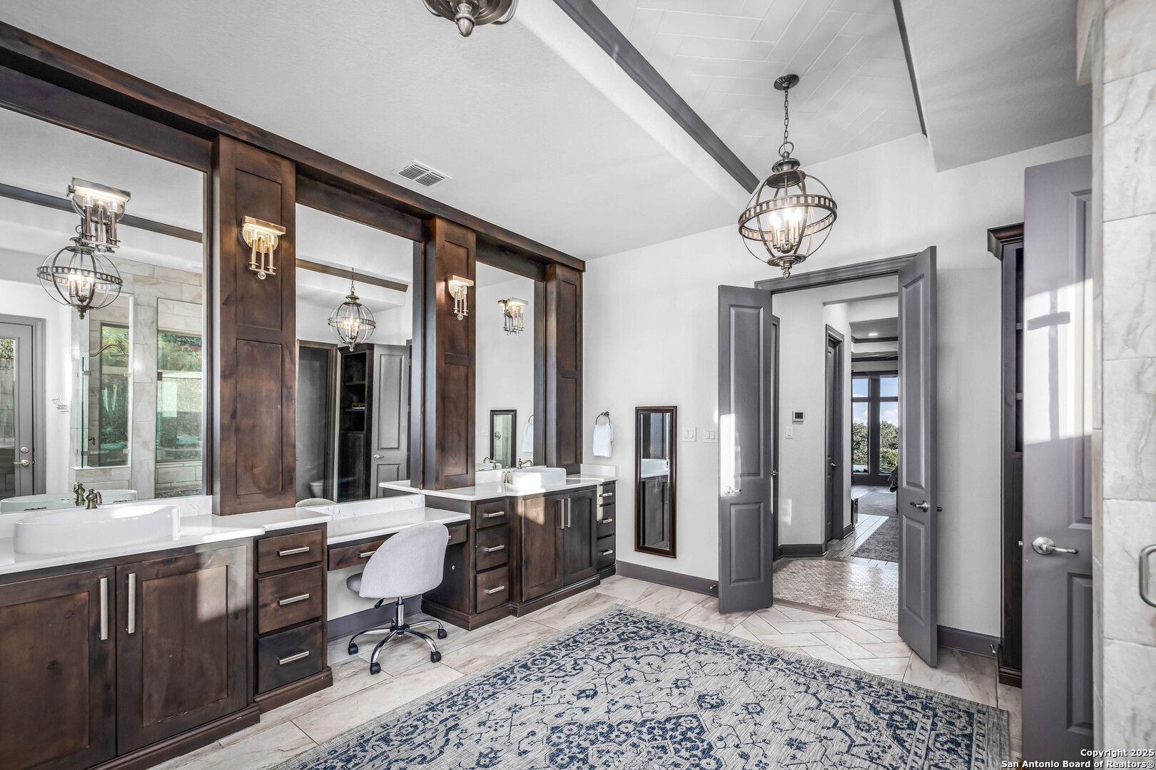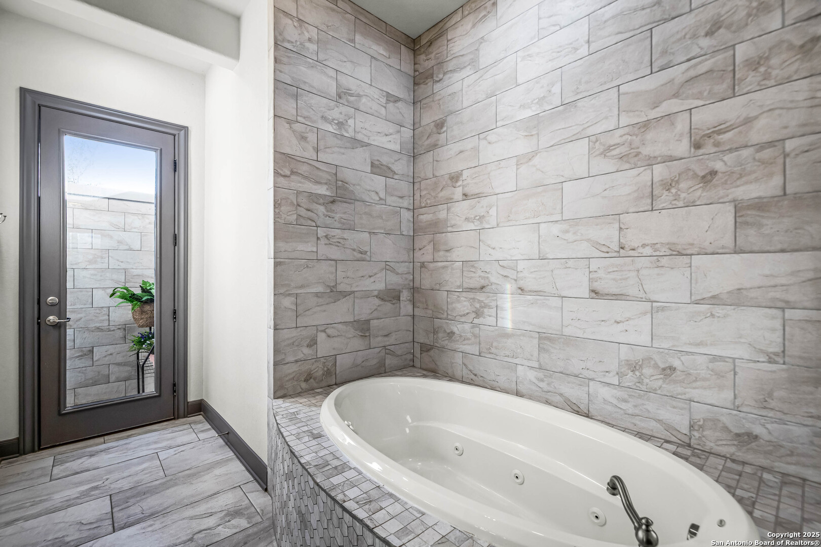 Built by Vintage Estates Luxury Home Builder, this exquisite Hill Country estate redefines refined living in the prestigious Canyon Ranch gated section of Vintage Oaks. Situated on over an acre at the end of a secluded cul-de-sac, the property captures breathtaking panoramic views overlooking the 4,000+ acre Stahlman Ranch. From the circular driveway to the soaring custom 8-foot iron entry doors, every detail of this 4,255-square-foot masterpiece reflects exceptional craftsmanship and timeless design. Inside, elegance meets livability with whole-house tile flooring, custom alder cabinetry, and designer finishes throughout. The heart of the home is an entertainer's dream kitchen, featuring enormous double granite islands, high-end Thermador and Bosch appliances, double ovens, and a professional-grade vent hood. A reverse osmosis system and quartz bathroom counters underscore the home's thoughtful attention to luxury and convenience. The eat-in kitchen seamlessly connects to a separate formal dining room, while the bonus room, media room, and wood-paneled office offer flexible spaces for work, play, and relaxation. A built-in bar with leathered granite countertop adds a touch of sophistication, perfect for hosting gatherings in style. The primary suite is a serene retreat, boasting electric blinds, spa-like finishes, and private access to an outdoor shower-a rare feature that enhances the connection between indoor comfort and outdoor tranquility. Step outside through one of the two enormous collapsible screen doors, and you'll find an outdoor living oasis designed for both everyday enjoyment and unforgettable entertaining. The infinity-edge heated pool with in-pool spa, floor cleaning system, and swim-up bar invites you to relax against the backdrop of stunning Hill Country sunsets. Surrounding it, a travertine pool deck, tiled porch and patio, and a leathered granite outdoor kitchen create a resort-style environment ideal for gatherings large or small. The outdoor fire pit offers a cozy space for starlit evenings, while the fully fenced backyard ensures privacy and peace. Every structural and technological upgrade has been carefully considered for performance, durability, and efficiency. The polyaspartic garage floor, new insulated garage doors, and standing seam metal roof (Cat 4 rated) combine longevity with style. Lightning rods, whole-house gutters, and two tankless gas hot water heaters add practical resilience. The 4 Eero Wi-Fi routers ensure complete coverage across the home, while the two gas fireplaces-one indoors and one outdoors-enhance both comfort and ambiance. A testament to modern sustainability, this home features two Tesla Powerwall 3 systems paired with 40 solar panels, each panel producing 420 watts for a total 16.8 kW system. Together, they provide 27 kW of backup power, offering energy independence and peace of mind. Combined with energy-efficient systems throughout, this estate exemplifies forward-thinking design that's as environmentally conscious as it is luxurious. Every element-from the architectural detailing to the Hill Country vistas-has been thoughtfully curated to deliver an unmatched living experience. Sophisticated yet inviting, this residence embodies the perfect balance of innovation, comfort, and natural beauty. It's not just a home-it's a statement of enduring craftsmanship and effortless Hill Country elegance.