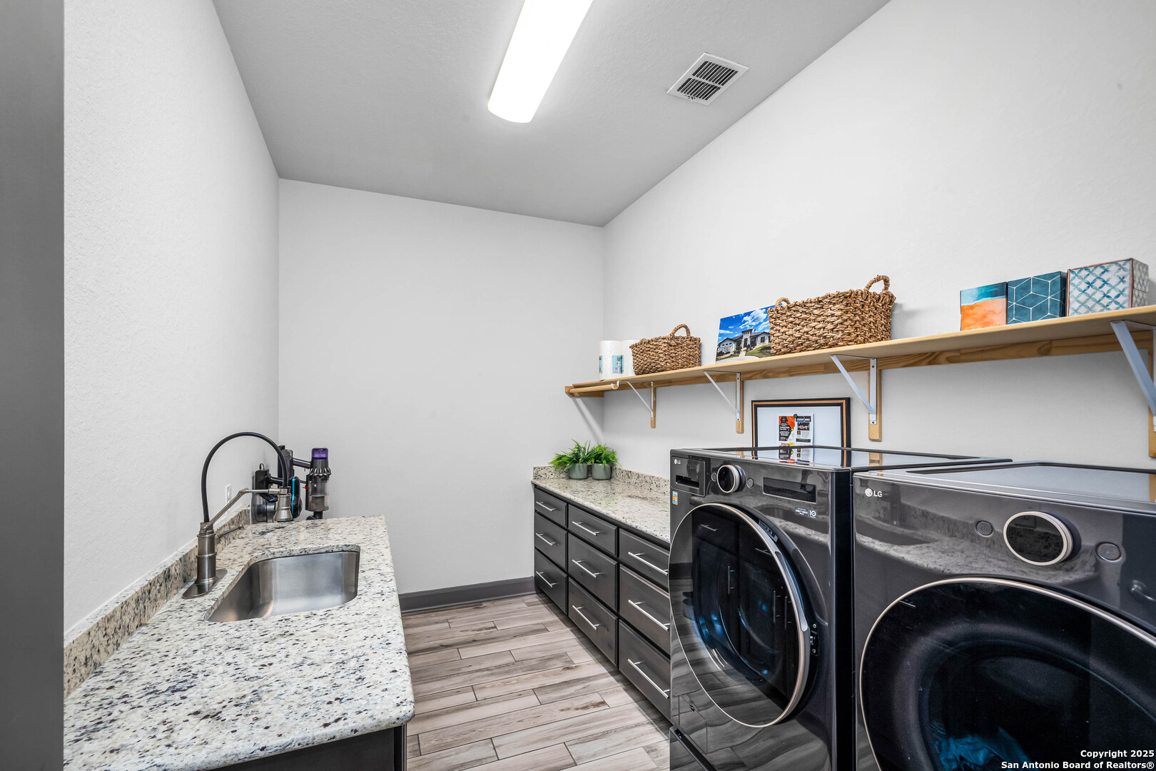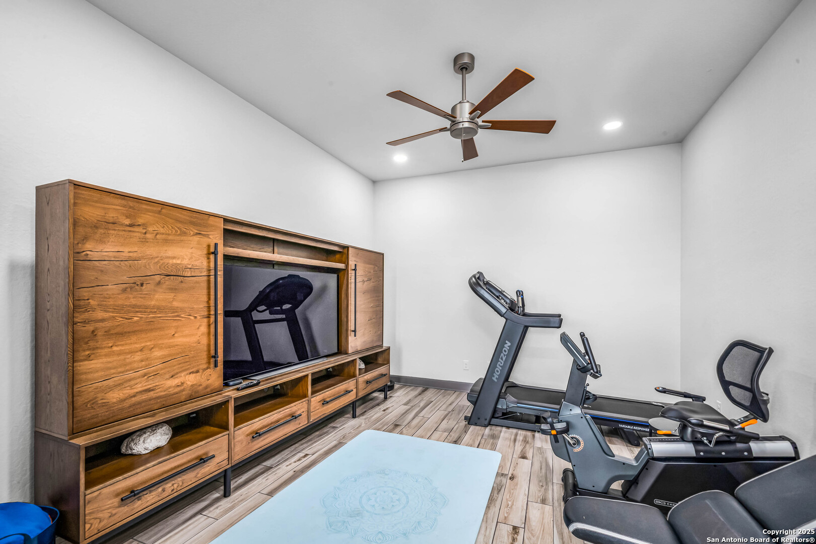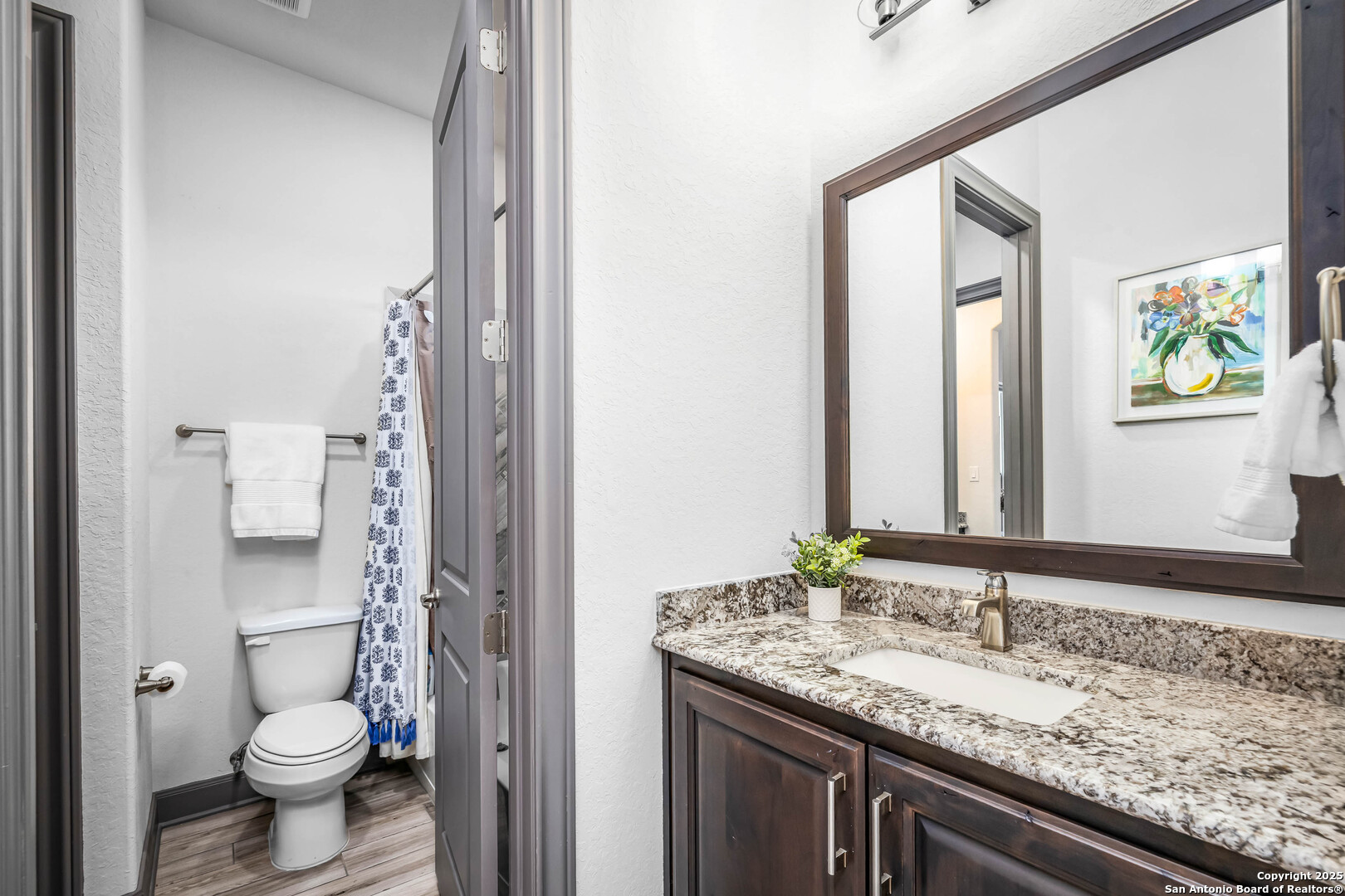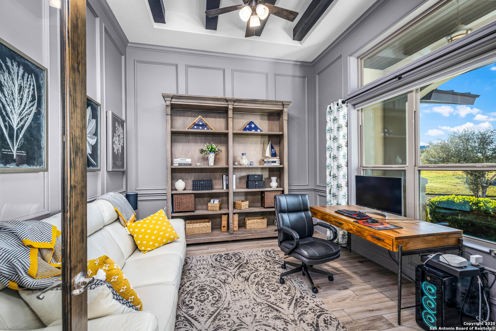 Built by Vintage Estates Luxury Home Builder, this exquisite Hill Country estate redefines refined living in the prestigious Canyon Ranch gated section of Vintage Oaks. Situated on over an acre at the end of a secluded cul-de-sac, the property captures breathtaking panoramic views overlooking the 4,000+ acre Stahlman Ranch. From the circular driveway to the soaring custom 8-foot iron entry doors, every detail of this 4,255-square-foot masterpiece reflects exceptional craftsmanship and timeless design. Inside, elegance meets livability with whole-house tile flooring, custom alder cabinetry, and designer finishes throughout. The heart of the home is an entertainer's dream kitchen, featuring enormous double granite islands, high-end Thermador and Bosch appliances, double ovens, and a professional-grade vent hood. A reverse osmosis system and quartz bathroom counters underscore the home's thoughtful attention to luxury and convenience. The eat-in kitchen seamlessly connects to a separate formal dining room, while the bonus room, media room, and wood-paneled office offer flexible spaces for work, play, and relaxation. A built-in bar with leathered granite countertop adds a touch of sophistication, perfect for hosting gatherings in style. The primary suite is a serene retreat, boasting electric blinds, spa-like finishes, and private access to an outdoor shower-a rare feature that enhances the connection between indoor comfort and outdoor tranquility. Step outside through one of the two enormous collapsible screen doors, and you'll find an outdoor living oasis designed for both everyday enjoyment and unforgettable entertaining. The infinity-edge heated pool with in-pool spa, floor cleaning system, and swim-up bar invites you to relax against the backdrop of stunning Hill Country sunsets. Surrounding it, a travertine pool deck, tiled porch and patio, and a leathered granite outdoor kitchen create a resort-style environment ideal for gatherings large or small. The outdoor fire pit offers a cozy space for starlit evenings, while the fully fenced backyard ensures privacy and peace. Every structural and technological upgrade has been carefully considered for performance, durability, and efficiency. The polyaspartic garage floor, new insulated garage doors, and standing seam metal roof (Cat 4 rated) combine longevity with style. Lightning rods, whole-house gutters, and two tankless gas hot water heaters add practical resilience. The 4 Eero Wi-Fi routers ensure complete coverage across the home, while the two gas fireplaces-one indoors and one outdoors-enhance both comfort and ambiance. A testament to modern sustainability, this home features two Tesla Powerwall 3 systems paired with 40 solar panels, each panel producing 420 watts for a total 16.8 kW system. Together, they provide 27 kW of backup power, offering energy independence and peace of mind. Combined with energy-efficient systems throughout, this estate exemplifies forward-thinking design that's as environmentally conscious as it is luxurious. Every element-from the architectural detailing to the Hill Country vistas-has been thoughtfully curated to deliver an unmatched living experience. Sophisticated yet inviting, this residence embodies the perfect balance of innovation, comfort, and natural beauty. It's not just a home-it's a statement of enduring craftsmanship and effortless Hill Country elegance.
