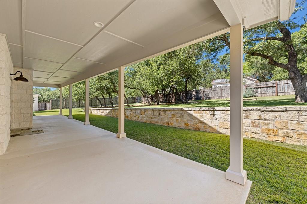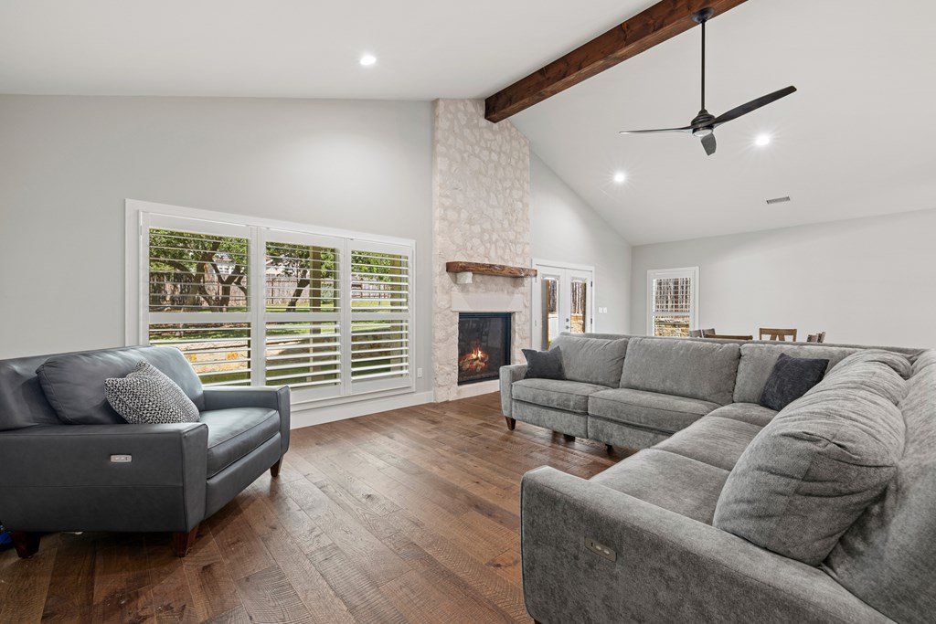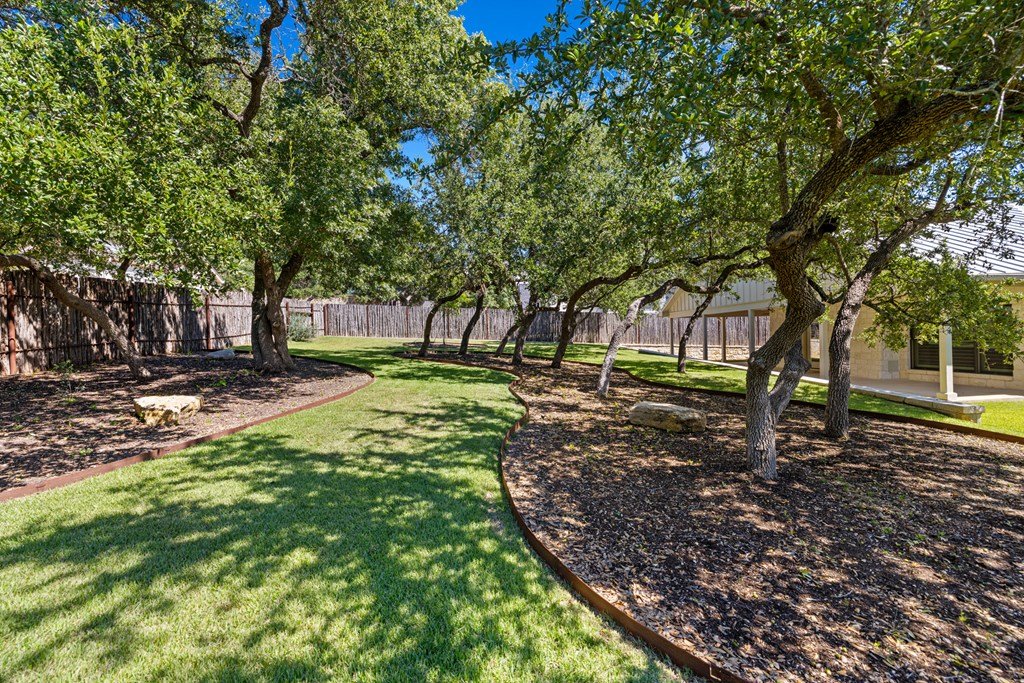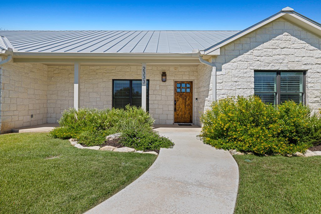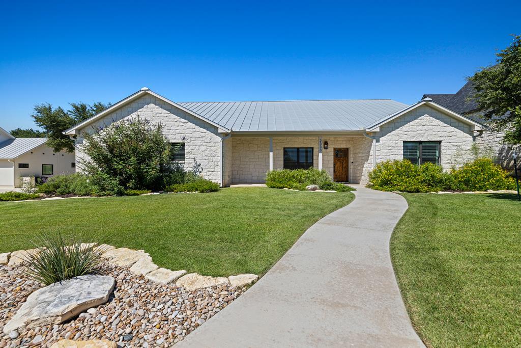Custom, one-owner,4 bed, 2 bath home whose builder is local craftsman. High quality appointments were achieved in all aspects of home. Features in this open-floorplan design are wood floors, with exception of tile in baths & laundry; Each room's lighting fixtures, faucets, hardware were hand-selected; Kitchen has substantial 11' seamless quartzite island/breakfast bar, ‘Kitchen Aid' stainless steel appliances including gas range; Light grey quartzite counters are in kitchen, baths, laundry; stone fireplace is centerpiece of great-room with remote operated gas logs, mesquite mantel (locally crafted); 3” plantation shutters; handicap-accessible features include wide sidewalk & minimal steps in/out of home; 2 car, attached garage has inside storage room. Home is stone veneer with metal roof. Grounds are beautifully landscaped. L-shaped, wide, covered patio has roomy area for entertaining. This overlooks your private, peaceful, terraced backyard with stone retaining wall, numerous live oak & red oak trees. Backyard private ambiance is enhanced with tight-screened, cedar post fencing. This is a fabulous Fredericksburg location in Stone Ridge on quiet, secondary neighborhood street.