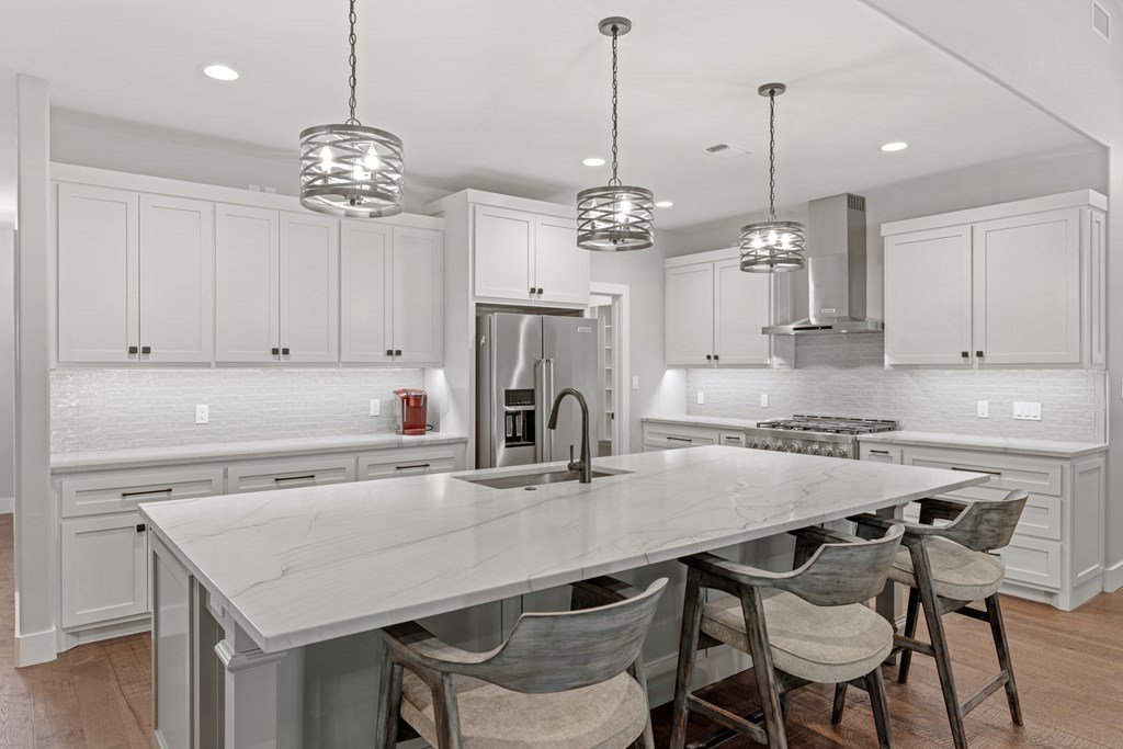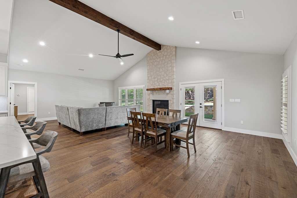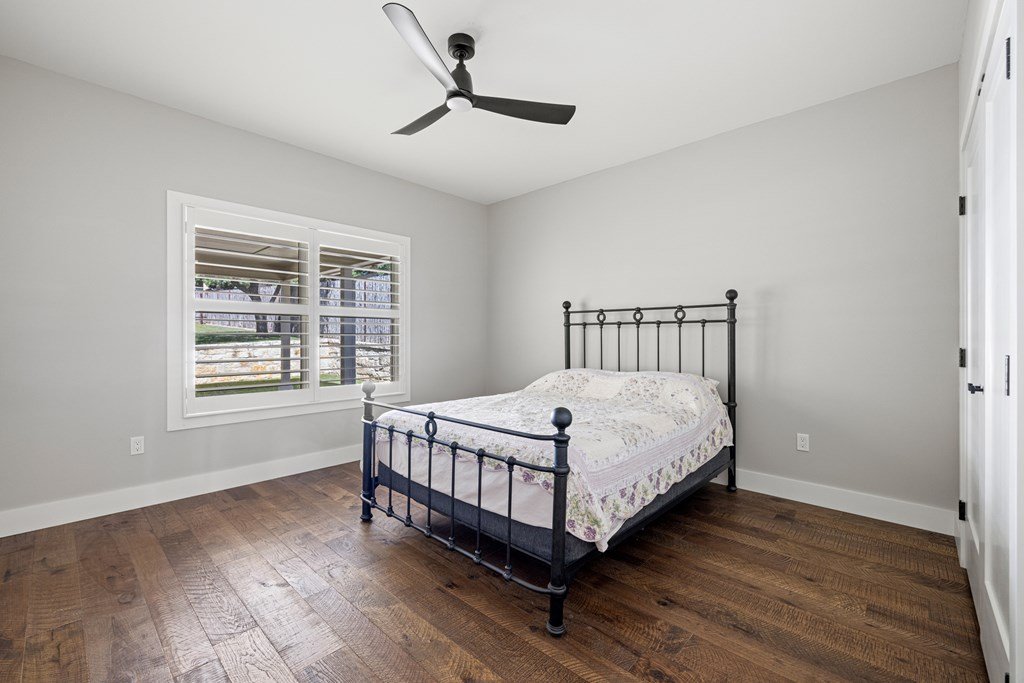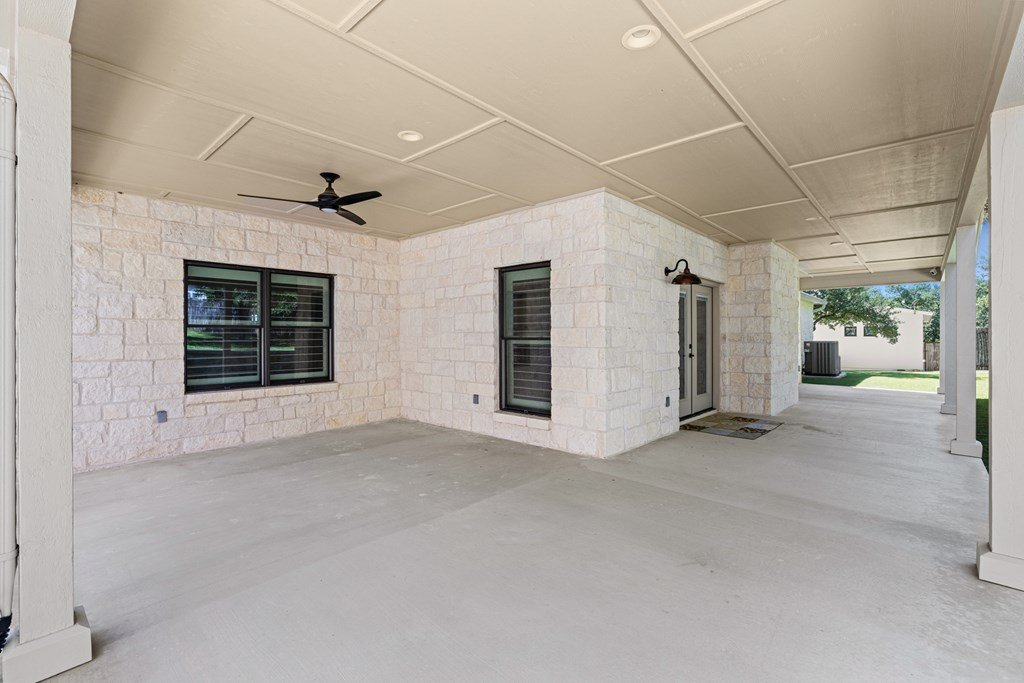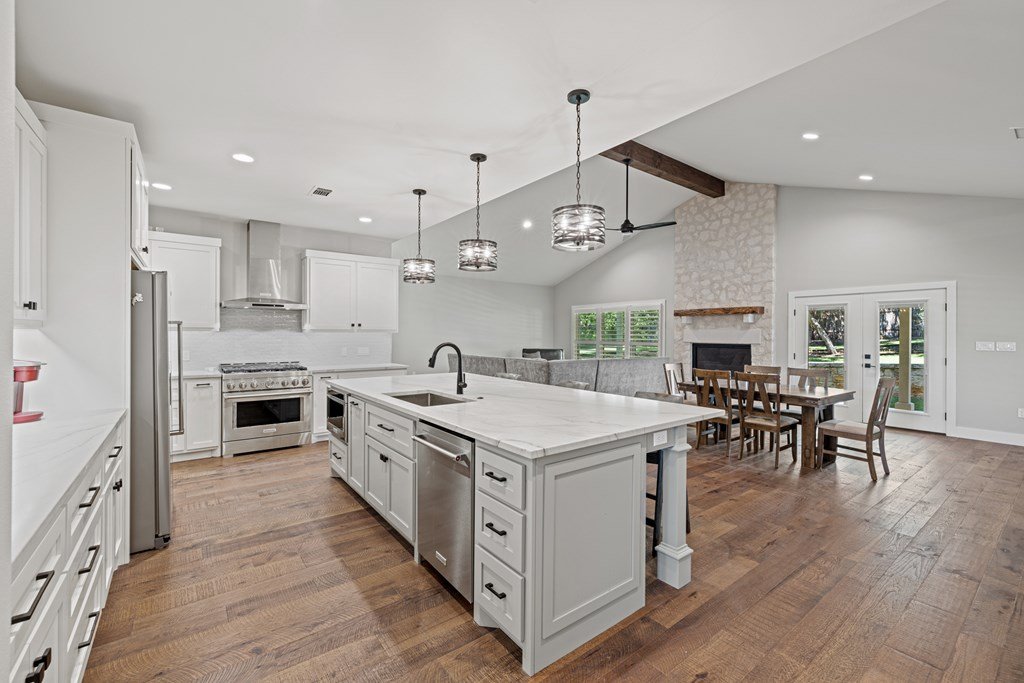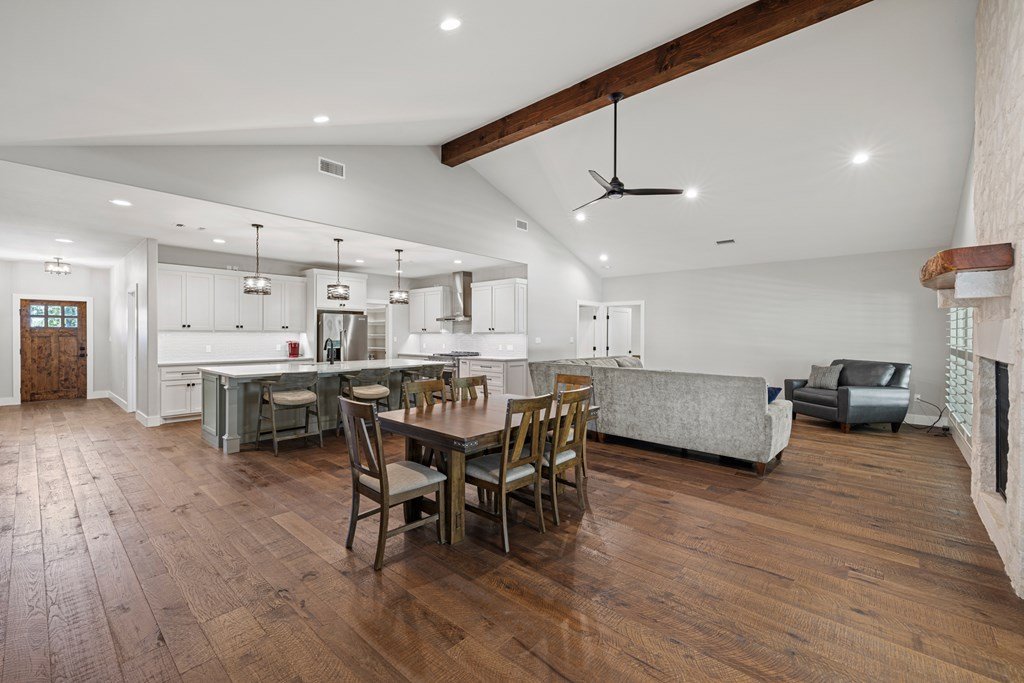 Custom, one-owner,4 bed, 2 bath home whose builder is local craftsman. High quality appointments were achieved in all aspects of home. Features in this open-floorplan design are wood floors, with exception of tile in baths & laundry; Each room's lighting fixtures, faucets, hardware were hand-selected; Kitchen has substantial 11' seamless quartzite island/breakfast bar, ‘Kitchen Aid' stainless steel appliances including gas range; Light grey quartzite counters are in kitchen, baths, laundry; stone fireplace is centerpiece of great-room with remote operated gas logs, mesquite mantel (locally crafted); 3” plantation shutters; handicap-accessible features include wide sidewalk & minimal steps in/out of home; 2 car, attached garage has inside storage room. Home is stone veneer with metal roof. Grounds are beautifully landscaped. L-shaped, wide, covered patio has roomy area for entertaining. This overlooks your private, peaceful, terraced backyard with stone retaining wall, numerous live oak & red oak trees. Backyard private ambiance is enhanced with tight-screened, cedar post fencing. This is a fabulous Fredericksburg location in Stone Ridge on quiet, secondary neighborhood street.