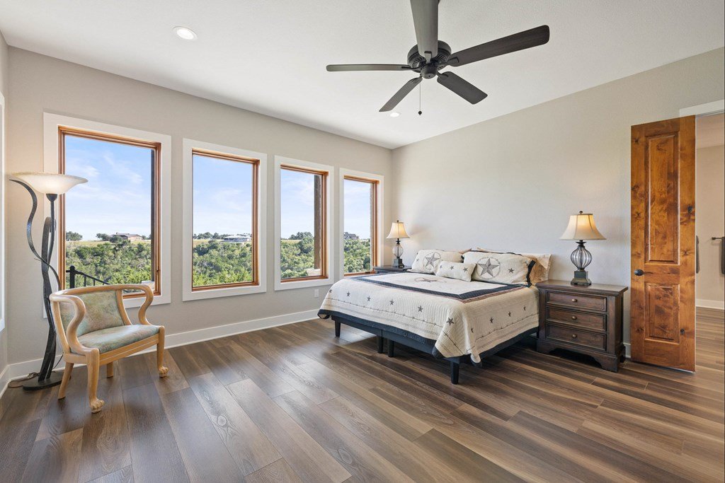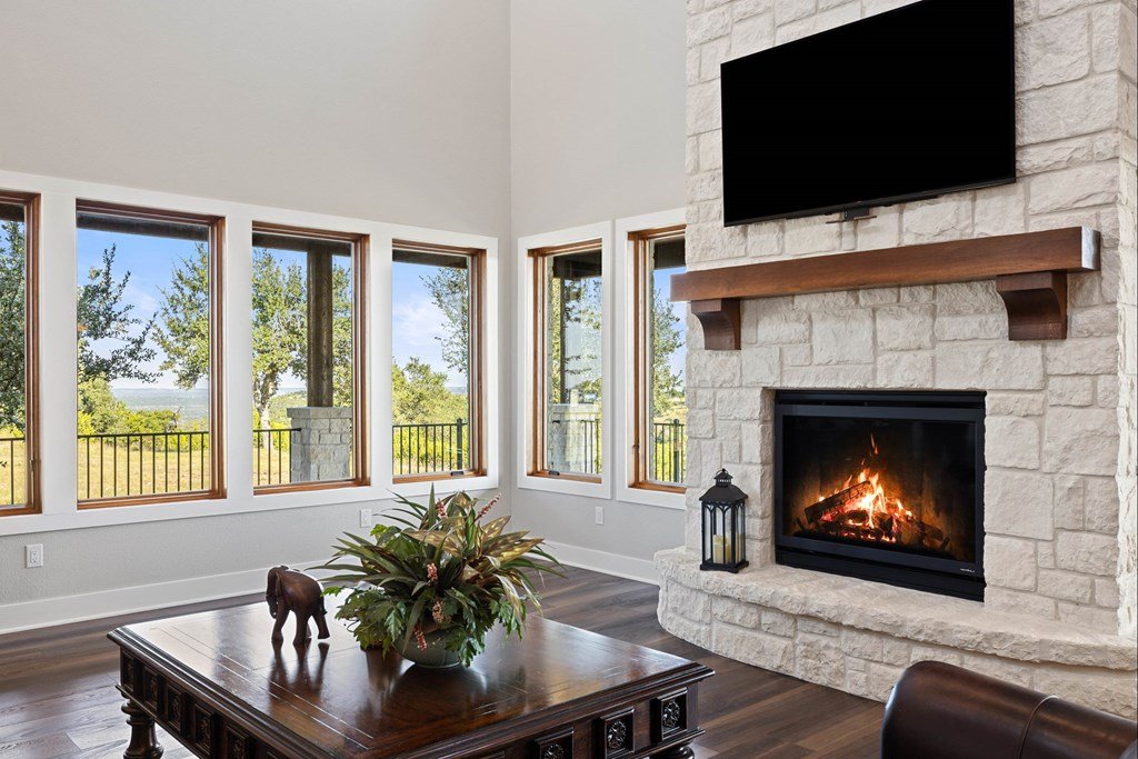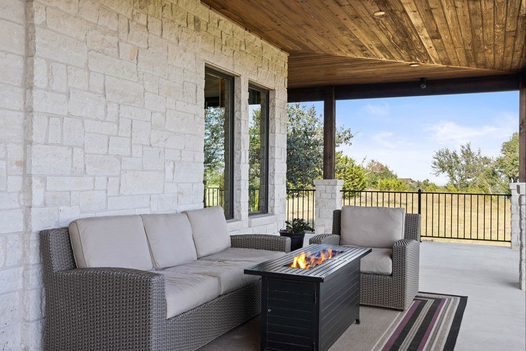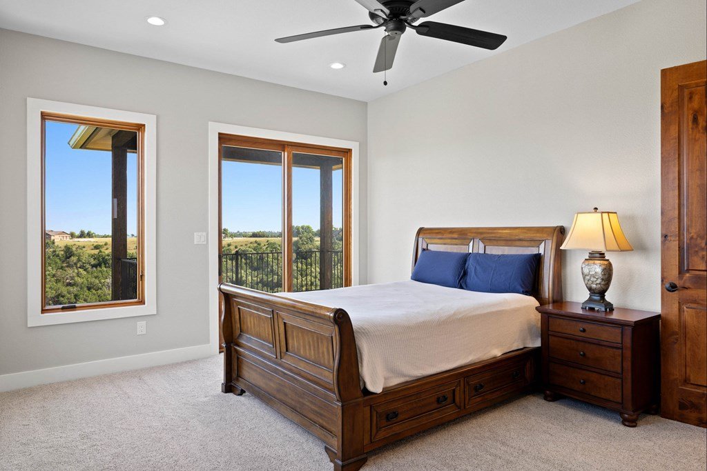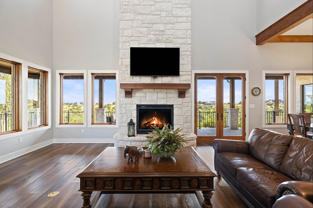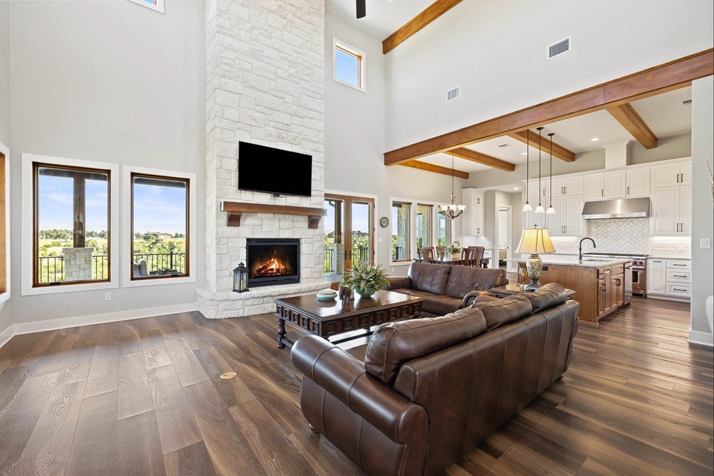 Experience refined Hill Country living on this private 5.23 acre retreat in the prestigious Ranches of Brushy Top. Perfectly positioned on a scenic hillside, this recently constructed 3,436 square foot residence blends elegant design with the natural beauty of its surroundings. Step inside to soaring ceilings, luminous oversized windows, and long-range views that fill every room with light. The chef's kitchen is a true centerpiece, boasting beamed ceilings, built-in appliances, a generous walk-in pantry, and an expansive wet bar. The spacious living room, anchored by a striking stone fireplace, offers a warm yet sophisticated setting for gathering. The thoughtful floorplan includes dual primary suites—one on each level—each with luxurious baths, walk-in closets, and private retreats, including an upper-level suite with a covered deck. Impeccable hardwood floors flow throughout the main level, complemented by a home office, large laundry room, and seamless access to outdoor living spaces. A wraparound porch and covered entertaining area invite you to savor the serene Hill Country backdrop. Additional amenities include a 3-car garage, an extra 2-bay garage/workshop, and a 30K rainwater collection system. Beyond the home, the Ranches of Brushy Top community offers an unmatched lifestyle within its 2,000 acre high-fenced preserve. Residents enjoy a gated entrance, two stocked lakes for fishing, swimming, and kayaking, plus miles of scenic trails for horseback riding, hiking, or UTV adventures. The ranch is home to native and exotic wildlife including elk, blackbuck, sika, and oryx, offering a one-of-a-kind living environment. With 1-D-1 Ag exemption, no city taxes, and low association fees, this property pairs luxury with practicality. Ideally located just minutes from historic downtown Blanco and the Blanco River, and an easy one-hour drive to both Austin and San Antonio, this is Hill Country living at its finest.