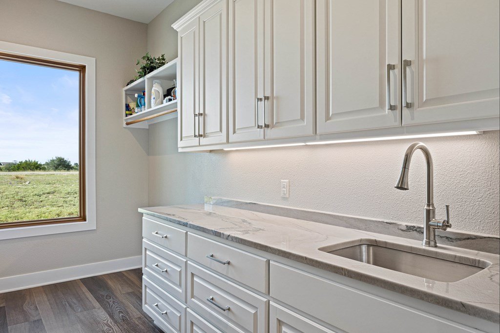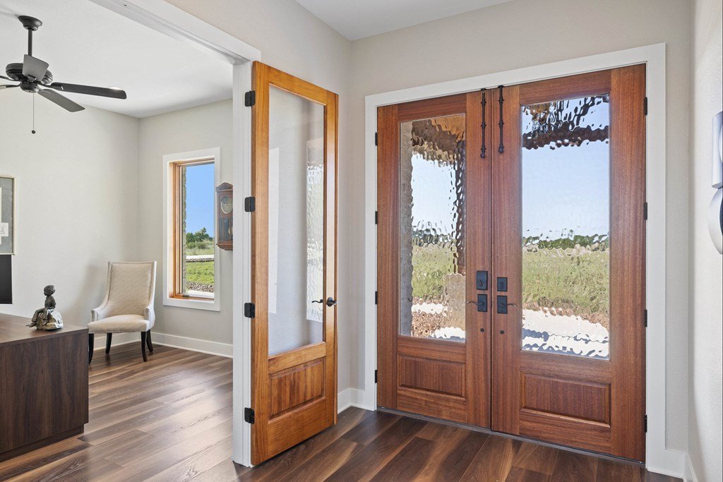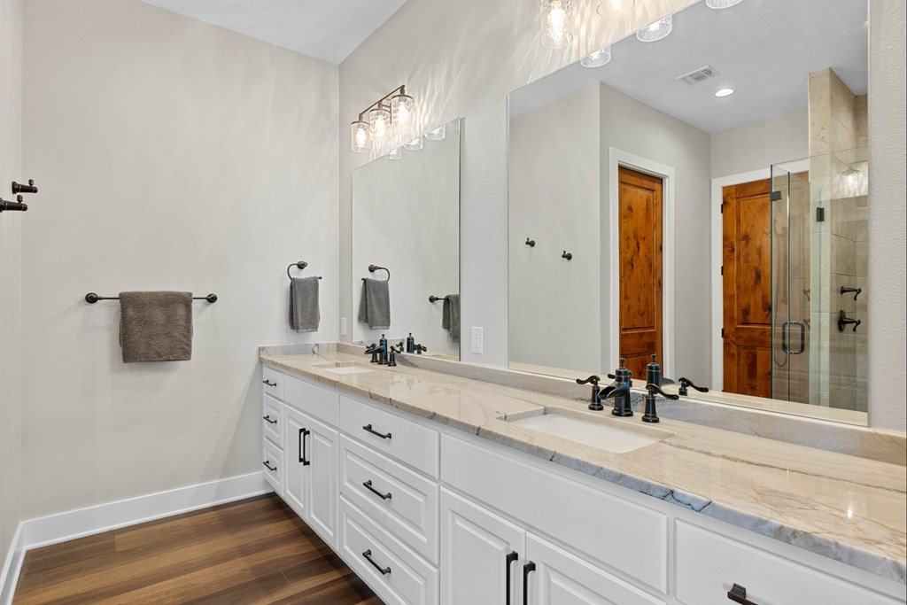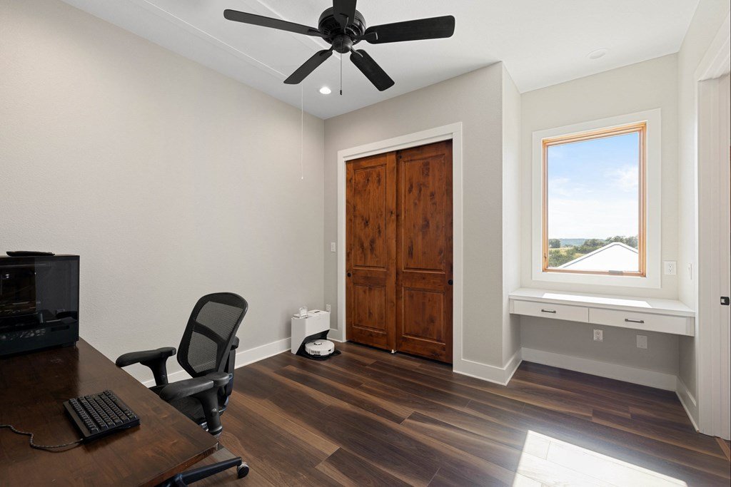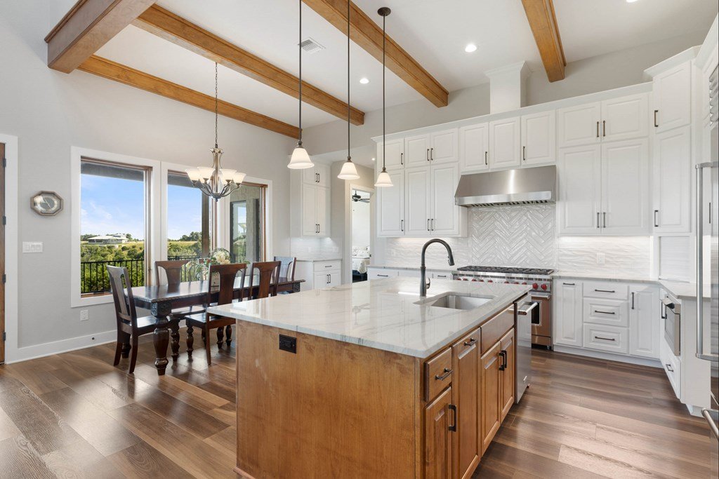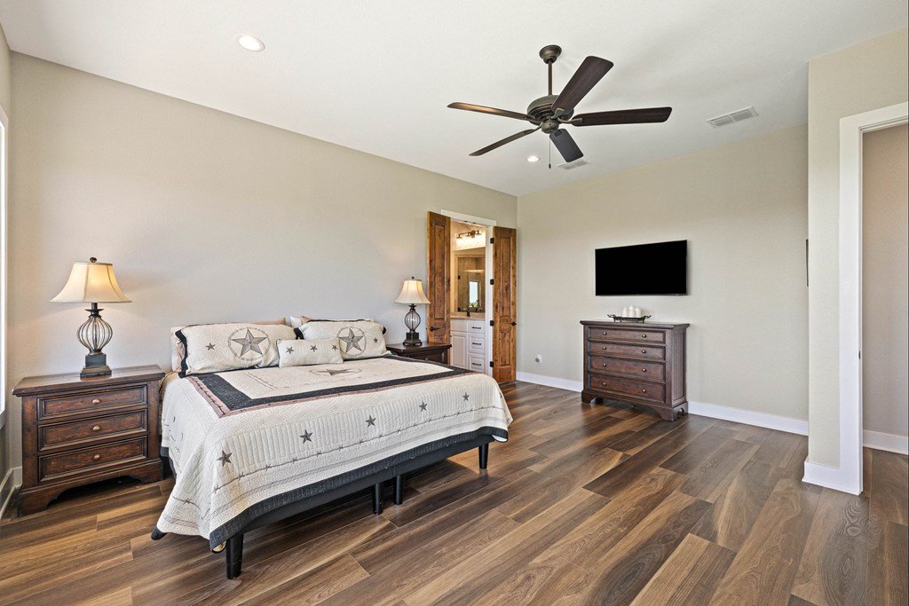 Experience refined Hill Country living on this private 5.23 acre retreat in the prestigious Ranches of Brushy Top. Perfectly positioned on a scenic hillside, this recently constructed 3,436 square foot residence blends elegant design with the natural beauty of its surroundings. Step inside to soaring ceilings, luminous oversized windows, and long-range views that fill every room with light. The chef's kitchen is a true centerpiece, boasting beamed ceilings, built-in appliances, a generous walk-in pantry, and an expansive wet bar. The spacious living room, anchored by a striking stone fireplace, offers a warm yet sophisticated setting for gathering. The thoughtful floorplan includes dual primary suites—one on each level—each with luxurious baths, walk-in closets, and private retreats, including an upper-level suite with a covered deck. Impeccable hardwood floors flow throughout the main level, complemented by a home office, large laundry room, and seamless access to outdoor living spaces. A wraparound porch and covered entertaining area invite you to savor the serene Hill Country backdrop. Additional amenities include a 3-car garage, an extra 2-bay garage/workshop, and a 30K rainwater collection system. Beyond the home, the Ranches of Brushy Top community offers an unmatched lifestyle within its 2,000 acre high-fenced preserve. Residents enjoy a gated entrance, two stocked lakes for fishing, swimming, and kayaking, plus miles of scenic trails for horseback riding, hiking, or UTV adventures. The ranch is home to native and exotic wildlife including elk, blackbuck, sika, and oryx, offering a one-of-a-kind living environment. With 1-D-1 Ag exemption, no city taxes, and low association fees, this property pairs luxury with practicality. Ideally located just minutes from historic downtown Blanco and the Blanco River, and an easy one-hour drive to both Austin and San Antonio, this is Hill Country living at its finest.