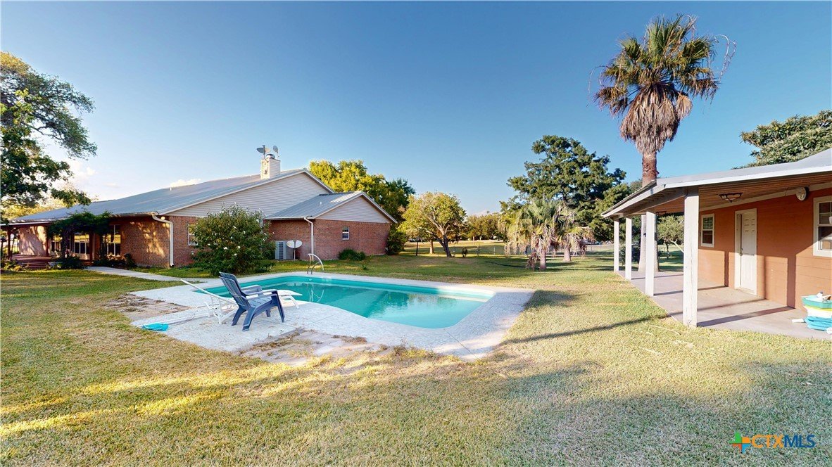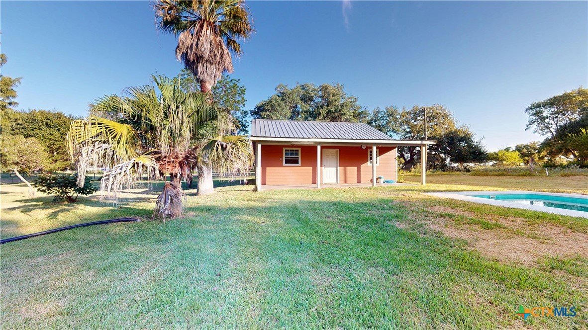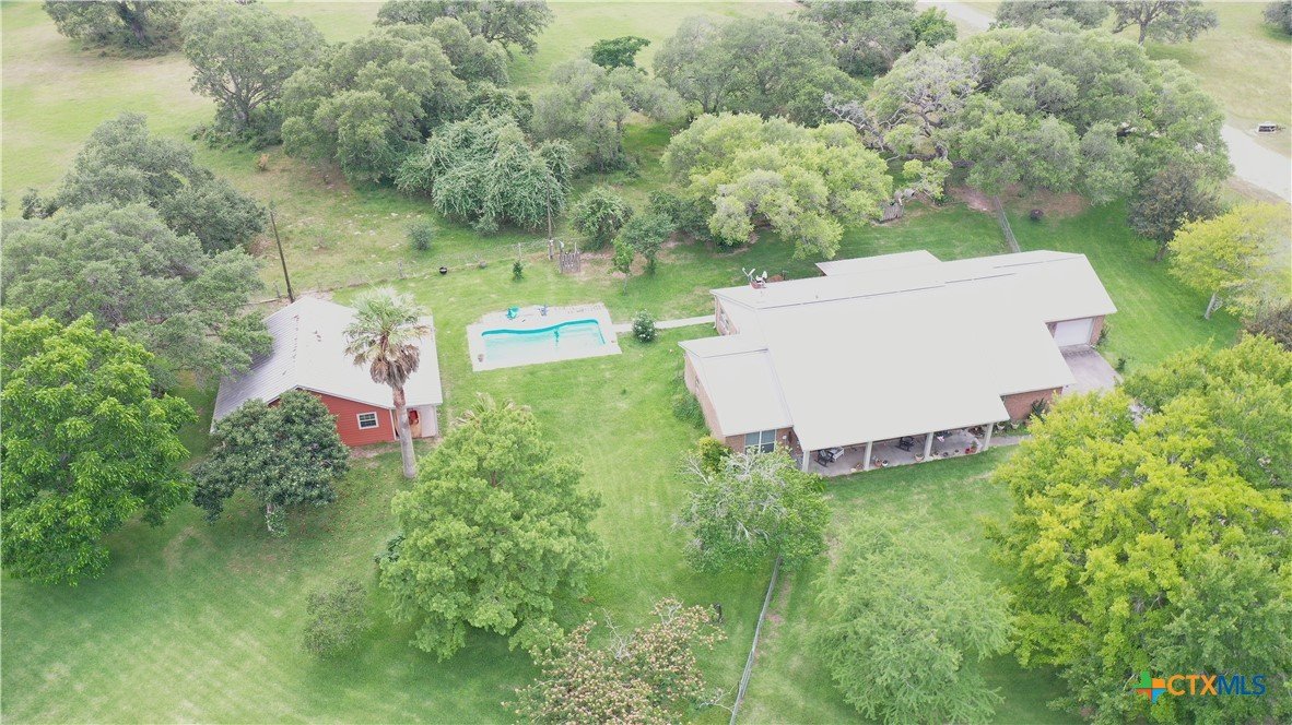Now offered at a lower price! Sprawling Country Retreat Near Coletto Creek Reservoir. Nestled on approximately 1.3 acres, this spacious 4-bedroom, 2.5-bathroom home offers the perfect blend of peaceful country living and modern comfort. Surrounded by oaks, cypress, and pecan trees, the property provides a serene, shaded setting ideal for relaxing or entertaining. Step inside to find an inviting open-concept layout featuring a cozy fireplace, built-in china cabinet, and custom bookshelves. The heart of the home is the open kitchen, complete with granite countertops, a center island, breakfast bar, and a generous walk-in pantry—perfect for any home chef. Enjoy the natural light in the large sunroom overlooking the backyard oasis. The private master suite includes two walk-in closets and built-in storage in both the bedroom and bath. The fourth bedroom, currently used as a home office, features built-in bookcases and flexible space for work or guests. Outdoors, enjoy a covered patio, sparkling pool, and a fully fenced yard with an irrigation system to maintain the lush landscaping. A detached 900 sq ft shop with its own bathroom provides endless possibilities—workshop, gym, or additional storage. Additional features include a two-car attached garage, newer AC and water heater, water softener, and plenty of storage throughout. This property is a rare find in a sought-after location near Coletto Creek Reservoir—offering space, comfort, and functionality in a peaceful country setting.