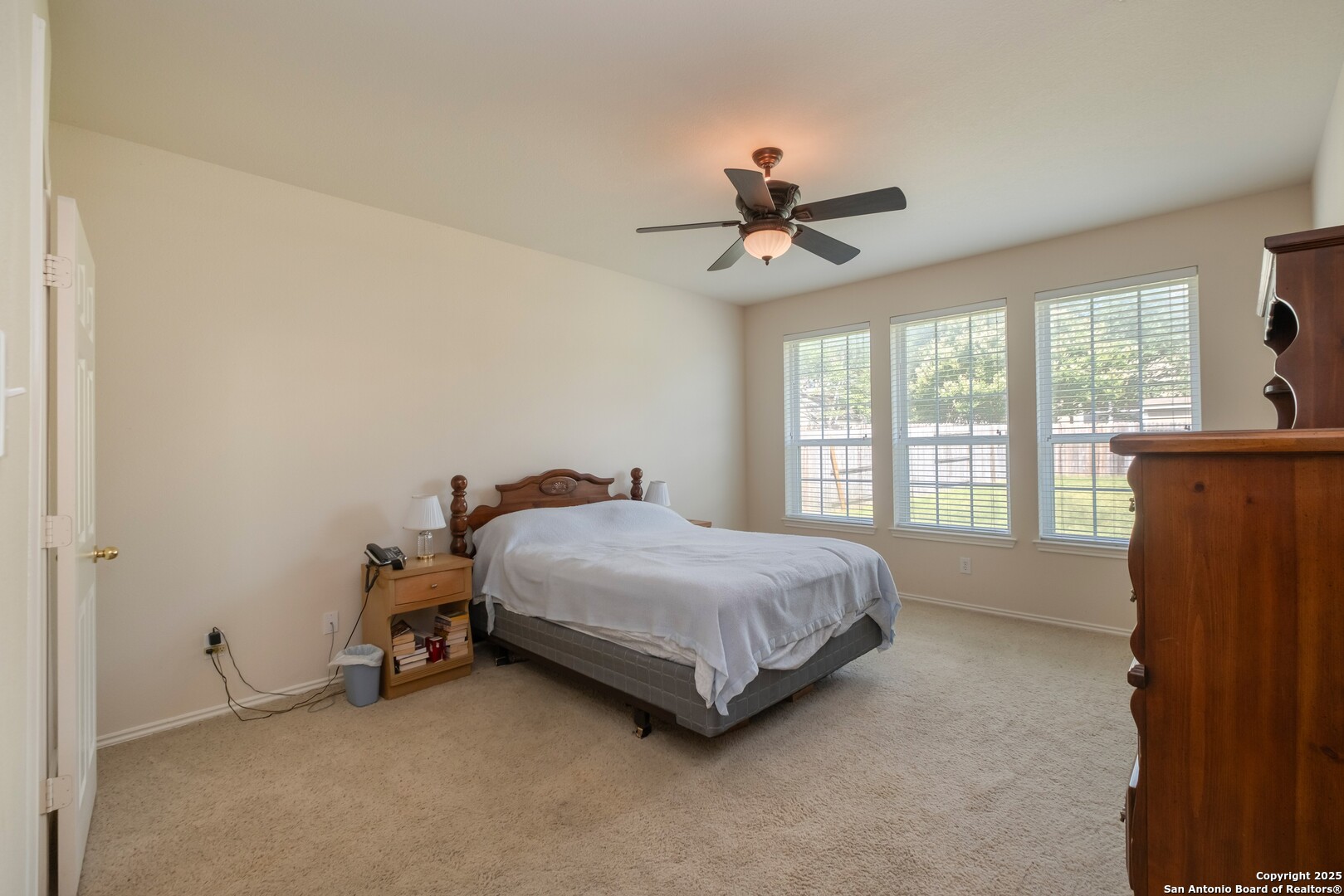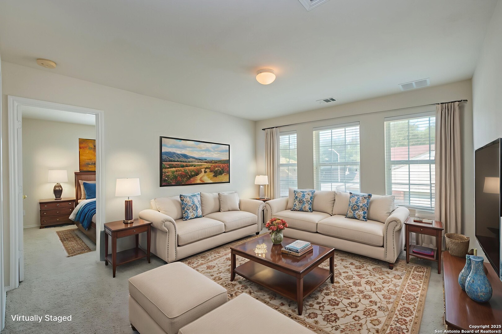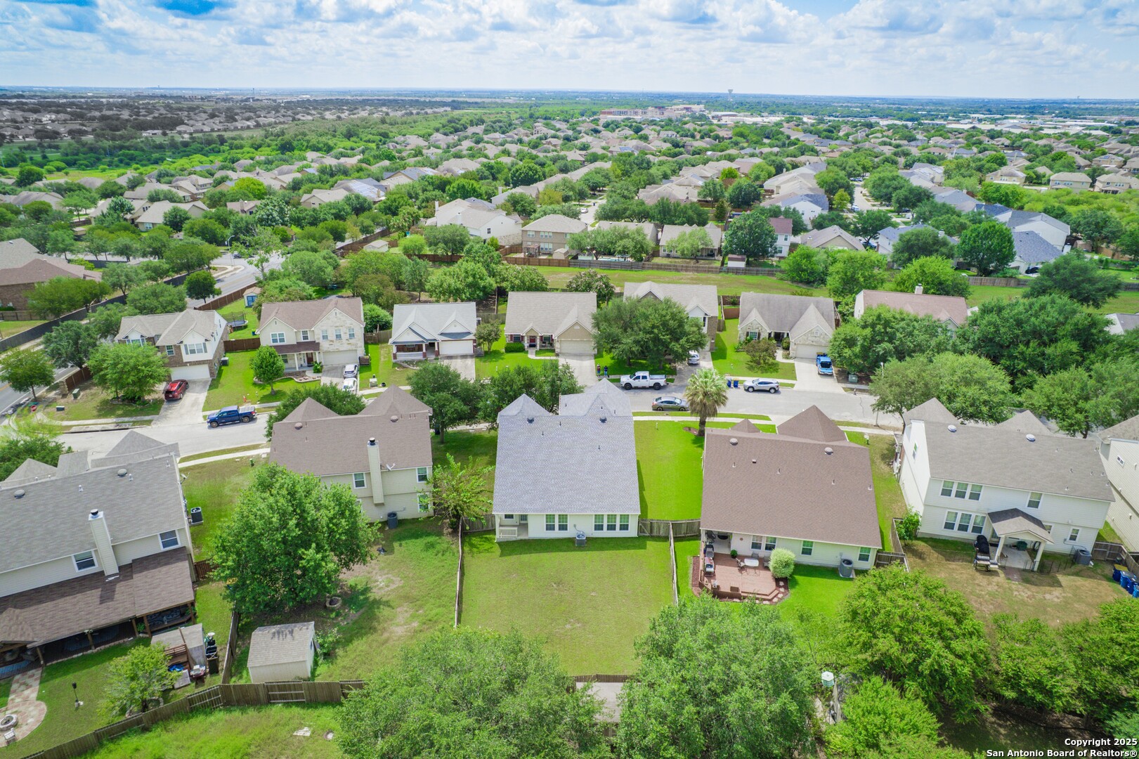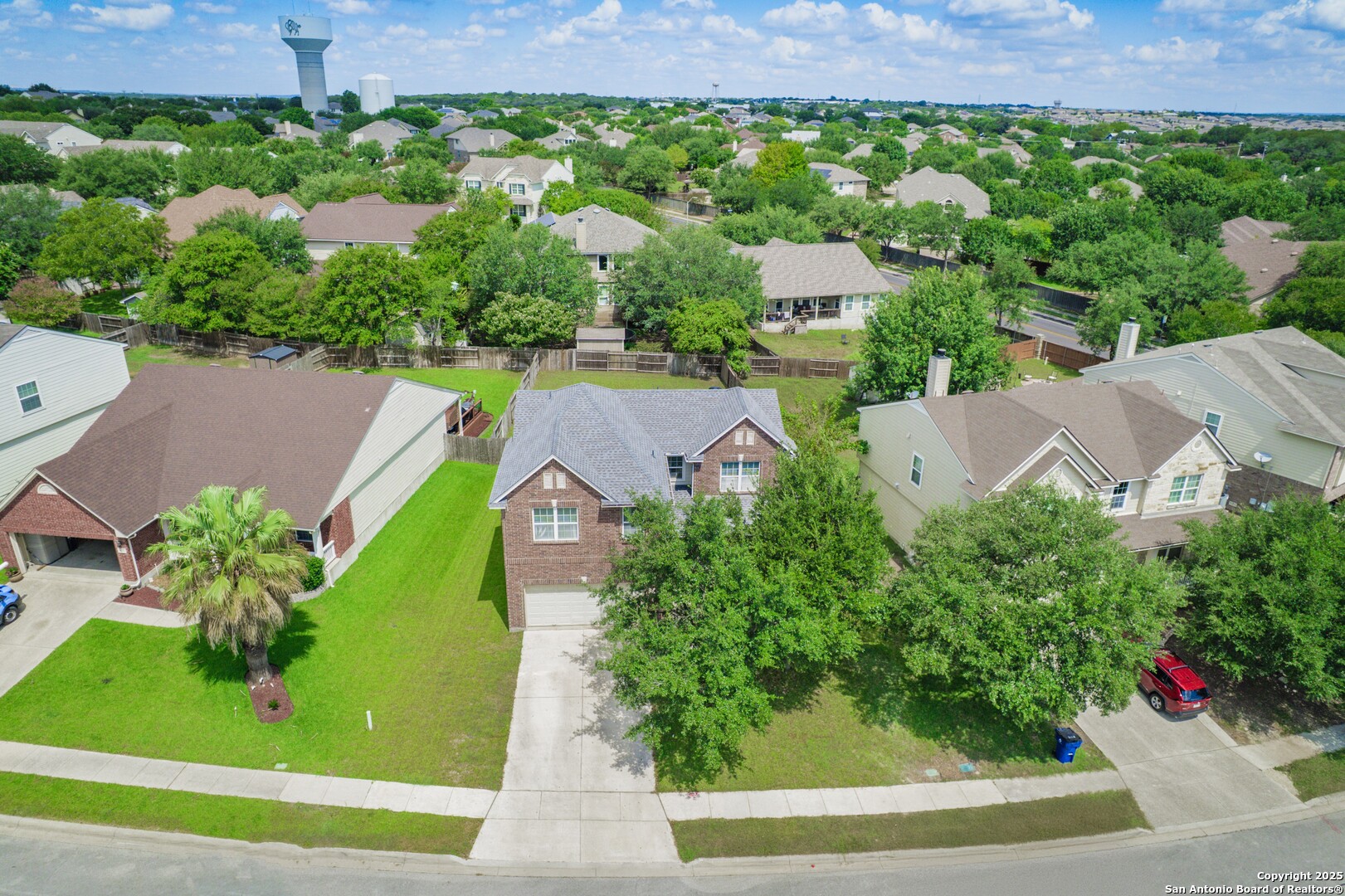This beautiful 2-story, 4-bedroom, 3.5-bath home offers 2,496 sq ft of living space on a 0.20-acre lot situated near the end of a cul-de-sac in the desirable Bentwood Ranch community. Ideally located just minutes from major retail options including Walmart and H-E-B, as well as J. Frank Dobie Junior High School, the home offers convenience, space, and comfort in one inviting package. The open floor plan seamlessly connects the main living area with the kitchen and breakfast nook, creating a welcoming space for everyday living and entertaining. The kitchen features a breakfast bar, an island, and ample cabinetry, along with tile flooring that continues through the foyer, hallway, and breakfast area. A separate formal dining room provides an additional eating space for special occasions. This home features two living areas: one on the main level and another upstairs, which serves as a bonus room, ideal for a media room, game room, or a flexible family space. There are also two primary bedrooms: one located downstairs with a walk-in closet and an ensuite bath featuring dual vanities, a garden tub, and a walk-in shower; and another upstairs with its own walk-in closet and an ensuite bath with a single vanity and walk-in shower. All bedrooms are carpeted for comfort. Additional updates include a new roof installed in 2024 and a new AC unit in 2023, both with transferable warranties. The water heater, located in the attic, was installed in 2016. Quarterly pest control has been regularly maintained, adding to the home's care and upkeep. The spacious backyard is fully enclosed with a wooden fence, offering privacy and room to enjoy outdoor activities. The attached two-car garage adds convenience, and the neighborhood offers access to a community pool, playground, sports courts, community mailboxes, curbs, and sidewalks. Please note that HOA dues are subject to change quarterly, and access to the pool and playground requires purchasing a fob from the HOA. This home offers a flexible layout and unbeatable access to community amenities and everyday essentials.