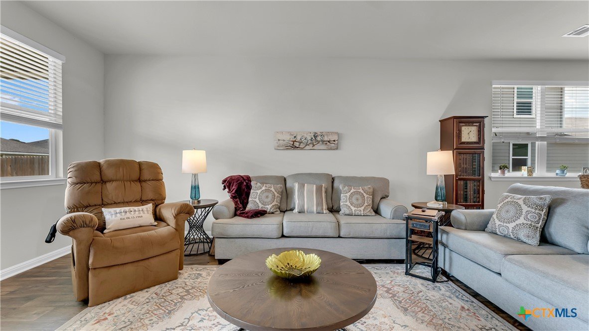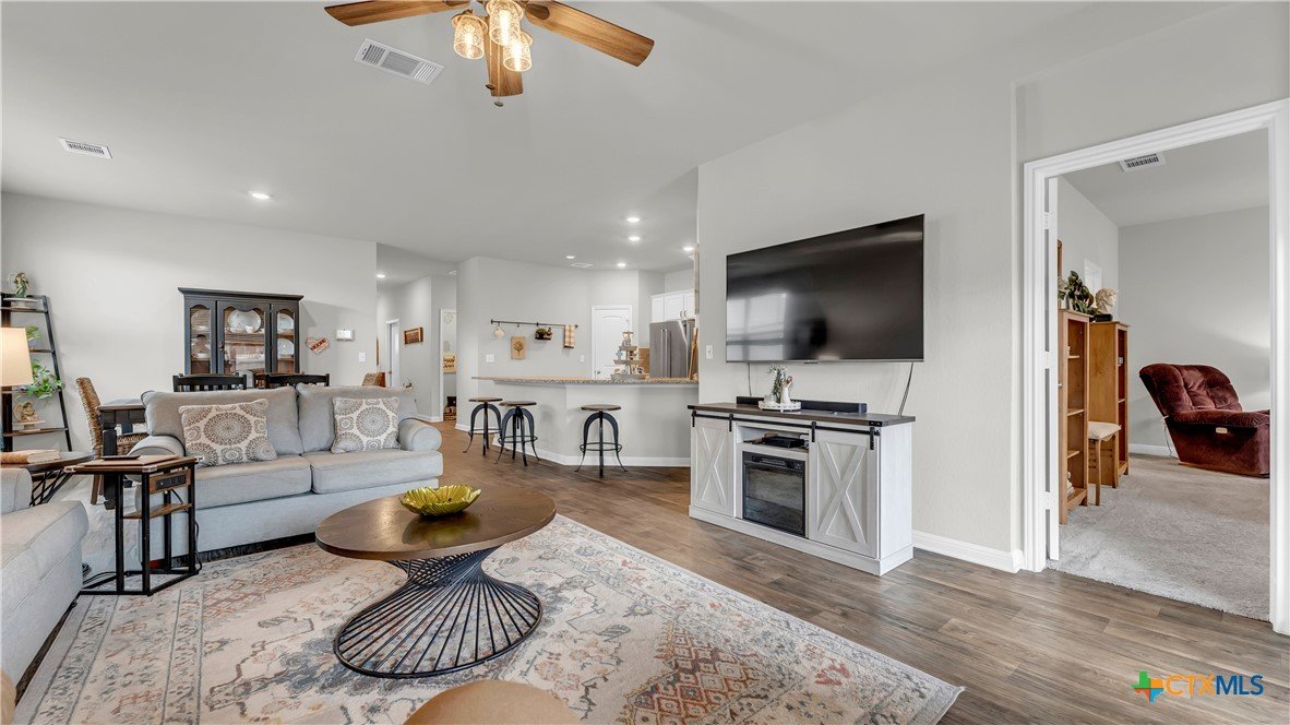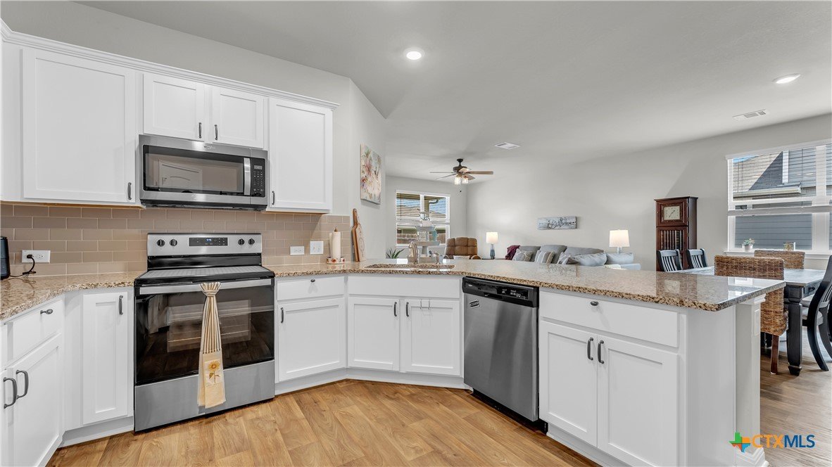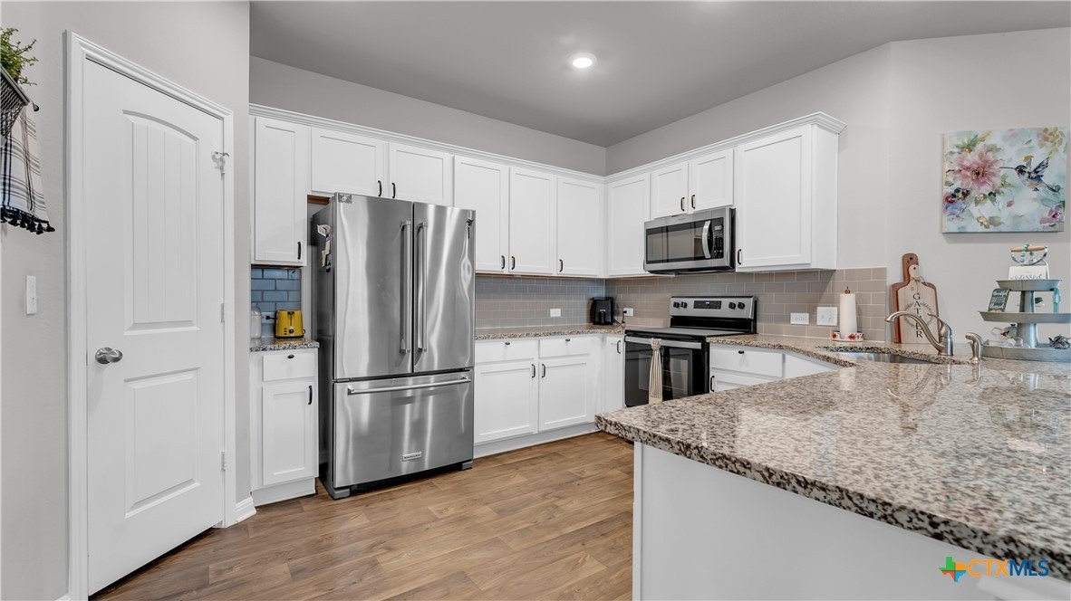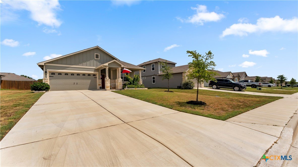 Built in 2021 by DR Horton, this beautiful home is located in the popular, family friendly Dove Meadows subdivision of Bertram. Inside, you’ll find granite countertops throughout, a kitchen with a long bar perfect for gathering and casual dining, and a spacious master suite featuring his-and-her walk-in closets and double vanities. The home offers comfortable carpet in the bedrooms and durable vinyl plank flooring in the main living areas. Enjoy outdoor living with covered front and back porches, a landscaped yard with irrigation in both the front and back, and a fenced, private backyard. Additional features include insulated windows, partial gutters, and the convenience of a washer, dryer, and refrigerator, all of which convey with the sale.