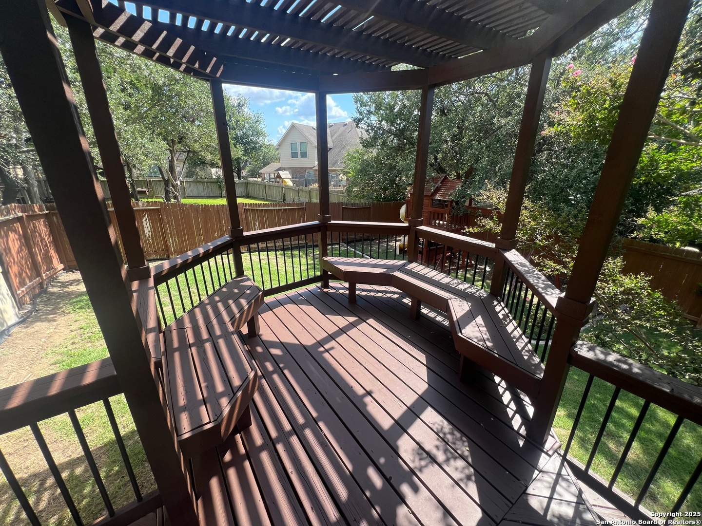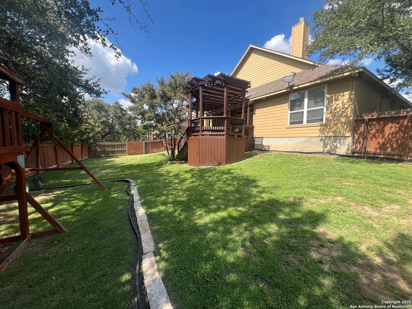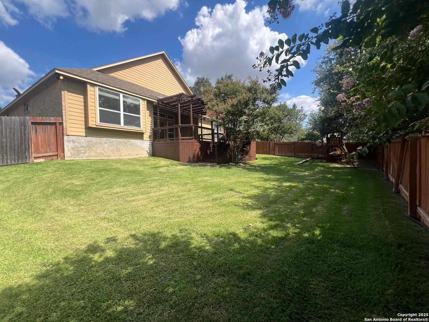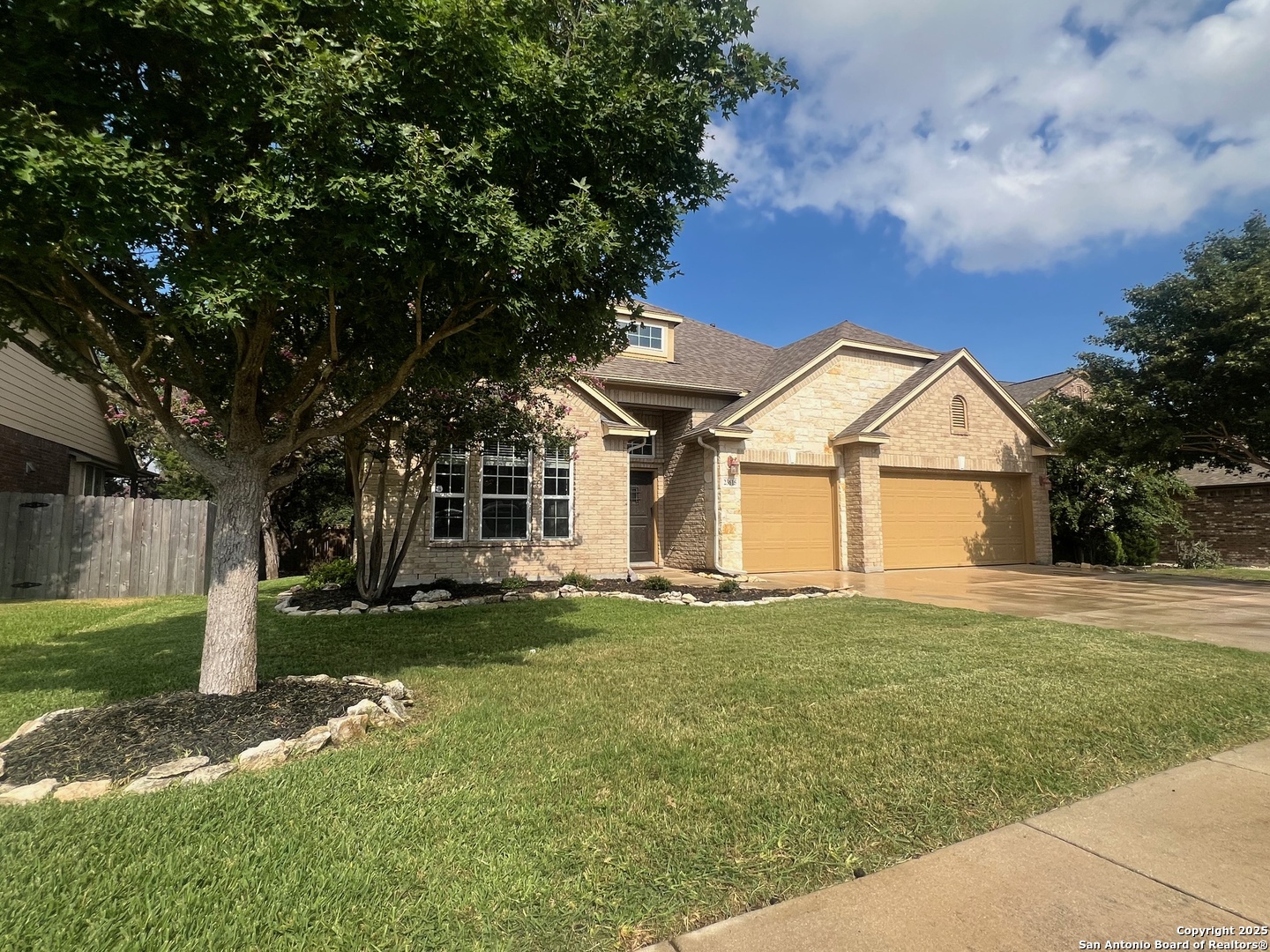 Beautiful Stone/Brick, 2592sqft one story, 4BR 3BA w/office, separate dinning rm, 3-car garage built in 2008 in gated community of Mountain Lodge. Brand new carpet through-out the home. GREAT location within the community across the street from the Pool, Sports court and playground. Awesome backyard with covered patio and large stained deck(Just stained). All yard maintenance included. Great curb appeal. Large kitchen w/upgraded granite tops, island and stainless-steel appliances including refrigerator. Washer, Dryer & Water softener included. NEISD schools.