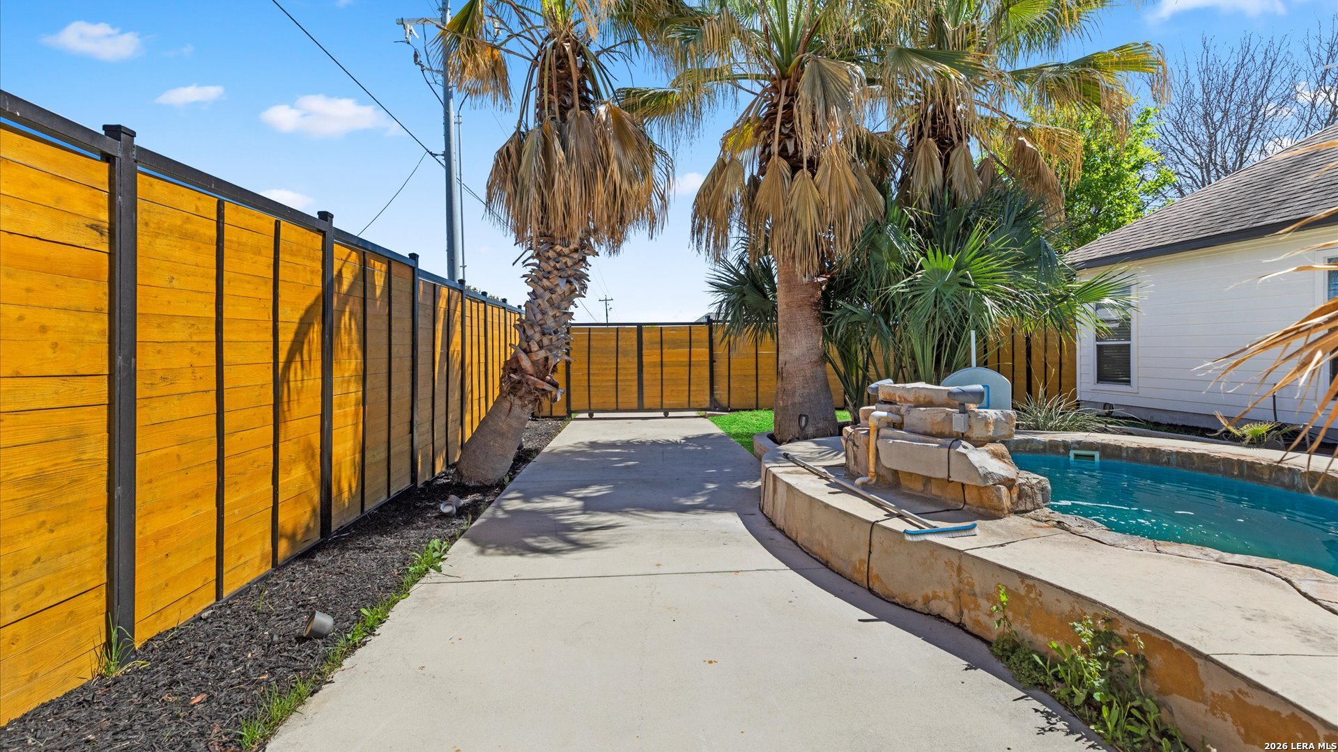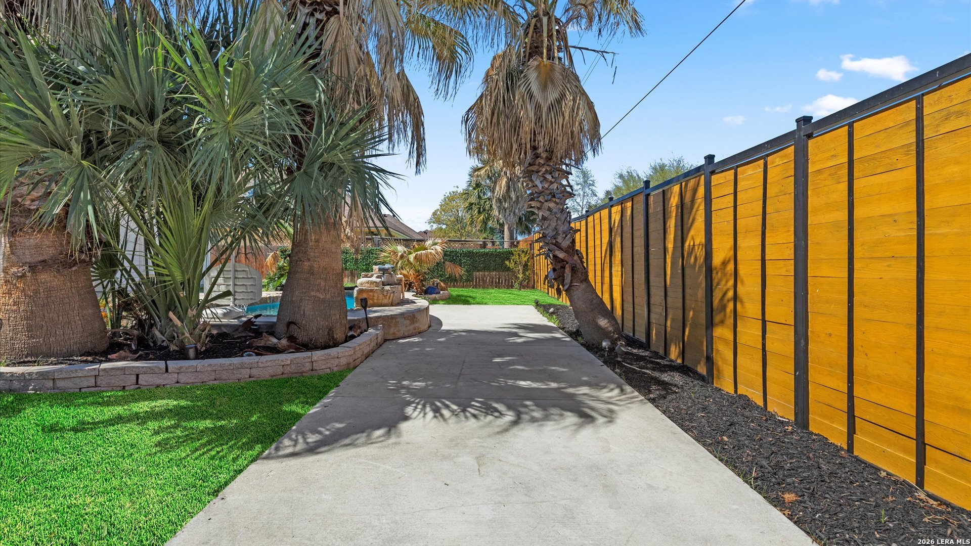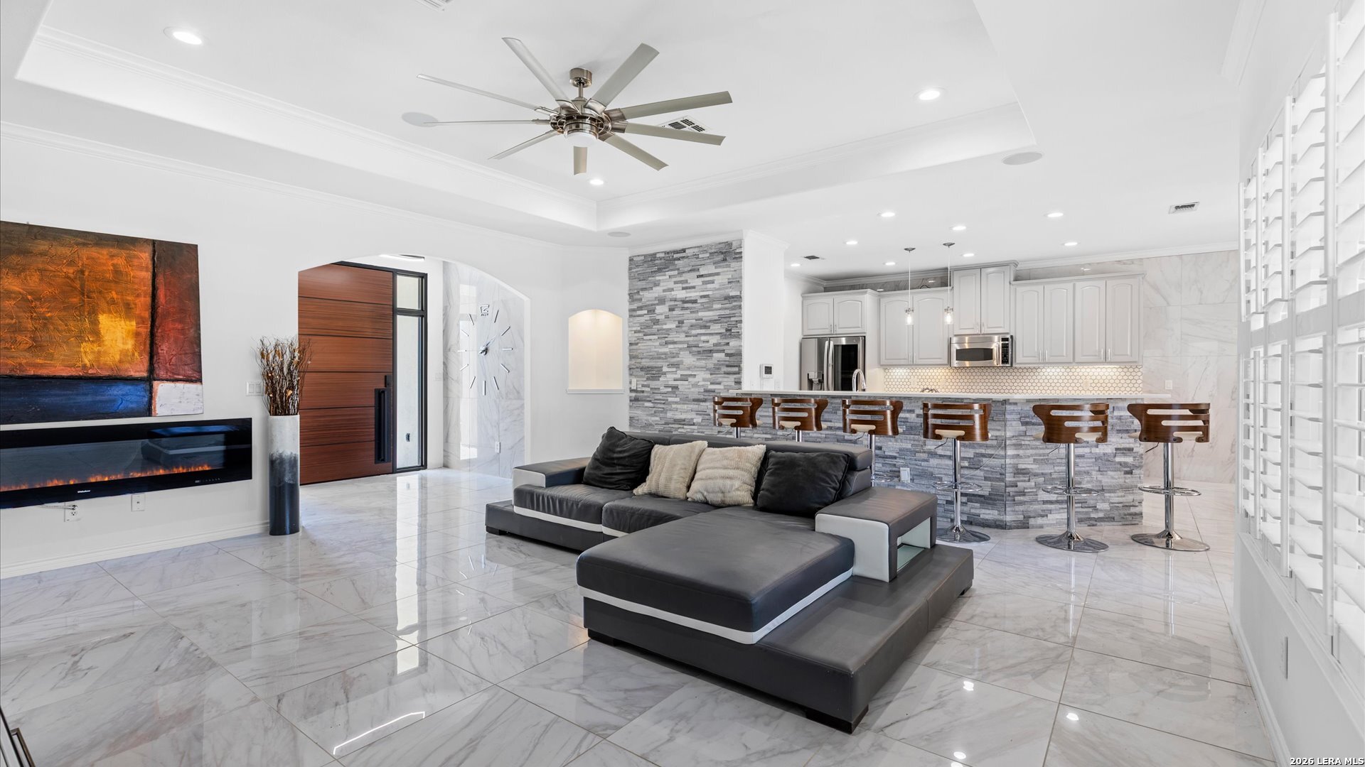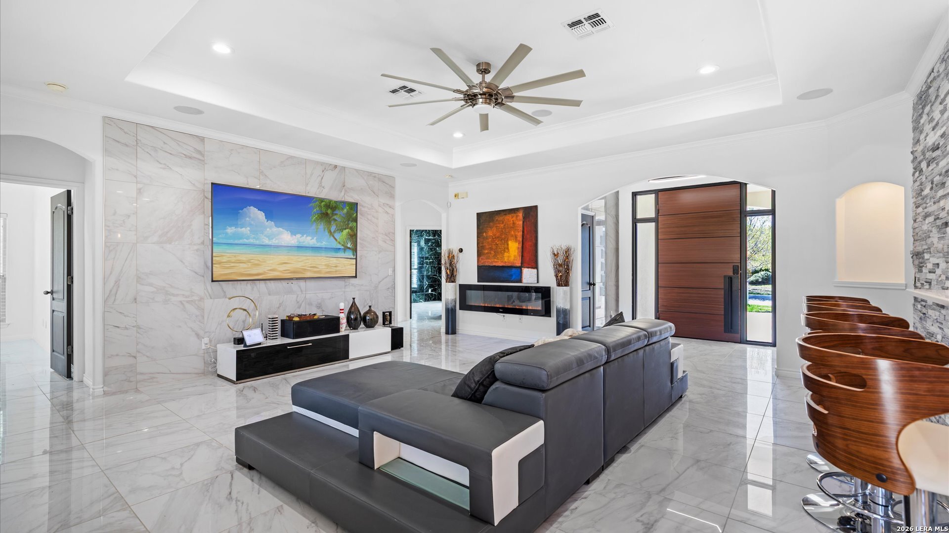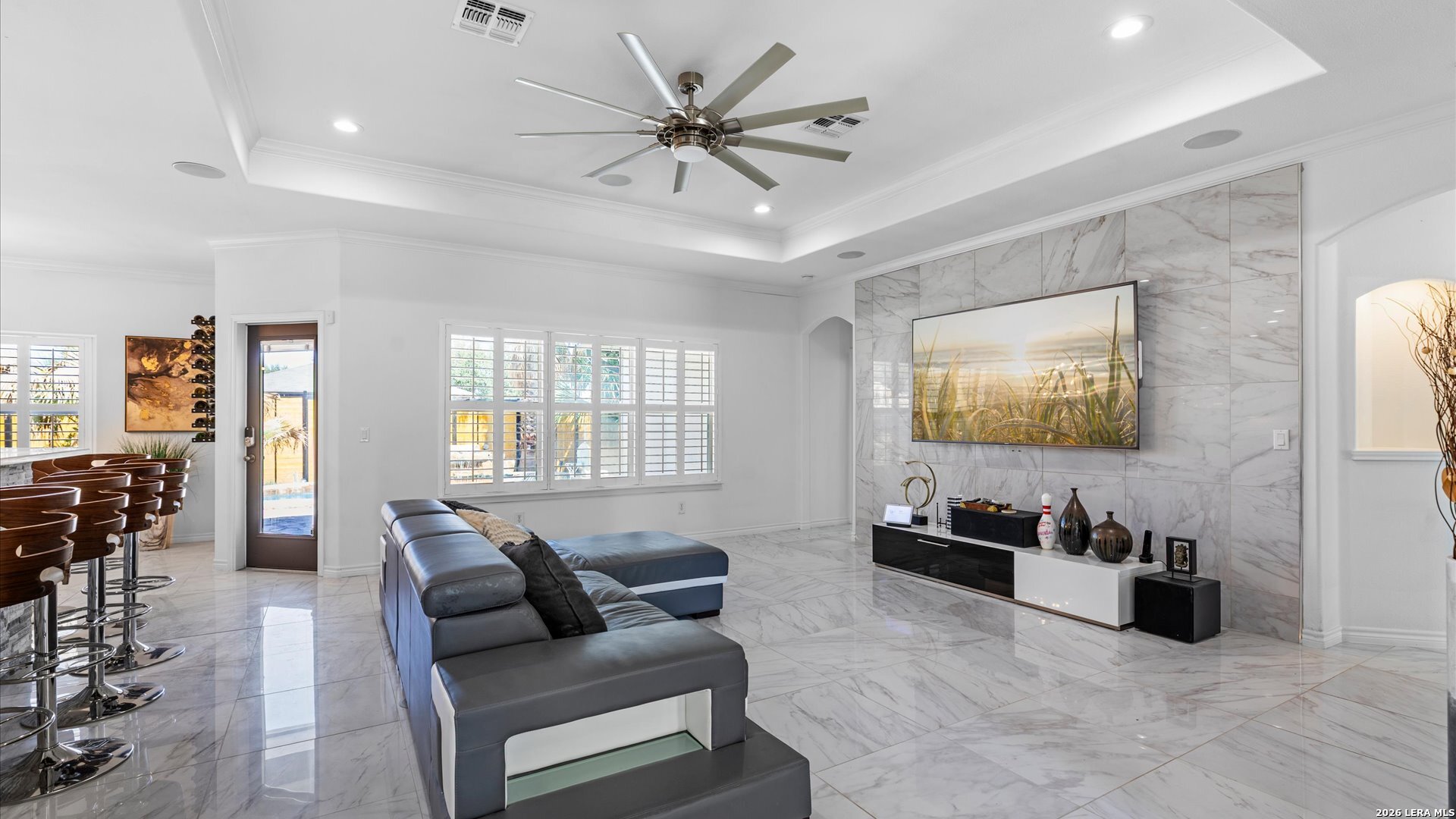 This stunning home makes an immediate impression with its white stucco exterior accented by bold charcoal details and a striking custom metal and wood entry door. Inside, the home showcases luxurious porcelain tile flooring throughout most of the home and dramatic tile accent walls, creating a sleek and sophisticated atmosphere. The living space is highlighted by beautiful stonework and an expansive breakfast bar, perfect for gathering and entertaining.Designed for an elevated lifestyle, the home includes a Sonos sound system throughout the interior and exterior, along with Dolby Atmos surround sound in the living room and media room, delivering a true theater-quality experience. The backyard offers a resort-style retreat with a sparkling pool, mature palms, and decorative fencing that enhances the outdoor living space. A side entry with paved parking pad provides added convenience for boats, jet skis, trailers, or other recreational toys. A rare blend of modern design, luxury finishes, and entertainment-focused living both inside and out.