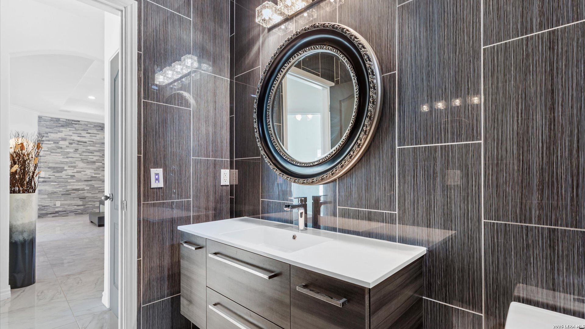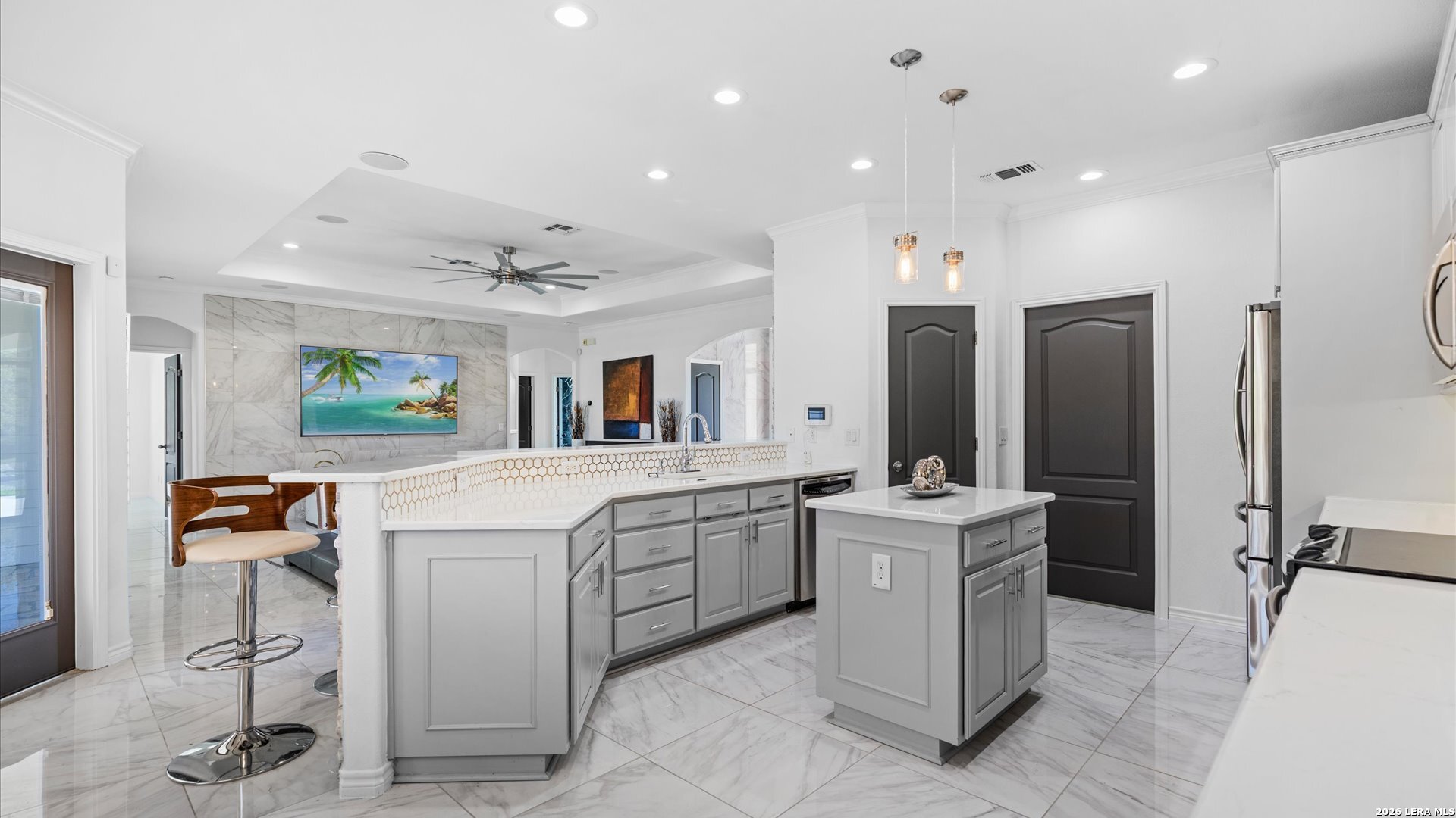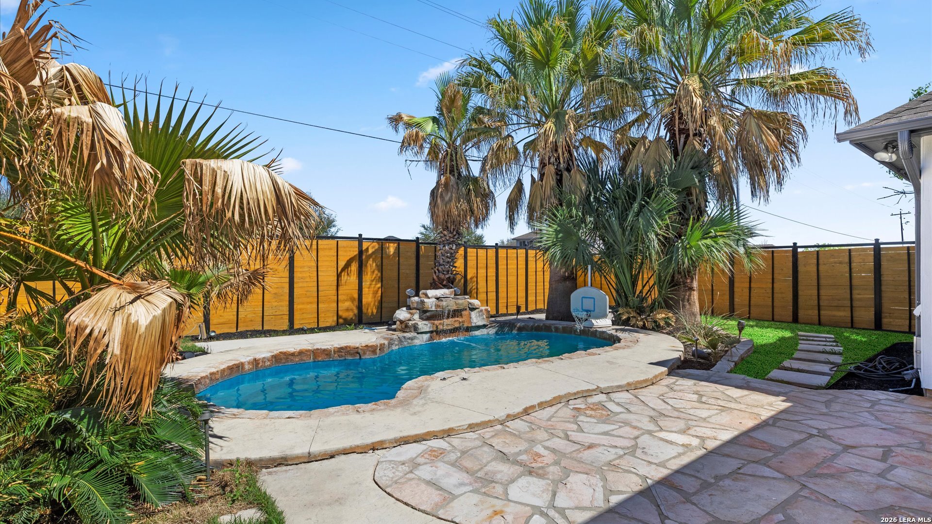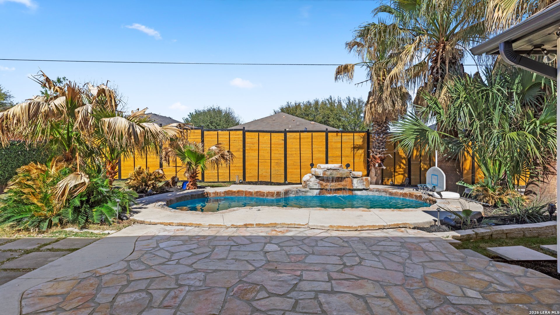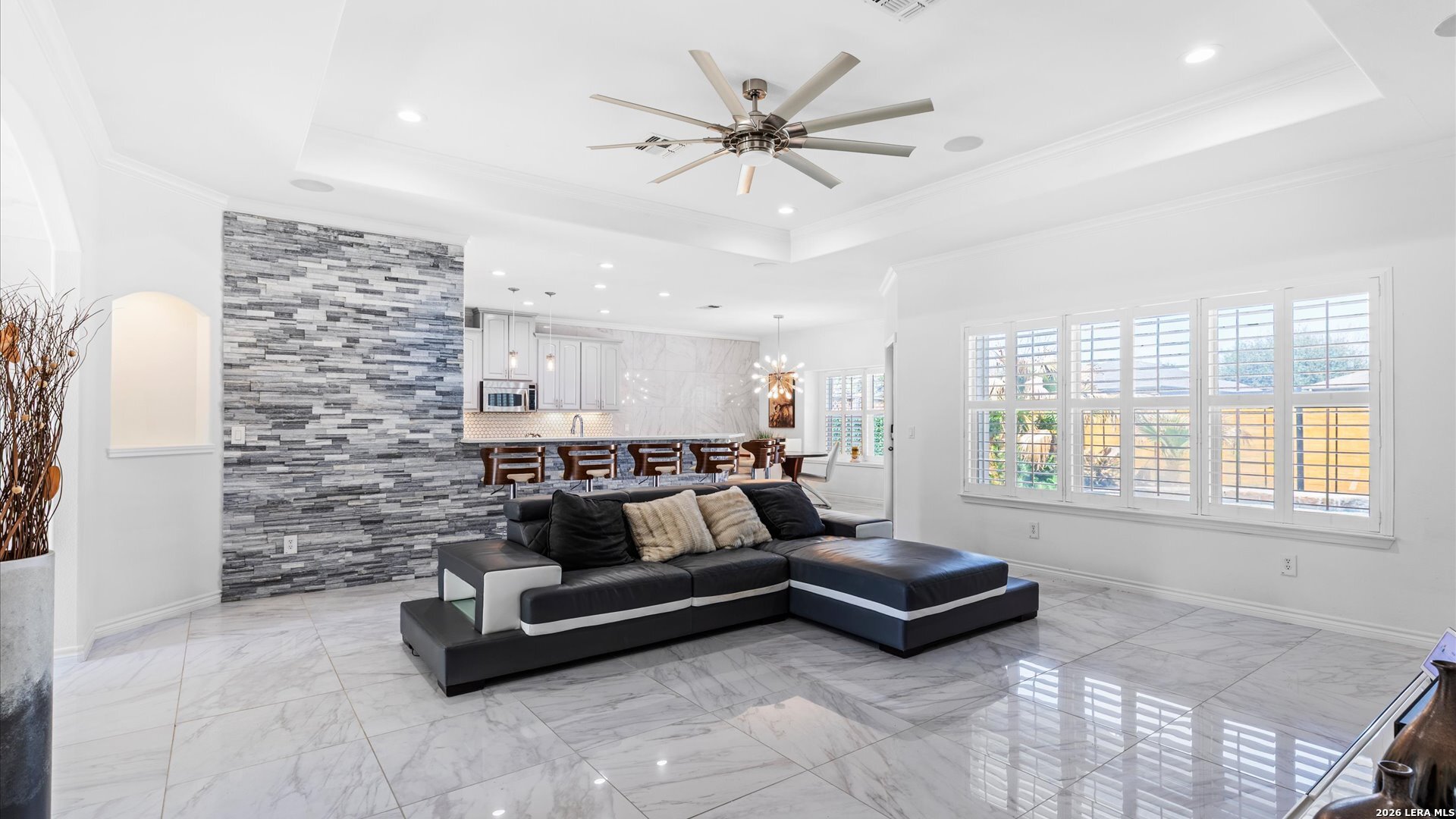 This stunning home makes an immediate impression with its white stucco exterior accented by bold charcoal details and a striking custom metal and wood entry door. Inside, the home showcases luxurious porcelain tile flooring throughout most of the home and dramatic tile accent walls, creating a sleek and sophisticated atmosphere. The living space is highlighted by beautiful stonework and an expansive breakfast bar, perfect for gathering and entertaining.Designed for an elevated lifestyle, the home includes a Sonos sound system throughout the interior and exterior, along with Dolby Atmos surround sound in the living room and media room, delivering a true theater-quality experience. The backyard offers a resort-style retreat with a sparkling pool, mature palms, and decorative fencing that enhances the outdoor living space. A side entry with paved parking pad provides added convenience for boats, jet skis, trailers, or other recreational toys. A rare blend of modern design, luxury finishes, and entertainment-focused living both inside and out.
