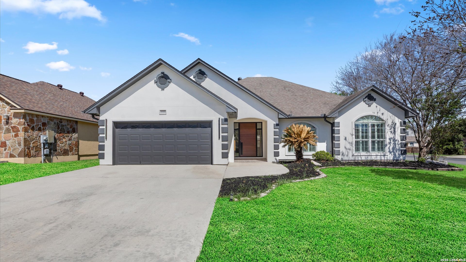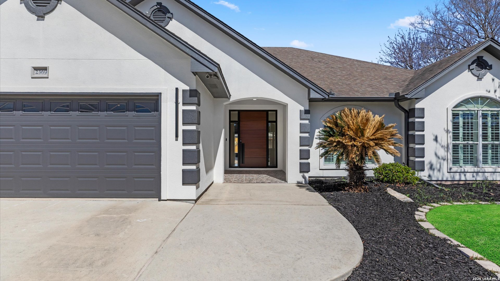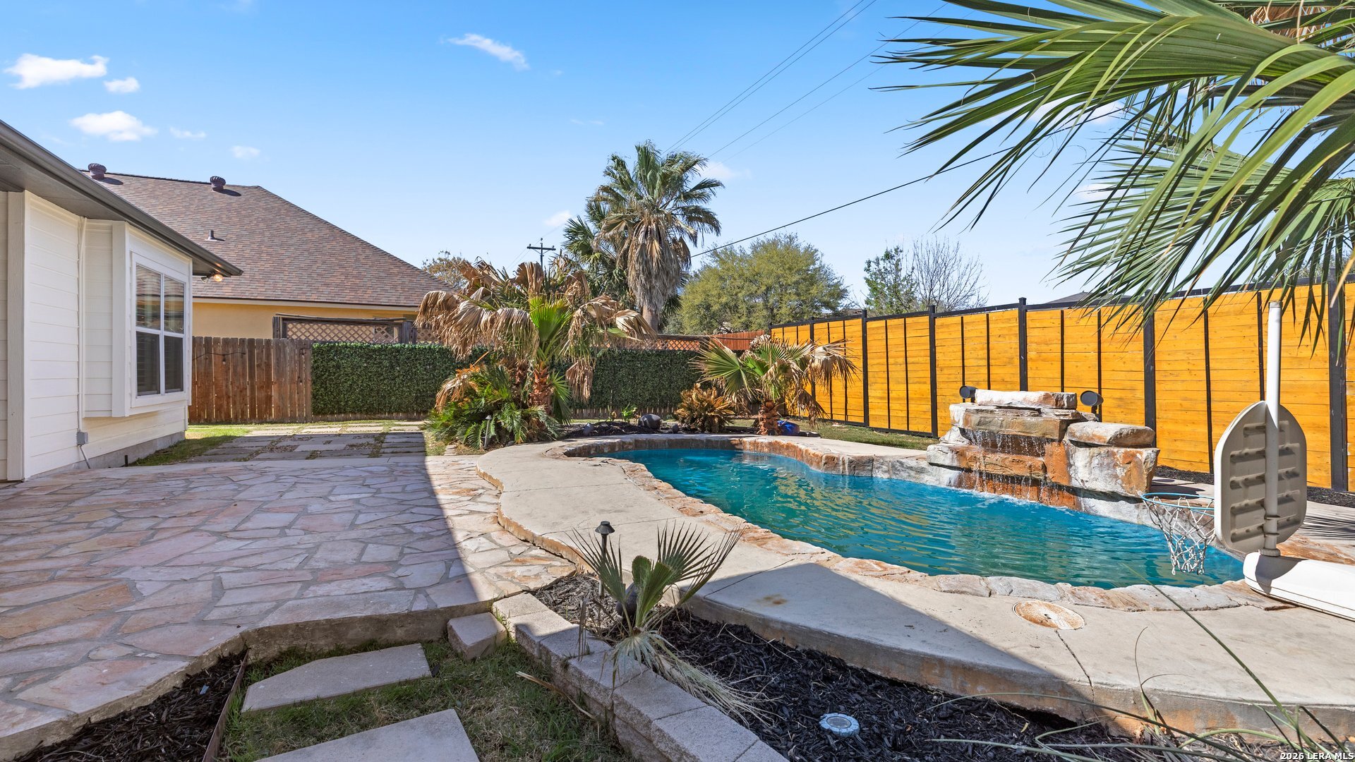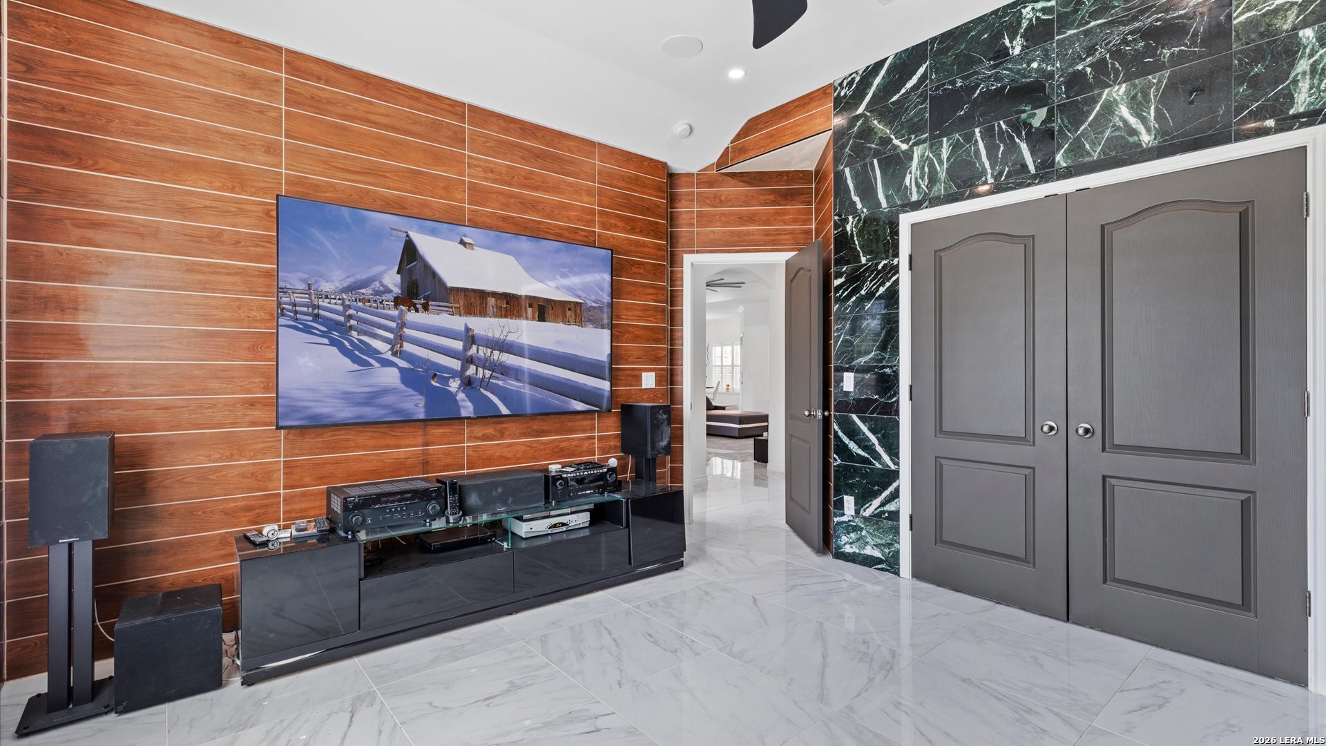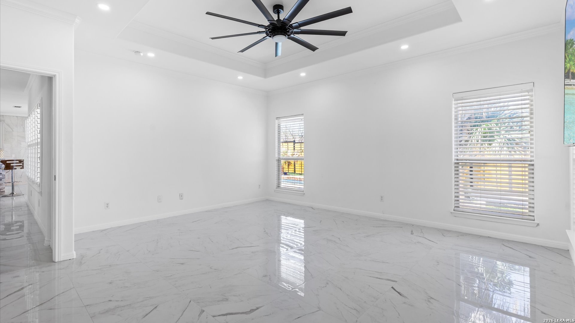 This stunning home makes an immediate impression with its white stucco exterior accented by bold charcoal details and a striking custom metal and wood entry door. Inside, the home showcases luxurious porcelain tile flooring throughout most of the home and dramatic tile accent walls, creating a sleek and sophisticated atmosphere. The living space is highlighted by beautiful stonework and an expansive breakfast bar, perfect for gathering and entertaining.Designed for an elevated lifestyle, the home includes a Sonos sound system throughout the interior and exterior, along with Dolby Atmos surround sound in the living room and media room, delivering a true theater-quality experience. The backyard offers a resort-style retreat with a sparkling pool, mature palms, and decorative fencing that enhances the outdoor living space. A side entry with paved parking pad provides added convenience for boats, jet skis, trailers, or other recreational toys. A rare blend of modern design, luxury finishes, and entertainment-focused living both inside and out.