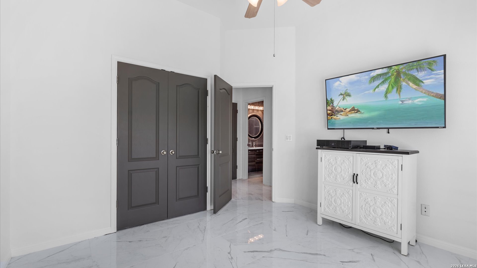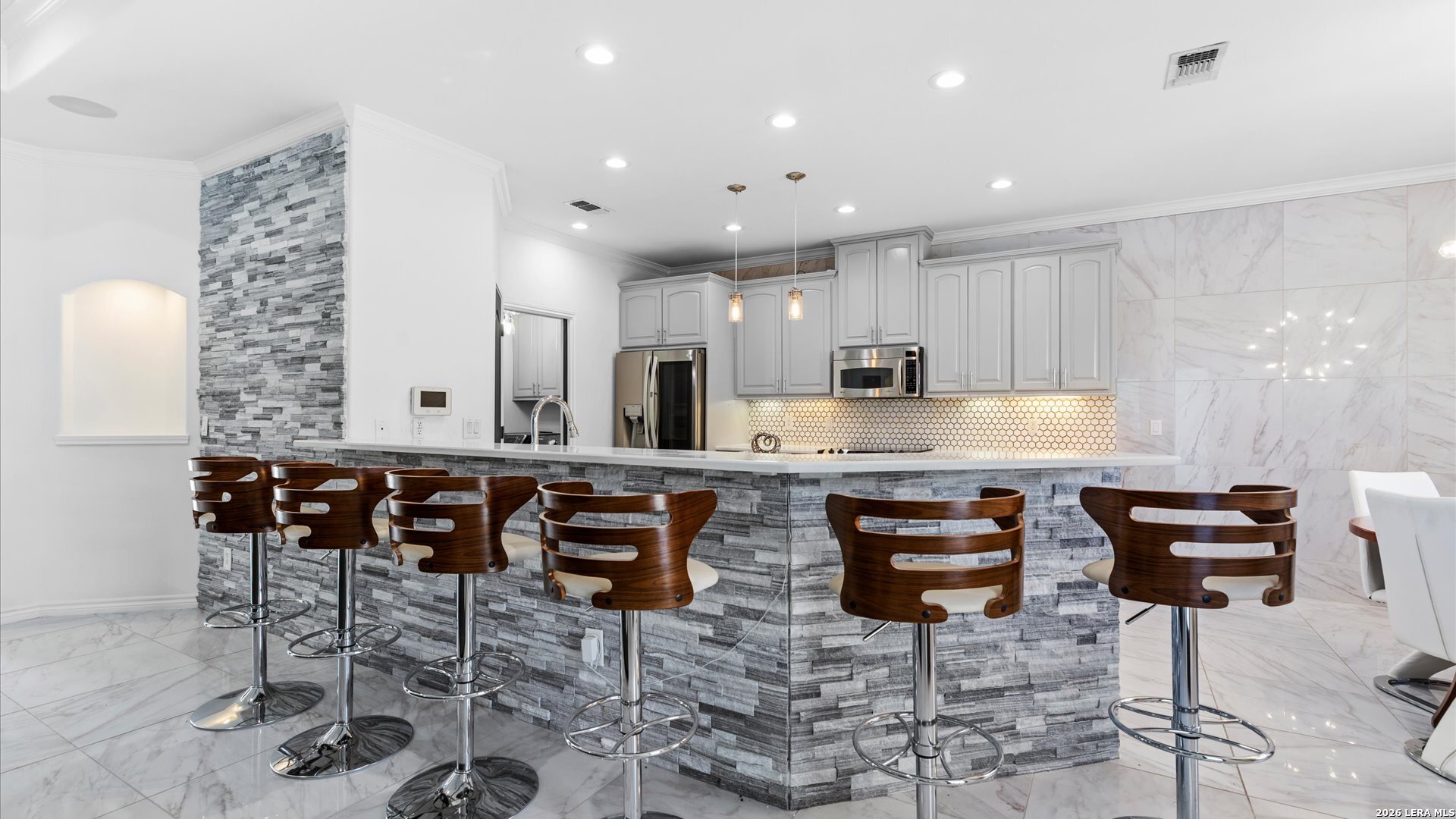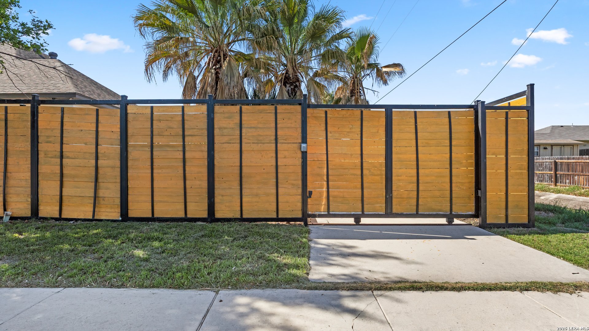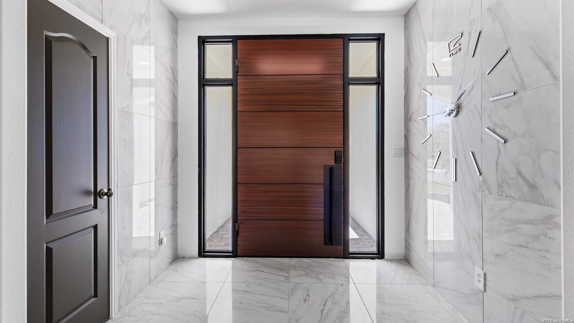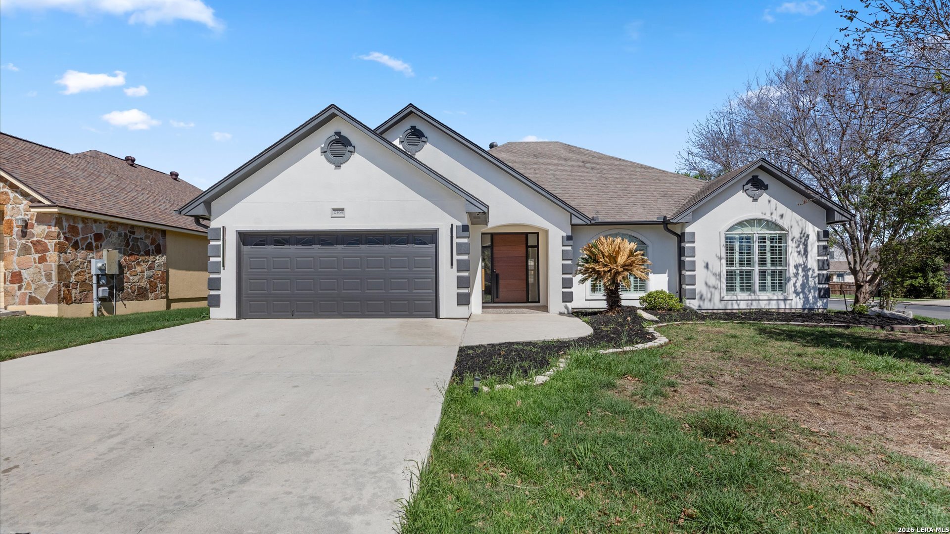 This stunning home makes an immediate impression with its white stucco exterior accented by bold charcoal details and a striking custom metal and wood entry door. Inside, the home showcases luxurious porcelain tile flooring throughout most of the home and dramatic tile accent walls, creating a sleek and sophisticated atmosphere. The living space is highlighted by beautiful stonework and an expansive breakfast bar, perfect for gathering and entertaining.Designed for an elevated lifestyle, the home includes a Sonos sound system throughout the interior and exterior, along with Dolby Atmos surround sound in the living room and media room, delivering a true theater-quality experience. The backyard offers a resort-style retreat with a sparkling pool, mature palms, and decorative fencing that enhances the outdoor living space. A side entry with paved parking pad provides added convenience for boats, jet skis, trailers, or other recreational toys. A rare blend of modern design, luxury finishes, and entertainment-focused living both inside and out.