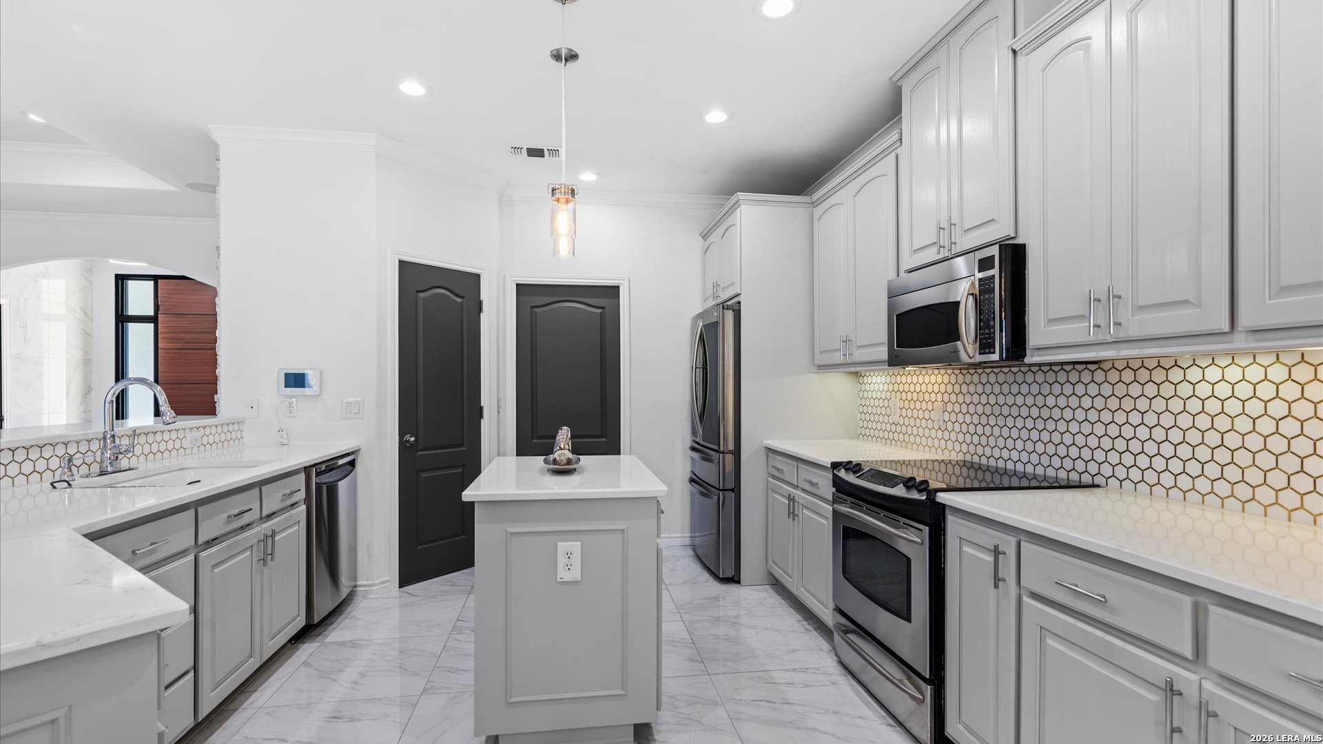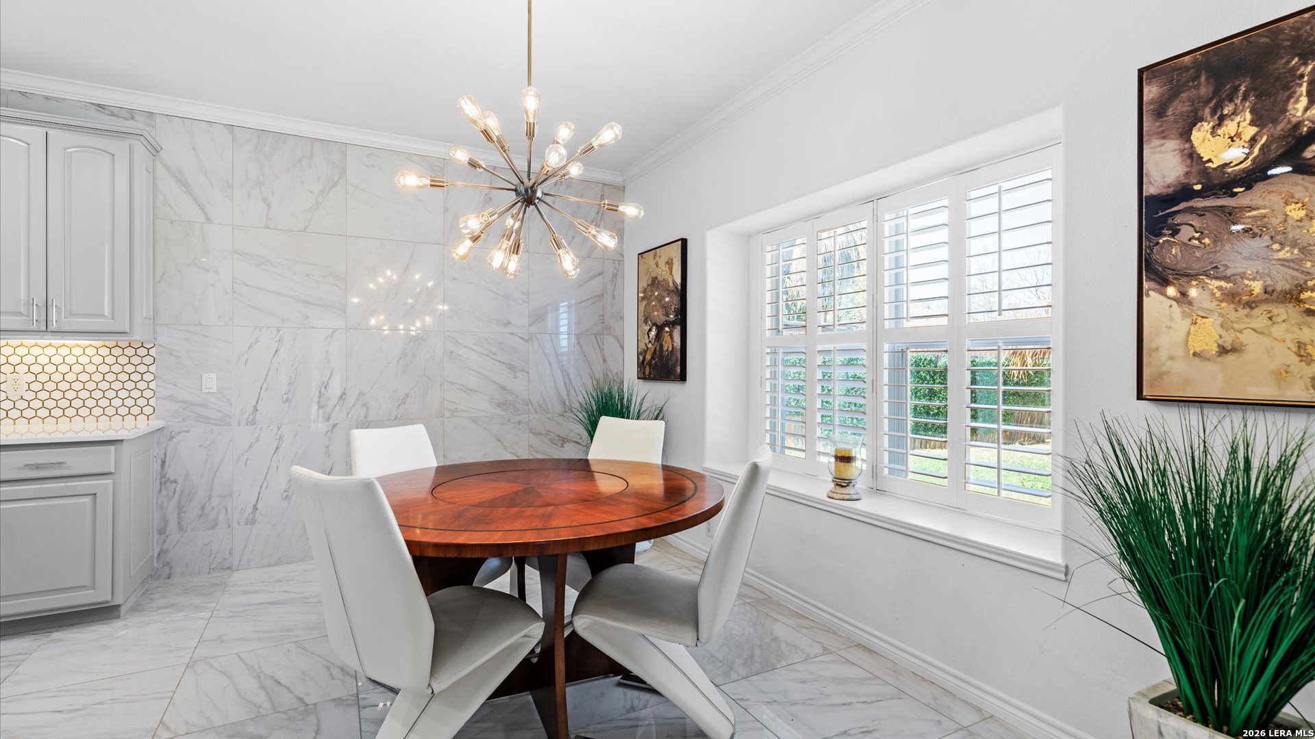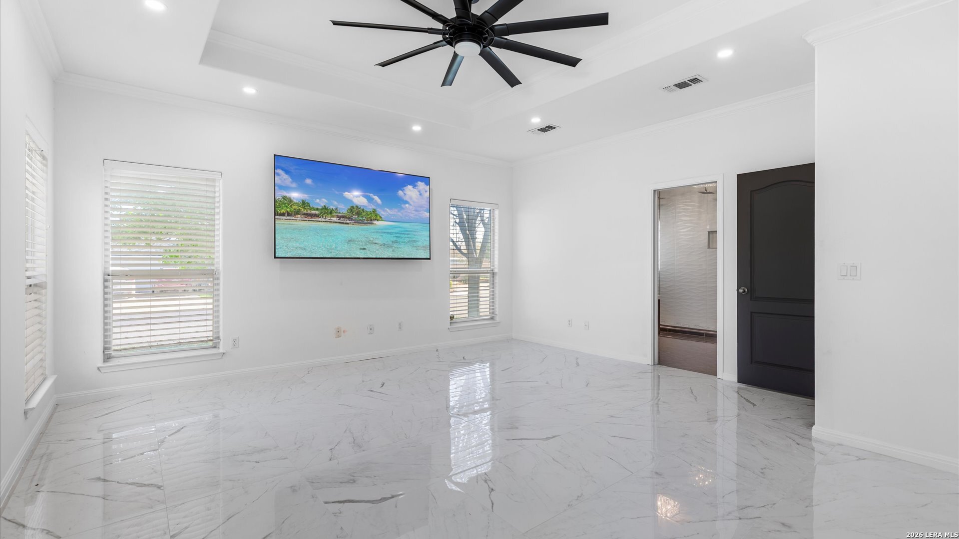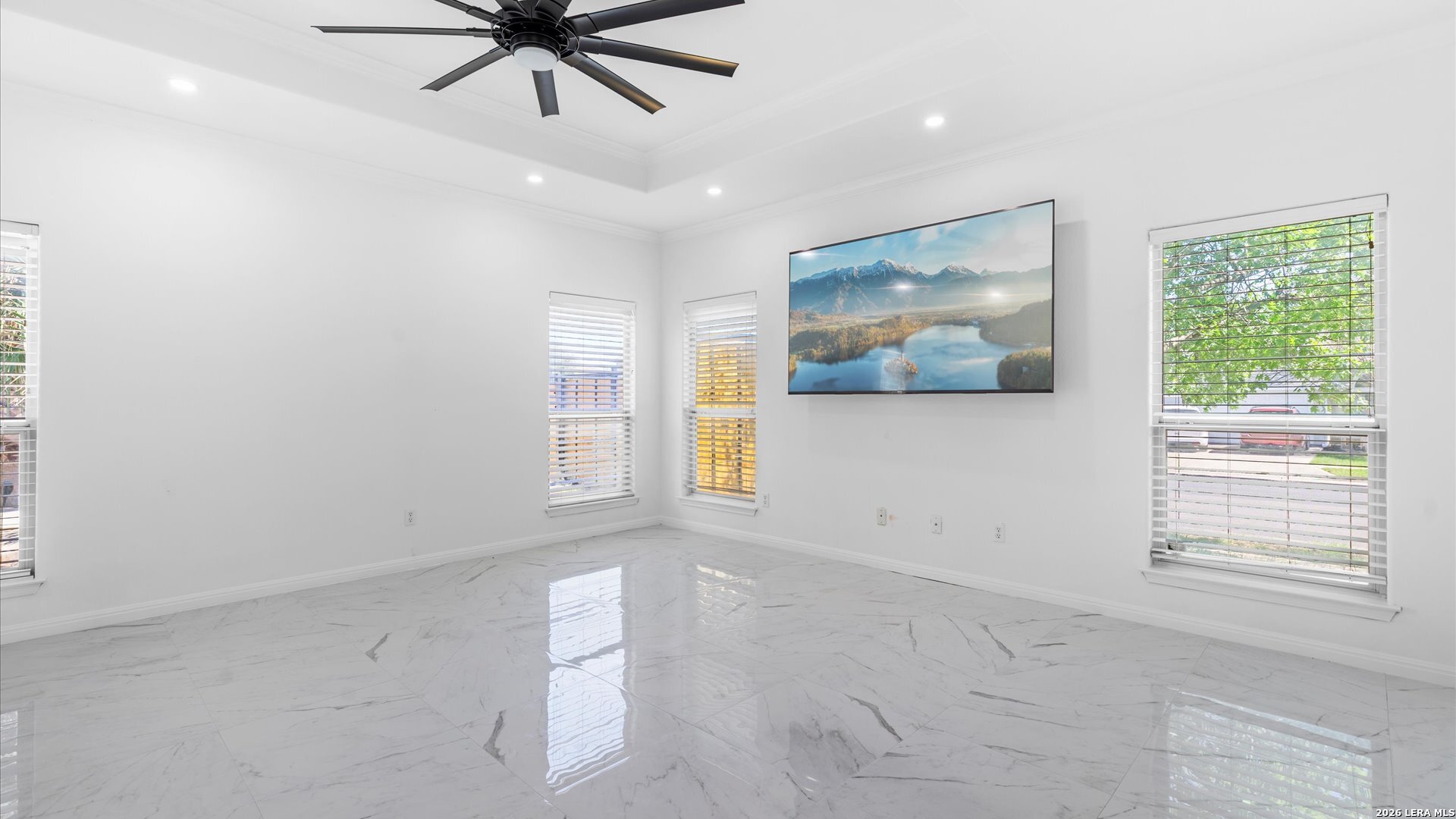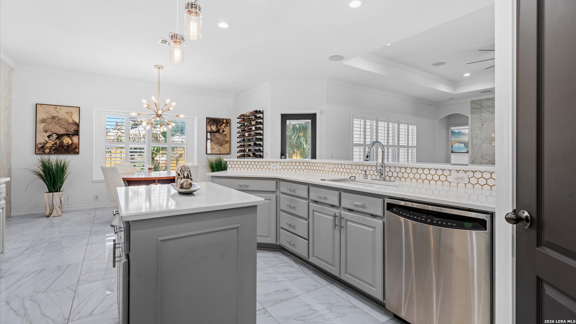 This stunning home makes an immediate impression with its white stucco exterior accented by bold charcoal details and a striking custom metal and wood entry door. Inside, the home showcases luxurious porcelain tile flooring throughout most of the home and dramatic tile accent walls, creating a sleek and sophisticated atmosphere. The living space is highlighted by beautiful stonework and an expansive breakfast bar, perfect for gathering and entertaining.Designed for an elevated lifestyle, the home includes a Sonos sound system throughout the interior and exterior, along with Dolby Atmos surround sound in the living room and media room, delivering a true theater-quality experience. The backyard offers a resort-style retreat with a sparkling pool, mature palms, and decorative fencing that enhances the outdoor living space. A side entry with paved parking pad provides added convenience for boats, jet skis, trailers, or other recreational toys. A rare blend of modern design, luxury finishes, and entertainment-focused living both inside and out.