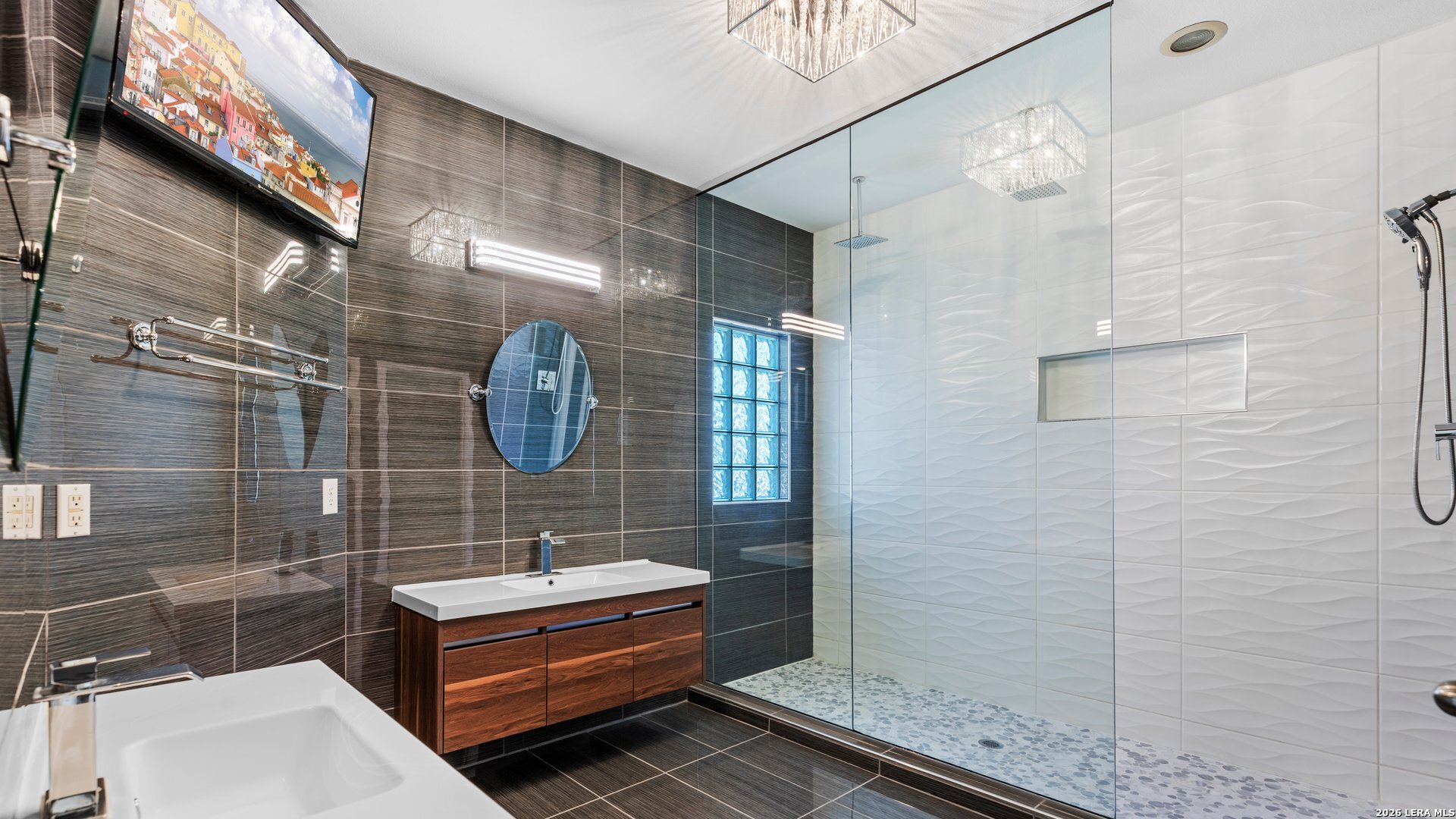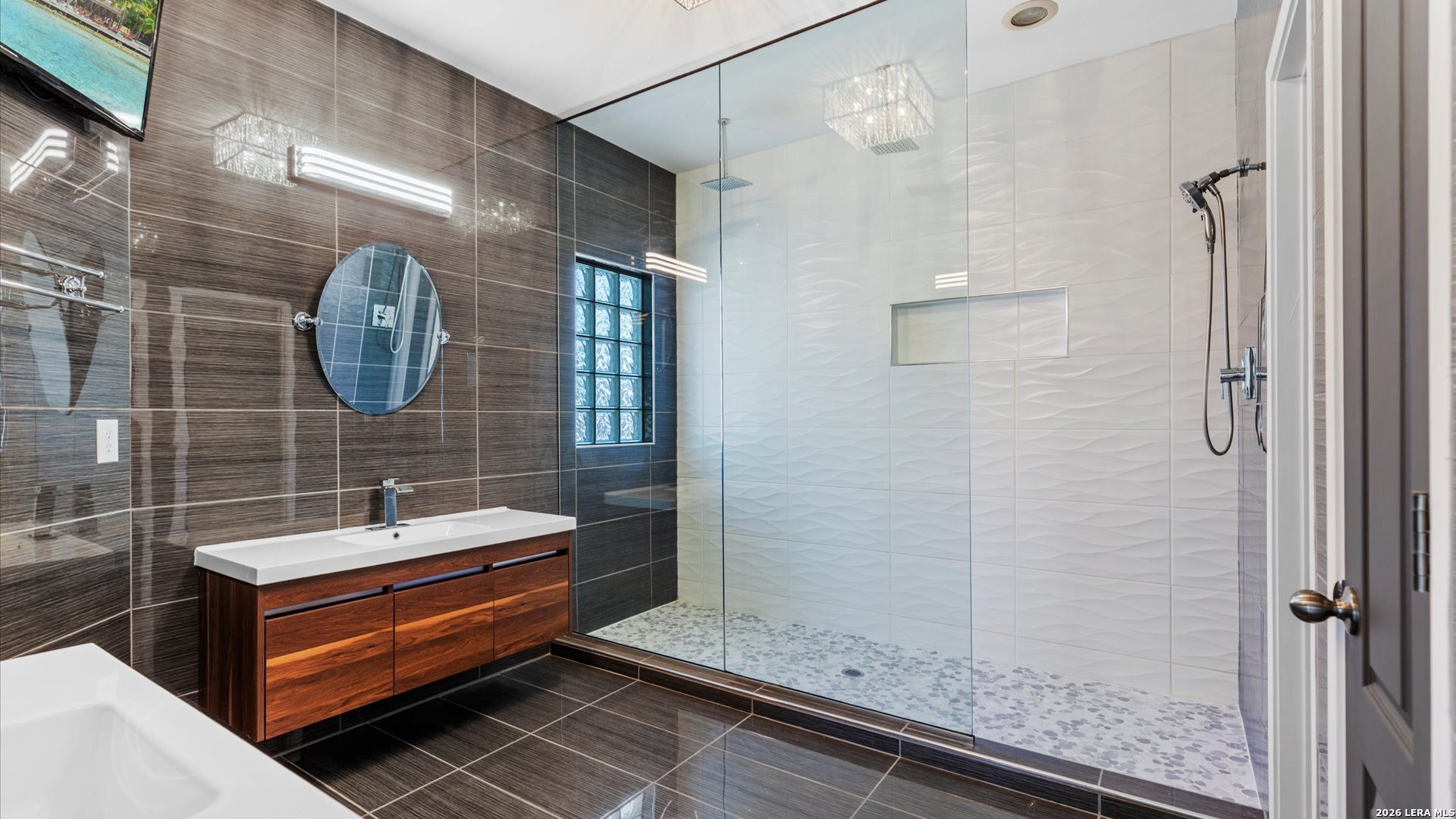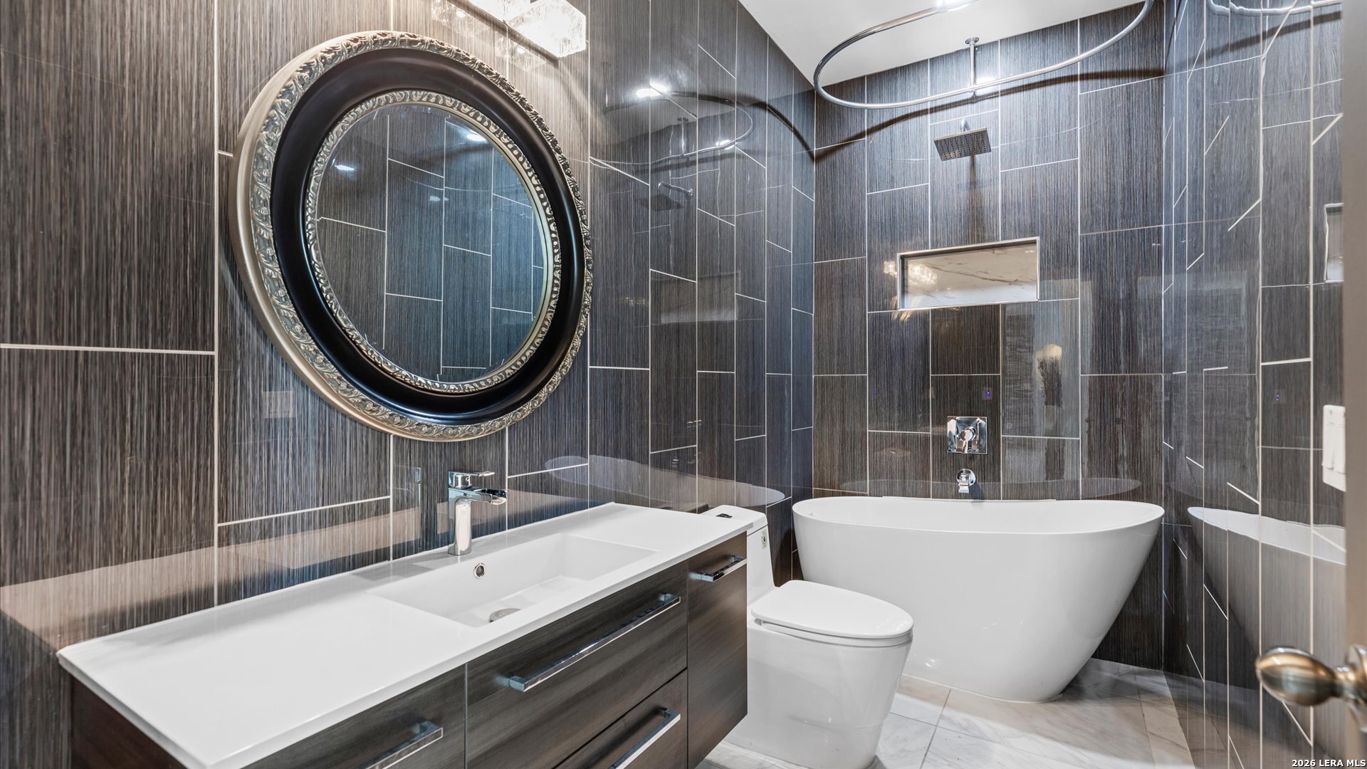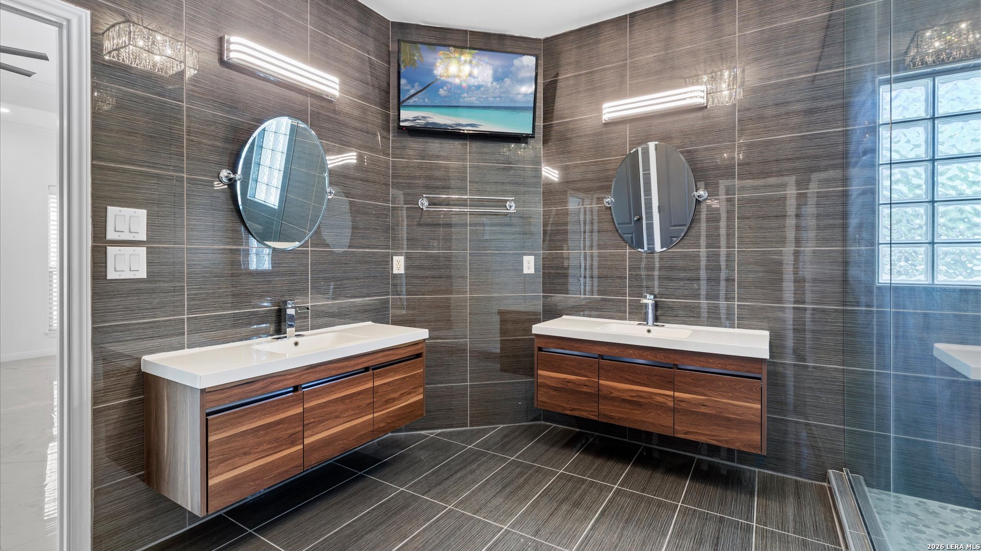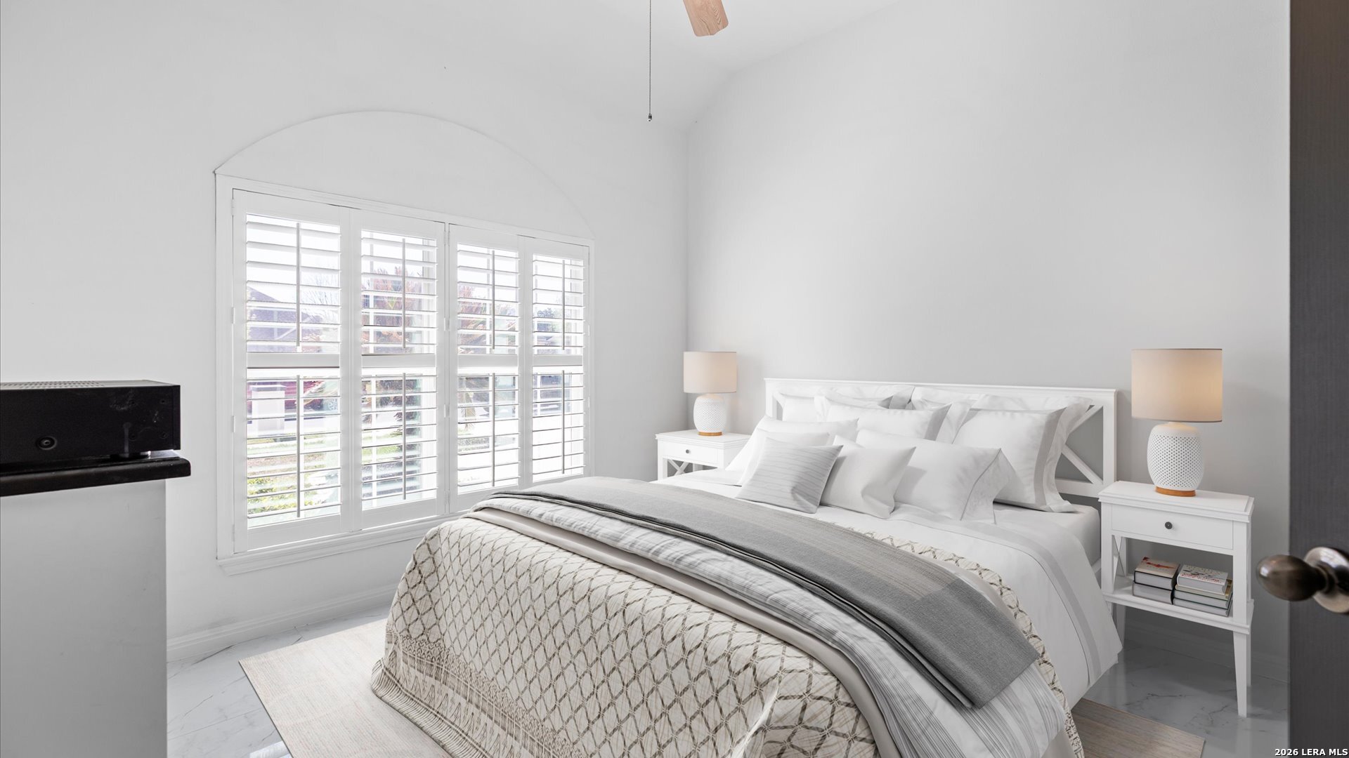 This stunning home makes an immediate impression with its white stucco exterior accented by bold charcoal details and a striking custom metal and wood entry door. Inside, the home showcases luxurious porcelain tile flooring throughout most of the home and dramatic tile accent walls, creating a sleek and sophisticated atmosphere. The living space is highlighted by beautiful stonework and an expansive breakfast bar, perfect for gathering and entertaining.Designed for an elevated lifestyle, the home includes a Sonos sound system throughout the interior and exterior, along with Dolby Atmos surround sound in the living room and media room, delivering a true theater-quality experience. The backyard offers a resort-style retreat with a sparkling pool, mature palms, and decorative fencing that enhances the outdoor living space. A side entry with paved parking pad provides added convenience for boats, jet skis, trailers, or other recreational toys. A rare blend of modern design, luxury finishes, and entertainment-focused living both inside and out.