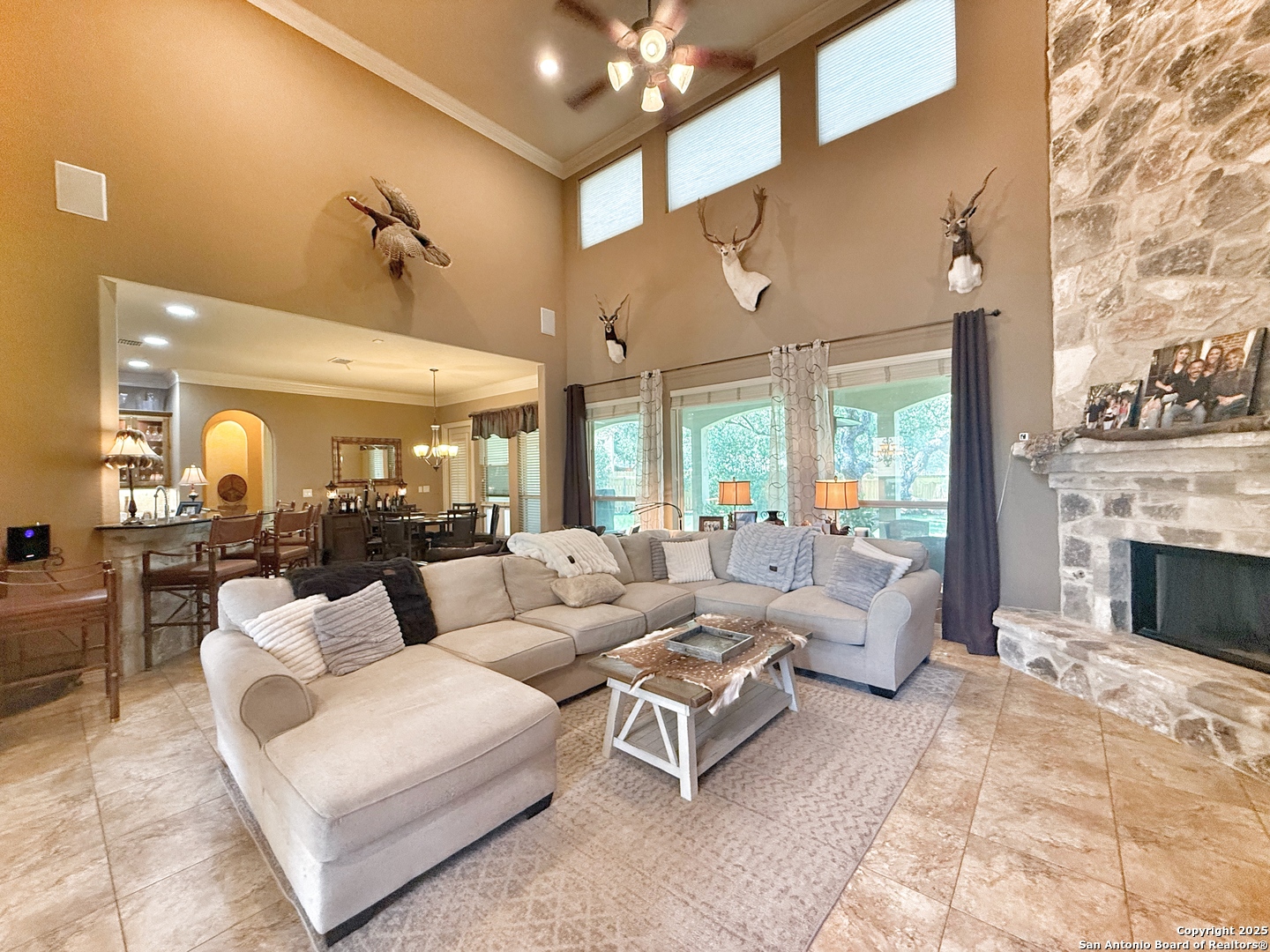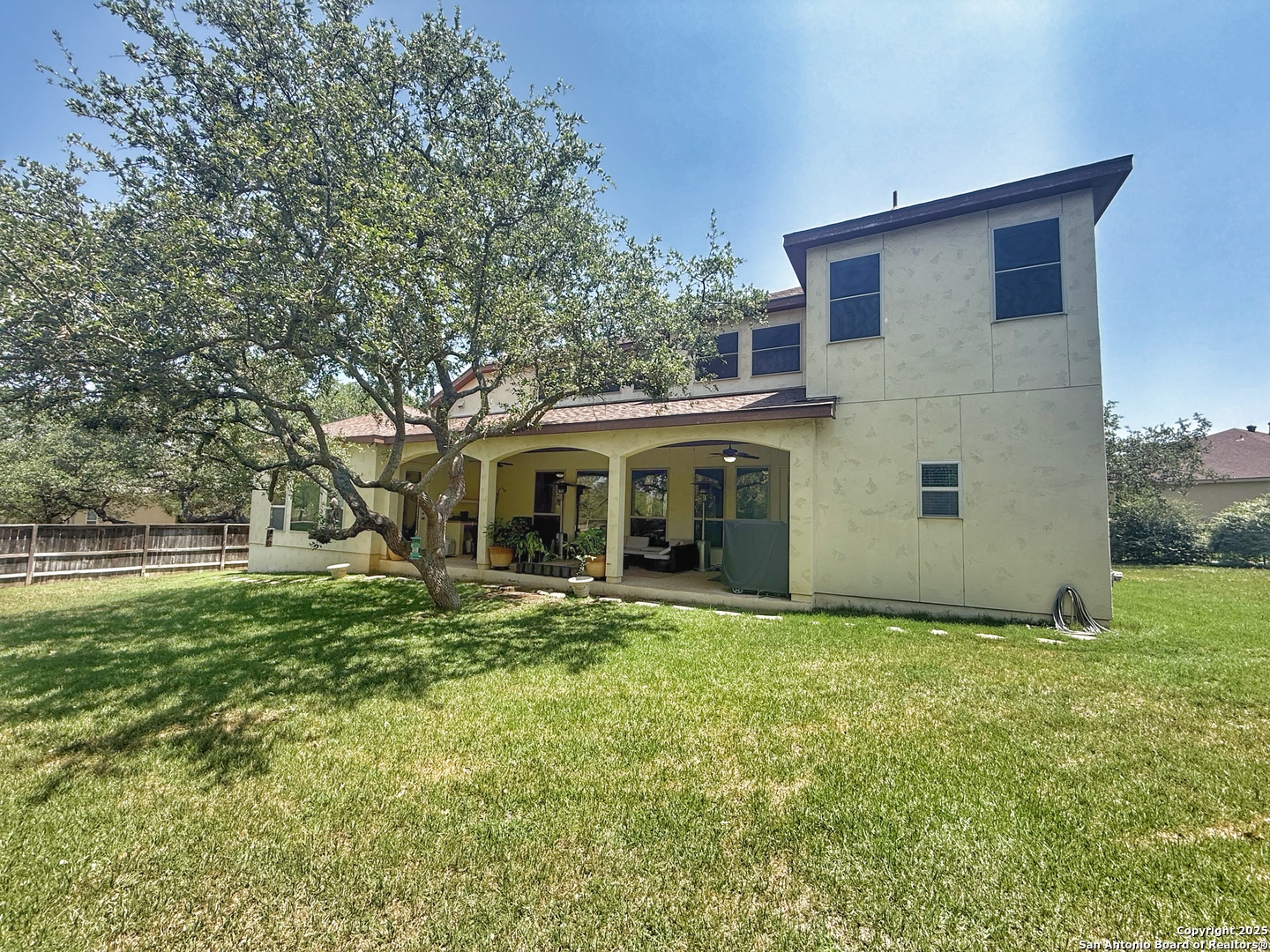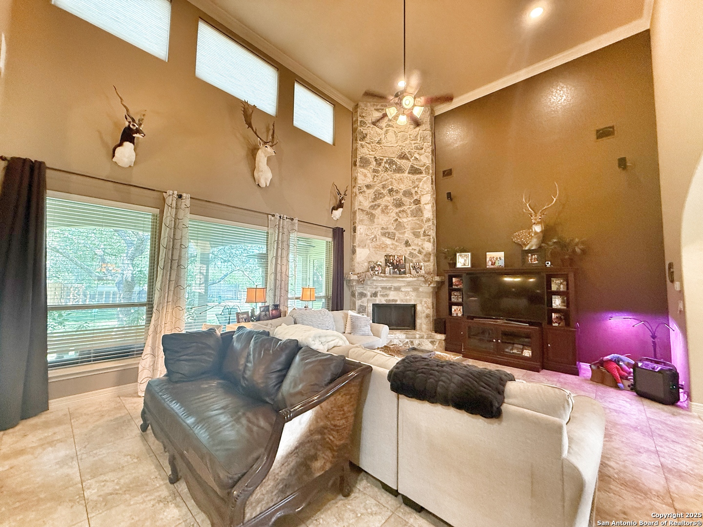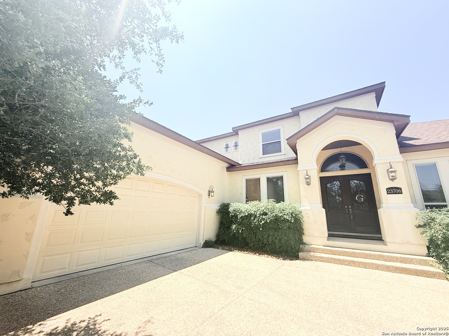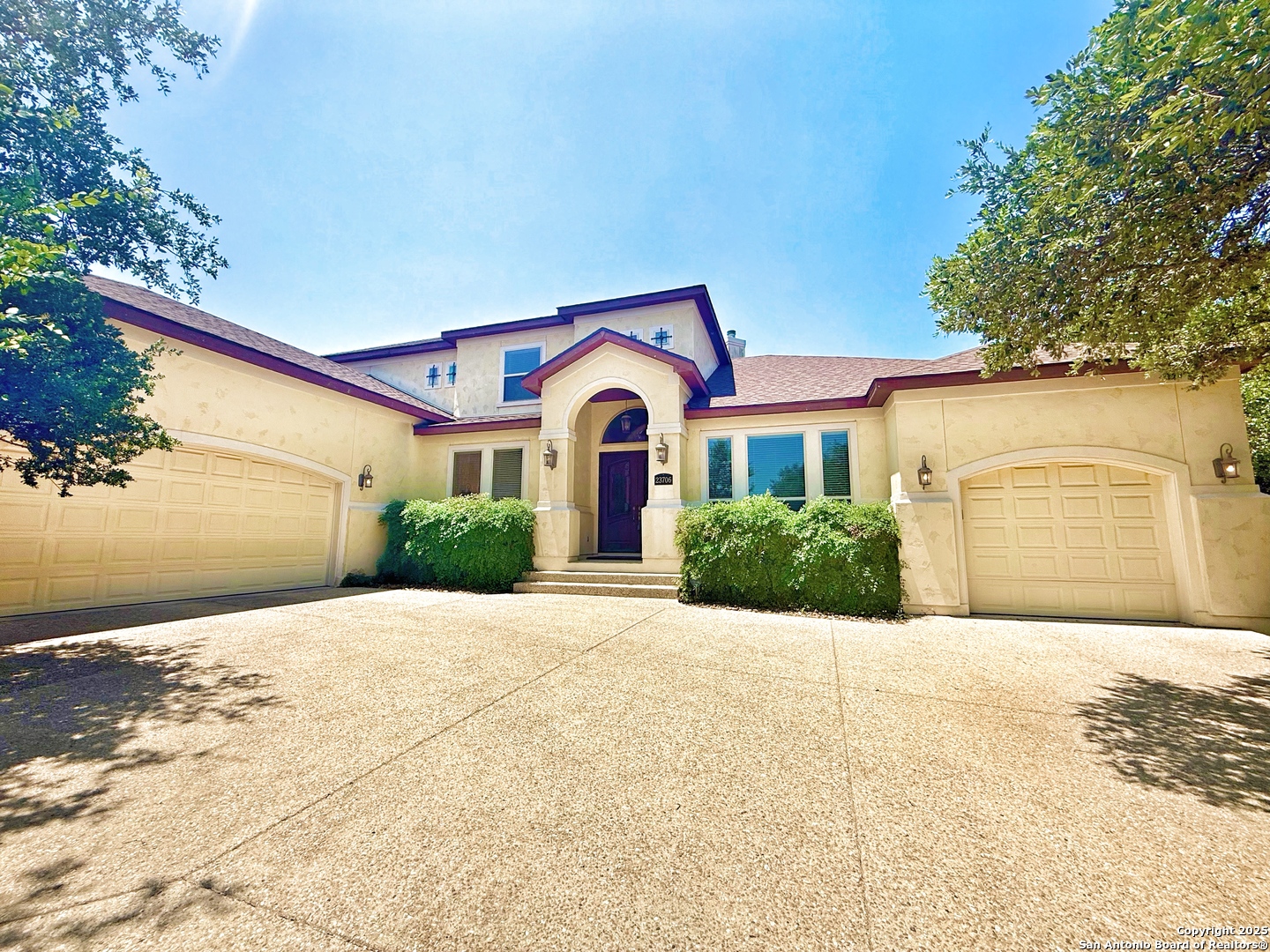 Nestled in a serene cul-de-sac within the desirable Mesas at Canyon Springs, this exquisite Mediterranean-style custom home offers luxury, space, and privacy. Meticulously designed for both comfortable family living and entertaining, this distinguished home features 4 generously sized bedrooms, 4 full bathrooms, a convenient half bath, and a spacious three-car split garage. Step through a grand foyer into an inviting open-concept layout, highlighted by soaring ceilings and an abundance of natural light. The main floor includes a formal dining room, a dedicated office or study, and a private guest bedroom with a full bath-perfect for visitors. The luxurious primary suite offers direct access to the tranquil backyard retreat, a spa-inspired bath with split vanities, multiple closets, and an elegantly crafted walk-through shower. The chef's kitchen is a culinary masterpiece, boasting custom cabinetry, premium stainless steel appliances, a large island, gas cooktop, double ovens, built-in microwave, and a spacious walk-in pantry. This space flows seamlessly into a grand living area anchored by a dramatic floor-to-ceiling stone fireplace, expansive windows and built-in speakers for ambient entertainment. Upstairs, a spacious game room with a built-in mini bar invites relaxation and fun, accompanied by two additional bedrooms each with their own full bathrooms. A fully finished walk-in attic provides abundant storage, ensuring every inch of the home is utilized with care. The backyard oasis is a true sanctuary, surrounded by mature trees and ample space for both quiet moments and lively gatherings. Located within a gated community offering endless amenities and conveniently close to shopping, dining, and recreation, this home delivers an unparalleled lifestyle of comfort and elegance. **Please note: Kitchen fridge does NOT convey. Laundry room fridge will remain**