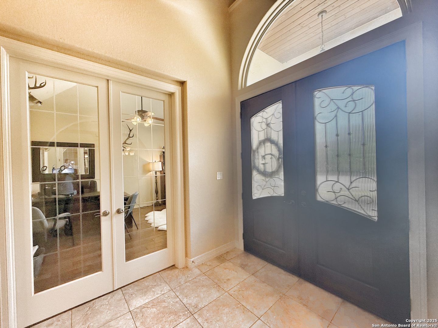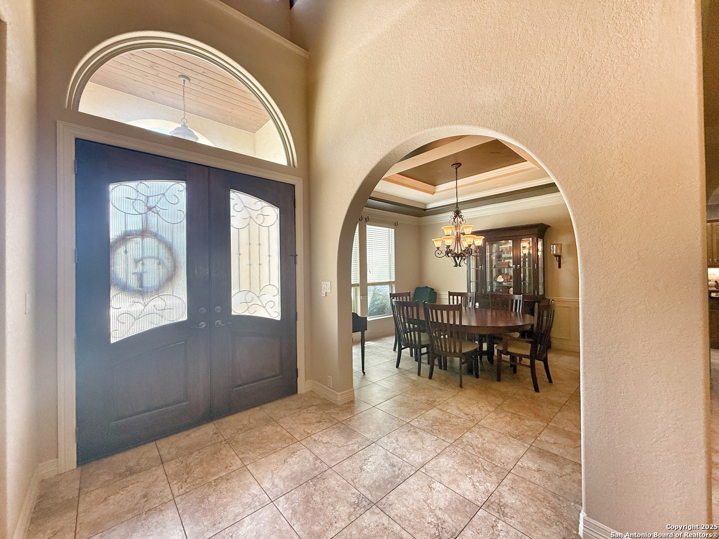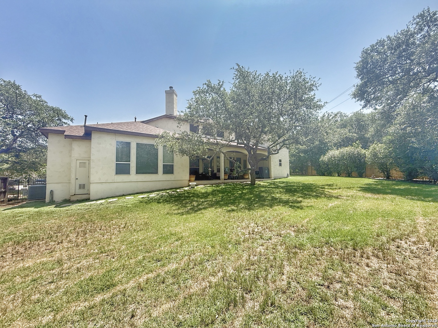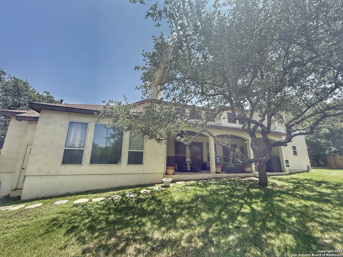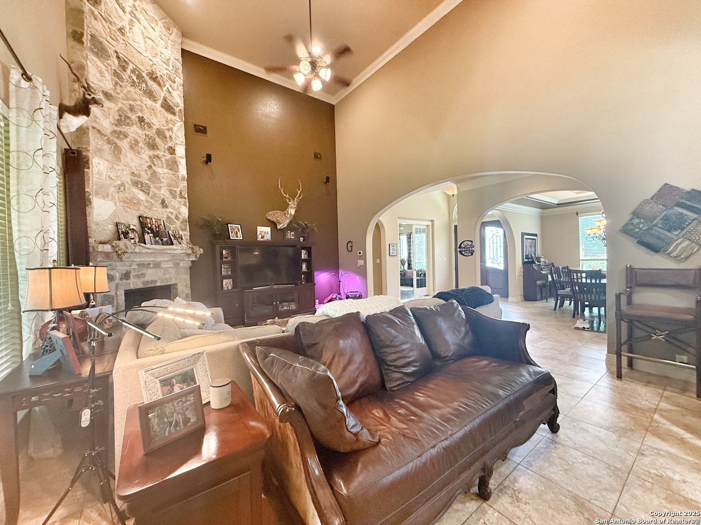 Nestled in a serene cul-de-sac within the desirable Mesas at Canyon Springs, this exquisite Mediterranean-style custom home offers luxury, space, and privacy. Meticulously designed for both comfortable family living and entertaining, this distinguished home features 4 generously sized bedrooms, 4 full bathrooms, a convenient half bath, and a spacious three-car split garage. Step through a grand foyer into an inviting open-concept layout, highlighted by soaring ceilings and an abundance of natural light. The main floor includes a formal dining room, a dedicated office or study, and a private guest bedroom with a full bath-perfect for visitors. The luxurious primary suite offers direct access to the tranquil backyard retreat, a spa-inspired bath with split vanities, multiple closets, and an elegantly crafted walk-through shower. The chef's kitchen is a culinary masterpiece, boasting custom cabinetry, premium stainless steel appliances, a large island, gas cooktop, double ovens, built-in microwave, and a spacious walk-in pantry. This space flows seamlessly into a grand living area anchored by a dramatic floor-to-ceiling stone fireplace, expansive windows and built-in speakers for ambient entertainment. Upstairs, a spacious game room with a built-in mini bar invites relaxation and fun, accompanied by two additional bedrooms each with their own full bathrooms. A fully finished walk-in attic provides abundant storage, ensuring every inch of the home is utilized with care. The backyard oasis is a true sanctuary, surrounded by mature trees and ample space for both quiet moments and lively gatherings. Located within a gated community offering endless amenities and conveniently close to shopping, dining, and recreation, this home delivers an unparalleled lifestyle of comfort and elegance. **Please note: Kitchen fridge does NOT convey. Laundry room fridge will remain**