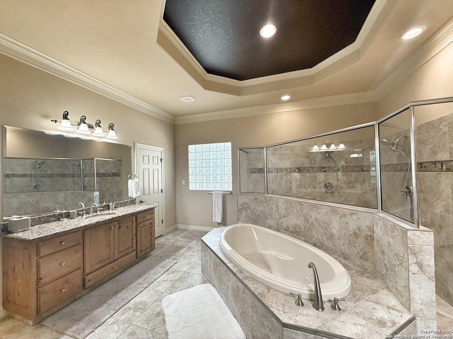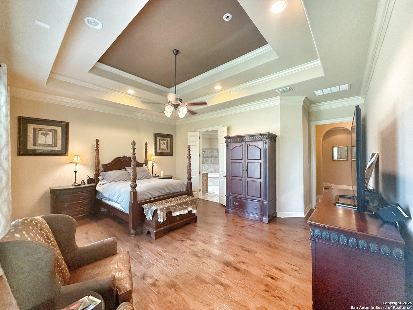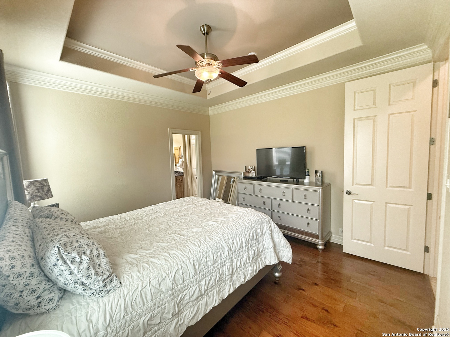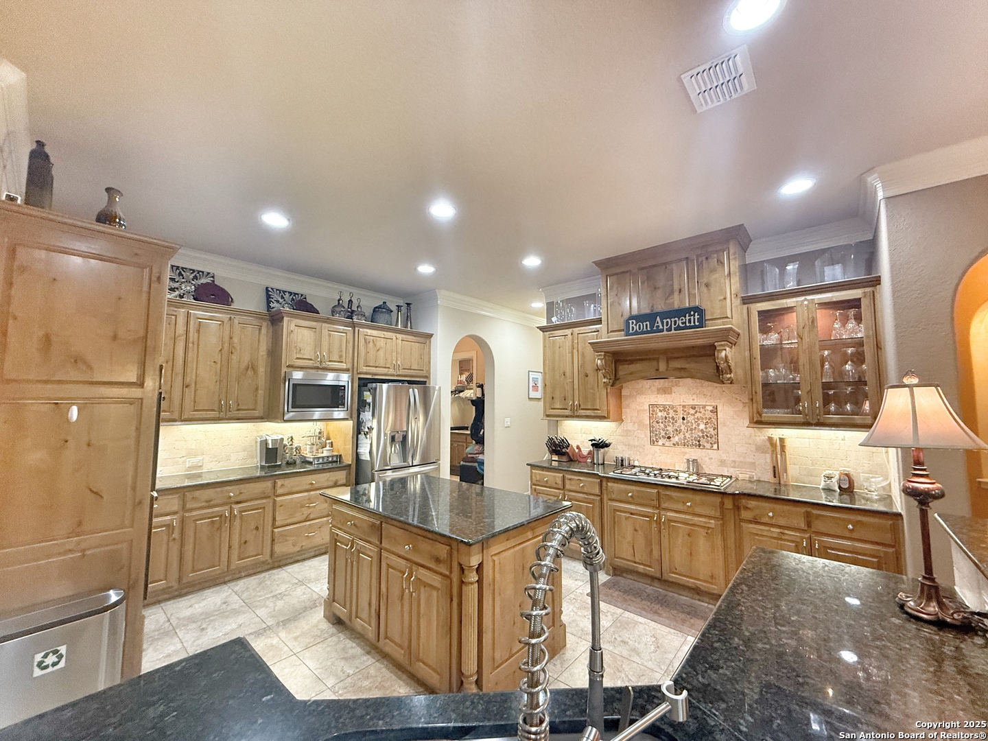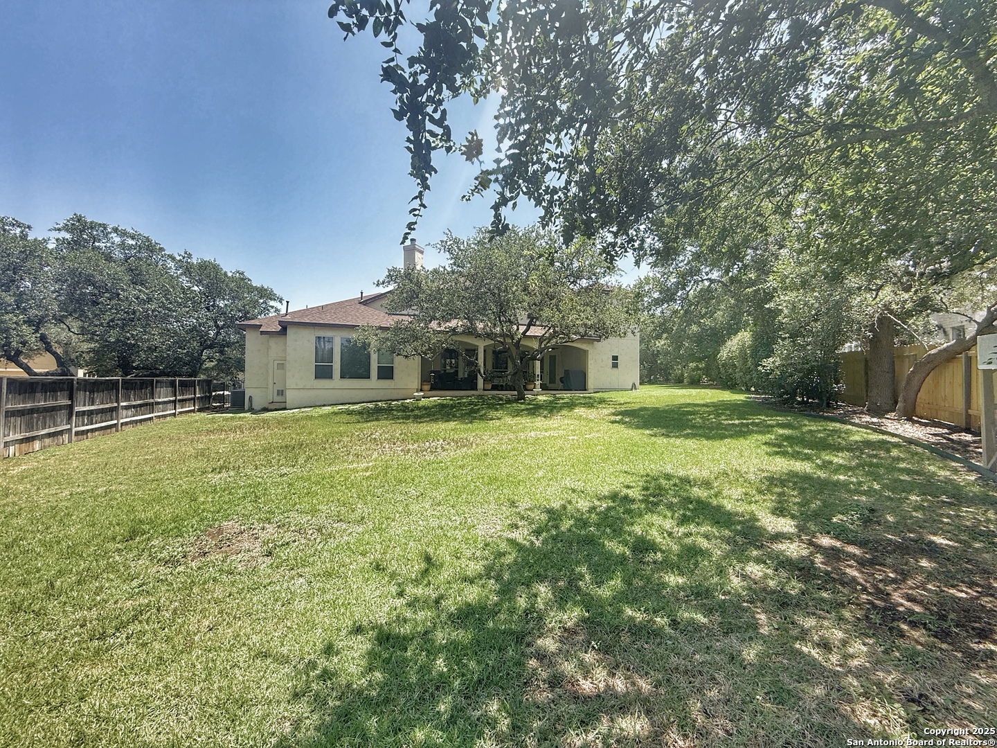 Nestled in a serene cul-de-sac within the desirable Mesas at Canyon Springs, this exquisite Mediterranean-style custom home offers luxury, space, and privacy. Meticulously designed for both comfortable family living and entertaining, this distinguished home features 4 generously sized bedrooms, 4 full bathrooms, a convenient half bath, and a spacious three-car split garage. Step through a grand foyer into an inviting open-concept layout, highlighted by soaring ceilings and an abundance of natural light. The main floor includes a formal dining room, a dedicated office or study, and a private guest bedroom with a full bath-perfect for visitors. The luxurious primary suite offers direct access to the tranquil backyard retreat, a spa-inspired bath with split vanities, multiple closets, and an elegantly crafted walk-through shower. The chef's kitchen is a culinary masterpiece, boasting custom cabinetry, premium stainless steel appliances, a large island, gas cooktop, double ovens, built-in microwave, and a spacious walk-in pantry. This space flows seamlessly into a grand living area anchored by a dramatic floor-to-ceiling stone fireplace, expansive windows and built-in speakers for ambient entertainment. Upstairs, a spacious game room with a built-in mini bar invites relaxation and fun, accompanied by two additional bedrooms each with their own full bathrooms. A fully finished walk-in attic provides abundant storage, ensuring every inch of the home is utilized with care. The backyard oasis is a true sanctuary, surrounded by mature trees and ample space for both quiet moments and lively gatherings. Located within a gated community offering endless amenities and conveniently close to shopping, dining, and recreation, this home delivers an unparalleled lifestyle of comfort and elegance. **Please note: Kitchen fridge does NOT convey. Laundry room fridge will remain**